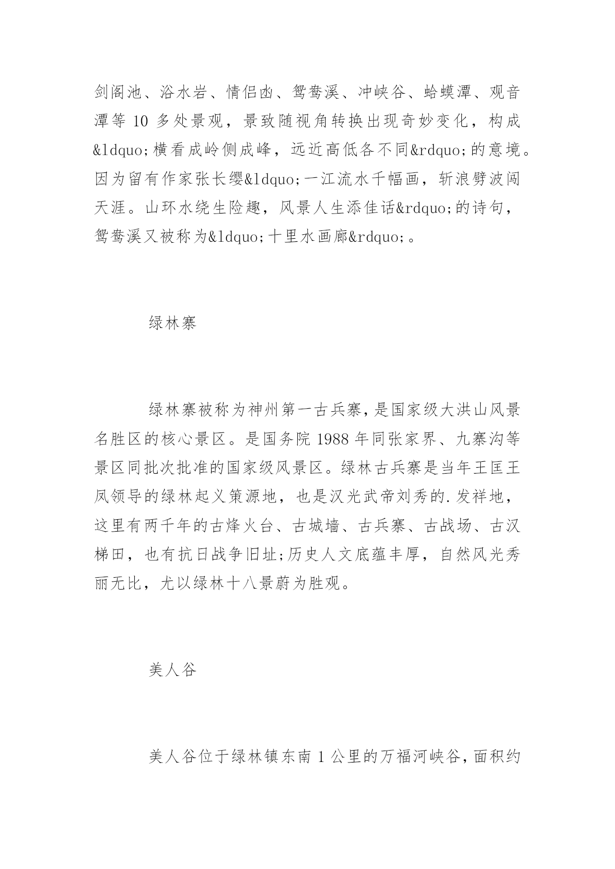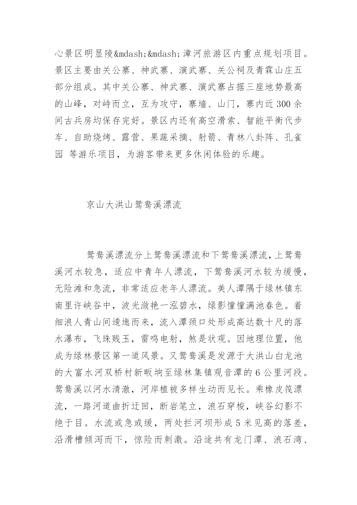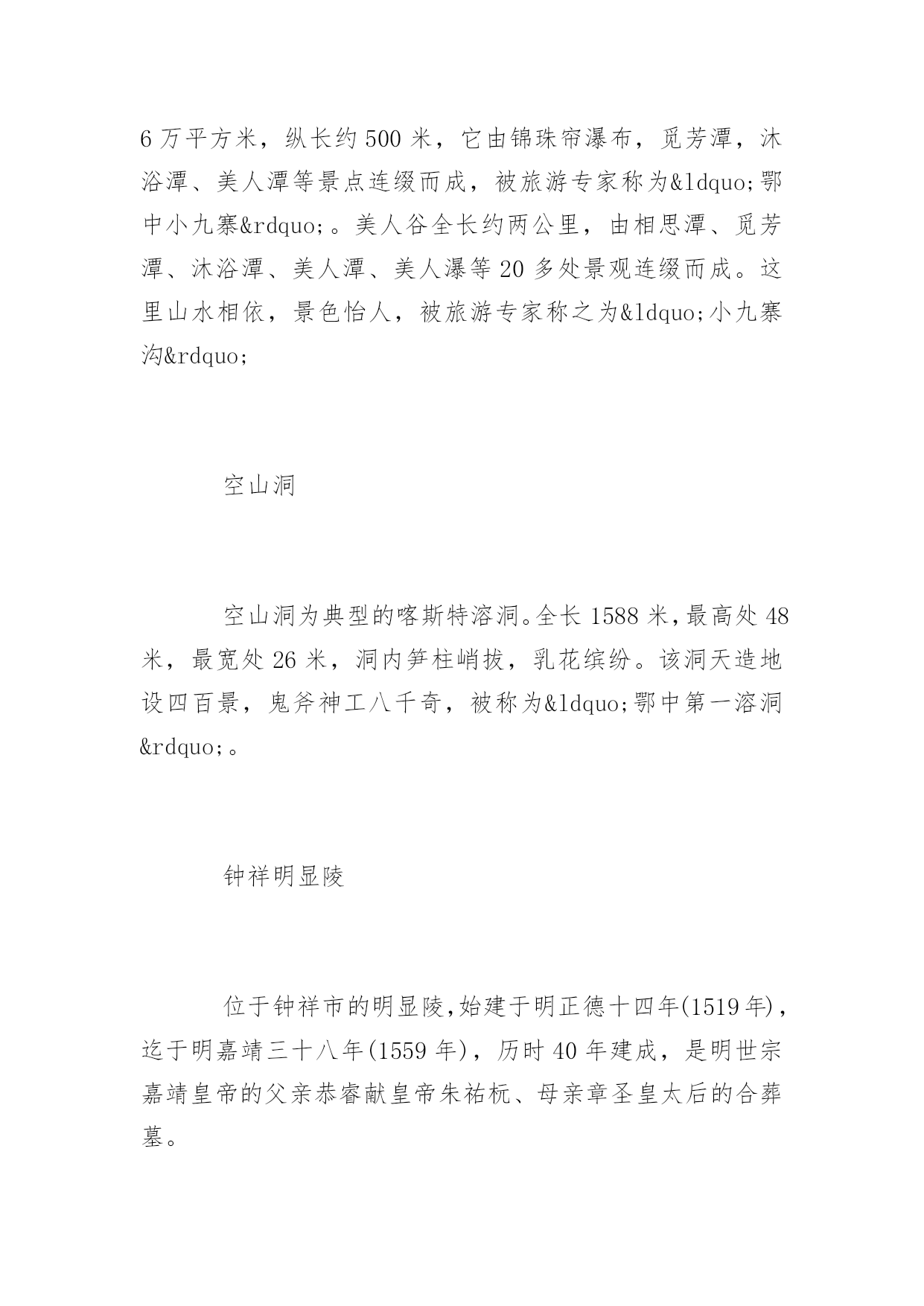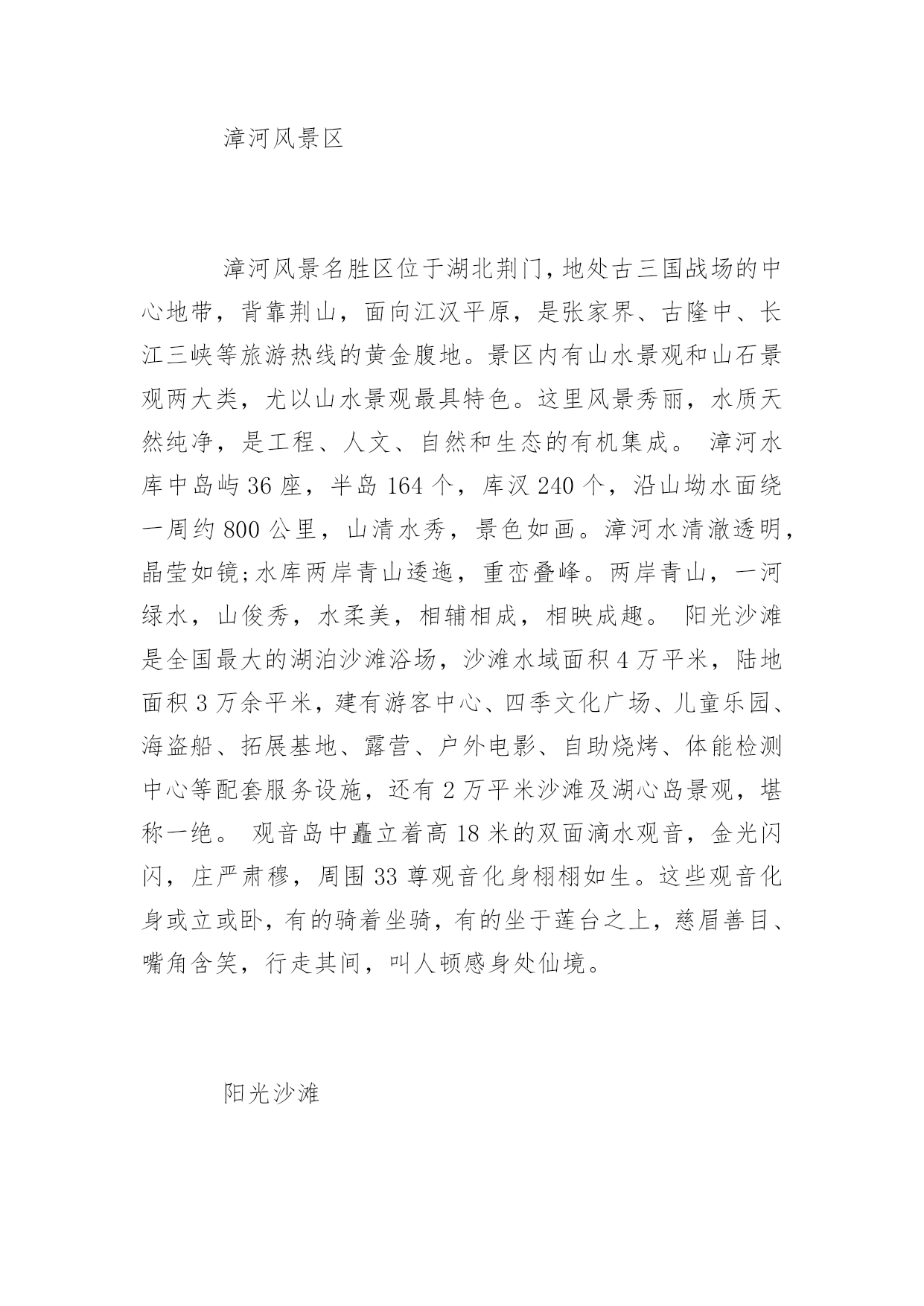 荆门旅游景点荆门旅游景点大全秋高气爽,正是结伴出游踏青的好时节,以下为您带来荆门旅游景点大全,欢迎浏览参考!观音岛漳河观音岛,位于漳河水库岛屿群之中,长2000米,宽1500米。此岛原为一巨型岩石,突兀嶙峋,寸草不生。一日观音菩萨到此小憩,拂尘一展,香汗入石,于是林生草长,百花争艳,百鸟争鸣,后人据此传说将此岛叫作观音岛。青林寨关公园风景区位于荆门市东宝区马河镇铁坪村境内,距离荆门市区65公里,景区占地2万余亩,属鄂西生态文化旅游圈十大核心景区明显陵——漳河旅游区内重点规划项目。景区主要由关公寨、神武寨、演武寨、关公祠及青霖山庄五部分组成。其中关公寨、神武寨、演武寨占据三座地势最高的山峰,对峙而立,互为攻守,寨墙、山门,寨内近300余间古兵房均保存完好。景区内还有高空滑索、智能平衡代步车、自助烧烤、露营、果蔬采摘、射箭、青林八卦阵、孔雀园等游乐项目,为游客带来更多休闲体验的乐趣。京山大洪山鸳鸯溪漂流鸳鸯溪漂流分上鸳鸯溪漂流和下鸳鸯溪漂流,上鸳鸯溪河水较急,适应中青年人漂流,下鸳鸯溪河水较为缓慢,无险滩和急流,非常适应老年人漂流。美人潭隅于绿林镇东南里许峡谷中,波光潋艳一泓碧水,绿影憧憧满池春色。着细浪人青山间逶迤而来,流入潭颈口处形成高达数十尺的落水瀑布,飞珠贱玉,雷鸣电射,煞是状观。因地理位置,他成为绿林景区第一道风景。又鸳鸯溪是发源于大洪山白龙池的大富水河双桥村新畈垧至绿林集镇观音潭的6公里河段。鸳鸯溪以河水清澈,河岸植被多样生动而见长。乘橡皮筏漂流,一路河道曲折迂回,断岩笔立,浪石穿梭,峡谷幻影不绝于目。水流或急或缓,两处拦河坝形成5米见高的落差,沿滑槽倾泻而下,惊险而刺激。沿途共有龙门潭、浪石湾、剑阁池、浴水岩、情侣凼、鸳鸯溪、冲峡谷、蛤蟆潭、观音潭等10多处景观,景致随视角转换出现奇妙变化,构成“横看成岭侧成峰,远近高低各不同”的意境。因为留有作家张长缨“一江流水千幅画,斩浪劈波闯天涯。山环水绕生险趣,风景人生添佳话”的诗句,鸳鸯溪又被称为“十里水画廊”。绿林寨绿林寨被称为神州第一古兵寨,是国家级大洪山风景名胜区的核心景区。是国务院1988年同张家界、九寨沟等景区同批次批准的国家级风景区。绿林古兵寨是当年王匡王凤领导的绿林起义策源地,也是汉光武帝刘秀的.发祥地,这里有两千年的古烽火台、古城墙、古兵寨、古战场、古汉梯田,也有抗日战争旧址;历史人文底蕴丰厚,自然风光秀丽无比,尤以绿林十八景蔚为胜观。美人谷美人谷位于绿林镇东南1公里的万福河峡谷,面积约6万平方米,纵长约500米,它由锦珠帘瀑布,觅芳潭,沐浴潭、美人潭等景点连缀而成,被旅游专家称为“鄂中小九寨”。美人谷全长约两公里,由相思潭、觅芳潭、沐浴潭、美人潭、美人瀑等20多处景观连缀而成。这里山水相依,景色怡人,被旅游专家称之为“小九寨沟”空山洞空山洞为典型的喀斯特溶洞。全长1588米,最高处48米,最宽处26米,洞内笋柱峭拔,乳花缤纷。该洞天造地设四百景,鬼斧神工八千奇,被称为“鄂中第一溶洞”。钟祥明显陵位于钟祥市的明显陵,始建于明正德十四年(1519年),迄于明嘉靖三十八年(1559年),历时40年建成,是明世宗嘉靖皇帝的父亲恭睿献皇帝朱祐杬、母亲章圣皇太后的合葬墓。陵园由30余处规模宏大的建筑群组成,依山间台地渐次布列有纯德山碑、敕谕碑、外明塘、新旧红门、御碑楼、石像生、棂星门、九曲御河、方城、前后茔城等,众多的建筑掩映于山环水抱之中。游客进入景区后,沿着中轴线向前步行游览即可。显陵的修建,是明朝嘉靖初期重大历史事件“大礼议”的产物,规划布局和建筑手法独特,在明代帝陵规制中具有承上启下的作用。其陵寝建筑中金瓶形的外罗城、九曲御河、龙鳞神道、琼花双龙琉璃影壁和内外明塘等都是明陵中仅见的孤例,尤其是“一陵两冢”的陵寝结构为历代帝王陵墓中绝无仅有,由瑶台相连而成哑铃状的两座隐密的地下玄宫神密莫测,一直为世人称奇。显陵中有前后两个茔城,前茔城建于正德十五年(1520年),是朱祐杬死后按藩王规制建兴献王坟时建造的,后茔城为嘉靖18年(1539年)嘉靖皇帝亲自选址、并合葬其父母而建。两宝城之间用很长的平台连接起来称为“瑶台”,且每个茔城都建有一套月牙城、哑巴院和琉璃影壁,并有独立的排水系统,这是显陵的独特之处。棱恩门两侧精美的双龙琉璃影壁,是显陵中的另一个看点,花心正面为琼花图案,背面为双龙图案,其做工非常精美。是明代各帝陵中所没有的。显陵中还有一道独特的景观,就是九曲河。九曲河是陵区的主要排水设