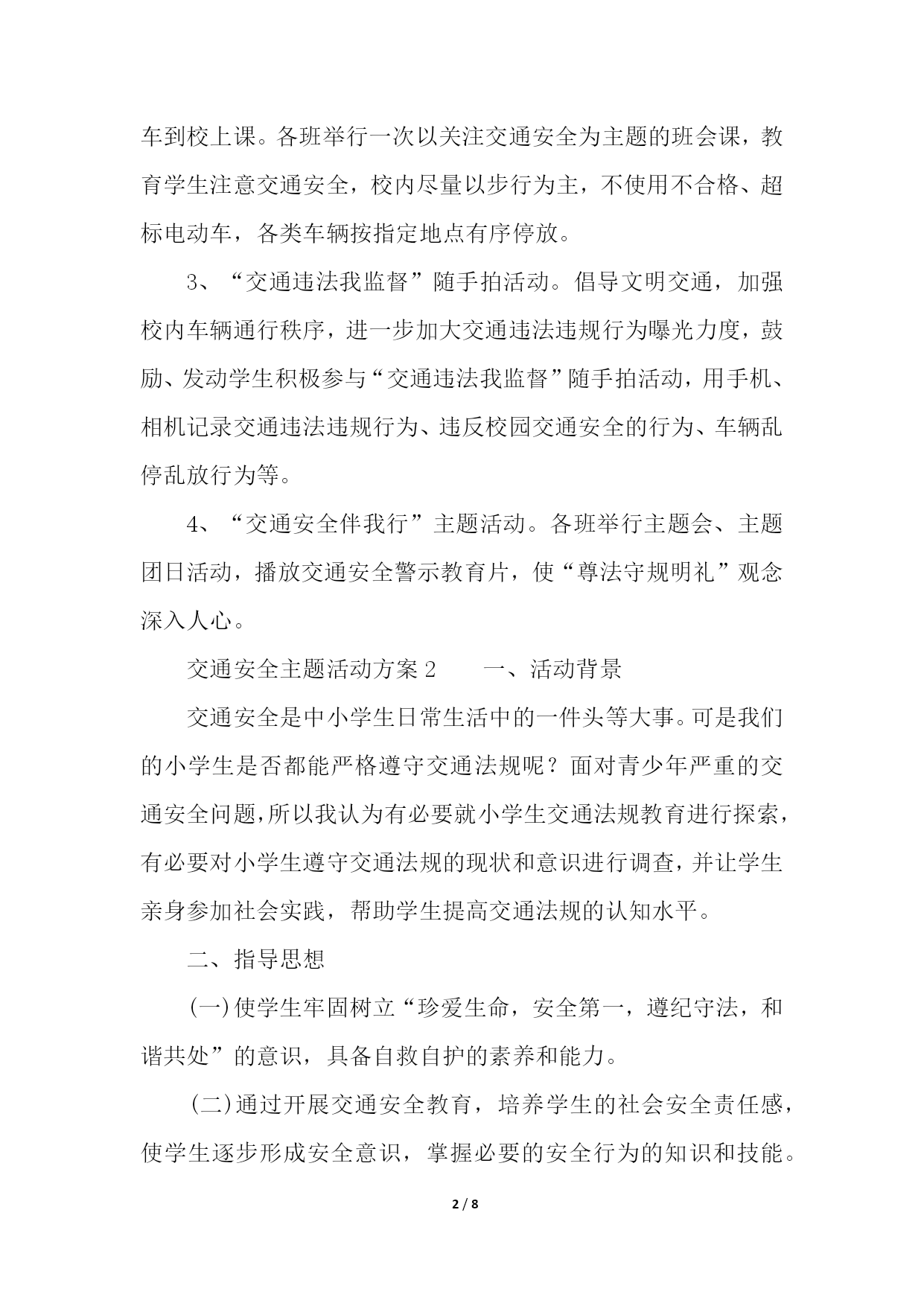 PAGE8/NUMPAGES8交通安全主题活动方案交通安全主题活动方案1一、活动主题细节关乎生命、安全文明出行二、时间安排12月2日至12月10日为集中宣传阶段,形成宣传热点;12月11日至年底为持续推进阶段。三、工作目标以全面提升师生文明交通素养为主线,统筹传统媒体、新兴媒体宣传渠道,集中开展多方位、全覆盖、立体式宣传教育活动,大力普及交通安全法律法规、弘扬法治交通精神,着力提升师生交通安全意识、法治意识、规则意识、文明意识,为创造有序、畅通、安全、绿色、文明的道路交通环境做贡献。四、活动内容1、“指尖上的文明交通”活动。各团学组织要充分发挥微博、微信、微视和客户端等“三微一端”新媒体平台受众广、传播快的优势,开展“指尖上的文明交通”传播,宣传交通法规、交通安全知识、校园交通安全等,并保持话题热度,不断延伸宣传触角和覆盖面。2、“文明交通,安全出行”活动。目前,我校学生使用电动车的人数越来越多,其中有许多为超标电动车,也有学生开小车到校上课。各班举行一次以关注交通安全为主题的班会课,教育学生注意交通安全,校内尽量以步行为主,不使用不合格、超标电动车,各类车辆按指定地点有序停放。3、“交通违法我监督”随手拍活动。倡导文明交通,加强校内车辆通行秩序,进一步加大交通违法违规行为曝光力度,鼓励、发动学生积极参与“交通违法我监督”随手拍活动,用手机、相机记录交通违法违规行为、违反校园交通安全的行为、车辆乱停乱放行为等。4、“交通安全伴我行”主题活动。各班举行主题会、主题团日活动,播放交通安全警示教育片,使“尊法守规明礼”观念深入人心。交通安全主题活动方案2一、活动背景交通安全是中小学生日常生活中的一件头等大事。可是我们的小学生是否都能严格遵守交通法规呢?面对青少年严重的交通安全问题,所以我认为有必要就小学生交通法规教育进行探索,有必要对小学生遵守交通法规的现状和意识进行调查,并让学生亲身参加社会实践,帮助学生提高交通法规的认知水平。二、指导思想(一)使学生牢固树立“珍爱生命,安全第一,遵纪守法,和谐共处”的意识,具备自救自护的素养和能力。(二)通过开展交通安全教育,培养学生的社会安全责任感,使学生逐步形成安全意识,掌握必要的安全行为的知识和技能。(三)交通安全教育要遵循学生身心发展规律,把握学生认知特点,注重实践性、实用性和实效性。坚持知识教育与强化管理、培养习惯相结合;学校教育与家庭、社会教育相结合;自救自护与力所能及地帮助他人相结合。三、班会活动准备问卷调查(1)你身边的违反交通规则的行为有哪些?(2)你认为学生违反交通规则时的心理是什么?(3)你知道的交通标志符号有哪些?四、活动过程1、首先播放一些违章的视频节目。2.让学生自由发言,说出其中的违章行为,对交通违章先有个感官的认识。生:早晨上学没有交警值勤时,违章违规率大大高于傍晚,而下午有交警值勤时,几乎无人违章。违章现象表现有以下几种:(1)、闯红灯;(2)、并行骑车聊天;(3)、骑车带人;(4)、突然拐弯,左转弯不打手示意等等。生:“‘红灯停,绿灯行。’这个多么简单的道理,如果每个学生,每个人都自觉遵守交通法规,那么还会出现多少这样的事情呢?”3、介绍学生应该注意的一些安全常识:每位同学必须牢记如下行走安全常识:指挥灯信号绿灯亮时,准许行人通行;黄灯亮时,不准行人通行,但已进入人行道的行人,可以继续通行;红灯亮时,不准行人通行;黄灯闪烁时,行人须在确保安全的原则下通行。人行横道信号灯绿灯亮时,准许行人通过人行横道;绿灯闪烁时,不准行人进入人行横道,但已进入人行横道的可以继续通行;红灯亮时,不准行人进入人行横道。行人必须遵守的规定行人须在人行道内行走,没有人行道靠右边行走;穿越马路须走人行横道;通过有交通信号控制的人行横道,须遵守信号的规定;通过没有交通信号控制的人行道,要左顾右盼,注意车辆来往,不准追逐,奔跑;没有人行横道的,须直行通过,不准在车辆临近时突然横穿;有人行过街天桥或地道的,须走人行过街天桥或地道;不准爬马路边和路中的护栏、隔离栏,不准在道路上推扒车、追车、强行拦车或抛物击车。5、学生畅谈体会。(时间大约15分钟)五、老师总结发言通过今天的安全教育中关于交通安全的.主题班会的开展,使大家深刻认识到交通安全的重要性,同学们在日常生活与学习,特别是上学和放学的路上,一定要注意交通的安全,时刻记得今天的班会开展的内容,并能在同学之间相互交流。做一个遵守交通规则且合格的小学生。交通安全主题活动方案3一、指导思想:安全是学校开展正常教育教学活动的前提和基础,是德育工作的重中之重交通安全更是牵挂千家万户的心弦。安全、和谐的校园环境是维护良好教育教学秩序的根本保证。为切实加强学校安全工作,增强师生的安全防范意识,提高学生的自护自救能力,落实“安全第一、预防