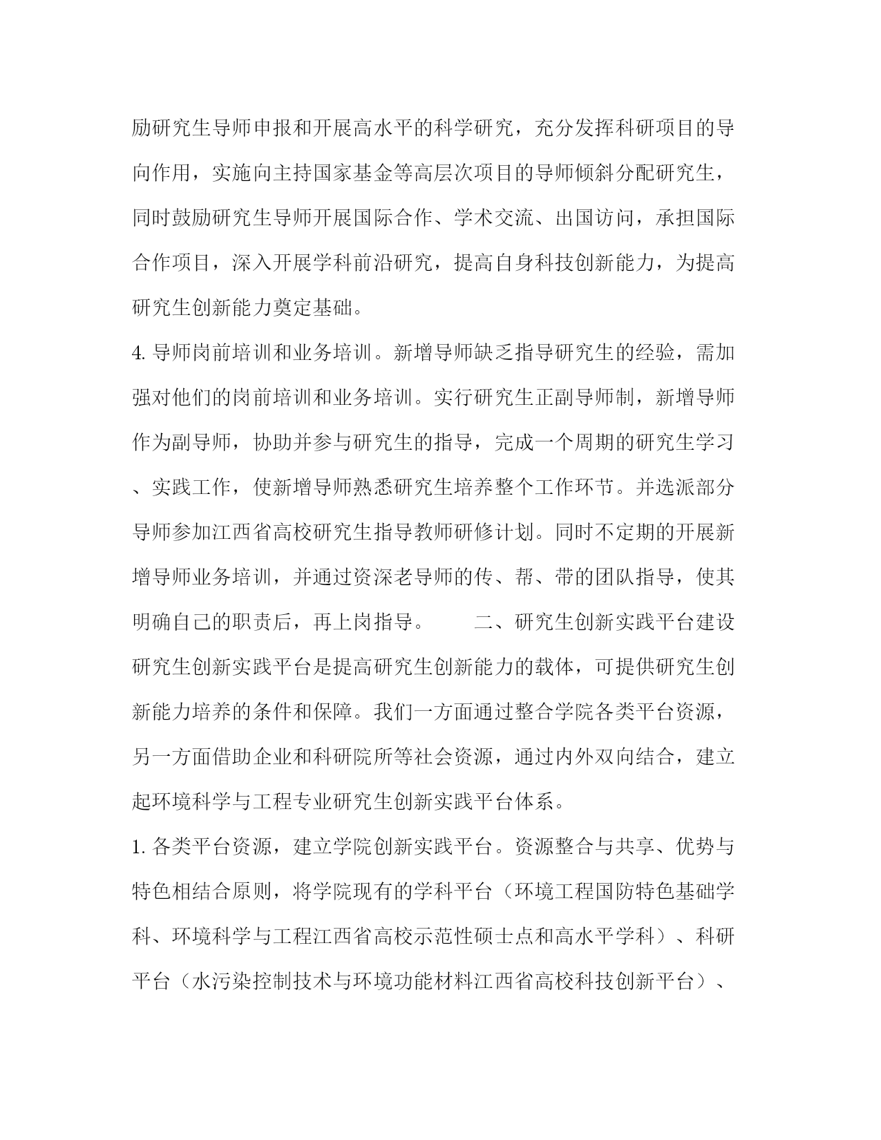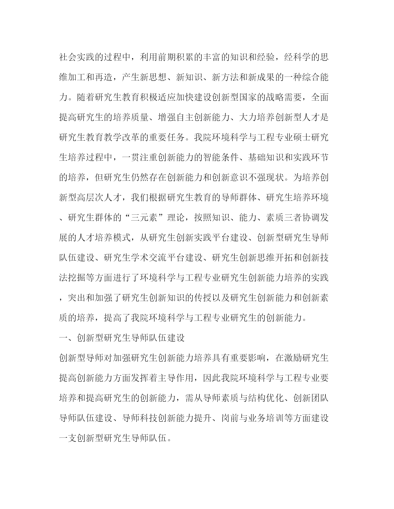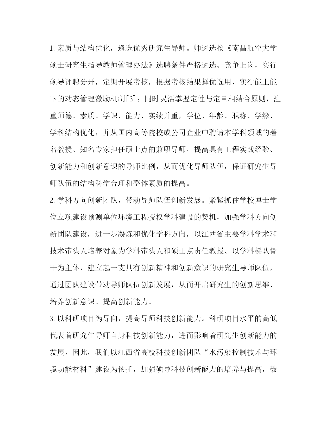 PAGE此资料由网络收集而来,如有侵权请告知上传者立即删除。资料共分享,我们负责传递知识。研究生创新能力培养的探索摘要:本文以南昌航空大学环境科学与工程专业研究生创新能力培养为例,从研究生导师素质与结构优化与遴选、学科方向创新团队导师队伍建设、导师科技创新能力发展以及导师岗前培训和业务培训等方面阐述了创新型研究生导师队伍建设;说明了加强产学研合作建设研究生创新基地和整合平台资源建立学院创新实践平台的研究生创新实践平台构建;介绍了一般性和专业性研究生学术交流平台建设;提出了研究生创新思维开拓和创新技法挖掘的方法;总结了导师和研究生创新能力提升取得的效果。关键词:创新能力;创新型导师;创新平台;创新思维中图分类号:G642.0文献标识码:A文章编号:1674-9324(2020)07-0096-03国家的创新能力特别是自主创新能力已成为知识经济时代衡量一个国家国际核心竞争力的关健要素。国家创新体系的提出和建立,为高校发挥并拓展其创新功能搭建了新的平台。而研究生教育最重要的使命就是培养具有创新能力和创新意识的高层次人才,从而实现国家创新体系的源头性创新和开拓型创新,进而发展和提升国家综合国力和综合竞争力。研究生创新能力是指研究生在从事理论研究、技术开发和社会实践的过程中,利用前期积累的丰富的知识和经验,经科学的思维加工和再造,产生新思想、新知识、新方法和新成果的一种综合能力。随着研究生教育积极适应加快建设创新型国家的战略需要,全面提高研究生的培养质量、增强自主创新能力、大力培养创新型人才是研究生教育教学改革的重要任务。我院环境科学与工程专业硕士研究生培养过程中,一贯注重创新能力的智能条件、基础知识和实践环节的培养,但研究生仍然存在创新能力和创新意识不强现状。为培养创新型高层次人才,我们根据研究生教育的导师群体、研究生培养环境、研究生群体的“三元素”理论,按照知识、能力、素质三者协调发展的人才培养模式,从研究生创新实践平台建设、创新型研究生导师队伍建设、研究生学术交流平台建设、研究生创新思维开拓和创新技法挖掘等方面进行了环境科学与工程专业研究生创新能力培养的实践,突出和加强了研究生创新知识的传授以及研究生创新能力和创新素质的培养,提高了我院环境科学与工程专业研究生的创新能力。一、创新型研究生导师队伍建设创新型导师对加强研究生创新能力培养具有重要影响,在激励研究生提高创新能力方面发挥着主导作用,因此我院环境科学与工程专业要培养和提高研究生的创新能力,需从导师素质与结构优化、创新团队导师队伍建设、导师科技创新能力提升、岗前与业务培训等方面建设一支创新型研究生导师队伍。1.素质与结构优化,遴选优秀研究生导师。师遴选按《南昌航空大学硕士研究生指导教师管理办法》选聘条件严格遴选、竞争上岗,实行硕导评聘分开,定期开展考核,根据考核结果择优选用,实行能上能下的动态管理激励机制[3];同时灵活掌握定性与定量相结合原则,注重师德、素质、学识、能力、实绩并重,学位、年龄、职称、学缘、学科结构优化,并从国内高等院校或公司企业中聘请本学科领域的著名教授、知名专家担任硕士点的兼职导师,提高具有工程实践经验、创新能力和创新意识的导师比例,从而优化导师队伍,保证研究生导师队伍的结构科学合理和整体素质的提高。2.学科方向创新团队,带动导师队伍创新发展。紧紧抓住学校博士学位立项建设预测单位环境工程授权学科建设的契机,加强学科方向创新团队建设,进一步凝炼和优化学科方向,以江西省主要学科学术和技术带头人培养对象为学科带头人和硕士点责任教授、以学科梯队骨干为主体,建立起一支具有创新精神和创新意识的研究生导师队伍,通过团队建设带动导师队伍创新发展,从而开启研究生的创新思维、培养创新意识、提高创新能力。3.以科研项目为导向,提高导师科技创新能力。科研项目水平的高低代表着研究生导师自身科技创新能力,进而影响着研究生创新能力的发展。因此,我们以江西省高校科技创新团队“水污染控制技术与环境功能材料”建设为依托,加强硕导科技创新能力的培养与提高,鼓励研究生导师申报和开展高水平的科学研究,充分发挥科研项目的导向作用,实施向主持国家基金等高层次项目的导师倾斜分配研究生,同时鼓励研究生导师开展国际合作、学术交流、出国访问,承担国际合作项目,深入开展学科前沿研究,提高自身科技创新能力,为提高研究生创新能力奠定基础。4.导师岗前培训和业务培训。新增导师缺乏指导研究生的经验,需加强对他们的岗前培训和业务培训。实行研究生正副导师制,新增导师作为副导师,协助并参与研究生的指导,完成一个周期的研究生学习、实践工作,使新增导师熟悉研究生培养整个工作环节。并选派部分导师参加江西省高校研究生指导教师研修计划。同时不定期的开展新增导师业务培训,并通过资深老导师的传、帮、带的团队指导,使其明确自