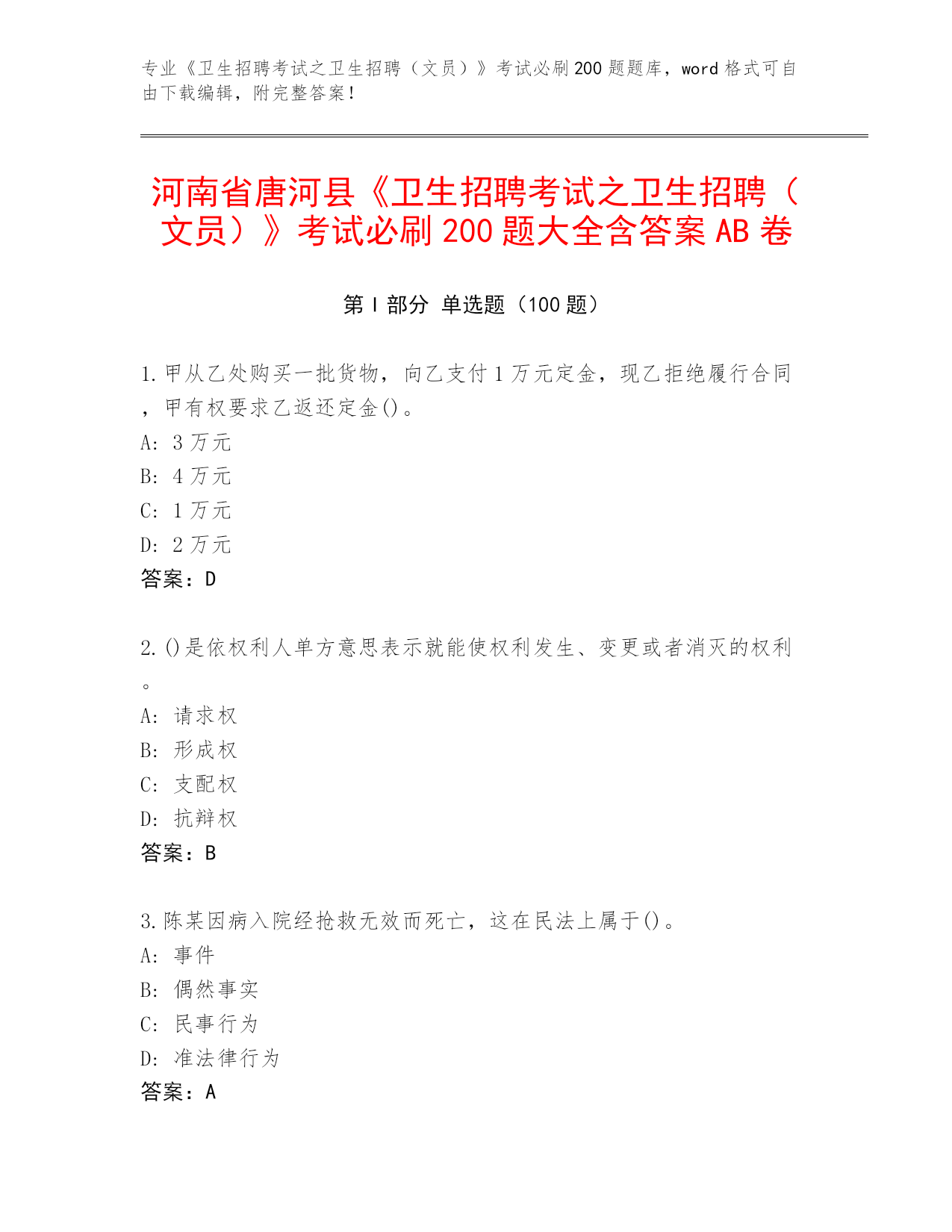 河南省唐河县《卫生招聘考试之卫生招聘(文员)》考试必刷200题大全含答案AB卷