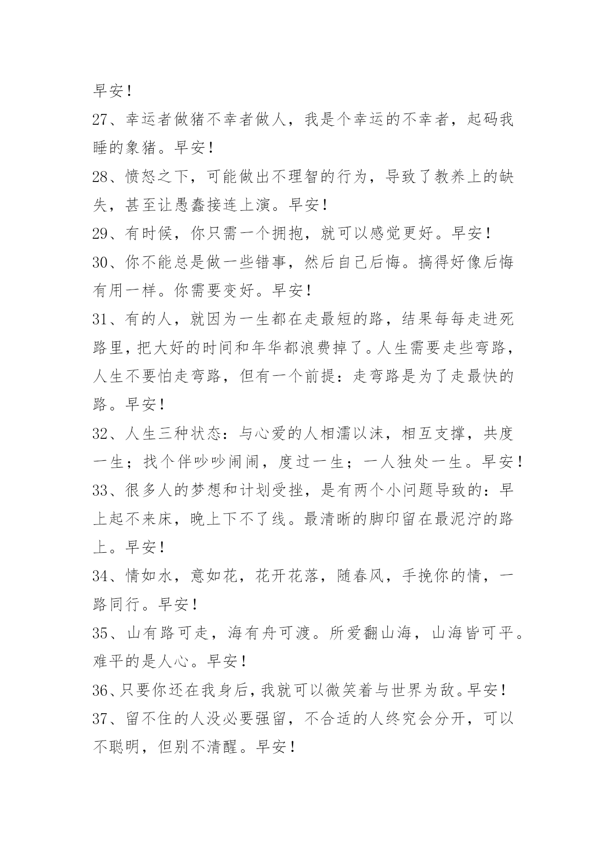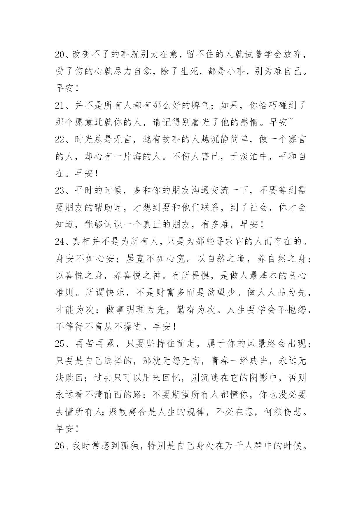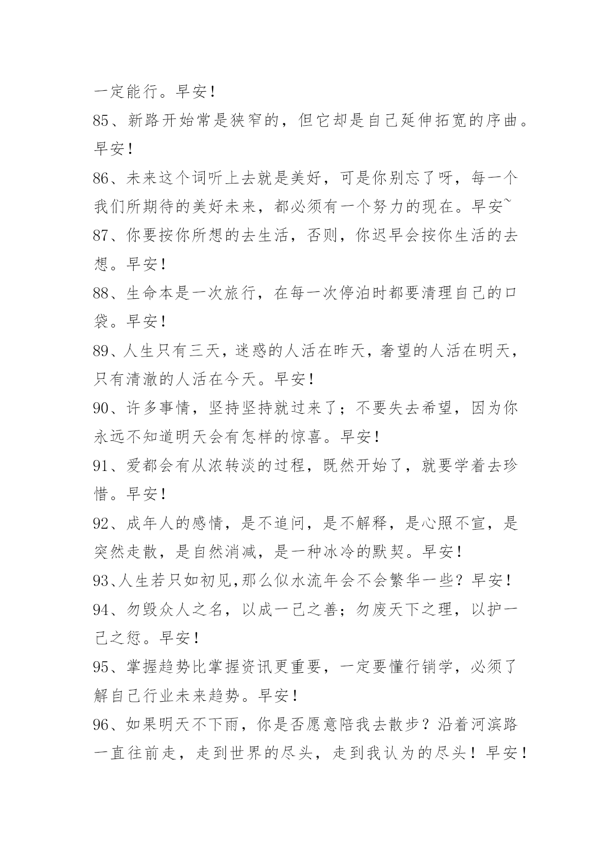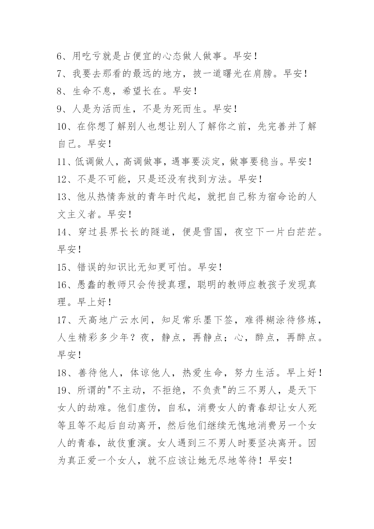 最新唯美早安文案最新唯美早安文案130句有些东西根本就无法拒绝,比如孤独,比如回忆,比如爱上你。早安!以下这篇是小编整理的一些唯美早安文案,希望大家喜欢。1、清晨的阳光柔柔的照进窗户,随着光洁的玻璃,洒下一层层均匀的光。树木在草丛上欢快的成长,花朵迎着太阳的脸绽放,鸟儿的歌声带着沉睡了一个晚上的力量,显得格外的清脆。仿佛每一个清晨,都像万物复苏,生机勃勃的春天。2、人生不问长短,我们每个人都有自己的故事,当我们看淡的时候心境才会秀丽,看开心情才会明媚。3、你可以没有梦想,但不能不知道现在要做什么,你可以长相平凡丢到人群里就被淹没,但不能随波逐流成为没有个性的复制品,你可以被压力逼迫得痛哭一百次,但哭完记得笑一千次给它看,你可以习惯为别人付出,但至少别忘了为自己而活,你可以学会假装,但最后不要变成你当初讨厌的那种人。早安!4、所有的努力,不是为了让别人觉得你了不起,而是首先让自己过充实有追求。人生的奔跑,不在于瞬间的爆发,取决于途中的坚持。早安~5、天有阴睛风雨,人有旦夕悲喜,让我们始终怀揣向上的的信心,顶烈日冒风雨,始终奋勇向前,经受人生路上的挑战,微笑着迎接胜利。6、用吃亏就是占便宜的心态做人做事。早安!7、我要去那看的最远的地方,披一道曙光在肩膀。早安!8、生命不息,希望长在。早安!9、人是为活而生,不是为死而生。早安!10、在你想了解别人也想让别人了解你之前,先完善并了解自己。早安!11、低调做人,高调做事,遇事要淡定,做事要稳当。早安!12、不是不可能,只是还没有找到方法。早安!13、他从热情奔放的青年时代起,就把自己称为宿命论的人文主义者。早安!14、穿过县界长长的隧道,便是雪国,夜空下一片白茫茫。早安!15、错误的知识比无知更可怕。早安!16、愚蠢的教师只会传授真理,聪明的教师应教孩子发现真理。早上好!17、天高地广云水间,知足常乐墨下签,难得糊涂待修炼,人生精彩多少年?夜,静点,再静点;心,醉点,再醉点。早安!18、善待他人,体谅他人,热爱生命,努力生活。早上好!19、所谓的"不主动,不拒绝,不负责"的三不男人,是天下女人的劫难。他们虚伪,自私,消费女人的青春却让女人死等且等不起后自动离开,然后他们继续无愧地消费另一个女人的青春,故伎重演。女人遇到三不男人时要坚决离开。因为真正爱一个女人,就不应该让她无尽地等待!早安!20、改变不了的事就别太在意,留不住的人就试着学会放弃,受了伤的心就尽力自愈,除了生死,都是小事,别为难自己。早安!21、并不是所有人都有那么好的脾气;如果,你恰巧碰到了那个愿意迁就你的人,请记得别磨光了他的感情。早安~22、时光总是无言,越有故事的人越沉静简单,做一个寡言的人,却心有一片海的人。不伤人害己,于淡泊中,平和自在。早安!23、平时的时候,多和你的朋友沟通交流一下,不要等到需要朋友的帮助时,才想到要和他们联系,到了社会,你才会知道,能够认识一个真正的朋友,有多难。早安!24、真相并不是为所有人,只是为那些寻求它的人而存在的。身安不如心安;屋宽不如心宽。以自然之道,养自然之身;以喜悦之身,养喜悦之神。有所畏惧,是做人最基本的良心准则。所谓快乐,不是财富多而是欲望少。做人人品为先,才能为次;做事明理为先,勤奋为次。人生要学会不抱怨,不等待不盲从不燥进。早安!25、再苦再累,只要坚持往前走,属于你的风景终会出现;只要是自己选择的,那就无怨无悔,青春一经典当,永远无法赎回;过去只可以用来回忆,别沉迷在它的阴影中,否则永远看不清前面的路;不要期望所有人都懂你,你也没必要去懂所有人;聚散离合是人生的规律,不必在意,何须伤悲。早安!26、我时常感到孤独,特别是自己身处在万千人群中的时候。早安!27、幸运者做猪不幸者做人,我是个幸运的不幸者,起码我睡的象猪。早安!28、愤怒之下,可能做出不理智的行为,导致了教养上的缺失,甚至让愚蠢接连上演。早安!29、有时候,你只需一个拥抱,就可以感觉更好。早安!30、你不能总是做一些错事,然后自己后悔。搞得好像后悔有用一样。你需要变好。早安!31、有的人,就因为一生都在走最短的路,结果每每走进死路里,把大好的时间和年华都浪费掉了。人生需要走些弯路,人生不要怕走弯路,但有一个前提:走弯路是为了走最快的路。早安!32、人生三种状态:与心爱的人相濡以沫,相互支撑,共度一生;找个伴吵吵闹闹,度过一生;一人独处一生。早安!33、很多人的梦想和计划受挫,是有两个小问题导致的:早上起不来床,晚上下不了线。最清晰的脚印留在最泥泞的路上。早安!34、情如水,意如花,花开花落,随春风,手挽你的情,一路同行。早安!35、山有路可走,海有舟可渡。所爱翻山海,山海皆可平。难平的是人心。早安!36、只要你还在我身后,我就可以微笑着与世界为敌。早安!37、留不住的人没必要强留,不合适的人终究会