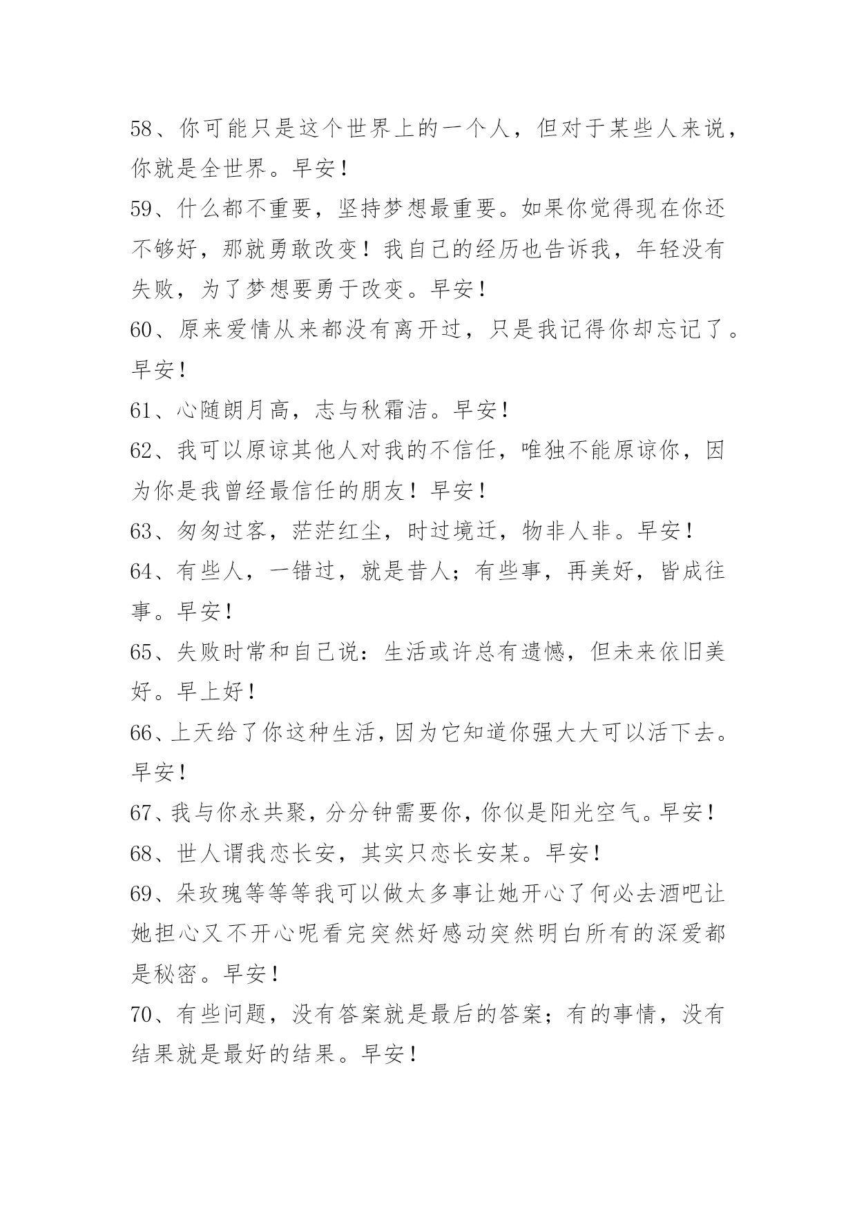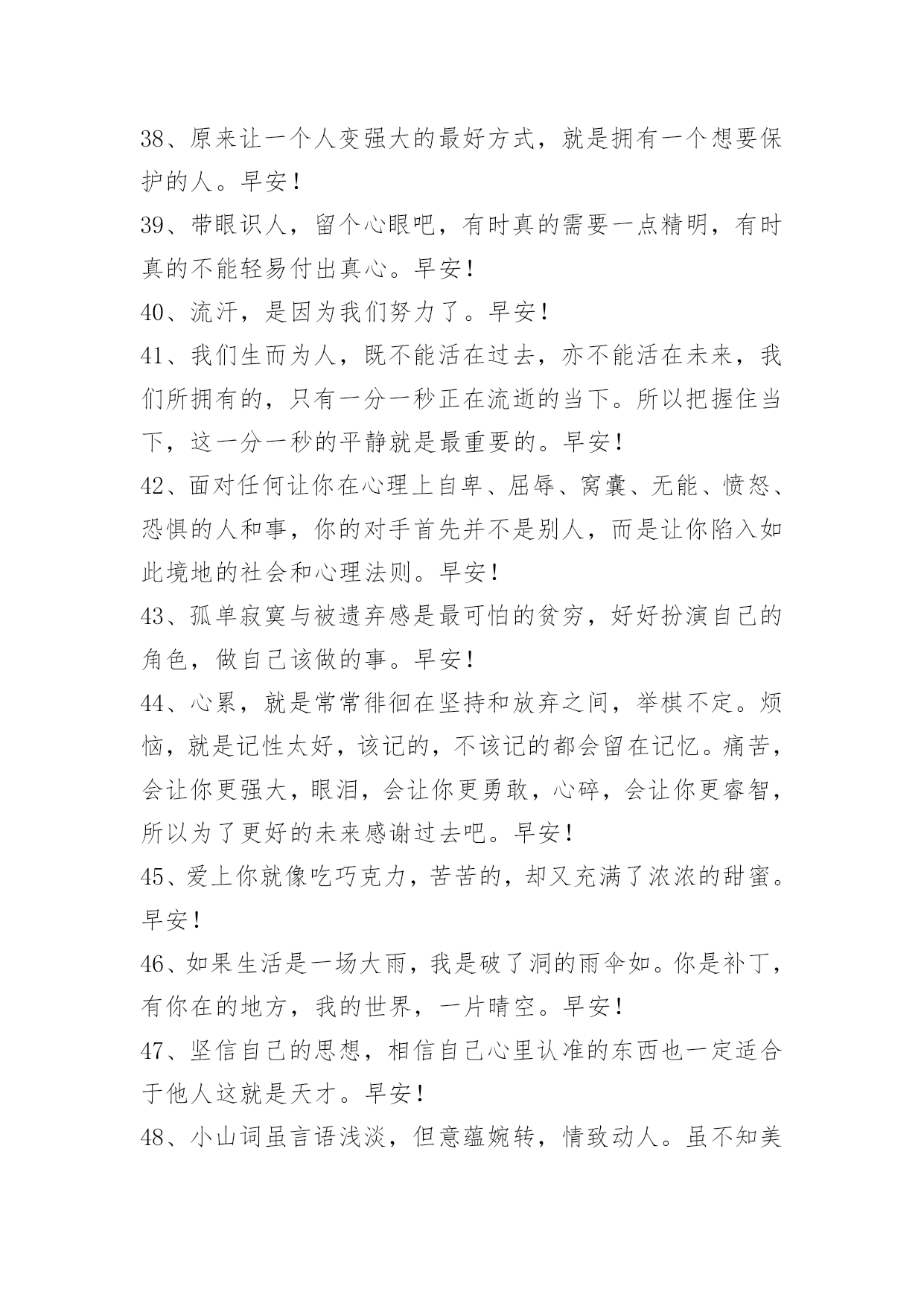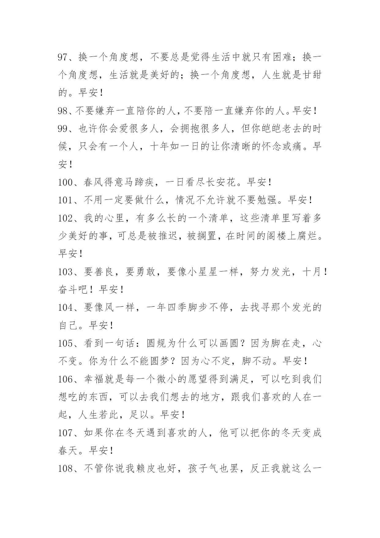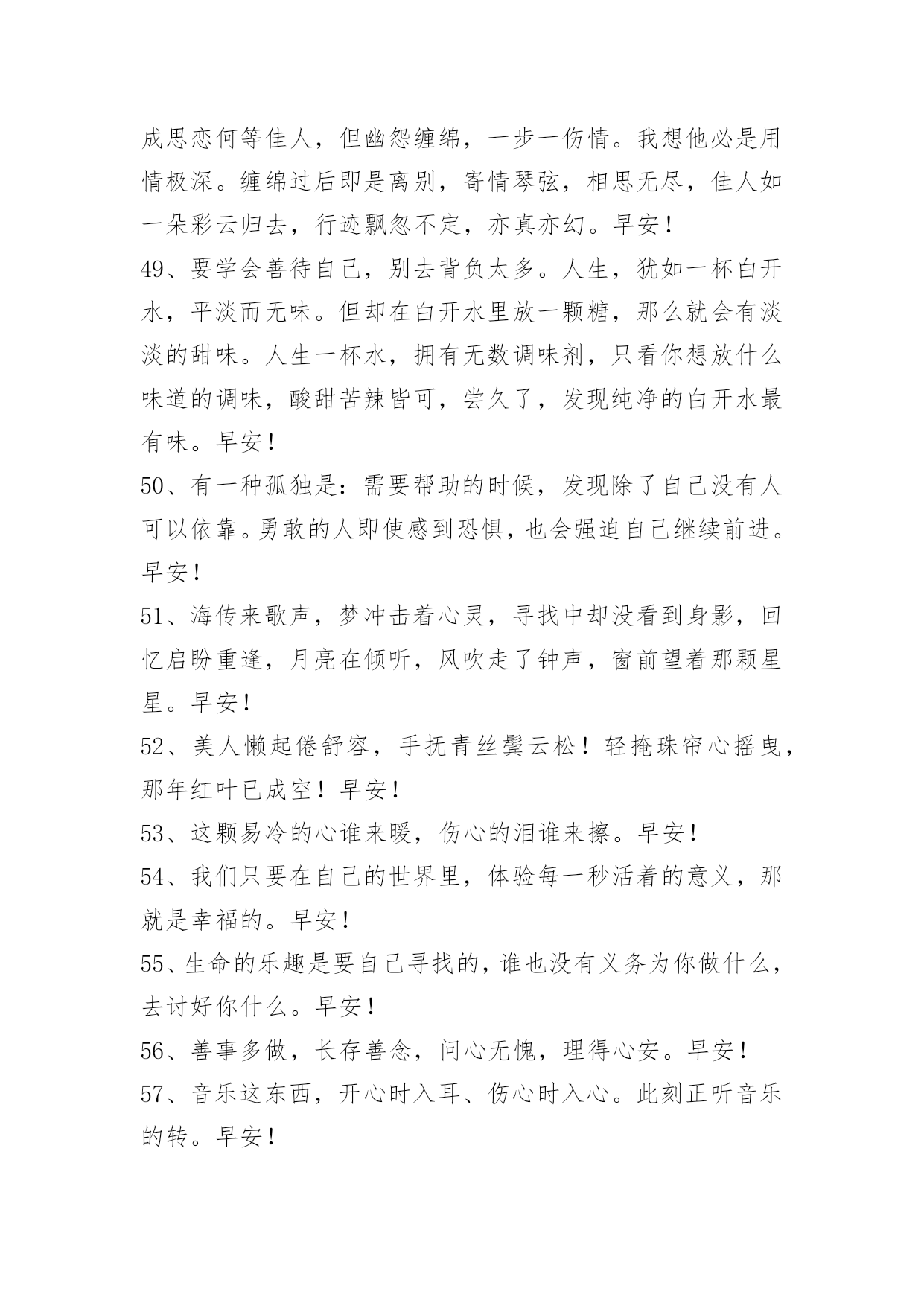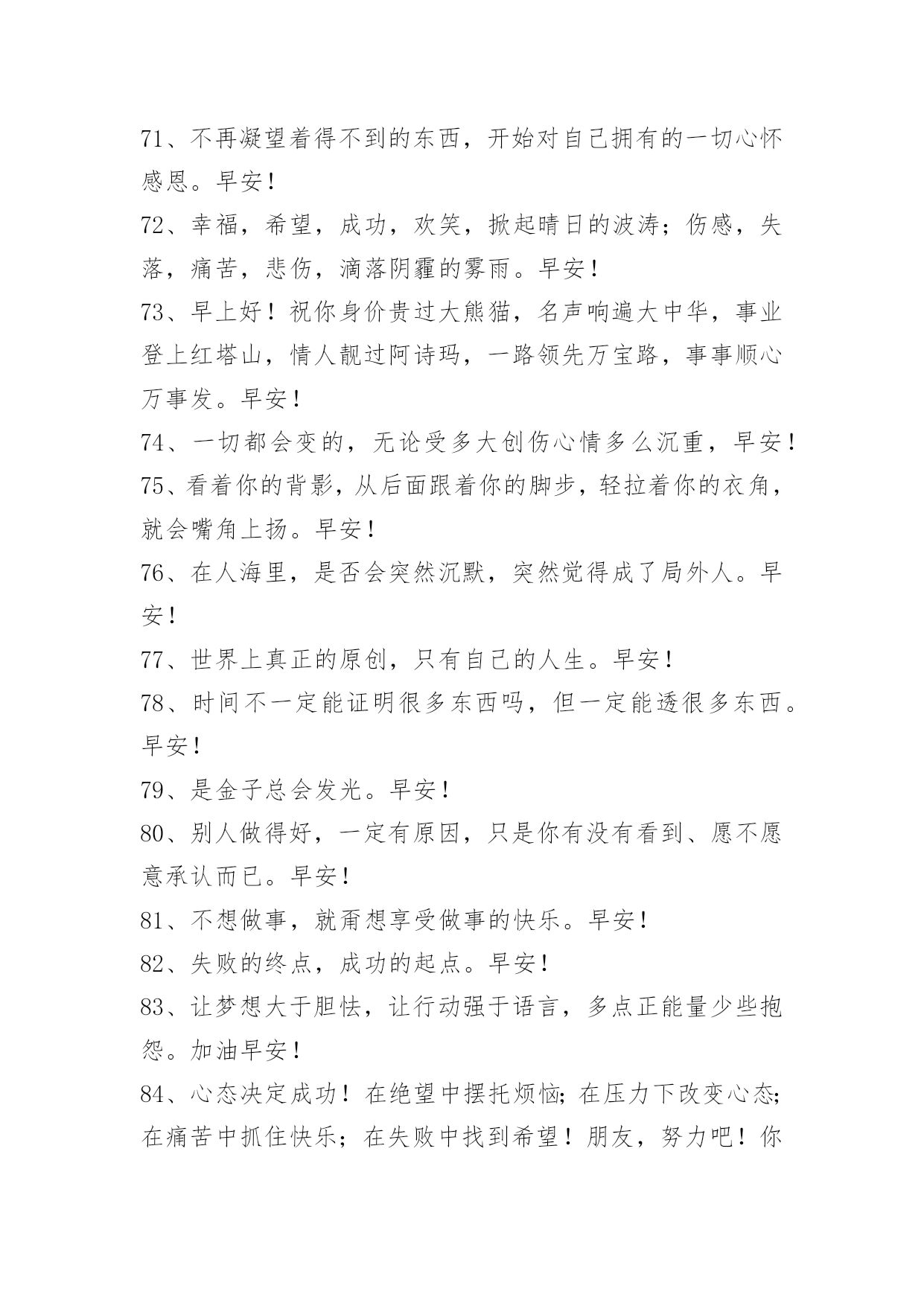 最新唯美早安文案最新唯美早安文案130句有些东西根本就无法拒绝,比如孤独,比如回忆,比如爱上你。早安!以下这篇是小编整理的一些唯美早安文案,希望大家喜欢。1、清晨的阳光柔柔的照进窗户,随着光洁的玻璃,洒下一层层均匀的光。树木在草丛上欢快的成长,花朵迎着太阳的脸绽放,鸟儿的歌声带着沉睡了一个晚上的力量,显得格外的清脆。仿佛每一个清晨,都像万物复苏,生机勃勃的春天。2、人生不问长短,我们每个人都有自己的故事,当我们看淡的时候心境才会秀丽,看开心情才会明媚。3、你可以没有梦想,但不能不知道现在要做什么,你可以长相平凡丢到人群里就被淹没,但不能随波逐流成为没有个性的复制品,你可以被压力逼迫得痛哭一百次,但哭完记得笑一千次给它看,你可以习惯为别人付出,但至少别忘了为自己而活,你可以学会假装,但最后不要变成你当初讨厌的那种人。早安!4、所有的努力,不是为了让别人觉得你了不起,而是首先让自己过充实有追求。人生的奔跑,不在于瞬间的爆发,取决于途中的坚持。早安~5、天有阴睛风雨,人有旦夕悲喜,让我们始终怀揣向上的的信心,顶烈日冒风雨,始终奋勇向前,经受人生路上的挑战,微笑着迎接胜利。6、用吃亏就是占便宜的心态做人做事。早安!7、我要去那看的最远的地方,披一道曙光在肩膀。早安!8、生命不息,希望长在。早安!9、人是为活而生,不是为死而生。早安!10、在你想了解别人也想让别人了解你之前,先完善并了解自己。早安!11、低调做人,高调做事,遇事要淡定,做事要稳当。早安!12、不是不可能,只是还没有找到方法。早安!13、他从热情奔放的青年时代起,就把自己称为宿命论的人文主义者。早安!14、穿过县界长长的隧道,便是雪国,夜空下一片白茫茫。早安!15、错误的知识比无知更可怕。早安!16、愚蠢的教师只会传授真理,聪明的教师应教孩子发现真理。早上好!17、天高地广云水间,知足常乐墨下签,难得糊涂待修炼,人生精彩多少年?夜,静点,再静点;心,醉点,再醉点。早安!18、善待他人,体谅他人,热爱生命,努力生活。早上好!19、所谓的"不主动,不拒绝,不负责"的三不男人,是天下女人的劫难。他们虚伪,自私,消费女人的青春却让女人死等且等不起后自动离开,然后他们继续无愧地消费另一个女人的青春,故伎重演。女人遇到三不男人时要坚决离开。因为真正爱一个女人,就不应该让她无尽地等待!早安!20、改变不了的事就别太在意,留不住的人就试着学会放弃,受了伤的心就尽力自愈,除了生死,都是小事,别为难自己。早安!21、并不是所有人都有那么好的脾气;如果,你恰巧碰到了那个愿意迁就你的人,请记得别磨光了他的感情。早安~22、时光总是无言,越有故事的人越沉静简单,做一个寡言的人,却心有一片海的人。不伤人害己,于淡泊中,平和自在。早安!23、平时的时候,多和你的朋友沟通交流一下,不要等到需要朋友的帮助时,才想到要和他们联系,到了社会,你才会知道,能够认识一个真正的朋友,有多难。早安!24、真相并不是为所有人,只是为那些寻求它的人而存在的。身安不如心安;屋宽不如心宽。以自然之道,养自然之身;以喜悦之身,养喜悦之神。有所畏惧,是做人最基本的良心准则。所谓快乐,不是财富多而是欲望少。做人人品为先,才能为次;做事明理为先,勤奋为次。人生要学会不抱怨,不等待不盲从不燥进。早安!25、再苦再累,只要坚持往前走,属于你的风景终会出现;只要是自己选择的,那就无怨无悔,青春一经典当,永远无法赎回;过去只可以用来回忆,别沉迷在它的阴影中,否则永远看不清前面的路;不要期望所有人都懂你,你也没必要去懂所有人;聚散离合是人生的规律,不必在意,何须伤悲。早安!26、我时常感到孤独,特别是自己身处在万千人群中的时候。早安!27、幸运者做猪不幸者做人,我是个幸运的不幸者,起码我睡的象猪。早安!28、愤怒之下,可能做出不理智的行为,导致了教养上的缺失,甚至让愚蠢接连上演。早安!29、有时候,你只需一个拥抱,就可以感觉更好。早安!30、你不能总是做一些错事,然后自己后悔。搞得好像后悔有用一样。你需要变好。早安!31、有的人,就因为一生都在走最短的路,结果每每走进死路里,把大好的时间和年华都浪费掉了。人生需要走些弯路,人生不要怕走弯路,但有一个前提:走弯路是为了走最快的路。早安!32、人生三种状态:与心爱的人相濡以沫,相互支撑,共度一生;找个伴吵吵闹闹,度过一生;一人独处一生。早安!33、很多人的梦想和计划受挫,是有两个小问题导致的:早上起不来床,晚上下不了线。最清晰的脚印留在最泥泞的路上。早安!34、情如水,意如花,花开花落,随春风,手挽你的情,一路同行。早安!35、山有路可走,海有舟可渡。所爱翻山海,山海皆可平。难平的是人心。早安!36、只要你还在我身后,我就可以微笑着与世界为敌。早安!37、留不住的人没必要强留,不合适的人终究会