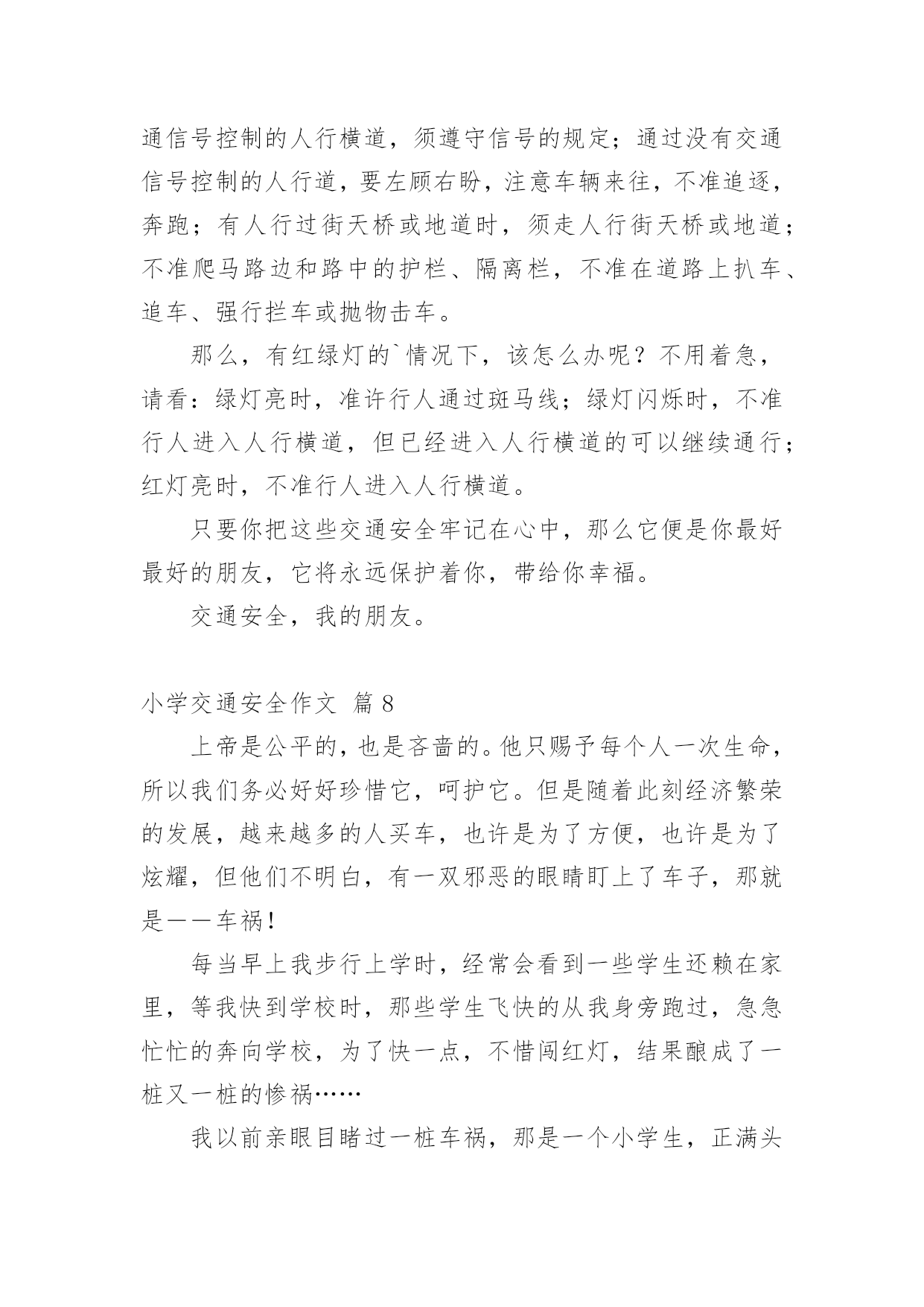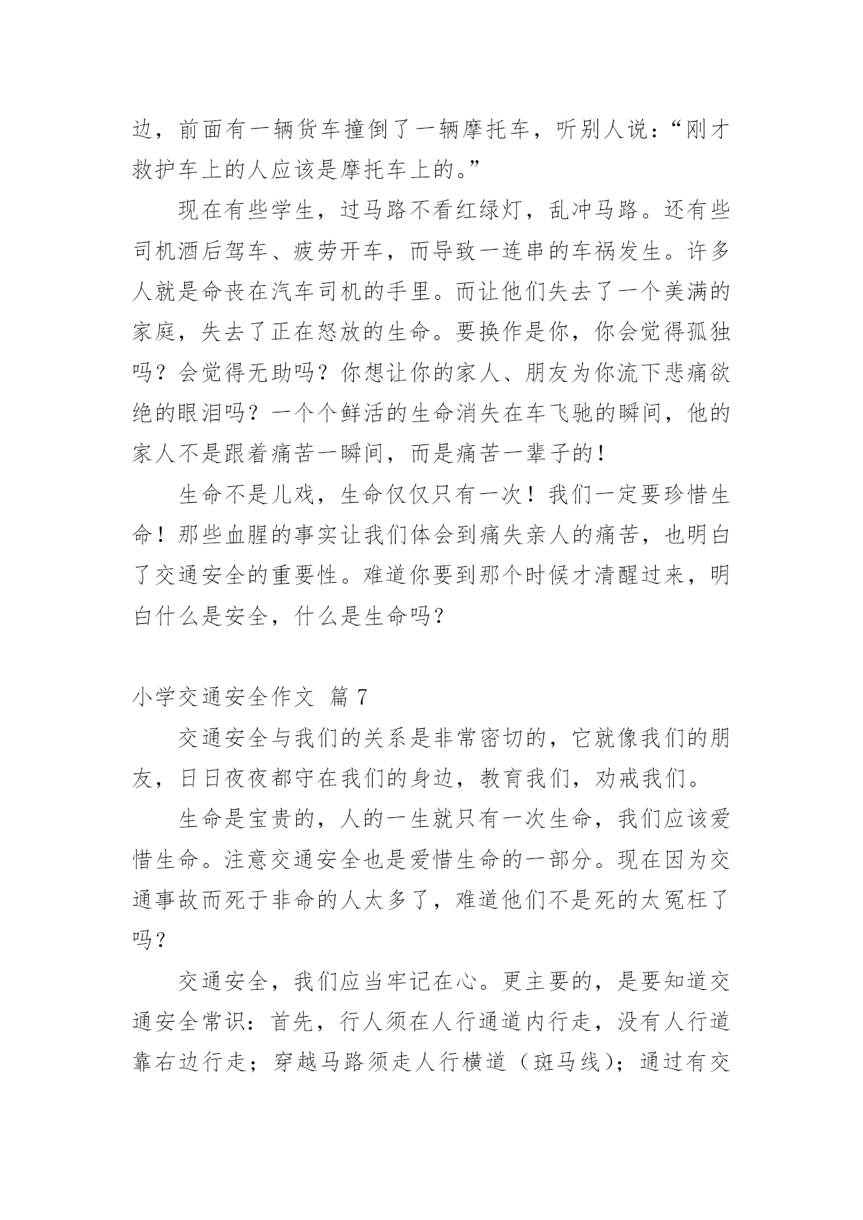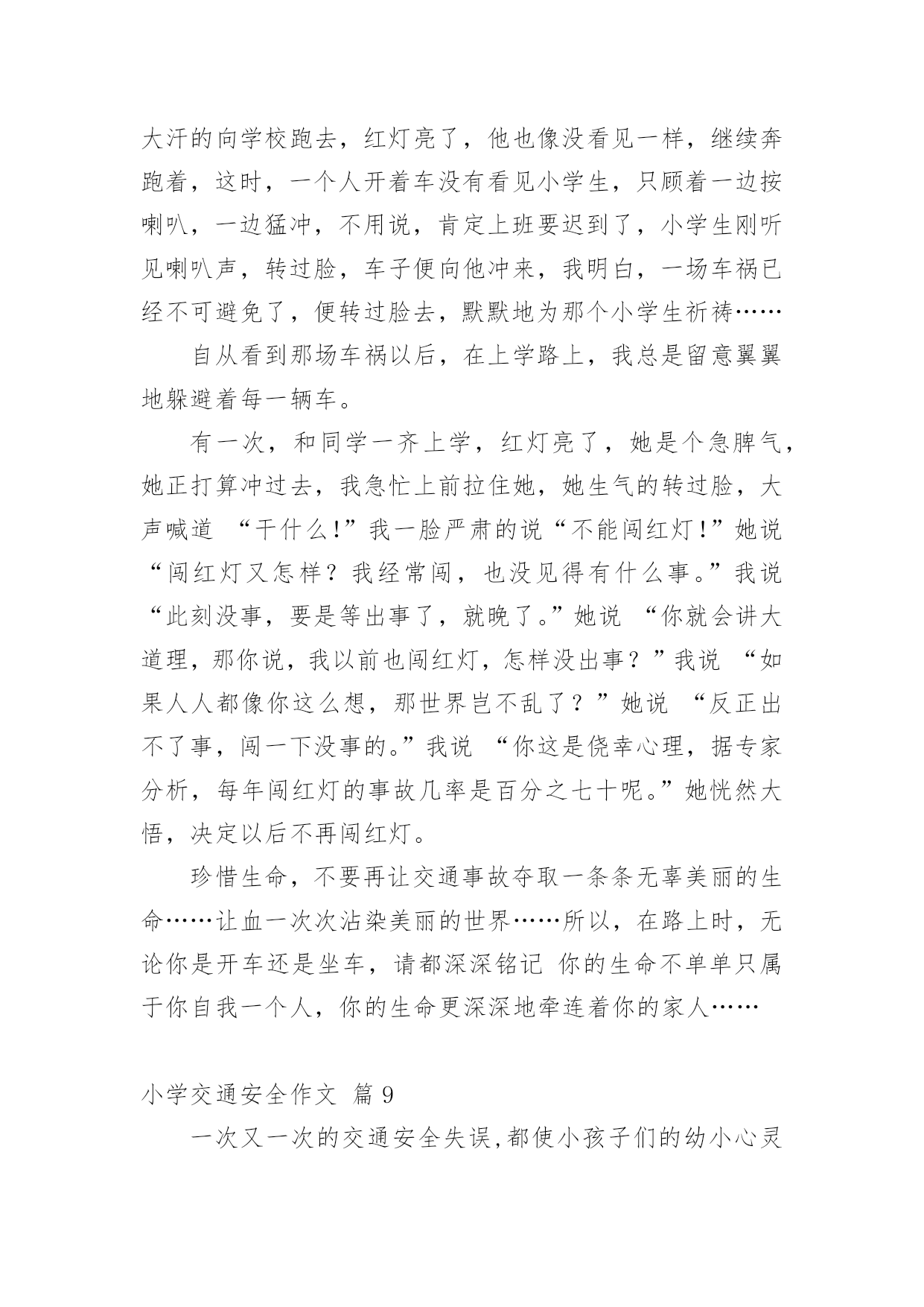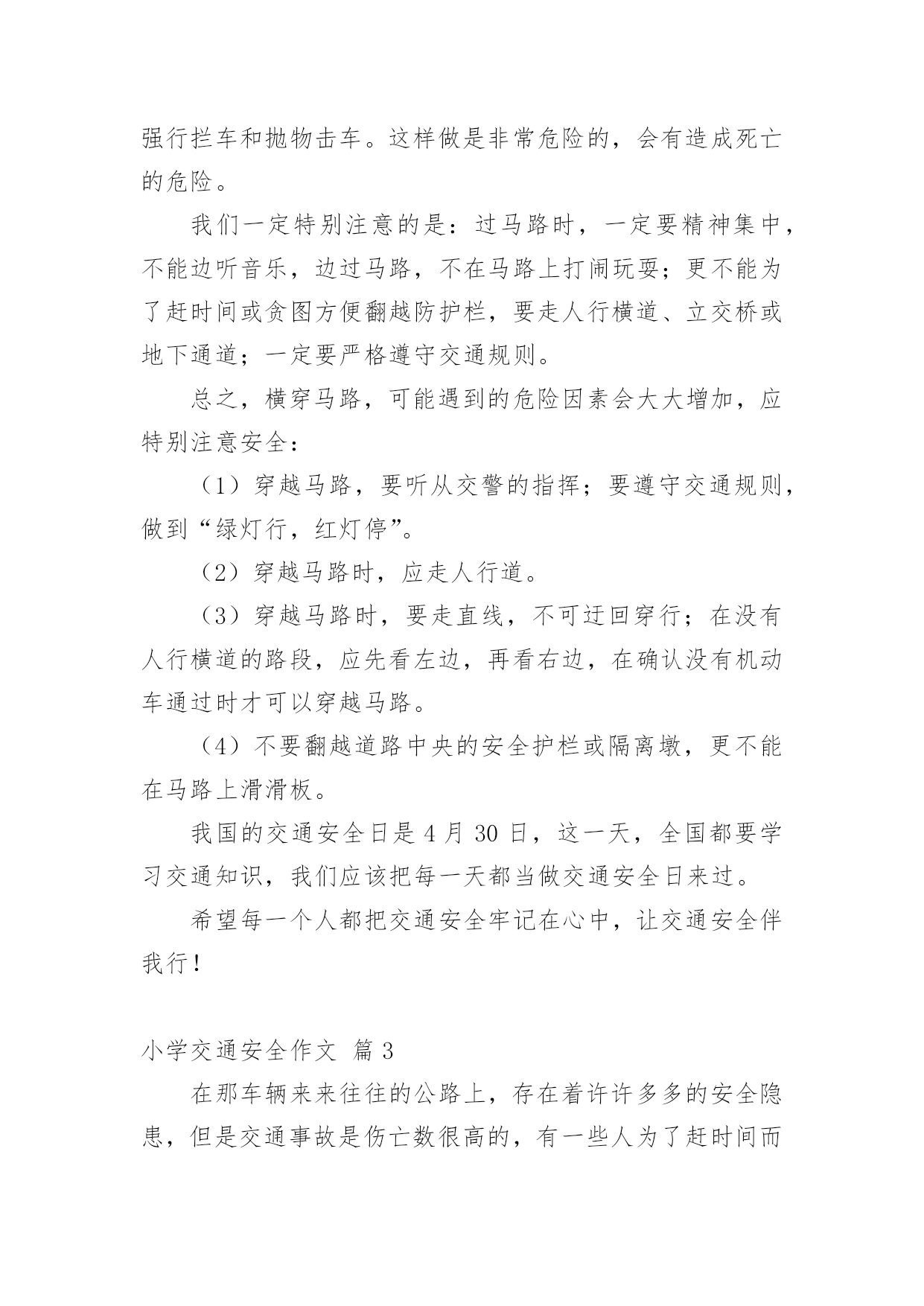 小学交通安全作文精选小学交通安全作文锦集十篇在日常生活或是工作学习中,大家都跟作文打过交道吧,作文要求篇章结构完整,一定要避免无结尾作文的出现。写起作文来就毫无头绪?以下是小编精心整理的小学交通安全作文10篇,希望能够帮助到大家。小学交通安全作文篇1今天老师给我们看了一段视频,题目是《流泪的花季》。《流泪的花季》讲述的是一个单腿女孩林霞的故事。林霞如今已经读初一。在六年前的一天,她吃完饭,他的爸爸要她去街上买包烟。她蹦蹦跳跳地去给爸爸买烟,街上的车子川流不息。林霞眼看就快到商店了,突然意想不到的事情发生了。一辆疾驰而来的大卡车撞到了她,她的左腿被卡进了车轮里,她的左腿已经血肉模糊了,当时的场面真是惨不忍睹啊!那个黑心的司机说是要送她去医院,其实是把她送到了荒郊野外,对她置之不理。终于,交警救了她,并把她送去医院。医生说:如果再迟来半个小时,她就会有生命危险。所以我们要遵守交通规则,做到红灯停,绿灯行;行人要走人行道;不要在马路上玩耍;穿越马路要一停,二看,三通过。世界上生命是最宝贵的,所以我们要遵守交通规则。小学交通安全作文篇2如今,城市里的车辆越来越多,有许多的小学生随意穿行公路,在马路中间打闹玩耍,造成了一件又一件悲惨的交通事故,我们绝对不能忽视交通安全问题。为了预防交通事故的发生,我们必须做到以下几点:我们必须在人行道内行走。每天上学、放学回家都必须在马路两边的人行道上步行,一切机动车辆都不准走人行道,要各行其道。在不得已横穿马路时,必须遵守交通规则,不能乱闯乱碰。我们应该尽量去走斑马线,在有交通信号控制的人行横道,须按信号灯的指示通过,显示绿灯时才能通过;在没有交通信号控制的人行横道,须注意车辆,不要追逐猛跑或是骑车载人(未满12周岁,禁止骑车上路)。小朋友们在没有人行横道的路段,更应遵守交通规则,必须直行通过,不要斜穿猛跑,这样会使交通发生混乱,更影响司机的心情,从而大大增加了交通事故的发生机率。不要在车辆临近时突然横穿,要注意避让车辆,不要和车辆抢道。通过时,先看左边的来车,因为首先威胁自己的是左边来的车辆;到了路中间就看右边的来车,目测车速和距离,确认安全时才可以通过。过马路时要耐心等待绿灯,不要急着乱闯,更不能翻越护栏或坐在马路上。穿越栏杆,使人车混行,会增加事故发生的可能性。最危险的是穿越铁路道口护栏与火车争道抢行,这样可能会被火车卷入轮下。绝对不准在道路上扒车、追车、强行拦车和抛物击车。这样做是非常危险的,会有造成死亡的危险。我们一定特别注意的是:过马路时,一定要精神集中,不能边听音乐,边过马路,不在马路上打闹玩耍;更不能为了赶时间或贪图方便翻越防护栏,要走人行横道、立交桥或地下通道;一定要严格遵守交通规则。总之,横穿马路,可能遇到的危险因素会大大增加,应特别注意安全:(1)穿越马路,要听从交警的指挥;要遵守交通规则,做到“绿灯行,红灯停”。(2)穿越马路时,应走人行道。(3)穿越马路时,要走直线,不可迂回穿行;在没有人行横道的路段,应先看左边,再看右边,在确认没有机动车通过时才可以穿越马路。(4)不要翻越道路中央的安全护栏或隔离墩,更不能在马路上滑滑板。我国的交通安全日是4月30日,这一天,全国都要学习交通知识,我们应该把每一天都当做交通安全日来过。希望每一个人都把交通安全牢记在心中,让交通安全伴我行!小学交通安全作文篇3在那车辆来来往往的公路上,存在着许许多多的安全隐患,但是交通事故是伤亡数很高的,有一些人为了赶时间而闯红灯,轻轻一闯,就造成了不可想象的后果。儿童伤亡竟然要超过成人,这一切有两个原因,第一是自己不自觉,第二是父母没有管好。所以我们要有安全意识。“嘀嘟,嘀嘟,嘀嘟……”又是一阵震撼人心的救护车声,马路上又出现了一片血迹:一个中年人躺在地上痛苦地呻吟,那呻吟中掺杂着无限的悔恨,所有人都无奈地望着流血不止的当事人,深深地叹着一口口粗气……交通事故时时刻刻都会发生,它就像一颗威力十足的炸药,一时大意,这颗埋伏在我们生活中的炸药就会爆炸,炸得家庭破碎,炸得人心悲苦。以上的事例告诉我们,我们不能不尊守交通,自己的安全由自己掌握,有可能就在一秒钟内就从这个世界上消失,难道你就因为一点点时间而浪费生命吗???交通安全就如一个警钟,时时刻刻地敲着,注意!!!生命就掌握在自己的手里!小学交通安全作文篇4每一天大约有100人死于交通安全,安全对我们来讲固然重要。而因为每一天死神都会降临,一个个幸福美满的家庭而因此变得支离破碎。在我家旁边住着一家温馨的人。每一天当她的爸爸下班时都会去学校接她,她妈妈一回到家就做饭,吃完饭后都会去公园散散步、聊聊家事,所以每一天他们家都过得和乐融融。可这一切却被一场突如其来的交通事故而打破。那件事是发生在星期三的下午,天下着倾盆大雨,她爸爸一如既往的去学校接她,在过人行道的时
