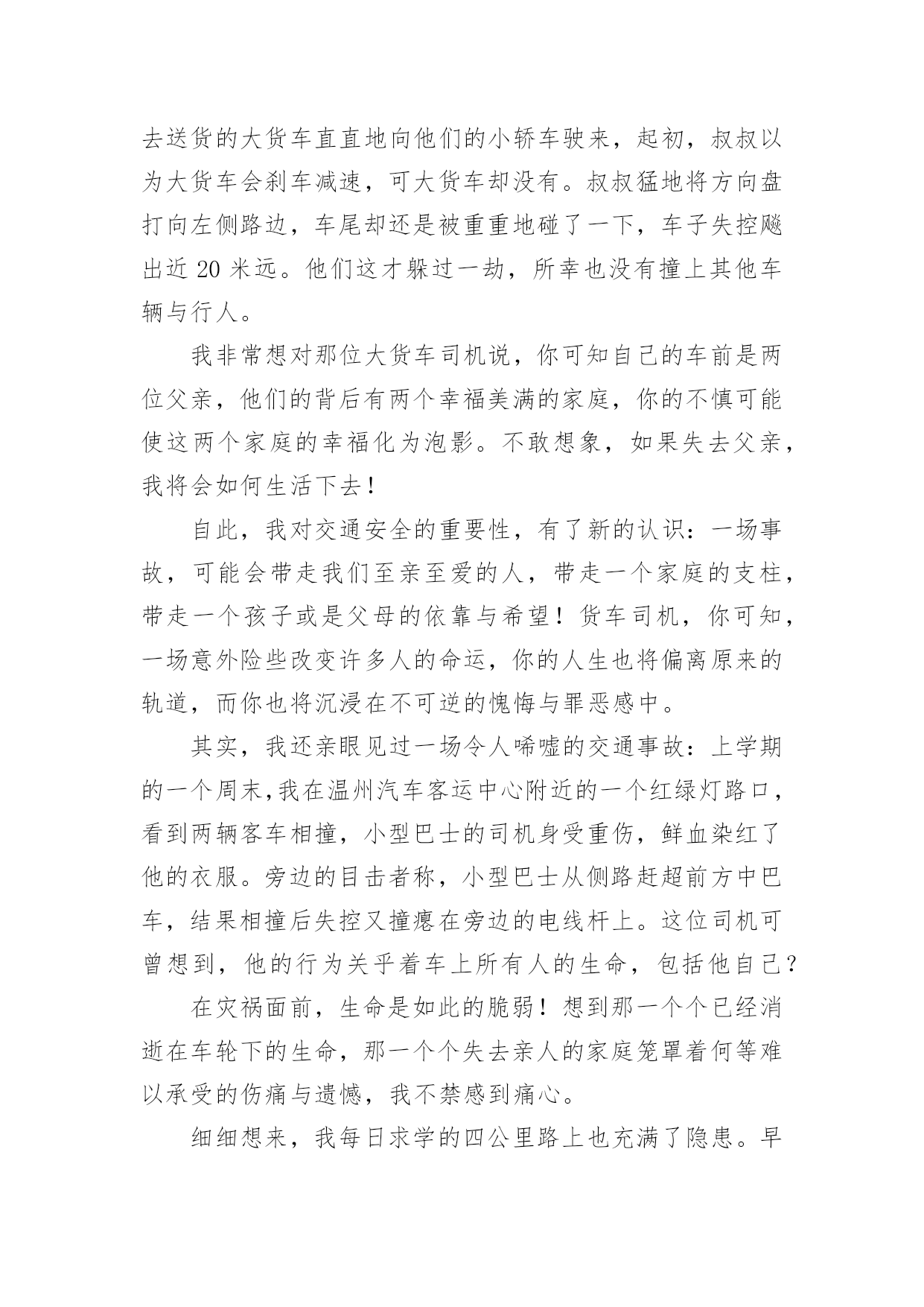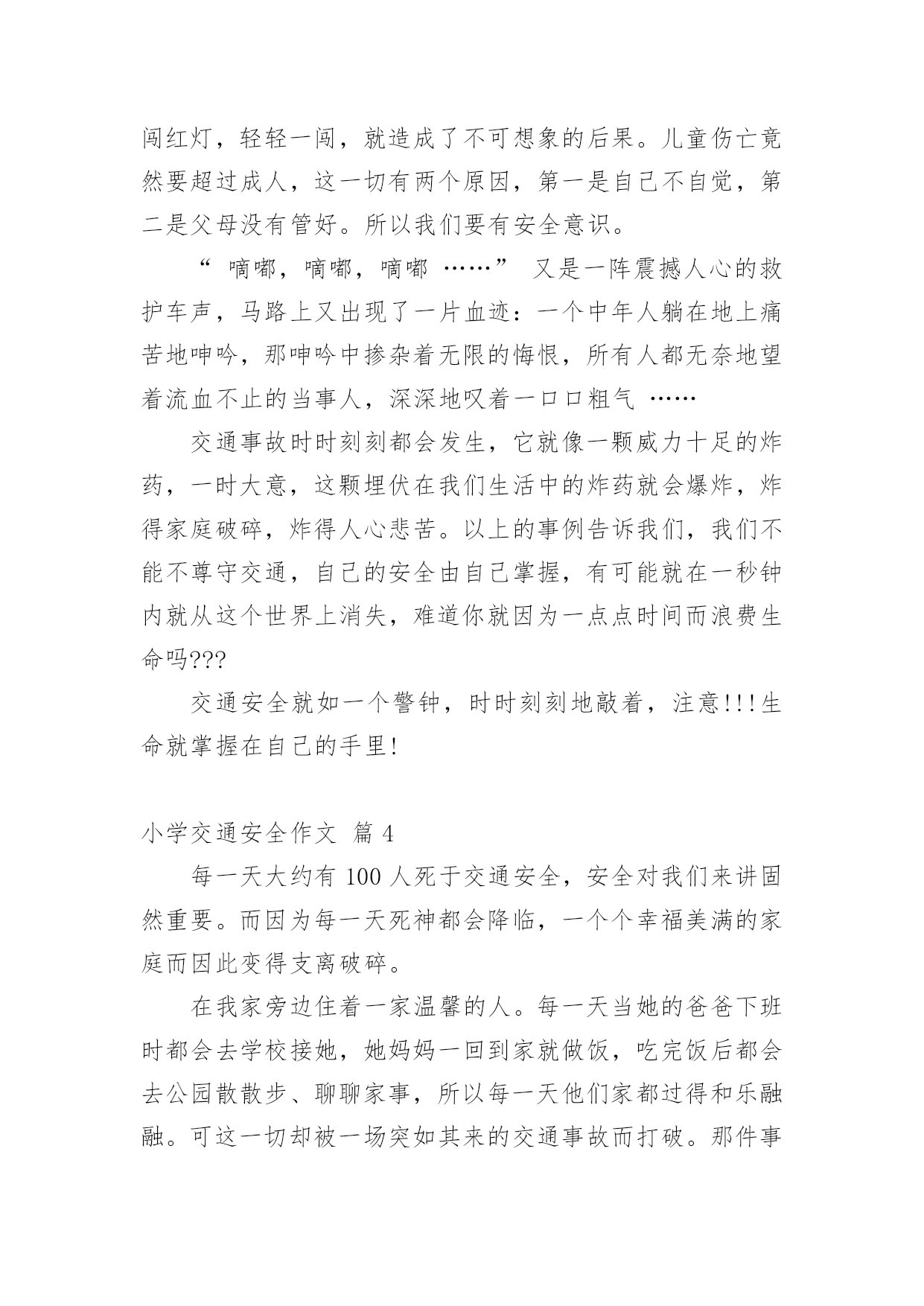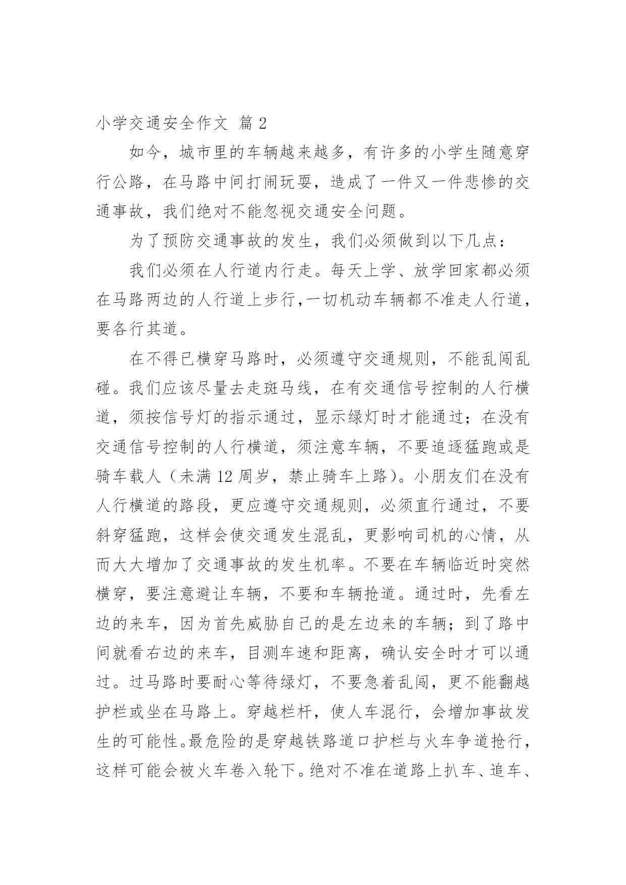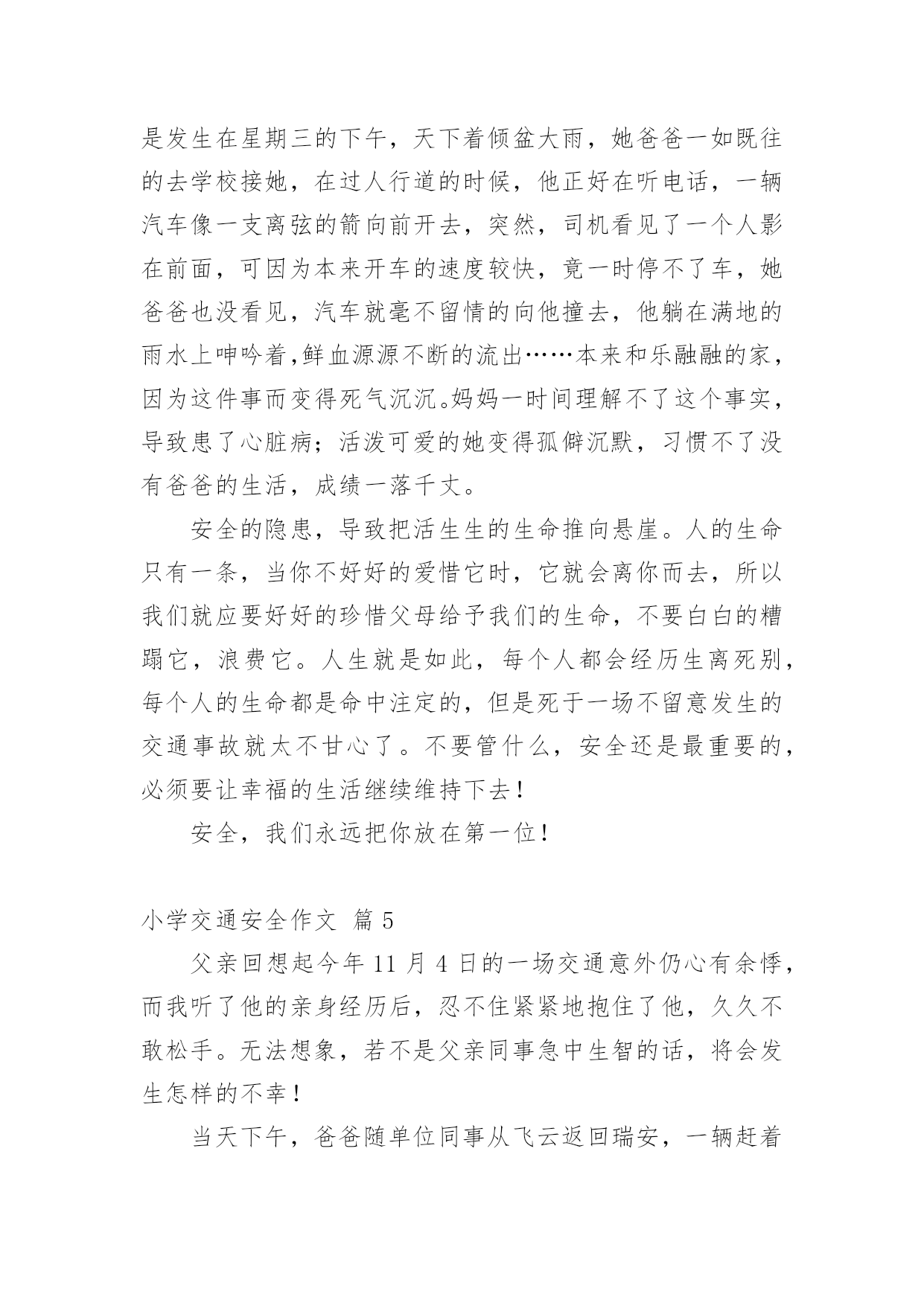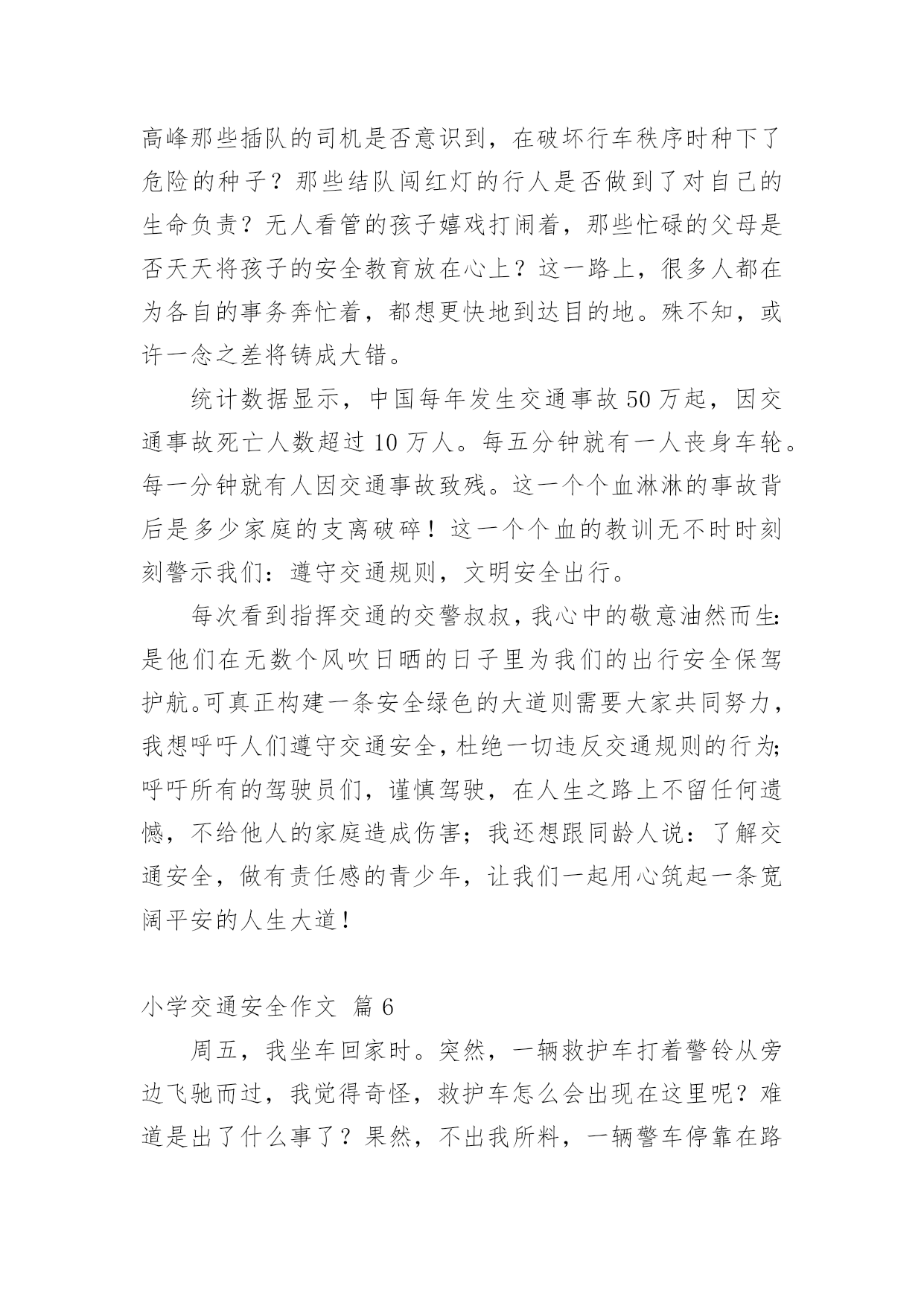 小学交通安全作文精选小学交通安全作文锦集十篇在日常生活或是工作学习中,大家都跟作文打过交道吧,作文要求篇章结构完整,一定要避免无结尾作文的出现。写起作文来就毫无头绪?以下是小编精心整理的小学交通安全作文10篇,希望能够帮助到大家。小学交通安全作文篇1今天老师给我们看了一段视频,题目是《流泪的花季》。《流泪的花季》讲述的是一个单腿女孩林霞的故事。林霞如今已经读初一。在六年前的一天,她吃完饭,他的爸爸要她去街上买包烟。她蹦蹦跳跳地去给爸爸买烟,街上的车子川流不息。林霞眼看就快到商店了,突然意想不到的事情发生了。一辆疾驰而来的大卡车撞到了她,她的左腿被卡进了车轮里,她的左腿已经血肉模糊了,当时的场面真是惨不忍睹啊!那个黑心的司机说是要送她去医院,其实是把她送到了荒郊野外,对她置之不理。终于,交警救了她,并把她送去医院。医生说:如果再迟来半个小时,她就会有生命危险。所以我们要遵守交通规则,做到红灯停,绿灯行;行人要走人行道;不要在马路上玩耍;穿越马路要一停,二看,三通过。世界上生命是最宝贵的,所以我们要遵守交通规则。小学交通安全作文篇2如今,城市里的车辆越来越多,有许多的小学生随意穿行公路,在马路中间打闹玩耍,造成了一件又一件悲惨的交通事故,我们绝对不能忽视交通安全问题。为了预防交通事故的发生,我们必须做到以下几点:我们必须在人行道内行走。每天上学、放学回家都必须在马路两边的人行道上步行,一切机动车辆都不准走人行道,要各行其道。在不得已横穿马路时,必须遵守交通规则,不能乱闯乱碰。我们应该尽量去走斑马线,在有交通信号控制的人行横道,须按信号灯的指示通过,显示绿灯时才能通过;在没有交通信号控制的人行横道,须注意车辆,不要追逐猛跑或是骑车载人(未满12周岁,禁止骑车上路)。小朋友们在没有人行横道的路段,更应遵守交通规则,必须直行通过,不要斜穿猛跑,这样会使交通发生混乱,更影响司机的心情,从而大大增加了交通事故的发生机率。不要在车辆临近时突然横穿,要注意避让车辆,不要和车辆抢道。通过时,先看左边的来车,因为首先威胁自己的是左边来的车辆;到了路中间就看右边的来车,目测车速和距离,确认安全时才可以通过。过马路时要耐心等待绿灯,不要急着乱闯,更不能翻越护栏或坐在马路上。穿越栏杆,使人车混行,会增加事故发生的可能性。最危险的是穿越铁路道口护栏与火车争道抢行,这样可能会被火车卷入轮下。绝对不准在道路上扒车、追车、强行拦车和抛物击车。这样做是非常危险的,会有造成死亡的危险。我们一定特别注意的是:过马路时,一定要精神集中,不能边听音乐,边过马路,不在马路上打闹玩耍;更不能为了赶时间或贪图方便翻越防护栏,要走人行横道、立交桥或地下通道;一定要严格遵守交通规则。总之,横穿马路,可能遇到的危险因素会大大增加,应特别注意安全:(1)穿越马路,要听从交警的指挥;要遵守交通规则,做到“绿灯行,红灯停”。(2)穿越马路时,应走人行道。(3)穿越马路时,要走直线,不可迂回穿行;在没有人行横道的路段,应先看左边,再看右边,在确认没有机动车通过时才可以穿越马路。(4)不要翻越道路中央的安全护栏或隔离墩,更不能在马路上滑滑板。我国的交通安全日是4月30日,这一天,全国都要学习交通知识,我们应该把每一天都当做交通安全日来过。希望每一个人都把交通安全牢记在心中,让交通安全伴我行!小学交通安全作文篇3在那车辆来来往往的公路上,存在着许许多多的安全隐患,但是交通事故是伤亡数很高的,有一些人为了赶时间而闯红灯,轻轻一闯,就造成了不可想象的后果。儿童伤亡竟然要超过成人,这一切有两个原因,第一是自己不自觉,第二是父母没有管好。所以我们要有安全意识。“嘀嘟,嘀嘟,嘀嘟……”又是一阵震撼人心的救护车声,马路上又出现了一片血迹:一个中年人躺在地上痛苦地呻吟,那呻吟中掺杂着无限的悔恨,所有人都无奈地望着流血不止的当事人,深深地叹着一口口粗气……交通事故时时刻刻都会发生,它就像一颗威力十足的炸药,一时大意,这颗埋伏在我们生活中的炸药就会爆炸,炸得家庭破碎,炸得人心悲苦。以上的事例告诉我们,我们不能不尊守交通,自己的安全由自己掌握,有可能就在一秒钟内就从这个世界上消失,难道你就因为一点点时间而浪费生命吗???交通安全就如一个警钟,时时刻刻地敲着,注意!!!生命就掌握在自己的手里!小学交通安全作文篇4每一天大约有100人死于交通安全,安全对我们来讲固然重要。而因为每一天死神都会降临,一个个幸福美满的家庭而因此变得支离破碎。在我家旁边住着一家温馨的人。每一天当她的爸爸下班时都会去学校接她,她妈妈一回到家就做饭,吃完饭后都会去公园散散步、聊聊家事,所以每一天他们家都过得和乐融融。可这一切却被一场突如其来的交通事故而打破。那件事是发生在星期三的下午,天下着倾盆大雨,她爸爸一如既往的去学校接她,在过人行道的时