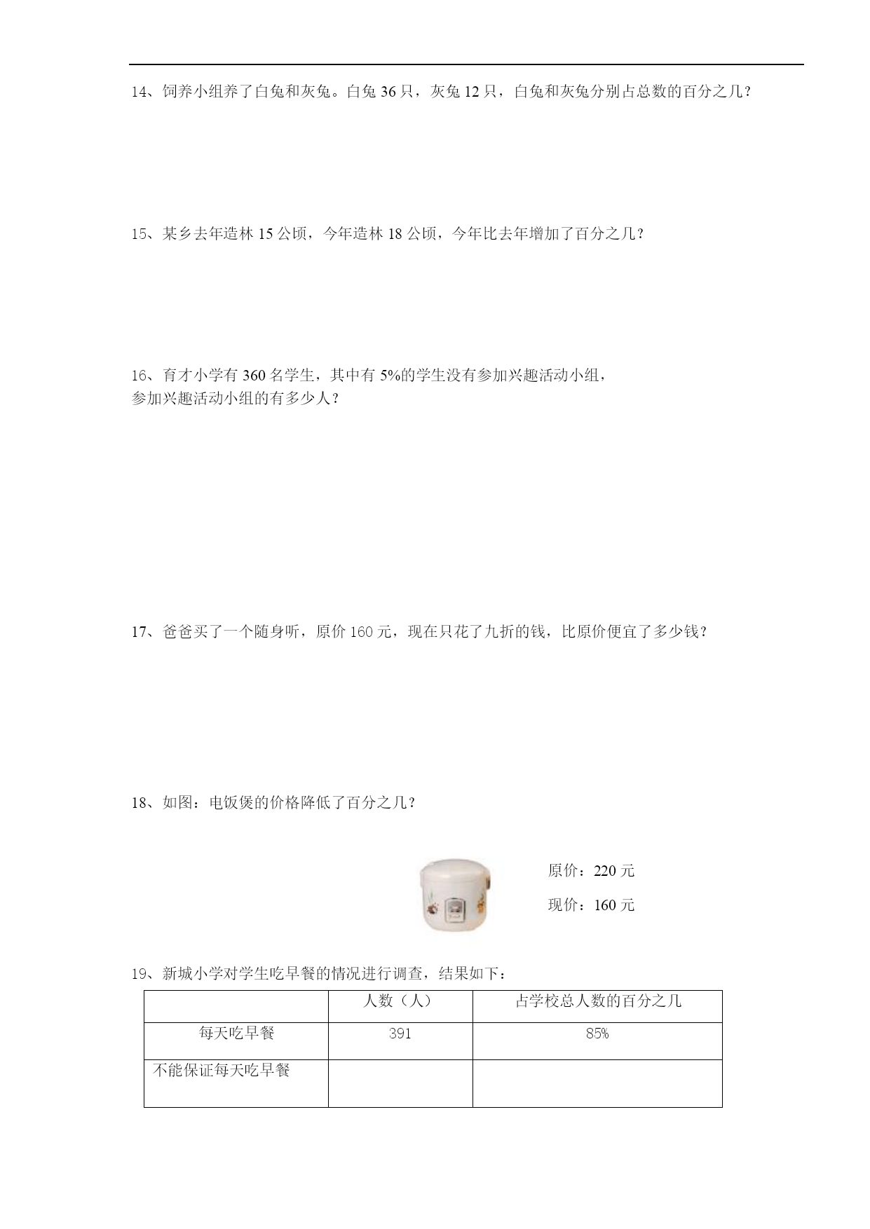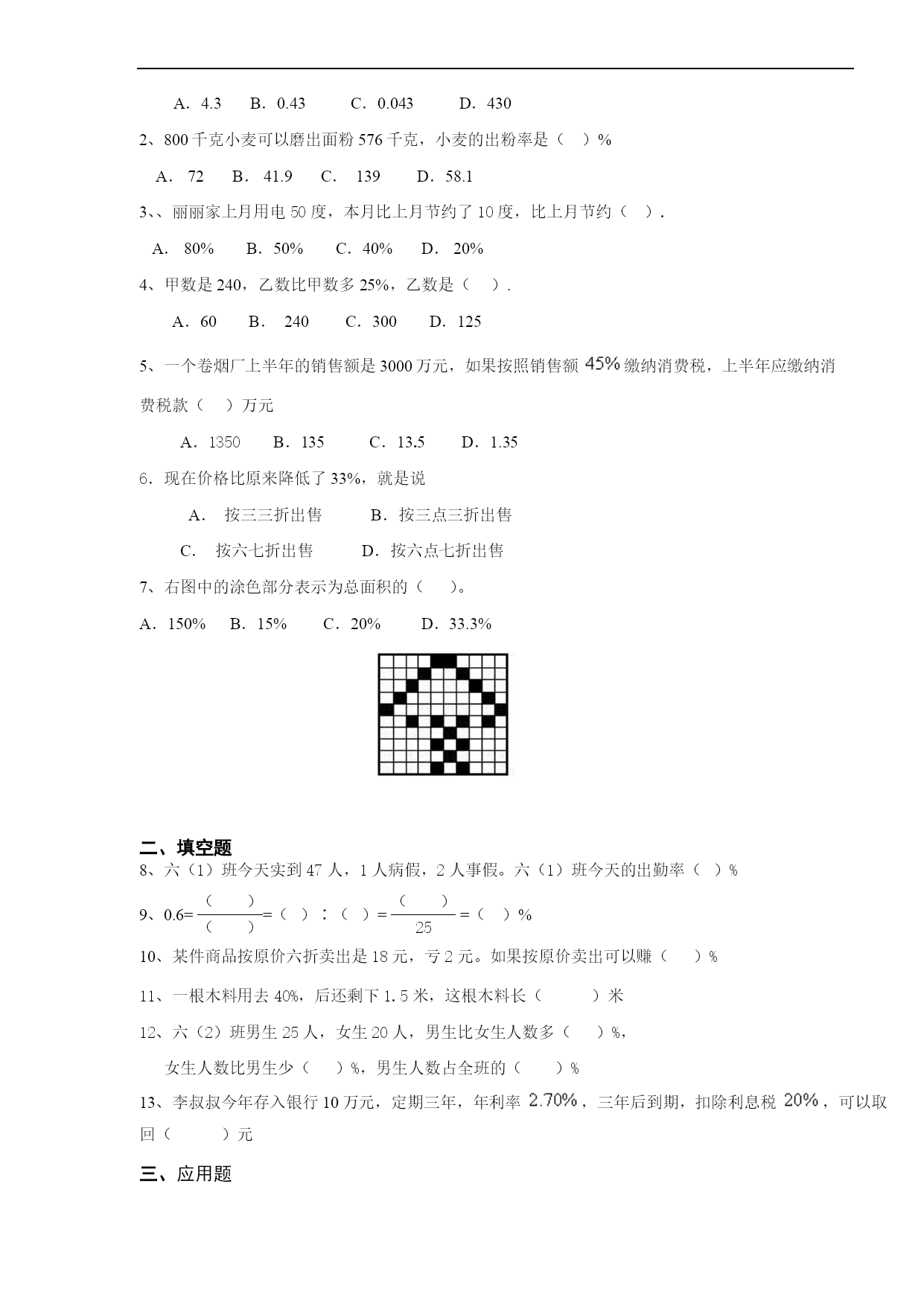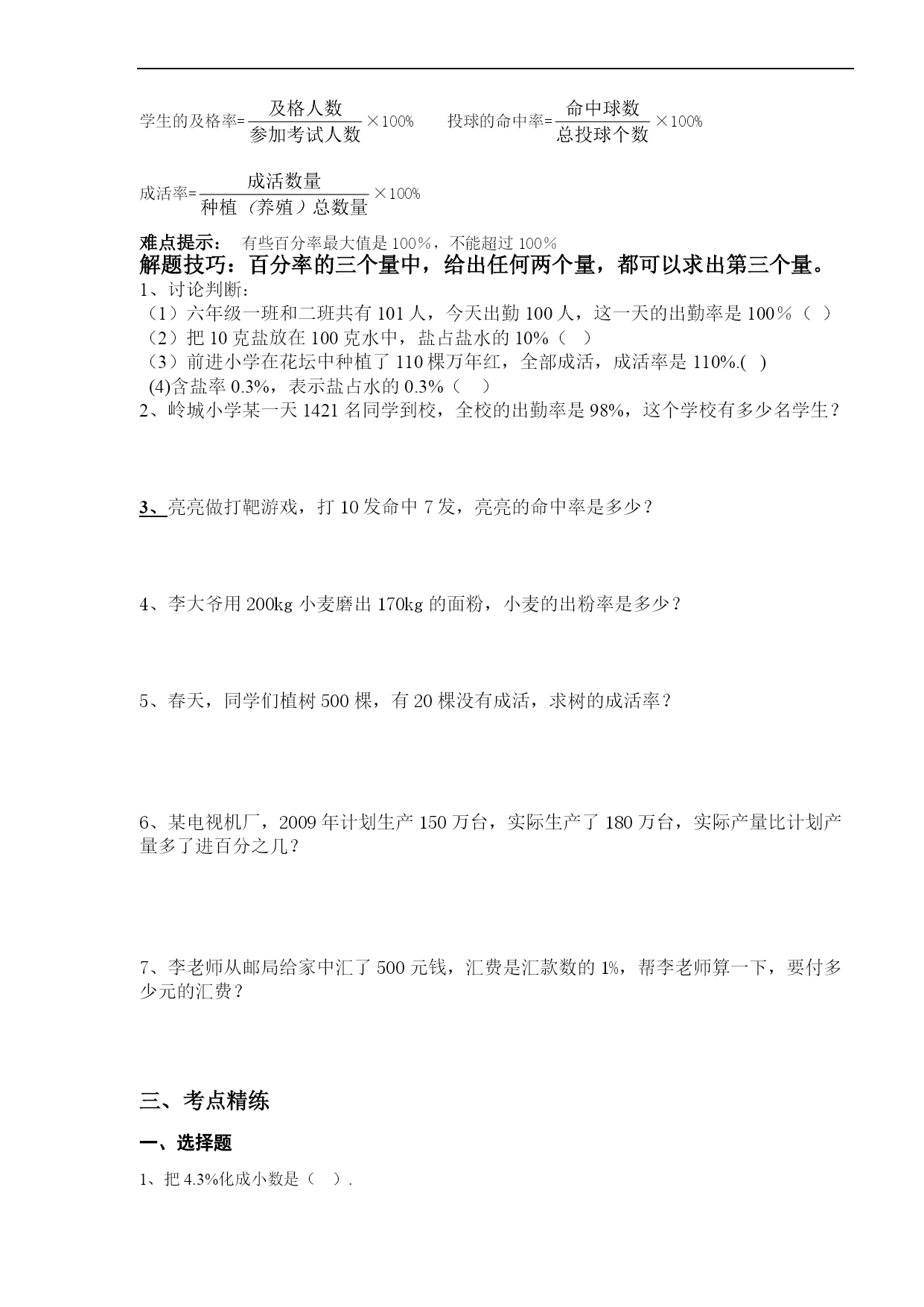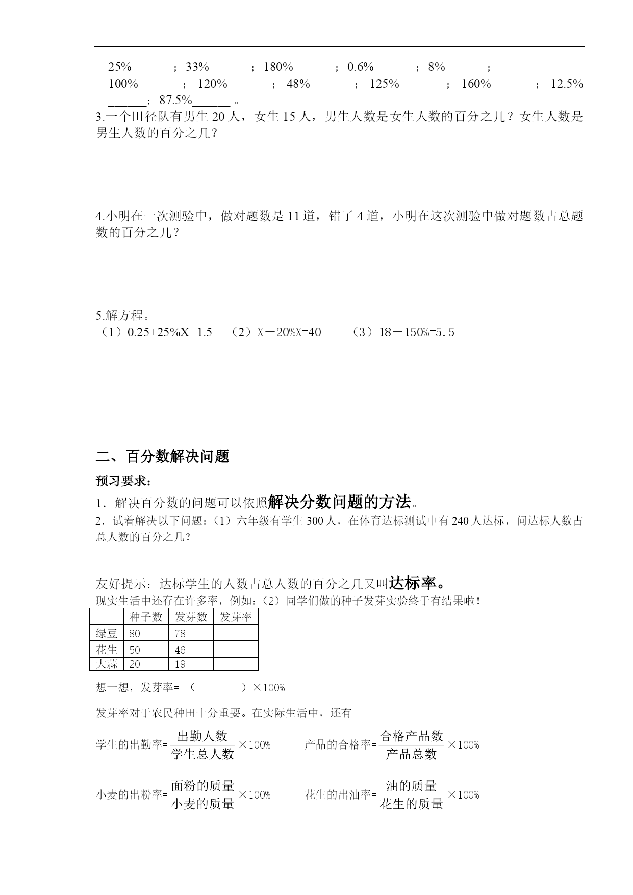 百分数复习讲义一、复习--百分数-意义和互化知识梳理:1.百分数的意义:表示__________________________。百分数也叫______或_____2.百分数的写法:写百分数时,通常不写成分数形式,而是在原来的分子后面加上百分号来表示。3.百分数与小数的互化:(1)把小数化成百分数,只要把小数点向____移动_____,同时在后面加上____.(2)百分数化成小数,只要把______去掉,同时把小数点向____移动______.4.百分数和分数的互化:(1)把分数化成百分数,通常先把分数化成小数(除不尽时,通常保留___________小数),再把小数化成百分数。(2)把百分数化成分数,先把百分数改写成分母是________的分数,能约分的要化成____________.练习:一、百分数的意义。1.六年级有95%的学生订《中学生数学报》,表示________人数占________人数的95%。2.六一班男生人数占全班人数的50%,表示________人数与________人数相比,以________人数为单位“1”。3.某种产品降价20%,现在的价钱是原价的________%。4.今年小麦产量比去年增产25%,今年产量相当于去年产量的________%。5.读出下面的百分数。120%读作___________;4.02%读作___________,0.45%读作____________。134.6%读作___________;40%读作___________,300%读作___________。6.100千克大豆可以榨油17千克,油占大豆重量的_________%。7.把一吨煤平均分成100份,其中的29份是________吨,它相当于原计划的________%,比原计划多生产_________%。8.水泥厂原计划5月份生产水泥100吨,实际生产了120吨,相当于原计划的_________%,比原计划多生产_________%。二、百分数和分数、小数的互化。1.百分数和小数的互化。(1)把小数化成百分数。0.37______;1.893______;5______;0.564______;0.005______;2.1______;0.1______;430______。(2)把百分数化成小数。27%______;0.3%______;152%______;1.3%______。2.百分数和分数的互化。(1)把分数化成百分数。=______;=______;=______;=______;=______;=______;______;______;=______;______。(2)把百分数化成分数。25%______;33%______;180%______;0.6%______;8%______;100%______;120%______;48%______;125%______;160%______;12.5%______;87.5%______。3.一个田径队有男生20人,女生15人,男生人数是女生人数的百分之几?女生人数是男生人数的百分之几?4.小明在一次测验中,做对题数是11道,错了4道,小明在这次测验中做对题数占总题数的百分之几?5.解方程。(1)0.25+25%X=1.5(2)X-20%X=40(3)18-150%=5.5二、百分数解决问题预习要求:1.解决百分数的问题可以依照解决分数问题的方法。2.试着解决以下问题:(1)六年级有学生300人,在体育达标测试中有240人达标,问达标人数占总人数的百分之几?友好提示:达标学生的人数占总人数的百分之几又叫达标率。现实生活中还存在许多率,例如:(2)同学们做的种子发芽实验终于有结果啦!种子数发芽数发芽率绿豆8078花生5046大蒜2019想一想,发芽率=()×100%发芽率对于农民种田十分重要。在实际生活中,还有学生的出勤率=×100%产品的合格率=×100%小麦的出粉率=×100%花生的出油率=×100%学生的及格率=×100%投球的命中率=×100%成活率=×100%难点提示:有些百分率最大值是100%,不能超过100%解题技巧:百分率的三个量中,给出任何两个量,都可以求出第三个量。1、讨论判断:(1)六年级一班和二班共有101人,今天出勤100人,这一天的出勤率是100%()(2)把10克盐放在100克水中,盐占盐水的10%()(3)前进小学在花坛中种植了110棵万年红,全部成活,成活率是110%.()(4)含盐率0.3%,表示盐占水的0.3%()2、岭城小学某一天1421名同学到校