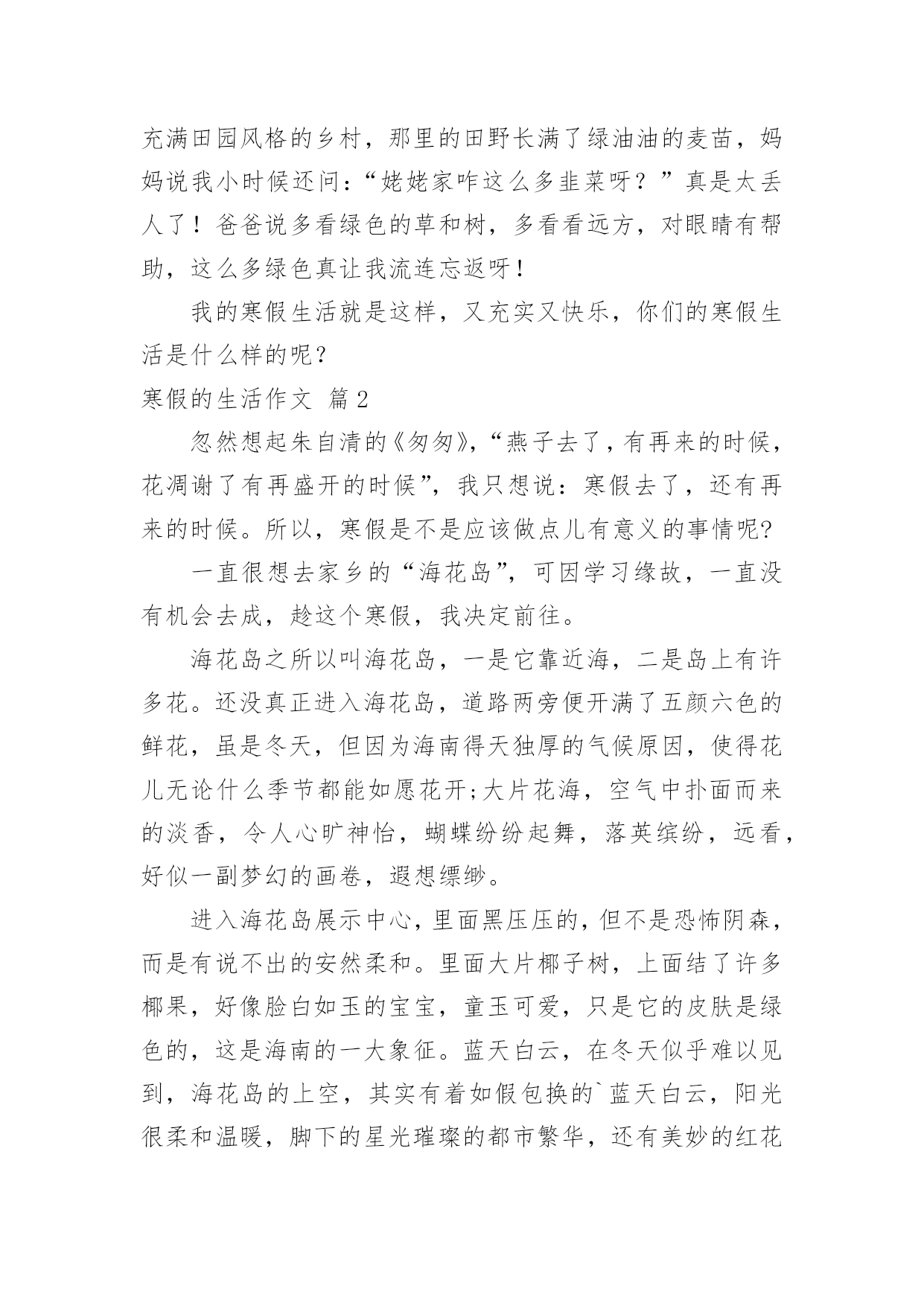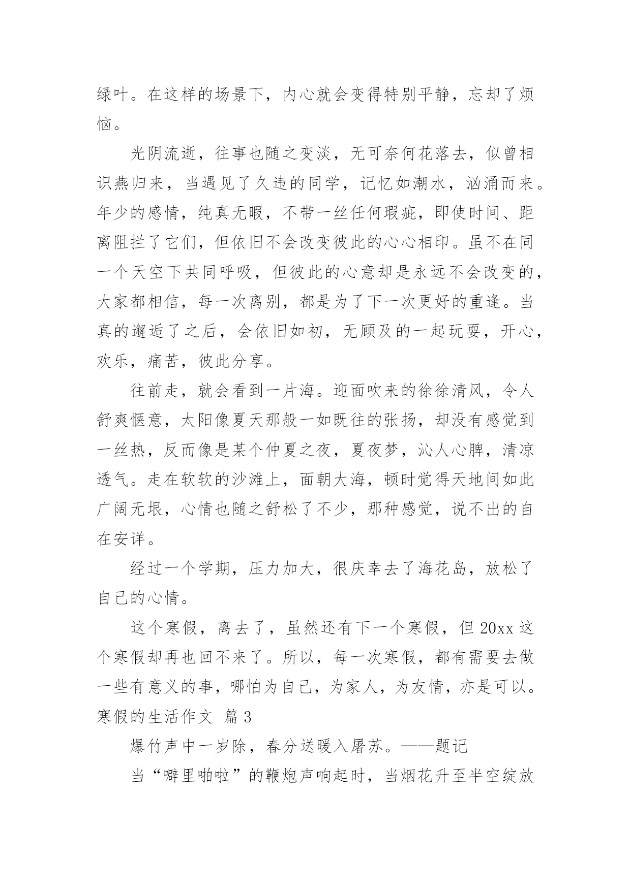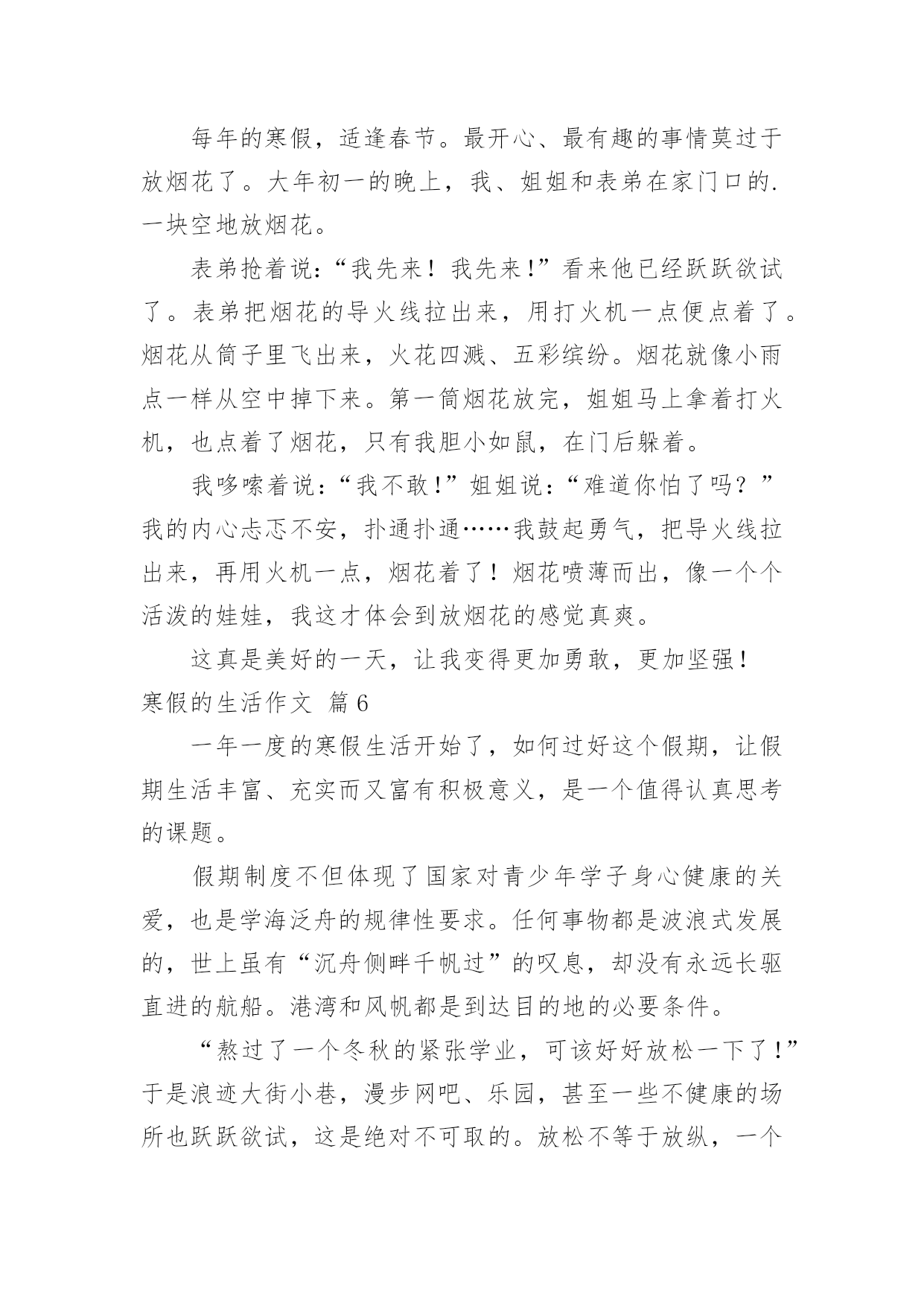 寒假的生活作文(通用)寒假的生活作文6篇在平日的学习、工作和生活里,许多人都有过写作文的经历,对作文都不陌生吧,作文根据体裁的不同可以分为记叙文、说明文、应用文、议论文。你写作文时总是无从下笔?下面是小编收集整理的寒假的生活作文6篇,希望能够帮助到大家。寒假的生活作文篇1整个寒假我过得十分充实,从学习到游玩,都听我给你一一道来。先来说说我的学习情况。我的期末考试成绩不理想,这说明上学期知识掌握的不太好,我希望通过寒假作业,把所学知识再充实一下,做到查漏补缺。我认真的完成寒假作业后,便开始预习下学期的课本:先把语文课本里应该读的都读了一遍,再把数学课本里的第一章习题仔仔仔细细的看了好几遍,英语单词也试着读了读,不懂的地方,我还做了批注,说实话,我做的批注好几处呢!再来说说我的兴趣培养方面。整个寒假,我还在美术班上了十天的素描课呢,画画不但充实了我的寒假生活,还提高了我的观察能力和动手能力。最后说说我回老家的`乡村生活。在家不能总玩手机,玩电脑,那样会让我们的身体变得虚弱,要多做一些对身体有益的活动,比方说多去外边转转,拥抱大自然。姥姥家是充满田园风格的乡村,那里的田野长满了绿油油的麦苗,妈妈说我小时候还问:“姥姥家咋这么多韭菜呀?”真是太丢人了!爸爸说多看绿色的草和树,多看看远方,对眼睛有帮助,这么多绿色真让我流连忘返呀!我的寒假生活就是这样,又充实又快乐,你们的寒假生活是什么样的呢?寒假的生活作文篇2忽然想起朱自清的《匆匆》,“燕子去了,有再来的时候,花凋谢了有再盛开的时候”,我只想说:寒假去了,还有再来的时候。所以,寒假是不是应该做点儿有意义的事情呢?一直很想去家乡的“海花岛”,可因学习缘故,一直没有机会去成,趁这个寒假,我决定前往。海花岛之所以叫海花岛,一是它靠近海,二是岛上有许多花。还没真正进入海花岛,道路两旁便开满了五颜六色的鲜花,虽是冬天,但因为海南得天独厚的气候原因,使得花儿无论什么季节都能如愿花开;大片花海,空气中扑面而来的淡香,令人心旷神怡,蝴蝶纷纷起舞,落英缤纷,远看,好似一副梦幻的画卷,遐想缥缈。进入海花岛展示中心,里面黑压压的,但不是恐怖阴森,而是有说不出的安然柔和。里面大片椰子树,上面结了许多椰果,好像脸白如玉的宝宝,童玉可爱,只是它的皮肤是绿色的,这是海南的一大象征。蓝天白云,在冬天似乎难以见到,海花岛的上空,其实有着如假包换的`蓝天白云,阳光很柔和温暖,脚下的星光璀璨的都市繁华,还有美妙的红花绿叶。在这样的场景下,内心就会变得特别平静,忘却了烦恼。光阴流逝,往事也随之变淡,无可奈何花落去,似曾相识燕归来,当遇见了久违的同学,记忆如潮水,汹涌而来。年少的感情,纯真无暇,不带一丝任何瑕疵,即使时间、距离阻拦了它们,但依旧不会改变彼此的心心相印。虽不在同一个天空下共同呼吸,但彼此的心意却是永远不会改变的,大家都相信,每一次离别,都是为了下一次更好的重逢。当真的邂逅了之后,会依旧如初,无顾及的一起玩耍,开心,欢乐,痛苦,彼此分享。往前走,就会看到一片海。迎面吹来的徐徐清风,令人舒爽惬意,太阳像夏天那般一如既往的张扬,却没有感觉到一丝热,反而像是某个仲夏之夜,夏夜梦,沁人心脾,清凉透气。走在软软的沙滩上,面朝大海,顿时觉得天地间如此广阔无垠,心情也随之舒松了不少,那种感觉,说不出的自在安详。经过一个学期,压力加大,很庆幸去了海花岛,放松了自己的心情。这个寒假,离去了,虽然还有下一个寒假,但20xx这个寒假却再也回不来了。所以,每一次寒假,都有需要去做一些有意义的事,哪怕为自己,为家人,为友情,亦是可以。寒假的生活作文篇3爆竹声中一岁除,春分送暖入屠苏。——题记当“噼里啪啦”的鞭炮声响起时,当烟花升至半空绽放出璀璨的光芒是,当12点的钟声被敲响时,我们又迎来了新的一年。大年初一的早晨,天微微亮时,各家就响起了鞭炮声,吵醒了正在做美梦的我。我睁开眼睛,愣了几秒后,才想起来今天是过年的第一天呢,我用最快的速度整理好自己后,看到妈妈在包饺子,于是我也心血来潮,想要试试看。包饺子,先把面皮拿好,接着放入适量的馅。然后将饺子的边缘部分捏好,不能让里面的馅露出来。可是等我包好一个后才发现,我包的饺子和妈妈包的饺子形成鲜明的对比。不过还好,妈妈告诉我第一次包饺子都是这样,多练习就能包漂亮了。、吃过饺子后,妈妈要去庙里拜一拜,我在家也闲着无聊,就跟着妈妈一起去了。到了之后才知道什么是人山人海了,人太多让我和妈妈差点走散。当我们走到最高处时,体会了“会当凌绝顶,一览众山小”的气魄。随后,我们在庙里的各个佛像前都拜了拜,一路上说着笑着,不知不觉间,天已经黑了,回到家后,累极了的我沾床便睡着了,就这样度过了新年的第一天。现在,寒假已经结束了,欢乐的新年也已经过完了,新的'学期即将开始,不能再沉迷于那些生活了。初三的我们即将面临更