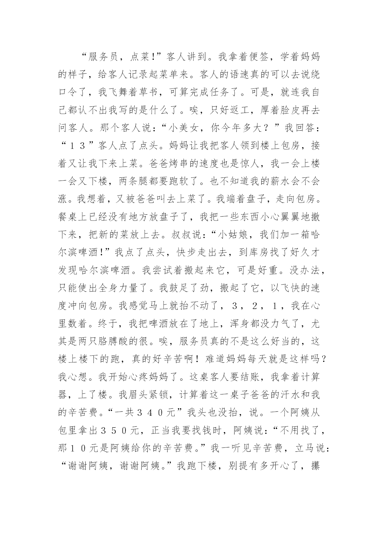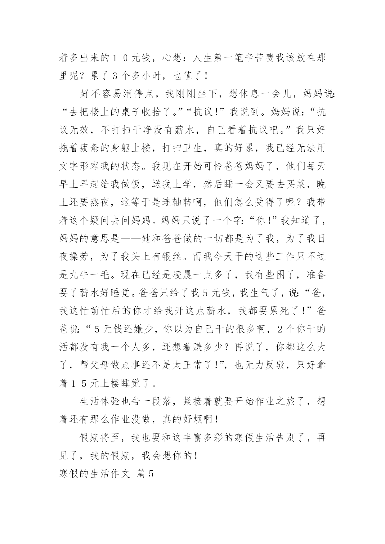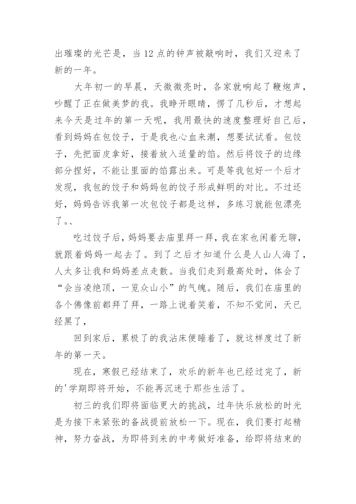 寒假的生活作文(通用)寒假的生活作文6篇在平日的学习、工作和生活里,许多人都有过写作文的经历,对作文都不陌生吧,作文根据体裁的不同可以分为记叙文、说明文、应用文、议论文。你写作文时总是无从下笔?下面是小编收集整理的寒假的生活作文6篇,希望能够帮助到大家。寒假的生活作文篇1整个寒假我过得十分充实,从学习到游玩,都听我给你一一道来。先来说说我的学习情况。我的期末考试成绩不理想,这说明上学期知识掌握的不太好,我希望通过寒假作业,把所学知识再充实一下,做到查漏补缺。我认真的完成寒假作业后,便开始预习下学期的课本:先把语文课本里应该读的都读了一遍,再把数学课本里的第一章习题仔仔仔细细的看了好几遍,英语单词也试着读了读,不懂的地方,我还做了批注,说实话,我做的批注好几处呢!再来说说我的兴趣培养方面。整个寒假,我还在美术班上了十天的素描课呢,画画不但充实了我的寒假生活,还提高了我的观察能力和动手能力。最后说说我回老家的`乡村生活。在家不能总玩手机,玩电脑,那样会让我们的身体变得虚弱,要多做一些对身体有益的活动,比方说多去外边转转,拥抱大自然。姥姥家是充满田园风格的乡村,那里的田野长满了绿油油的麦苗,妈妈说我小时候还问:“姥姥家咋这么多韭菜呀?”真是太丢人了!爸爸说多看绿色的草和树,多看看远方,对眼睛有帮助,这么多绿色真让我流连忘返呀!我的寒假生活就是这样,又充实又快乐,你们的寒假生活是什么样的呢?寒假的生活作文篇2忽然想起朱自清的《匆匆》,“燕子去了,有再来的时候,花凋谢了有再盛开的时候”,我只想说:寒假去了,还有再来的时候。所以,寒假是不是应该做点儿有意义的事情呢?一直很想去家乡的“海花岛”,可因学习缘故,一直没有机会去成,趁这个寒假,我决定前往。海花岛之所以叫海花岛,一是它靠近海,二是岛上有许多花。还没真正进入海花岛,道路两旁便开满了五颜六色的鲜花,虽是冬天,但因为海南得天独厚的气候原因,使得花儿无论什么季节都能如愿花开;大片花海,空气中扑面而来的淡香,令人心旷神怡,蝴蝶纷纷起舞,落英缤纷,远看,好似一副梦幻的画卷,遐想缥缈。进入海花岛展示中心,里面黑压压的,但不是恐怖阴森,而是有说不出的安然柔和。里面大片椰子树,上面结了许多椰果,好像脸白如玉的宝宝,童玉可爱,只是它的皮肤是绿色的,这是海南的一大象征。蓝天白云,在冬天似乎难以见到,海花岛的上空,其实有着如假包换的`蓝天白云,阳光很柔和温暖,脚下的星光璀璨的都市繁华,还有美妙的红花绿叶。在这样的场景下,内心就会变得特别平静,忘却了烦恼。光阴流逝,往事也随之变淡,无可奈何花落去,似曾相识燕归来,当遇见了久违的同学,记忆如潮水,汹涌而来。年少的感情,纯真无暇,不带一丝任何瑕疵,即使时间、距离阻拦了它们,但依旧不会改变彼此的心心相印。虽不在同一个天空下共同呼吸,但彼此的心意却是永远不会改变的,大家都相信,每一次离别,都是为了下一次更好的重逢。当真的邂逅了之后,会依旧如初,无顾及的一起玩耍,开心,欢乐,痛苦,彼此分享。往前走,就会看到一片海。迎面吹来的徐徐清风,令人舒爽惬意,太阳像夏天那般一如既往的张扬,却没有感觉到一丝热,反而像是某个仲夏之夜,夏夜梦,沁人心脾,清凉透气。走在软软的沙滩上,面朝大海,顿时觉得天地间如此广阔无垠,心情也随之舒松了不少,那种感觉,说不出的自在安详。经过一个学期,压力加大,很庆幸去了海花岛,放松了自己的心情。这个寒假,离去了,虽然还有下一个寒假,但20xx这个寒假却再也回不来了。所以,每一次寒假,都有需要去做一些有意义的事,哪怕为自己,为家人,为友情,亦是可以。寒假的生活作文篇3爆竹声中一岁除,春分送暖入屠苏。——题记当“噼里啪啦”的鞭炮声响起时,当烟花升至半空绽放出璀璨的光芒是,当12点的钟声被敲响时,我们又迎来了新的一年。大年初一的早晨,天微微亮时,各家就响起了鞭炮声,吵醒了正在做美梦的我。我睁开眼睛,愣了几秒后,才想起来今天是过年的第一天呢,我用最快的速度整理好自己后,看到妈妈在包饺子,于是我也心血来潮,想要试试看。包饺子,先把面皮拿好,接着放入适量的馅。然后将饺子的边缘部分捏好,不能让里面的馅露出来。可是等我包好一个后才发现,我包的饺子和妈妈包的饺子形成鲜明的对比。不过还好,妈妈告诉我第一次包饺子都是这样,多练习就能包漂亮了。、吃过饺子后,妈妈要去庙里拜一拜,我在家也闲着无聊,就跟着妈妈一起去了。到了之后才知道什么是人山人海了,人太多让我和妈妈差点走散。当我们走到最高处时,体会了“会当凌绝顶,一览众山小”的气魄。随后,我们在庙里的各个佛像前都拜了拜,一路上说着笑着,不知不觉间,天已经黑了,回到家后,累极了的我沾床便睡着了,就这样度过了新年的第一天。现在,寒假已经结束了,欢乐的新年也已经过完了,新的'学期即将开始,不能再沉迷于那些生活了。初三的我们即将面临更