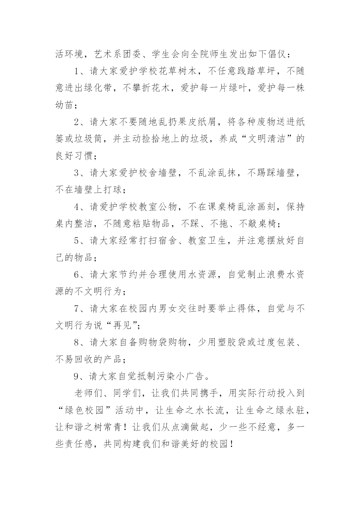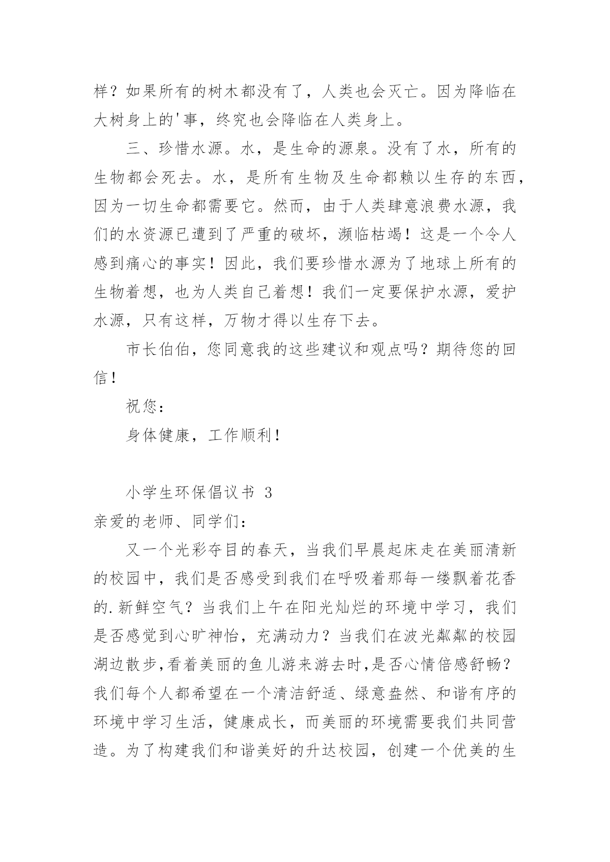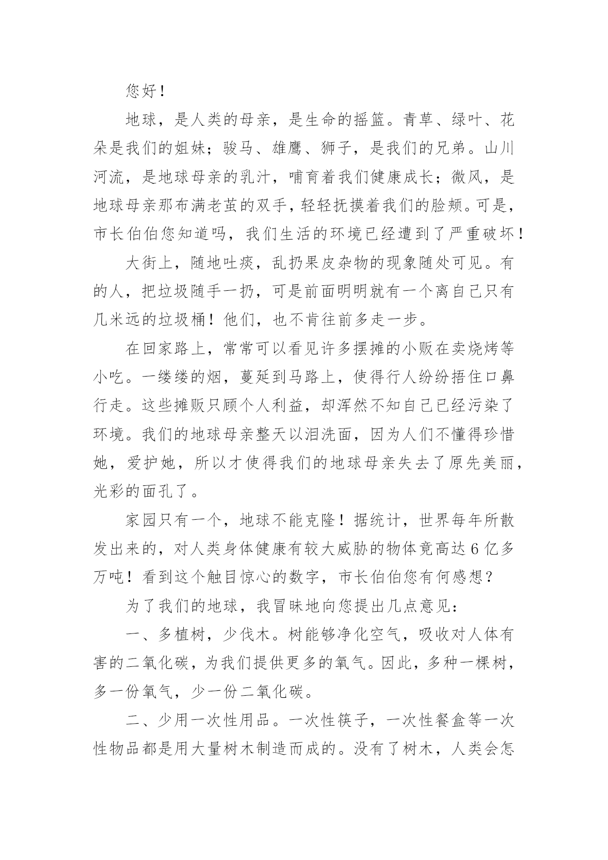 小学生环保倡议书关于小学生环保倡议书范文在发展不断提速的社会中,在很多情况下我们需要用到倡议书,倡议书是日常应用写作中的一种常用文体。大家知道倡议书的格式吗?以下是小编整理的关于小学生环保倡议书范文,仅供参考,欢迎大家阅读。小学生环保倡议书1亲爱的同学们:你们好!抬头望,朵朵白云依旧点缀着我们头顶的这片蓝天,可是,我亲爱的朋友,当你独自一人踏在这校园里的绿茵地时;当阵阵花香迎面扑鼻而来时;当那片片黄叶随风飘落时;当洁白的雪花扬洒在你的`肩上时,你是否有些许的欣慰,抑或是淡淡的感伤,在每一天上帝赐予你的864秒中,你是否曾舍得用其中的一秒来留意、思索一下你身边所有的一切?来到工大,曾经的梦成为了现实,但同时还有更多的梦需要我们去实现。拥有美好的校园环境,是我们的共同心愿。用心去关注环境的变化,用热情去传播环保的观念,用行动肩负起环保的重任,也是每一个工大学子的使命。党的章程提出,必须把建设资源节约型、环境友好型社会放在工业化、现代化发展战略的突出位置,落实到每个单位、每个家庭。在此,我们向全校同学发出以下倡议:倡导文明行为,不随地吐痰,不乱扔脏物,不践踏草坪;节约用电,随手关灯、关掉长时间待机的电脑;节约资源,复印纸张双面使用,能用一张不用两张;请随手关紧水龙头,提倡一水多用;使用可再生材料制成的工作生活用品;出行尽量乘坐公共交通工具或步行;使用无磷洗涤剂,减少污染;废旧电池请勿乱扔,要放入指定的回收箱内;奉献社会,传递爱心,传播文明,构建和谐社会,促进社会进步。同学们,你们知道吗?全中国每人每天节约一张纸,那么一年就可少砍伐1581666棵树,如果工大每人每天节约一张纸,那么一年就可以节约625张纸,一年相当于少砍32棵大树。“不积小流,无以成江海;不积跬步,无以至千里”,从点点滴滴做起,将环保当作谱写生活乐章的一部分,你会不经意的发现,原来生活里这些跳动的音符又为你撑起了另一片蓝天,那里有鸟语花香,有绿树红叶……“时尚环保,携手共创”。大家一起行动起来吧!小学生环保倡议书2敬爱的市长伯伯:您好!地球,是人类的母亲,是生命的摇篮。青草、绿叶、花朵是我们的姐妹;骏马、雄鹰、狮子,是我们的兄弟。山川河流,是地球母亲的乳汁,哺育着我们健康成长;微风,是地球母亲那布满老茧的双手,轻轻抚摸着我们的脸颊。可是,市长伯伯您知道吗,我们生活的环境已经遭到了严重破坏!大街上,随地吐痰,乱扔果皮杂物的现象随处可见。有的人,把垃圾随手一扔,可是前面明明就有一个离自己只有几米远的垃圾桶!他们,也不肯往前多走一步。在回家路上,常常可以看见许多摆摊的小贩在卖烧烤等小吃。一缕缕的烟,蔓延到马路上,使得行人纷纷捂住口鼻行走。这些摊贩只顾个人利益,却浑然不知自己已经污染了环境。我们的地球母亲整天以泪洗面,因为人们不懂得珍惜她,爱护她,所以才使得我们的地球母亲失去了原先美丽,光彩的面孔了。家园只有一个,地球不能克隆!据统计,世界每年所散发出来的,对人类身体健康有较大威胁的物体竟高达6亿多万吨!看到这个触目惊心的数字,市长伯伯您有何感想?为了我们的地球,我冒昧地向您提出几点意见:一、多植树,少伐木。树能够净化空气,吸收对人体有害的二氧化碳,为我们提供更多的氧气。因此,多种一棵树,多一份氧气,少一份二氧化碳。二、少用一次性用品。一次性筷子,一次性餐盒等一次性物品都是用大量树木制造而成的。没有了树木,人类会怎样?如果所有的树木都没有了,人类也会灭亡。因为降临在大树身上的'事,终究也会降临在人类身上。三、珍惜水源。水,是生命的源泉。没有了水,所有的生物都会死去。水,是所有生物及生命都赖以生存的东西,因为一切生命都需要它。然而,由于人类肆意浪费水源,我们的水资源已遭到了严重的破坏,濒临枯竭!这是一个令人感到痛心的事实!因此,我们要珍惜水源为了地球上所有的生物着想,也为人类自己着想!我们一定要保护水源,爱护水源,只有这样,万物才得以生存下去。市长伯伯,您同意我的这些建议和观点吗?期待您的回信!祝您:身体健康,工作顺利!小学生环保倡议书3亲爱的老师、同学们:又一个光彩夺目的春天,当我们早晨起床走在美丽清新的校园中,我们是否感受到我们在呼吸着那每一缕飘着花香的.新鲜空气?当我们上午在阳光灿烂的环境中学习,我们是否感觉到心旷神怡,充满动力?当我们在波光粼粼的校园湖边散步,看着美丽的鱼儿游来游去时,是否心情倍感舒畅?我们每个人都希望在一个清洁舒适、绿意盎然、和谐有序的环境中学习生活,健康成长,而美丽的环境需要我们共同营造。为了构建我们和谐美好的升达校园,创建一个优美的生活环境,艺术系团委、学生会向全院师生发出如下倡仪:1、请大家爱护学校花草树木,不任意践踏草坪,不随意进出绿化带,不攀折花木,爱护每一片绿叶,爱护每一株幼苗;2、请大家不要随地乱扔果皮纸屑,将各种废物送进纸篓或垃圾