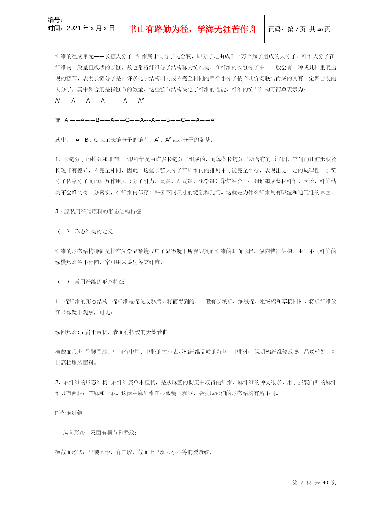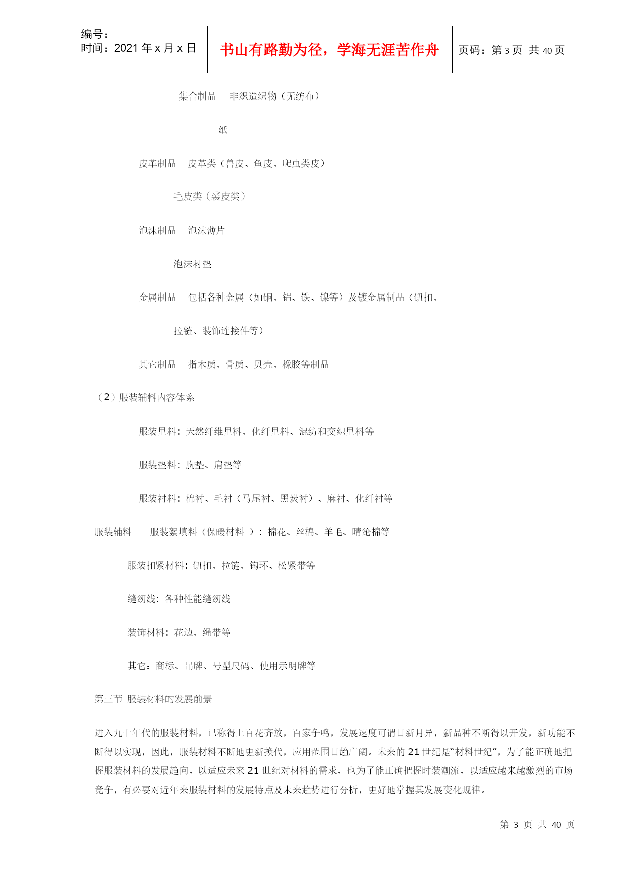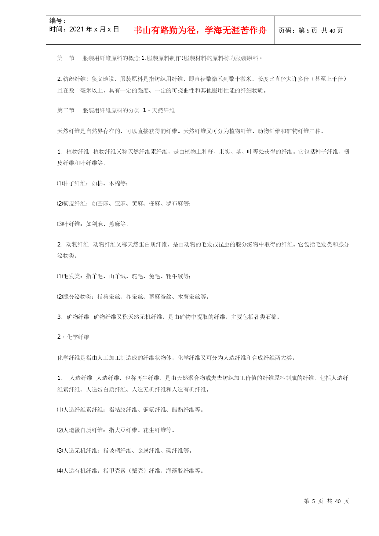 编号:时间:2021年x月x日书山有路勤为径,学海无涯苦作舟页码:第PAGE40页共NUMPAGES40页第PAGE\*MERGEFORMAT40页共NUMPAGES\*MERGEFORMAT40页服装材料教程1服装材料学及其重要意义2服装材料的历史与现状3服装材料的发展前景绪论1、基本要求:了解服装材料的重要性,掌握服装材料的基本概念、内容及历史、现状、未来的发展变化过程、趋势与特点。2、重点:介绍服装材料的概念、历史沿革、发展现状及变化趋势特点。3、难点:要求掌握和记牢服装材料的内容体系。第一节服装材料学及其重要意1.1意义随着服装工业发展和技术的进步,我国已成为世界服装生产大国,我们的服装品牌已逐渐为世人所熟知。但是,与欧美发达国家相比,我们的服装还存在较大差距。分析原因,不难发现,高科技附加值产品已成为当今世界服装工业发展的趋势,服装产品的竞争,归根到底是材料的竞争。因此,掌握最基本的服装材料知识,将成为服装专业人士抓住契机,把握时尚,领导潮流的根本要素所在。作为服装专业的本科生,更应具备服装材料的系统知识,这是服装教育发展的需要,更是推动服装学科向前发展的需要。因此,服装材料学是服装专业教育的重要主干专业基础课程。1.2“服装材料学”定义“服装材料学”是研究服装面料、辅料及其有关的纺织纤维、纱线、织物的结构、性能,结构与性能的关系,以及服装衣料的分类、鉴别和保养等知识、规律和技能的一门科学。第二节服装材料的历史与现状2.1.服装材料发展历史众所周知,构成服装有三要素:服装色彩、款式造型和服装材料。在三要素中又以服装材料为基础,因此,服装材料的发展,引导着服装潮流的变迁,也创造了服饰文化的历史。纵观服装材料的发展、演变过程,可谓人类文明发展史的记录仪,科学技术进步的量度计。自有人类以来,兽皮和树叶便成为御寒遮体之物,这就是最早的服装材料。随着人们对大自然的探索,对生存环境的逐步了解,渐渐从自然界中提取更多的材料用于制衣御寒,即现在所称的天然纤维原料——棉、毛、丝、麻等。用麻织布大约开始于公元前5000年的埃及,棉花的使用则开始于公元前3000年的印度,我国是著名的丝绸发源地,据《诗经》、《礼仪》等古书记载,早在商周时代就已有了绫、罗等丝织物。大约在2300年前“制丝”技术已日趋较成熟,不仅广泛应用和盛行于当时的中国,还远销东南亚和欧洲,创造了举世闻名的“丝绸之路”。与此同时,出现了织物染色,《吕氏春秋》中言“墨子见染素丝者而叹曰:染于苍则苍,染于黄则黄,所入者变其色亦变”。可见当时的染色工匠和染坊已有一定的水平。服装材料的发展,经历了非常缓慢的历史过程,直到19世纪中下叶产业革命才使服装及其材料得到了迅速发展。人们在继续使用自然界本身所具有的各种材料的同时,又创造了许多自然界所没有的服装材料,人造纤维长丝便是最早出现的人工制造材料,从此,各种新型的服装材料不断涌现,速度很快,开始和推动了化学纤维工业的发展。化学纤维发展从英国1905年正式投产第一家粘胶纤维厂起,到1925年已成功地生产了粘胶短纤维。而合成纤维的诞生则始于美国杜邦公司在1938年制造的尼龙纤维,到1950年,又一种腈纶纤维在美国宣布成功,三年后,涤纶纤维再告投放市场。仅短短的几十年间,化学纤维已从无到有,并进一步发展为与棉、毛等天然纤维在消费领域里平分秋色,从而改变了千百年来传统纺织服装原料的结构格局。2.2服装材料的现状目前,服装材料的发展已具有品种丰富,种类齐全,功能多样的特点,在面料和辅料两方面都已形成较为完整的体系。尤其辅料在近些年得到了较大的发展,不仅品种增多、翻新,而且专业厂家专门设备也如雨后春笋般遍地出现,成长起来。(1)服装材料内容体系机织物针织物纤维制品纺织制品布类花边网眼织物织带编织带线带类缝纫线织编线服装材料其它毛毡絮棉集合制品非织造织物(无纺布)纸皮革制品皮革类(兽皮、鱼皮、爬虫类皮)毛皮类(裘皮类)泡沫制品泡沫薄片泡沫衬垫金属制品包括各种金属(如铜、铝、铁、镍等)及镀金属制品(钮扣、拉链、装饰连接件等)其它制品指木质、骨质、贝壳、橡胶等制品(2)服装辅料内容体系服装里料:天然纤维里料、化纤里料、混纺和交织里料等服装垫料:胸垫、肩垫等服装衬料:棉衬、毛衬(马尾衬、黑炭衬)、麻衬、化纤衬等服装辅料服装絮填料(保暖材料):棉花、丝棉、羊毛、晴纶棉等服装扣紧材料:钮扣、拉链、钩环、松紧带等缝纫线:各种性能缝纫线装饰材料:花边、绳带等其它:商标、吊牌、号型尺码、使用示明牌等第三节服装材料的发展前景进入九十年代的服装材料,已称得上百花齐放,百家争鸣,发展速度可谓日新月异,新品种不断得以开发,新功能不断得以实现,