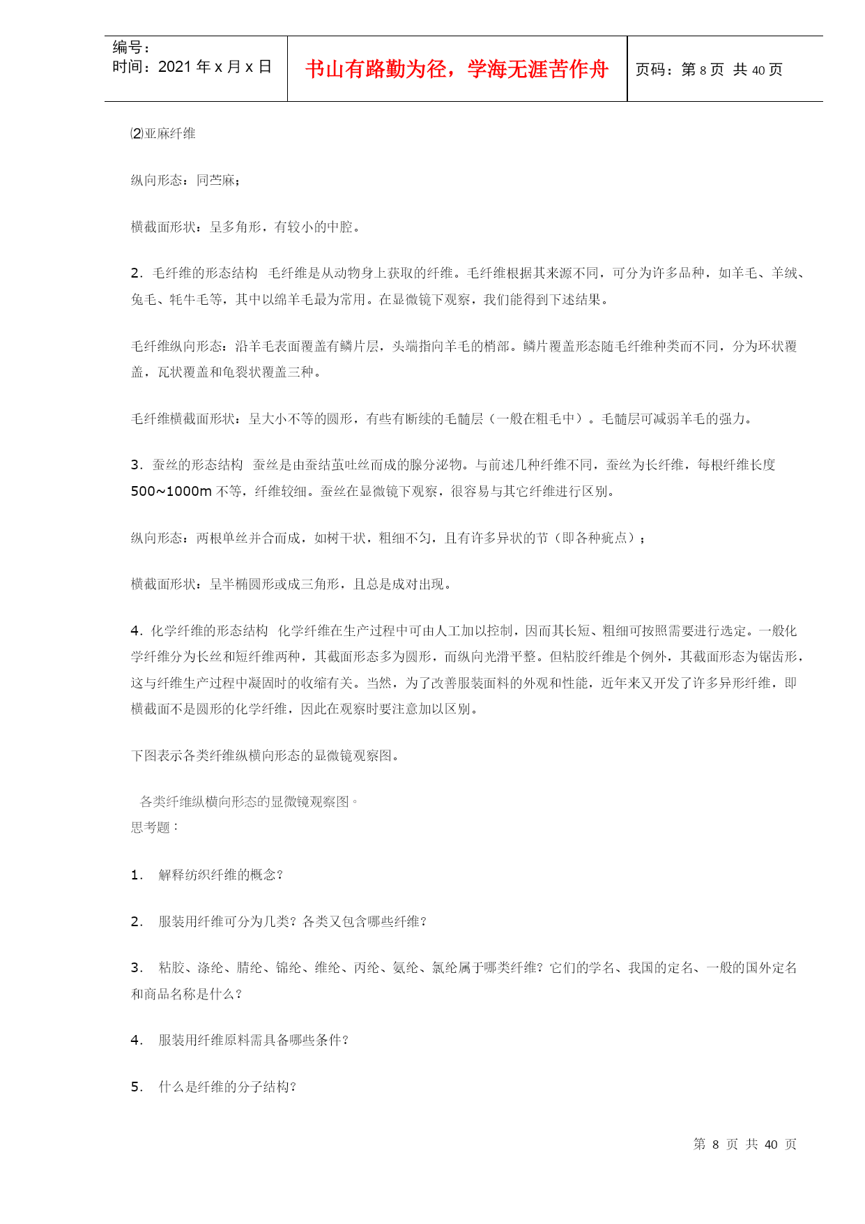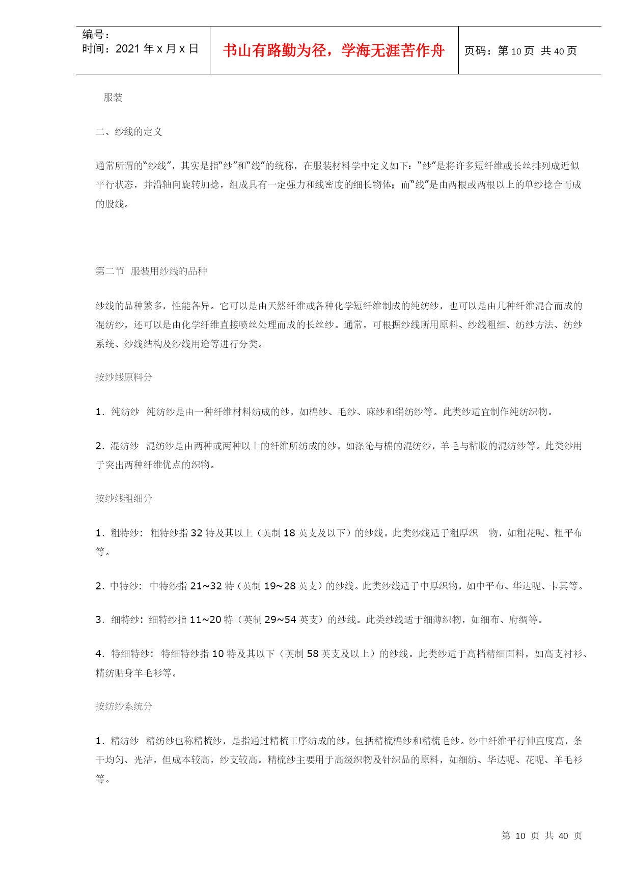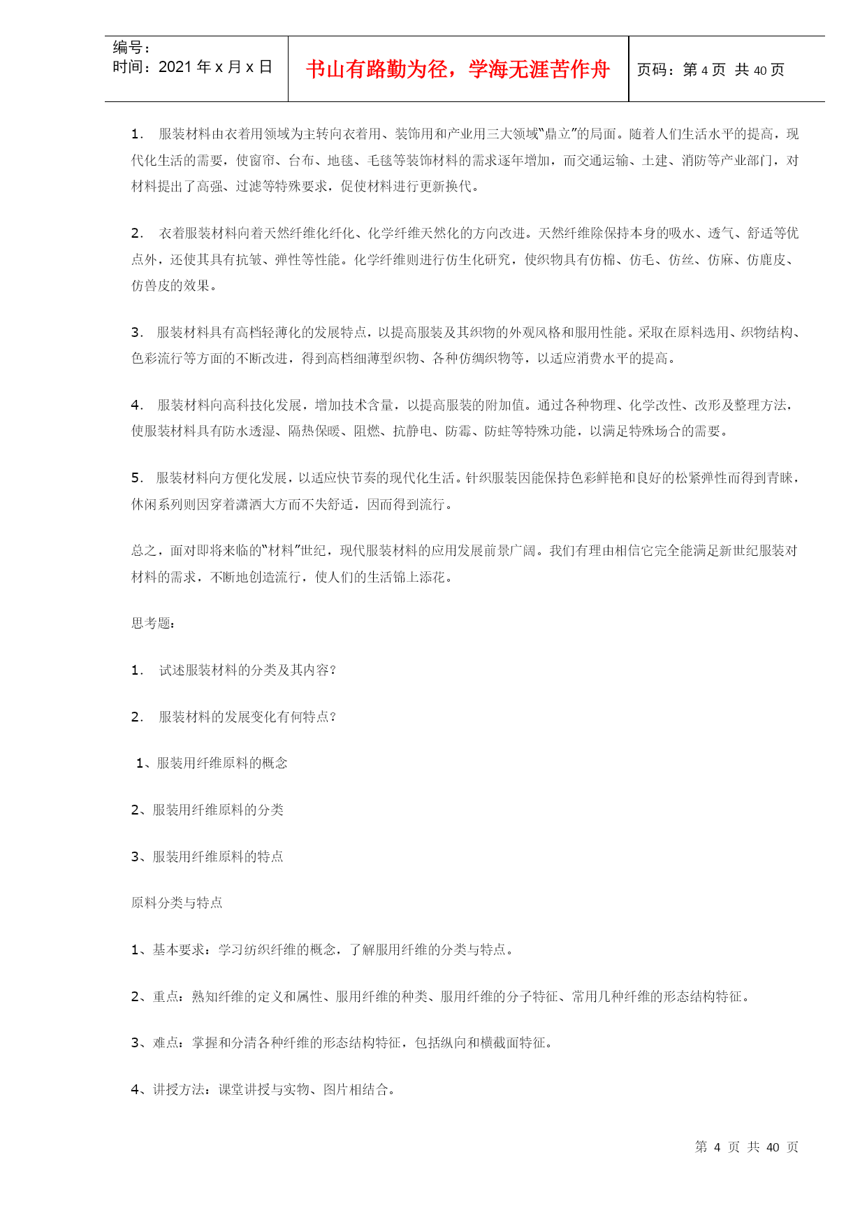 编号:时间:2021年x月x日书山有路勤为径,学海无涯苦作舟页码:第PAGE40页共NUMPAGES40页第PAGE\*MERGEFORMAT40页共NUMPAGES\*MERGEFORMAT40页服装材料教程1服装材料学及其重要意义2服装材料的历史与现状3服装材料的发展前景绪论1、基本要求:了解服装材料的重要性,掌握服装材料的基本概念、内容及历史、现状、未来的发展变化过程、趋势与特点。2、重点:介绍服装材料的概念、历史沿革、发展现状及变化趋势特点。3、难点:要求掌握和记牢服装材料的内容体系。第一节服装材料学及其重要意1.1意义随着服装工业发展和技术的进步,我国已成为世界服装生产大国,我们的服装品牌已逐渐为世人所熟知。但是,与欧美发达国家相比,我们的服装还存在较大差距。分析原因,不难发现,高科技附加值产品已成为当今世界服装工业发展的趋势,服装产品的竞争,归根到底是材料的竞争。因此,掌握最基本的服装材料知识,将成为服装专业人士抓住契机,把握时尚,领导潮流的根本要素所在。作为服装专业的本科生,更应具备服装材料的系统知识,这是服装教育发展的需要,更是推动服装学科向前发展的需要。因此,服装材料学是服装专业教育的重要主干专业基础课程。1.2“服装材料学”定义“服装材料学”是研究服装面料、辅料及其有关的纺织纤维、纱线、织物的结构、性能,结构与性能的关系,以及服装衣料的分类、鉴别和保养等知识、规律和技能的一门科学。第二节服装材料的历史与现状2.1.服装材料发展历史众所周知,构成服装有三要素:服装色彩、款式造型和服装材料。在三要素中又以服装材料为基础,因此,服装材料的发展,引导着服装潮流的变迁,也创造了服饰文化的历史。纵观服装材料的发展、演变过程,可谓人类文明发展史的记录仪,科学技术进步的量度计。自有人类以来,兽皮和树叶便成为御寒遮体之物,这就是最早的服装材料。随着人们对大自然的探索,对生存环境的逐步了解,渐渐从自然界中提取更多的材料用于制衣御寒,即现在所称的天然纤维原料——棉、毛、丝、麻等。用麻织布大约开始于公元前5000年的埃及,棉花的使用则开始于公元前3000年的印度,我国是著名的丝绸发源地,据《诗经》、《礼仪》等古书记载,早在商周时代就已有了绫、罗等丝织物。大约在2300年前“制丝”技术已日趋较成熟,不仅广泛应用和盛行于当时的中国,还远销东南亚和欧洲,创造了举世闻名的“丝绸之路”。与此同时,出现了织物染色,《吕氏春秋》中言“墨子见染素丝者而叹曰:染于苍则苍,染于黄则黄,所入者变其色亦变”。可见当时的染色工匠和染坊已有一定的水平。服装材料的发展,经历了非常缓慢的历史过程,直到19世纪中下叶产业革命才使服装及其材料得到了迅速发展。人们在继续使用自然界本身所具有的各种材料的同时,又创造了许多自然界所没有的服装材料,人造纤维长丝便是最早出现的人工制造材料,从此,各种新型的服装材料不断涌现,速度很快,开始和推动了化学纤维工业的发展。化学纤维发展从英国1905年正式投产第一家粘胶纤维厂起,到1925年已成功地生产了粘胶短纤维。而合成纤维的诞生则始于美国杜邦公司在1938年制造的尼龙纤维,到1950年,又一种腈纶纤维在美国宣布成功,三年后,涤纶纤维再告投放市场。仅短短的几十年间,化学纤维已从无到有,并进一步发展为与棉、毛等天然纤维在消费领域里平分秋色,从而改变了千百年来传统纺织服装原料的结构格局。2.2服装材料的现状目前,服装材料的发展已具有品种丰富,种类齐全,功能多样的特点,在面料和辅料两方面都已形成较为完整的体系。尤其辅料在近些年得到了较大的发展,不仅品种增多、翻新,而且专业厂家专门设备也如雨后春笋般遍地出现,成长起来。(1)服装材料内容体系机织物针织物纤维制品纺织制品布类花边网眼织物织带编织带线带类缝纫线织编线服装材料其它毛毡絮棉集合制品非织造织物(无纺布)纸皮革制品皮革类(兽皮、鱼皮、爬虫类皮)毛皮类(裘皮类)泡沫制品泡沫薄片泡沫衬垫金属制品包括各种金属(如铜、铝、铁、镍等)及镀金属制品(钮扣、拉链、装饰连接件等)其它制品指木质、骨质、贝壳、橡胶等制品(2)服装辅料内容体系服装里料:天然纤维里料、化纤里料、混纺和交织里料等服装垫料:胸垫、肩垫等服装衬料:棉衬、毛衬(马尾衬、黑炭衬)、麻衬、化纤衬等服装辅料服装絮填料(保暖材料):棉花、丝棉、羊毛、晴纶棉等服装扣紧材料:钮扣、拉链、钩环、松紧带等缝纫线:各种性能缝纫线装饰材料:花边、绳带等其它:商标、吊牌、号型尺码、使用示明牌等第三节服装材料的发展前景进入九十年代的服装材料,已称得上百花齐放,百家争鸣,发展速度可谓日新月异,新品种不断得以开发,新功能不断得以实现,