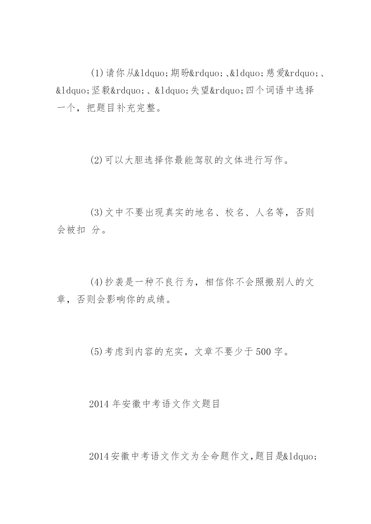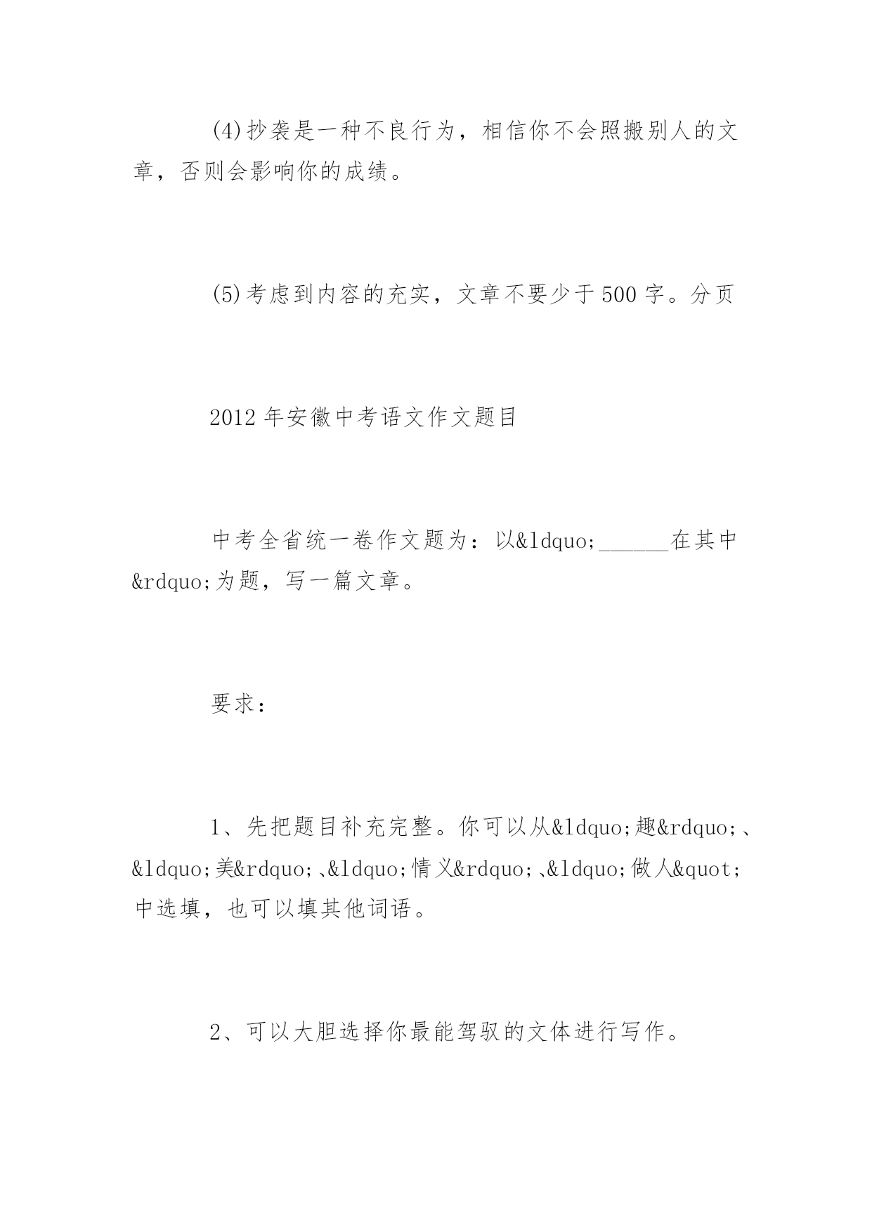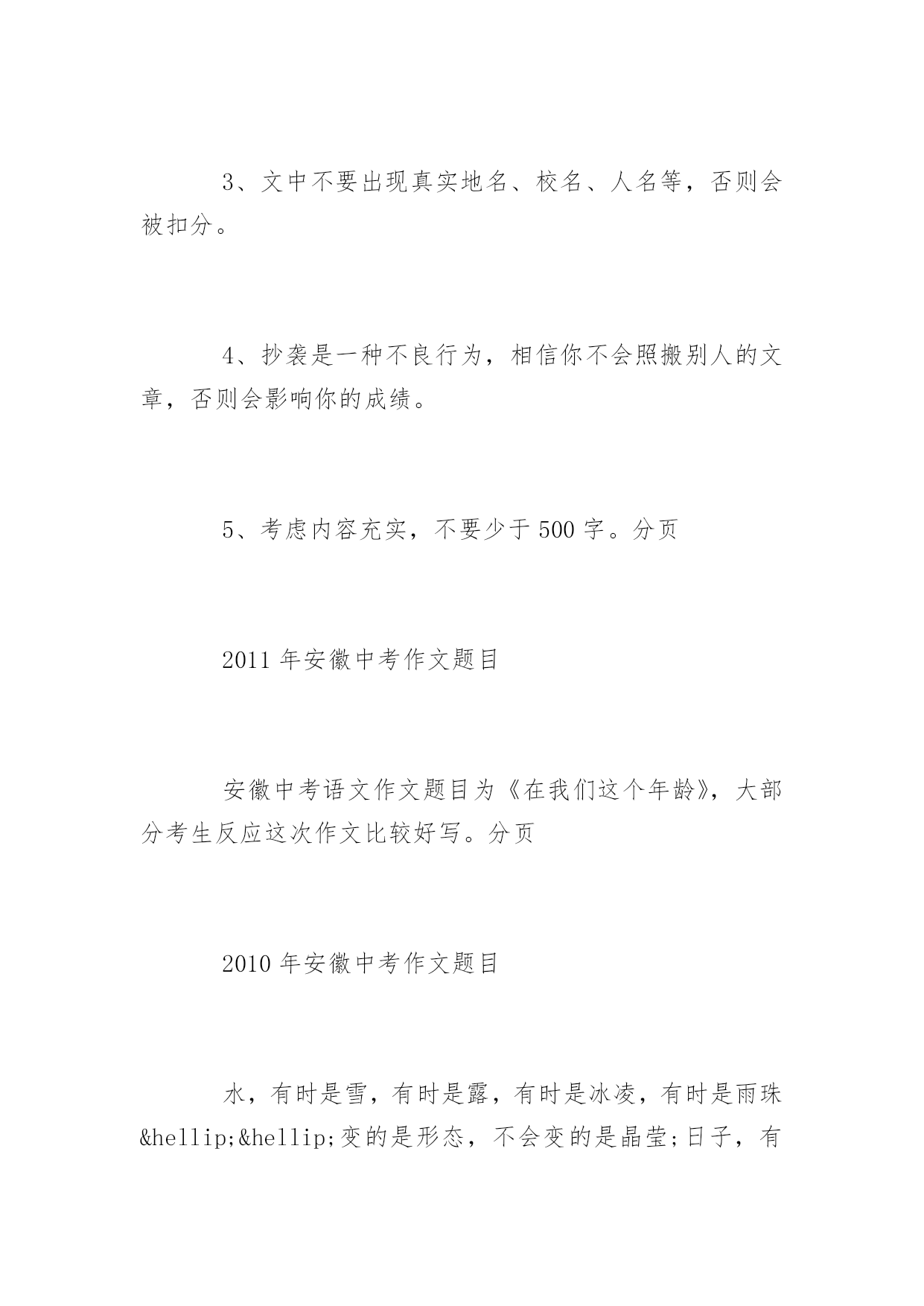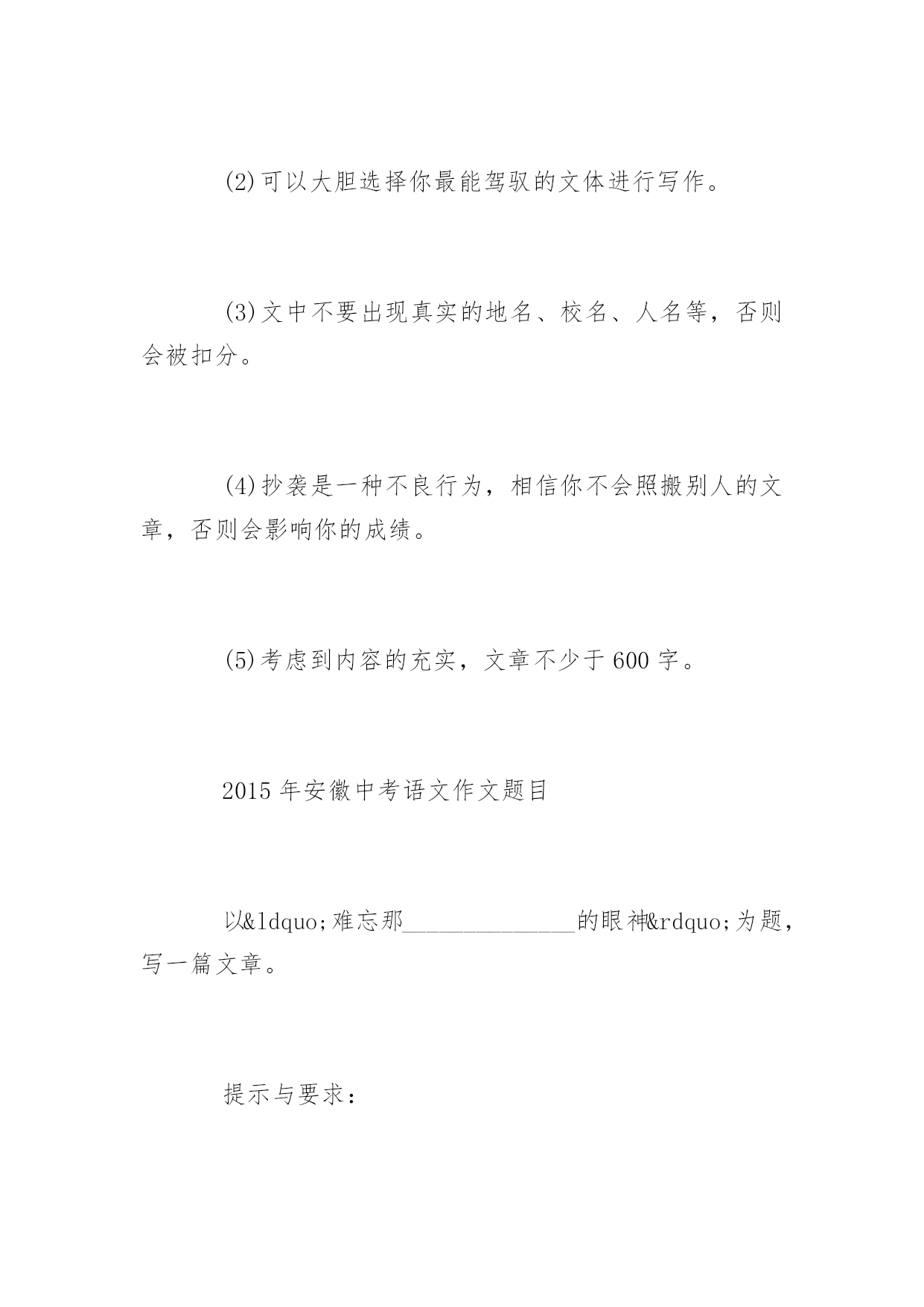 安徽中考作文题目2016年安徽中考作文题目汇总安徽省2016中考语文考试已经结束。今年安徽中考作文为你是我最____的人。百分网小编整理了安徽省历年中考作文题目,详情如下:2016年安徽中考作文题目:你是我最_______的人请以“你是我最_______的人”为题,写一篇文章。【提示语要求】(1)请你从“贴心”“感激”“牵挂”“欣赏”四个词语中选择一个,把题目补充完整。(2)可以大胆选择你最能驾驭的文体进行写作。(3)文中不要出现真实的地名、校名、人名等,否则会被扣分。(4)抄袭是一种不良行为,相信你不会照搬别人的文章,否则会影响你的成绩。(5)考虑到内容的充实,文章不少于600字。2015年安徽中考语文作文题目以“难忘那______________的眼神”为题,写一篇文章。提示与要求:(1)请你从“期盼”、“慈爱”、“坚毅”、“失望”四个词语中选择一个,把题目补充完整。(2)可以大胆选择你最能驾驭的文体进行写作。(3)文中不要出现真实的地名、校名、人名等,否则会被扣分。(4)抄袭是一种不良行为,相信你不会照搬别人的文章,否则会影响你的成绩。(5)考虑到内容的充实,文章不要少于500字。2014年安徽中考语文作文题目2014安徽中考语文作文为全命题作文,题目是“说说我自己”,不低于五百字。分页2013年安徽中考语文作文题目.以"那段的日子"为题,写一篇文章。[提示与要求](1)请你从"温暖""自由""孤单""烦心"四个词语中选择一个,把题目补充完整。(2)可以大胆选择你最能驾驭的文体进行写作。(3)文中不要出现真实的'地名、校名、人名等,否则会被扣分。(4)抄袭是一种不良行为,相信你不会照搬别人的文章,否则会影响你的成绩。(5)考虑到内容的充实,文章不要少于500字。分页2012年安徽中考语文作文题目中考全省统一卷作文题为:以“______在其中”为题,写一篇文章。要求:1、先把题目补充完整。你可以从“趣”、“美”、“情义”、“做人"中选填,也可以填其他词语。2、可以大胆选择你最能驾驭的文体进行写作。3、文中不要出现真实地名、校名、人名等,否则会被扣分。4、抄袭是一种不良行为,相信你不会照搬别人的文章,否则会影响你的成绩。5、考虑内容充实,不要少于500字。分页2011年安徽中考作文题目安徽中考语文作文题目为《在我们这个年龄》,大部分考生反应这次作文比较好写。分页2010年安徽中考作文题目水,有时是雪,有时是露,有时是冰凌,有时是雨珠……变的是形态,不会变的是晶莹;日子,有时是甜,有时是苦,有时是幸福,有时是酸楚……变的是感受,不会变的是真实。生活中许多变化着的人、事、物,都有不变的地方。请以“不会变的是……”为题目,写一篇文章。(55分)【提示与要求】(1)在横线处填写一个词或短语,犟题目补充完整,然后写作。(2)可以写你的经历、见闻,也可以写你的感悟、认识。(3)可以大胆选择你最能驾驭的文体进行写作。(4)文中不要出现真实的地名、校名、人名,否则会扣分。(5)抄袭是一种不良行为,相信你不会照搬别人的文章;否则会影响你的成绩。(6)考虑到内容的充实,文章最好不要少于500字。分页2009年安徽中考作文题目请以“师生之间”为题,写一篇文章。【提示与要求】(1)可以写你的经历、见闻,也可以写你的感悟、认识。(2)请大胆选择你最能驾驭的文体,用你喜欢的表达方式写作。(3)文中不要出现真实的地名、校名、人名等,否则会被扣分。(4)抄袭是一种不良行为,相信你不会照搬别人的文章;否则会影响你的成绩。(5)考虑到内容的充实,文章不要少于500字。分页2008年安徽中考作文题目请以"我在_______中得到了快乐"为题,写一篇文章。(55分)【提示与要求】(1)从"阅读""倾听""活动""实验""帮助别人&quo