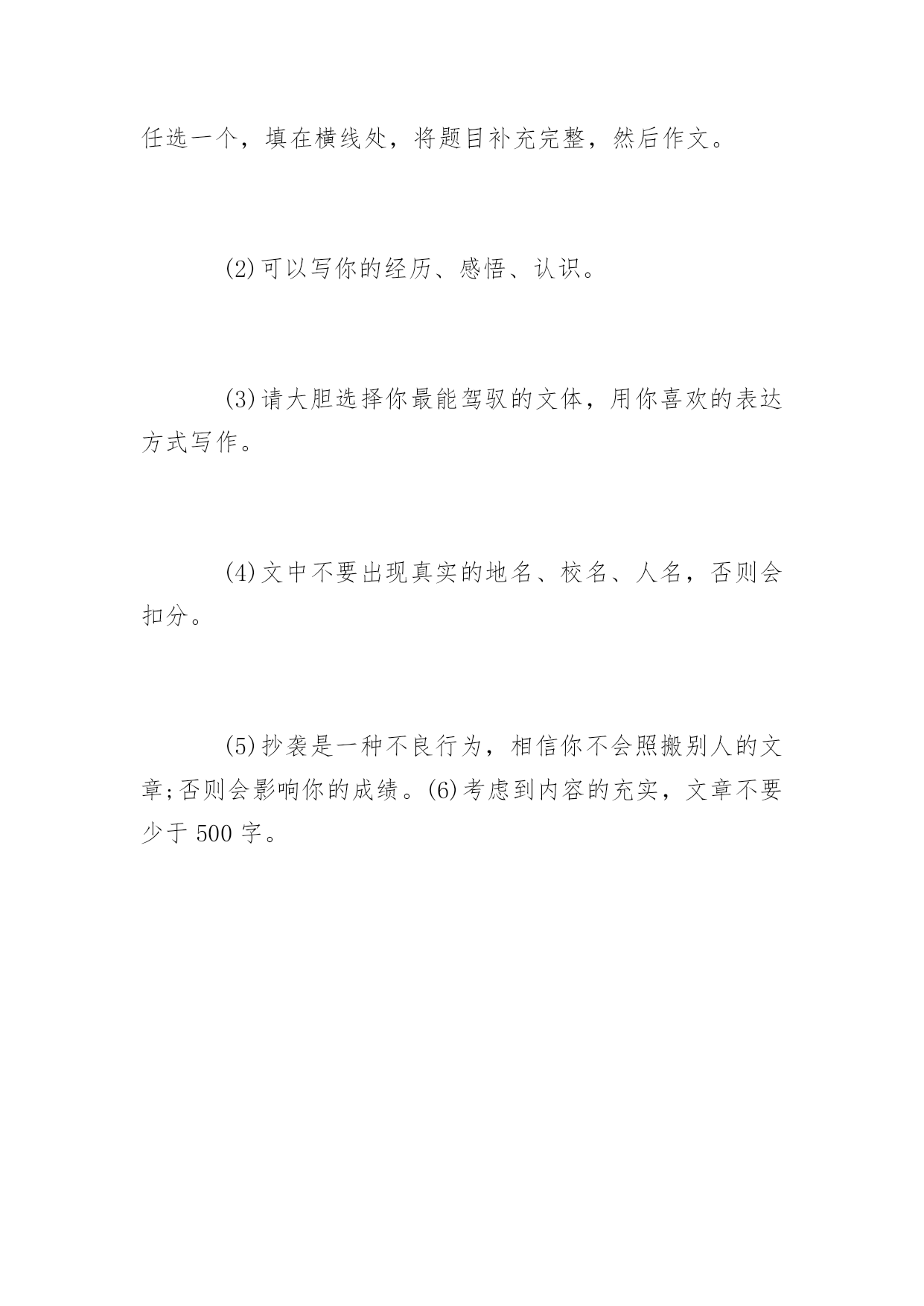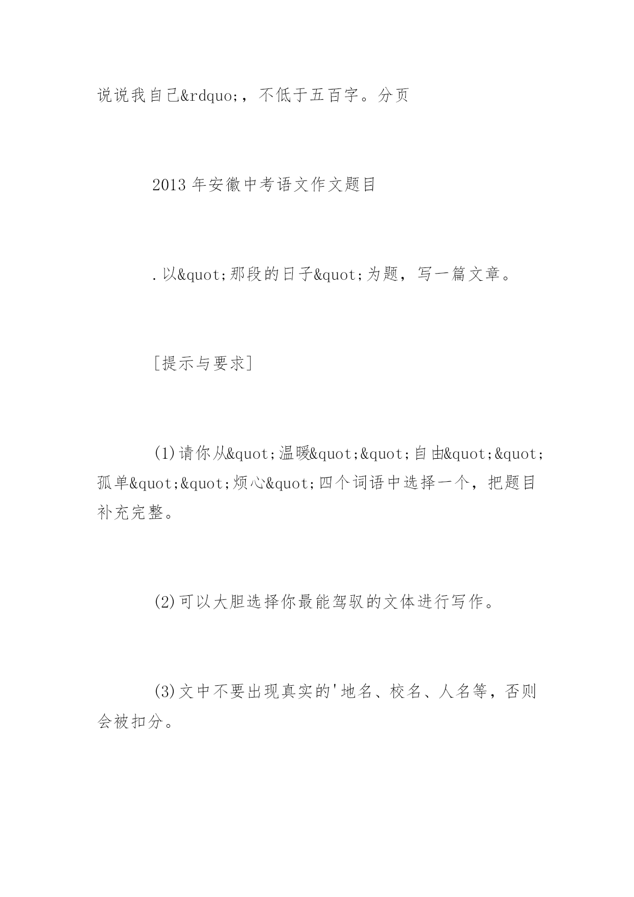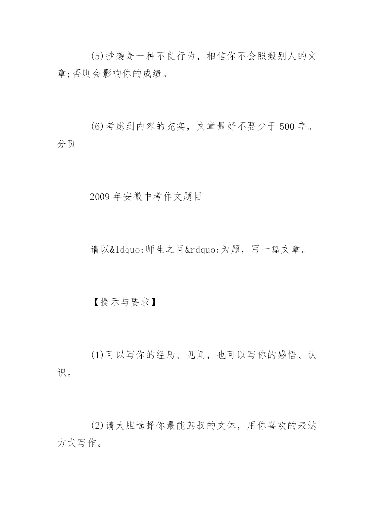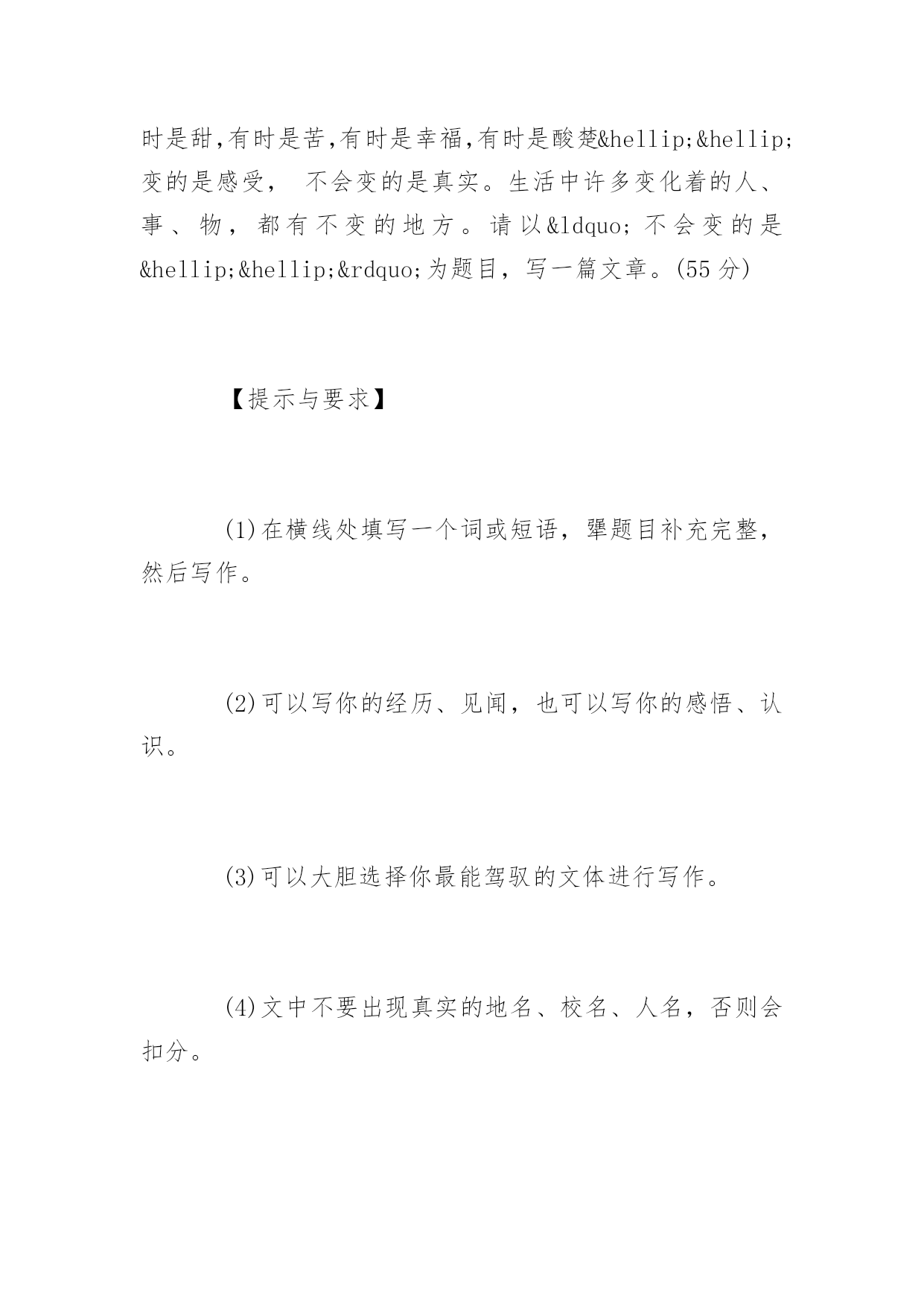 安徽中考作文题目2016年安徽中考作文题目汇总安徽省2016中考语文考试已经结束。今年安徽中考作文为你是我最____的人。百分网小编整理了安徽省历年中考作文题目,详情如下:2016年安徽中考作文题目:你是我最_______的人请以“你是我最_______的人”为题,写一篇文章。【提示语要求】(1)请你从“贴心”“感激”“牵挂”“欣赏”四个词语中选择一个,把题目补充完整。(2)可以大胆选择你最能驾驭的文体进行写作。(3)文中不要出现真实的地名、校名、人名等,否则会被扣分。(4)抄袭是一种不良行为,相信你不会照搬别人的文章,否则会影响你的成绩。(5)考虑到内容的充实,文章不少于600字。2015年安徽中考语文作文题目以“难忘那______________的眼神”为题,写一篇文章。提示与要求:(1)请你从“期盼”、“慈爱”、“坚毅”、“失望”四个词语中选择一个,把题目补充完整。(2)可以大胆选择你最能驾驭的文体进行写作。(3)文中不要出现真实的地名、校名、人名等,否则会被扣分。(4)抄袭是一种不良行为,相信你不会照搬别人的文章,否则会影响你的成绩。(5)考虑到内容的充实,文章不要少于500字。2014年安徽中考语文作文题目2014安徽中考语文作文为全命题作文,题目是“说说我自己”,不低于五百字。分页2013年安徽中考语文作文题目.以"那段的日子"为题,写一篇文章。[提示与要求](1)请你从"温暖""自由""孤单""烦心"四个词语中选择一个,把题目补充完整。(2)可以大胆选择你最能驾驭的文体进行写作。(3)文中不要出现真实的'地名、校名、人名等,否则会被扣分。(4)抄袭是一种不良行为,相信你不会照搬别人的文章,否则会影响你的成绩。(5)考虑到内容的充实,文章不要少于500字。分页2012年安徽中考语文作文题目中考全省统一卷作文题为:以“______在其中”为题,写一篇文章。要求:1、先把题目补充完整。你可以从“趣”、“美”、“情义”、“做人"中选填,也可以填其他词语。2、可以大胆选择你最能驾驭的文体进行写作。3、文中不要出现真实地名、校名、人名等,否则会被扣分。4、抄袭是一种不良行为,相信你不会照搬别人的文章,否则会影响你的成绩。5、考虑内容充实,不要少于500字。分页2011年安徽中考作文题目安徽中考语文作文题目为《在我们这个年龄》,大部分考生反应这次作文比较好写。分页2010年安徽中考作文题目水,有时是雪,有时是露,有时是冰凌,有时是雨珠……变的是形态,不会变的是晶莹;日子,有时是甜,有时是苦,有时是幸福,有时是酸楚……变的是感受,不会变的是真实。生活中许多变化着的人、事、物,都有不变的地方。请以“不会变的是……”为题目,写一篇文章。(55分)【提示与要求】(1)在横线处填写一个词或短语,犟题目补充完整,然后写作。(2)可以写你的经历、见闻,也可以写你的感悟、认识。(3)可以大胆选择你最能驾驭的文体进行写作。(4)文中不要出现真实的地名、校名、人名,否则会扣分。(5)抄袭是一种不良行为,相信你不会照搬别人的文章;否则会影响你的成绩。(6)考虑到内容的充实,文章最好不要少于500字。分页2009年安徽中考作文题目请以“师生之间”为题,写一篇文章。【提示与要求】(1)可以写你的经历、见闻,也可以写你的感悟、认识。(2)请大胆选择你最能驾驭的文体,用你喜欢的表达方式写作。(3)文中不要出现真实的地名、校名、人名等,否则会被扣分。(4)抄袭是一种不良行为,相信你不会照搬别人的文章;否则会影响你的成绩。(5)考虑到内容的充实,文章不要少于500字。分页2008年安徽中考作文题目请以"我在_______中得到了快乐"为题,写一篇文章。(55分)【提示与要求】(1)从"阅读""倾听""活动""实验""帮助别人&quo