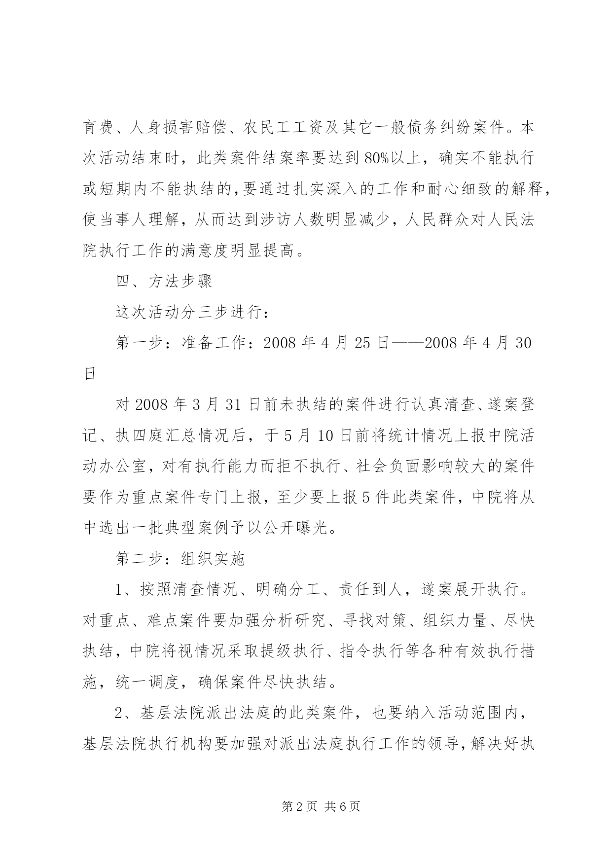 第PAGE\*Arabic\*MERGEFORMAT6页共NUMPAGES\*MERGEFORMAT6页司法百日执行实施方案为落实司法为民宗旨思想,以实际行动迎接北京奥运会,根据省法院决定,结合中院正在开展的“关注民生,促进和谐”执行百日会战活动安排部署,院党组决定从2008年4月11日至2008年7月20日,开展“迎奥运、系民生、促和谐、清积案”百日专项执行活动,为确保活动达到预期目的,特制定方案。一、指导思想“迎奥运、系民生、促和谐、清积案”百日专项执行活动要以邓小平理论和“三个代表”重要思想为指导,结合全省法院正在开展的“人民法院为人民、人民法官为人民”主题教育活动,充分认识民生类案件直接关系到人民群众的切身利益,关系到社会的安定团结。解决好此类案件,是人民法院长期以来贯彻落实中央关于维护社会稳定、构建和谐社会的重要工作内容,也是当前为北京奥运会创造和谐社会环境的一项紧迫任务。要高度重视,切实做好此类案件的执行工作。二、组织领导为确保活动的顺利进行,成立以副院长张庆忠为组长,执行局长卢晓东、办公室主任刘红新为副组长,庭长叶永亮、张春华、李宪瑞为成员的活动领导小组,该活动办公室设在执行四庭。三、任务目标民生类案件主要是涉及“三农案件”、赡养费、扶养费、抚育费、人身损害赔偿、农民工工资及其它一般债务纠纷案件。本次活动结束时,此类案件结案率要达到80%以上,确实不能执行或短期内不能执结的,要通过扎实深入的工作和耐心细致的解释,使当事人理解,从而达到涉访人数明显减少,人民群众对人民法院执行工作的满意度明显提高。四、方法步骤这次活动分三步进行:第一步:准备工作:2008年4月25日——2008年4月30日对2008年3月31日前未执结的案件进行认真清查、遂案登记、执四庭汇总情况后,于5月10日前将统计情况上报中院活动办公室,对有执行能力而拒不执行、社会负面影响较大的案件要作为重点案件专门上报,至少要上报5件此类案件,中院将从中选出一批典型案例予以公开曝光。第二步:组织实施1、按照清查情况、明确分工、责任到人,遂案展开执行。对重点、难点案件要加强分析研究、寻找对策、组织力量、尽快执结,中院将视情况采取提级执行、指令执行等各种有效执行措施,统一调度,确保案件尽快执结。2、基层法院派出法庭的此类案件,也要纳入活动范围内,基层法院执行机构要加强对派出法庭执行工作的领导,解决好执行中遇到的问题,特别是涉及到“三农”案件要及时妥善处理。3、开设专门投诉热线电话,自3月25日起专人值班,接到投诉电话后,值班人员要详细了解情况,做好记录,迅速将案件转交所属执行庭,投诉电话为4222215。4、活动期间实行周汇报制度,每周五上午九时前将本周执结的案件报执四庭,不能执结的案件也要报告进度情况。具体实施分两个阶段进行:第一阶段:(5月4日——5月31日)1、5月5日为活动集中宣传日,设立宣传站(点),利用宣传展板、宣传单、宣传横幅标语等各种宣传手段进行宣传手段进行宣传,并接受群众的现场投诉,通过宣传使社会各界了解活动的目的和意义。2、5月8日为集中执行日,可以采取现场执行、执行兑现大会等多种形式,对有执行能力的案件要即时执结,对有执行能力而拒不履行义务的被执行人要依法采取有效措施,坚决予以执行。对共同执行日情况进行统计,并填写统计表,于当日十五时前报执四庭。3、本次活动,除执行局统一安排外,各执行庭要采取多种形式精心组织,确保活动的持续性和有效性,同时执行局在辖区内适时组织几次不同形式的统一执行行动。4、5月30日进行第一阶段工作小结,将前一阶段执行情况进行总结,书面总结材料和需要跨辖区调度执行的案件一并于5月30日前上报活动办公室。第二阶段(6月1日——7月20日)1、6月8日,召开执行百日会战活动调度会,对第一阶段组织开展情况、执行成果、投诉情况进行小结,通报排名情况。同时布置第二阶段工作任务。对难案、积案进行调度。2、调度会后,采取适当形式,向社会各界公开前一阶段的成果,再次公开曝光一批案件,敦促被执行人尽快履行义务,申明拒不履行义务的法律后果。3、6月29日为第二个共同执行日,再次掀起执行高潮。具体工作由执行局组织实施,重点执行前一段未执结的“骨头”案件。要采用一切法律的手段,加大力度,尽快执结。对重点案件的执行要邀请新闻媒体的跟踪报道。4、对投诉案件、上级交办、督办案件以及网络、报刊等媒体公开曝光的案件,要加大执行力度,力争活动结束前执结。第三步:总结各执行庭在活动中,要注意收集资料和数据,完善登记、统计报告制度。活动结束后,各庭要分别进行认真总结,探讨如何建立长效机制,更好地解决涉及广大人民群众切身利益的执行问题,将对各庭活动开展情况进行总结排名,评选出立功受奖的先进单位和个人,单项奖的名单和书面总结报告于7月16