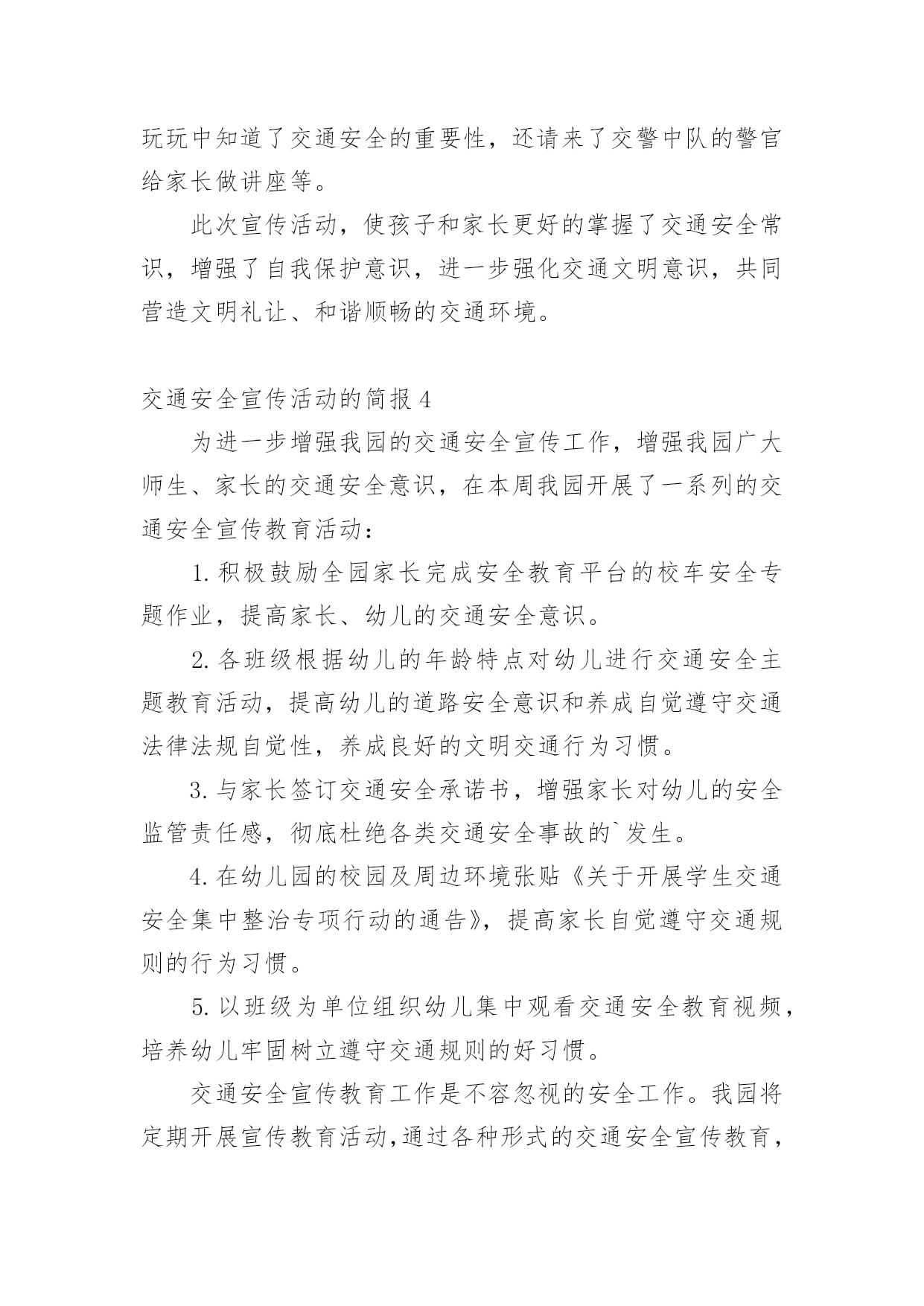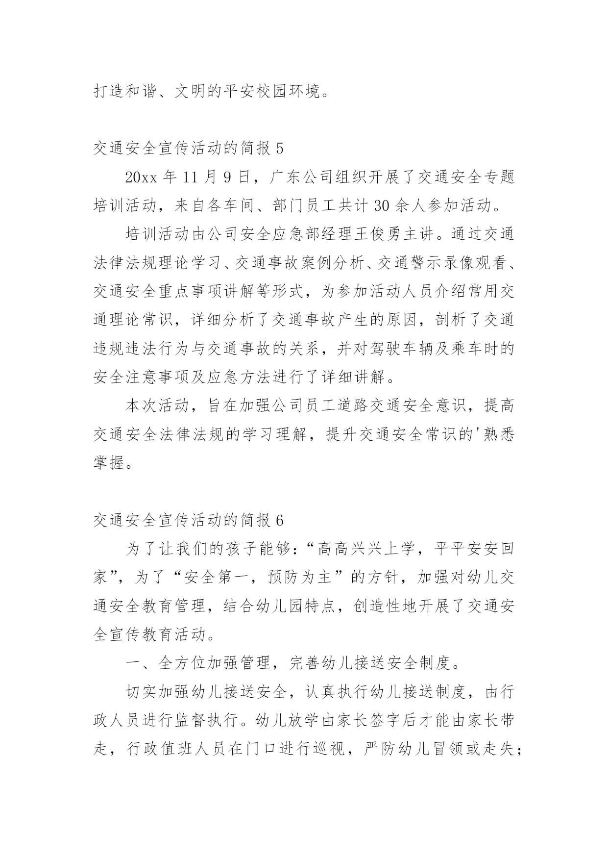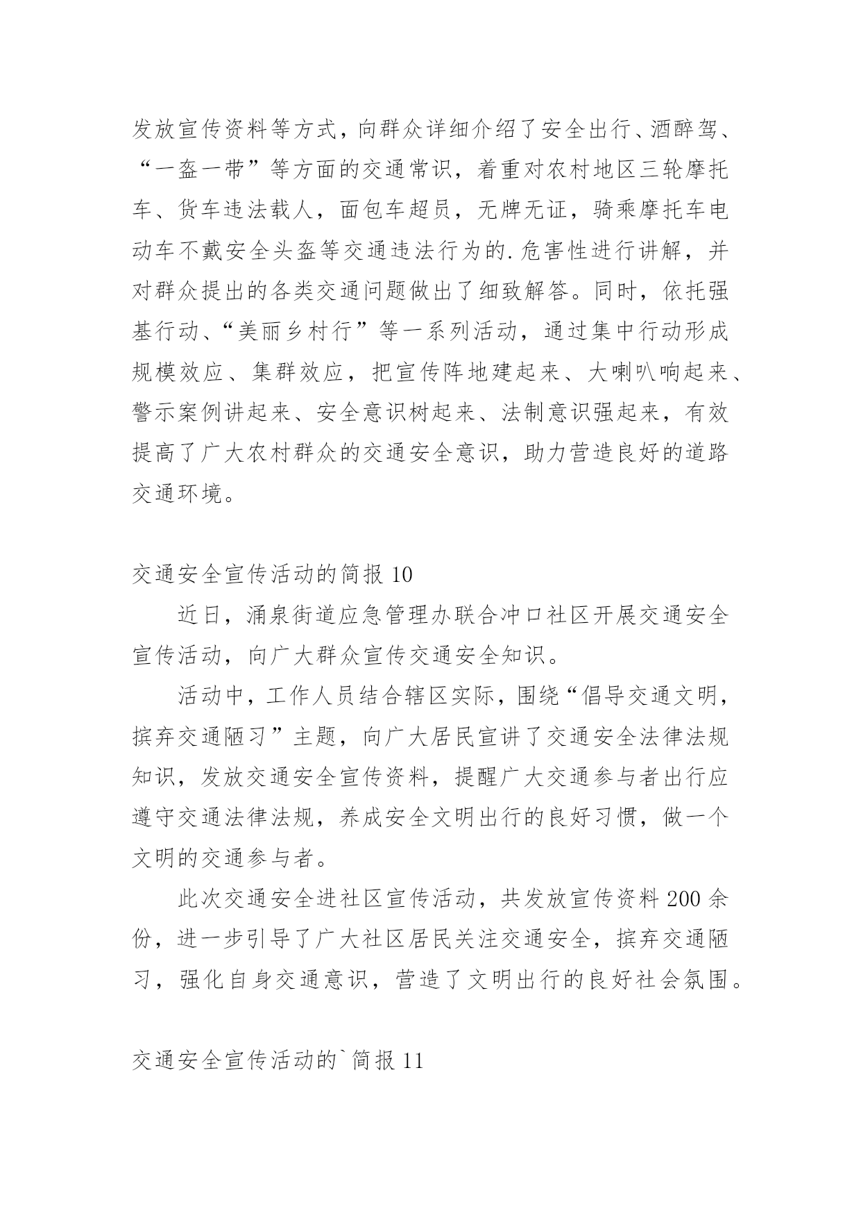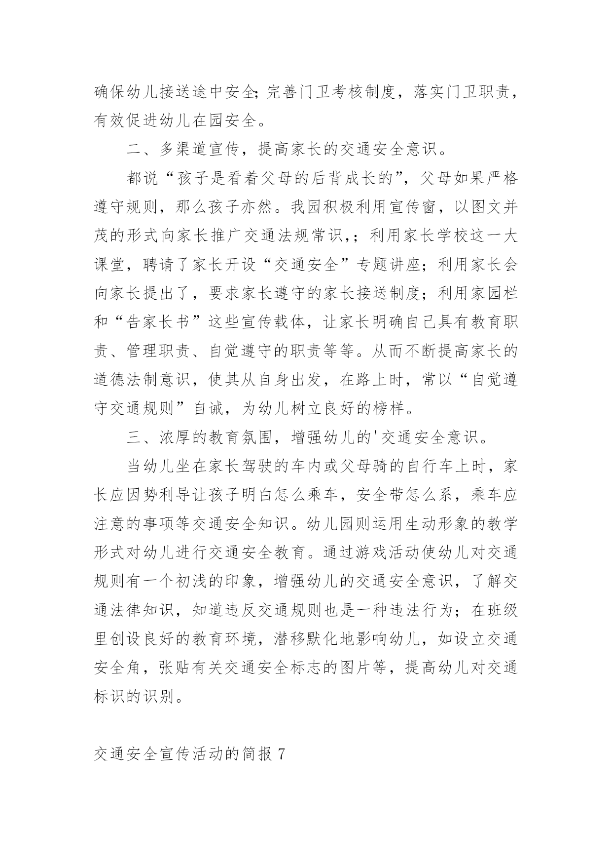 交通安全宣传活动的简报在社会发展不断提速的今天,越来越多地方需要用到简报,简报的种类尽管很多,但其结构却不无共同之处,一般都包括报头、标题、正文和报尾四个部分。你写简报时总是无从下手?以下是小编收集整理的交通安全宣传活动的简报,欢迎大家分享。交通安全宣传活动的简报1为预防和减少道路交通事故,营造安全、有序、畅通的道路交通环境,3月15日,西咸新区公安局沣东新城分局三桥新街派出所交巡警中队走进辖区开展交通安全宣传活动。活动中,民警与社区群众进行“面对面”零距离交流,为大家发放了交通安全宣传材料,并结合典型事故案例,着重对逆行、随意掉头、闯红灯、骑乘摩托车不带安全头盔、驾乘机动车未按规定系安全带等交通违法行为会造成的严重后果进行了讲解,使大家从思想深处认识到交通事故的危害性。最后,提醒广大居民在骑乘电动车或三轮车时要牢固树立“安全带就是生命带、安全头盔就是护头盾”的'安全意识,切实将道路交通安全知识科普到每人每户,真正让遵规守法、文明交通的良好习惯,“春风化雨”、自觉践行。交通安全宣传活动的简报2近日,为进一步提高群众的交通安全意识,强化农村地区交通安全宣传教育工作,六盘水市公安局交通警察支队直属一大队先后到大湾镇幸福村和大河镇裕民村开展“美丽乡村行”交通安全宣传活动。10月24日,市交警直属一大队六中队在大河镇裕民村开展“美丽乡村行”交通安全宣传活动,活动现场通过发放宣传资料、现场讲解等多形推动农村驾驶人及乘车人交通安全宣传工作,助推新时代平安乡村、美丽乡村建设进程,同时联合辖区劝导点工作人员开展劝导工作。10月25日,市交警直属一大队七中队利用“赶集日”,深入大湾镇幸福村开展“美丽乡村行”交通安全宣传活动。活动期间,宣传民警结合农村道路的实际情况,通过面对面讲解、剖析典型事故案例、发放宣传资料及宣传品、解答群众咨询等方式,广泛宣传了交通安全法律法规知识及行车安全常识。并结合“一盔一带”宣传主题,向过往群众讲解骑乘摩托车、电动车不戴安全头盔、乘坐汽车不系安全带、农用车、电瓶三轮车违法载人、酒驾、醉驾,超员超载等农村突出交通违法行为的危害性。引导群众和驾驶人自觉抵制不文明、不安全交通行为,做到文明走路、安全驾驶,确保出行安全。通过此次宣传活动,切实加强了摩托车和电动自行车骑乘人员规范佩戴安全头盔、汽车驾乘人员规范使用安全带管理,形成以宣传促整治的`良好氛围,为共同构建和谐、有序的道路交通环境打下了坚实基础。交通安全宣传活动的简报3交通安全教育从小抓起,让幼儿从小懂交通,从小就把安全意识、生存意识放心中。为加强对幼儿的交通安全教育,增强幼儿的交通法律意识,确保幼儿的交通安全,近日,XX幼儿园利用“交通安全教育宣传”活动,请来了交警中队的徐警官为中班组幼儿进行了一次生动而有意义的交通安全教育活动,起到了良好的效果。活动前,各班老师首先通过多媒体播放图片、短片、漫画、游戏等不同形式教孩子们认识交通标志、红绿灯、交通信号、斑马线等知识。引导孩子们感知日常生活中行走、过马路、乘车时如何注意安全。活动中,徐警官教孩子们学习交通指挥手势信号,带孩子们认识交通标志图、亲自指挥孩子们玩交通游戏,孩子们积极性很高,有的学做交警指挥,有的说说我认识的交通标志等,通过做做、学学、玩玩、用情景表演的'方式进一步加强幼儿的安全意识,提高了幼儿自我保护的能力,初步养成了自觉遵守交通规则的意识。同时,全园以年级组为单位,开展了形式不同的交通安全教育活动。活动中将一些生硬的交通规则,通过孩子们喜闻乐见的形式融入其中,帮助孩子们切实地了解一些基本的交通安全注意事项,增强了幼儿的交通安全的意识。大班幼儿走出校园,来到社区宣传“关爱生命安全,遵守交通规则”的活动。小班幼儿模拟生活中有关交通安全的场景,在学学玩玩中知道了交通安全的重要性,还请来了交警中队的警官给家长做讲座等。此次宣传活动,使孩子和家长更好的掌握了交通安全常识,增强了自我保护意识,进一步强化交通文明意识,共同营造文明礼让、和谐顺畅的交通环境。交通安全宣传活动的简报4为进一步增强我园的交通安全宣传工作,增强我园广大师生、家长的交通安全意识,在本周我园开展了一系列的交通安全宣传教育活动:1.积极鼓励全园家长完成安全教育平台的校车安全专题作业,提高家长、幼儿的交通安全意识。2.各班级根据幼儿的年龄特点对幼儿进行交通安全主题教育活动,提高幼儿的道路安全意识和养成自觉遵守交通法律法规自觉性,养成良好的文明交通行为习惯。3.与家长签订交通安全承诺书,增强家长对幼儿的安全监管责任感,彻底杜绝各类交通安全事故的`发生。4.在幼儿园的校园及周边环境张贴《关于开展学生交通安全集中整治专项行动的通告》,提高家长自觉遵守交通规则的行为习惯。5.以班级为单位组织幼儿集中观看交通安全教育视频,培养幼儿牢固树立遵守交通规则的好习惯。