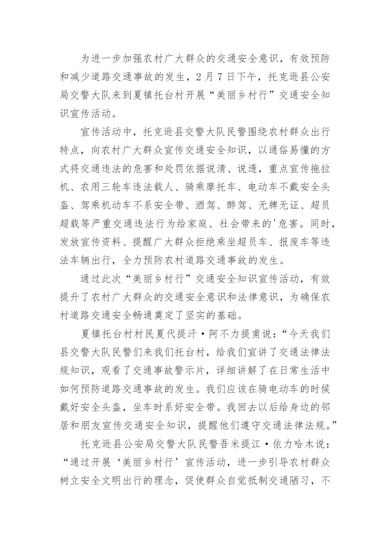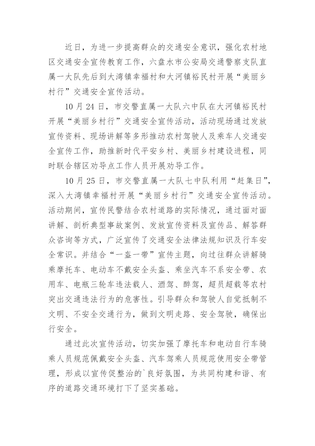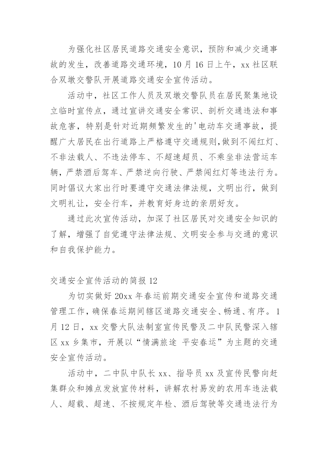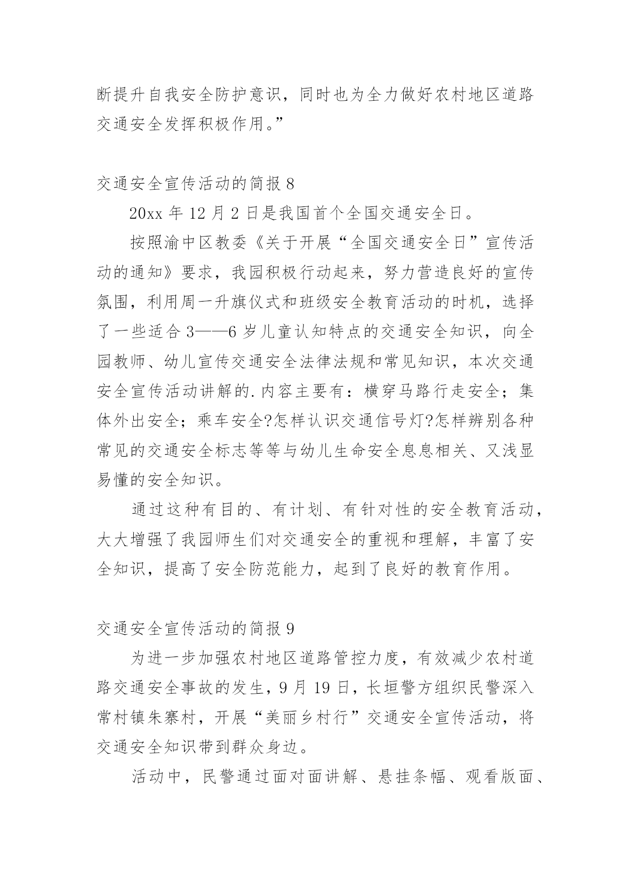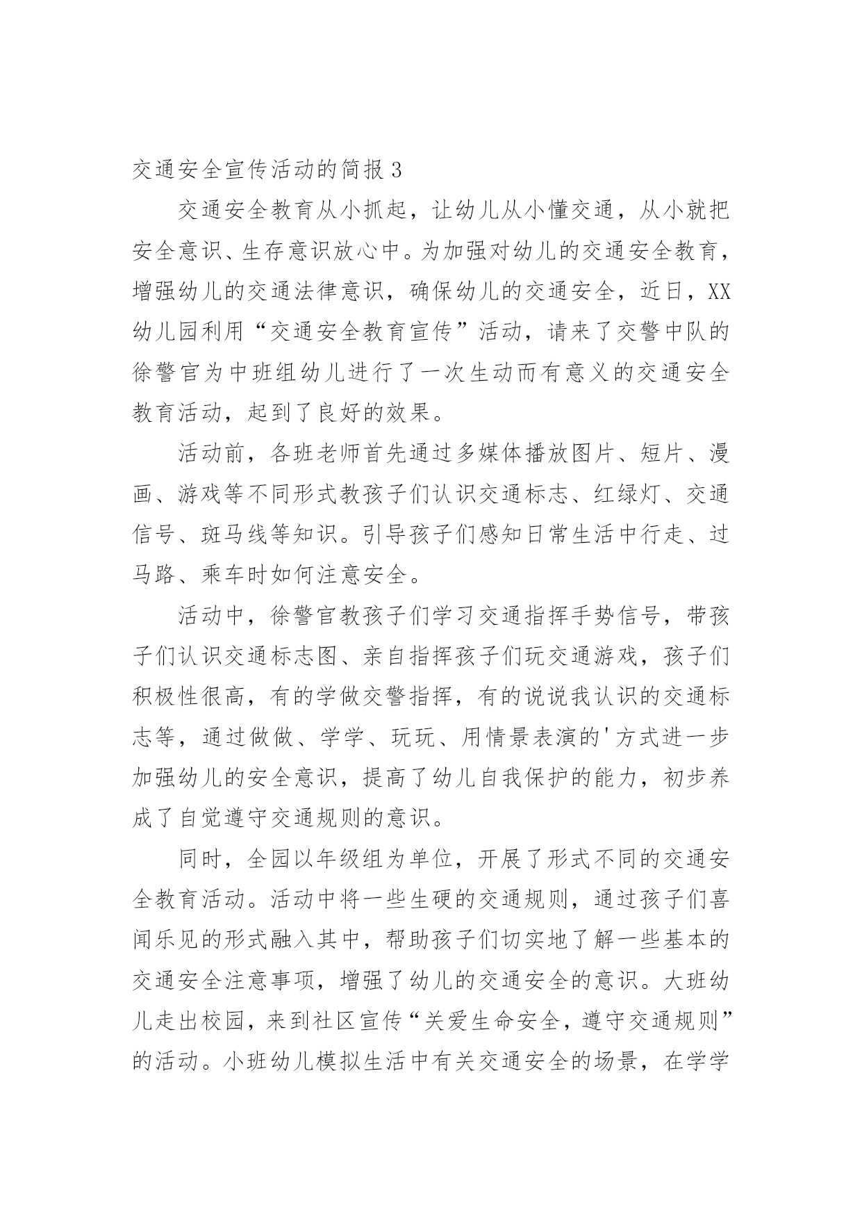 交通安全宣传活动的简报在社会发展不断提速的今天,越来越多地方需要用到简报,简报的种类尽管很多,但其结构却不无共同之处,一般都包括报头、标题、正文和报尾四个部分。你写简报时总是无从下手?以下是小编收集整理的交通安全宣传活动的简报,欢迎大家分享。交通安全宣传活动的简报1为预防和减少道路交通事故,营造安全、有序、畅通的道路交通环境,3月15日,西咸新区公安局沣东新城分局三桥新街派出所交巡警中队走进辖区开展交通安全宣传活动。活动中,民警与社区群众进行“面对面”零距离交流,为大家发放了交通安全宣传材料,并结合典型事故案例,着重对逆行、随意掉头、闯红灯、骑乘摩托车不带安全头盔、驾乘机动车未按规定系安全带等交通违法行为会造成的严重后果进行了讲解,使大家从思想深处认识到交通事故的危害性。最后,提醒广大居民在骑乘电动车或三轮车时要牢固树立“安全带就是生命带、安全头盔就是护头盾”的'安全意识,切实将道路交通安全知识科普到每人每户,真正让遵规守法、文明交通的良好习惯,“春风化雨”、自觉践行。交通安全宣传活动的简报2近日,为进一步提高群众的交通安全意识,强化农村地区交通安全宣传教育工作,六盘水市公安局交通警察支队直属一大队先后到大湾镇幸福村和大河镇裕民村开展“美丽乡村行”交通安全宣传活动。10月24日,市交警直属一大队六中队在大河镇裕民村开展“美丽乡村行”交通安全宣传活动,活动现场通过发放宣传资料、现场讲解等多形推动农村驾驶人及乘车人交通安全宣传工作,助推新时代平安乡村、美丽乡村建设进程,同时联合辖区劝导点工作人员开展劝导工作。10月25日,市交警直属一大队七中队利用“赶集日”,深入大湾镇幸福村开展“美丽乡村行”交通安全宣传活动。活动期间,宣传民警结合农村道路的实际情况,通过面对面讲解、剖析典型事故案例、发放宣传资料及宣传品、解答群众咨询等方式,广泛宣传了交通安全法律法规知识及行车安全常识。并结合“一盔一带”宣传主题,向过往群众讲解骑乘摩托车、电动车不戴安全头盔、乘坐汽车不系安全带、农用车、电瓶三轮车违法载人、酒驾、醉驾,超员超载等农村突出交通违法行为的危害性。引导群众和驾驶人自觉抵制不文明、不安全交通行为,做到文明走路、安全驾驶,确保出行安全。通过此次宣传活动,切实加强了摩托车和电动自行车骑乘人员规范佩戴安全头盔、汽车驾乘人员规范使用安全带管理,形成以宣传促整治的`良好氛围,为共同构建和谐、有序的道路交通环境打下了坚实基础。交通安全宣传活动的简报3交通安全教育从小抓起,让幼儿从小懂交通,从小就把安全意识、生存意识放心中。为加强对幼儿的交通安全教育,增强幼儿的交通法律意识,确保幼儿的交通安全,近日,XX幼儿园利用“交通安全教育宣传”活动,请来了交警中队的徐警官为中班组幼儿进行了一次生动而有意义的交通安全教育活动,起到了良好的效果。活动前,各班老师首先通过多媒体播放图片、短片、漫画、游戏等不同形式教孩子们认识交通标志、红绿灯、交通信号、斑马线等知识。引导孩子们感知日常生活中行走、过马路、乘车时如何注意安全。活动中,徐警官教孩子们学习交通指挥手势信号,带孩子们认识交通标志图、亲自指挥孩子们玩交通游戏,孩子们积极性很高,有的学做交警指挥,有的说说我认识的交通标志等,通过做做、学学、玩玩、用情景表演的'方式进一步加强幼儿的安全意识,提高了幼儿自我保护的能力,初步养成了自觉遵守交通规则的意识。同时,全园以年级组为单位,开展了形式不同的交通安全教育活动。活动中将一些生硬的交通规则,通过孩子们喜闻乐见的形式融入其中,帮助孩子们切实地了解一些基本的交通安全注意事项,增强了幼儿的交通安全的意识。大班幼儿走出校园,来到社区宣传“关爱生命安全,遵守交通规则”的活动。小班幼儿模拟生活中有关交通安全的场景,在学学玩玩中知道了交通安全的重要性,还请来了交警中队的警官给家长做讲座等。此次宣传活动,使孩子和家长更好的掌握了交通安全常识,增强了自我保护意识,进一步强化交通文明意识,共同营造文明礼让、和谐顺畅的交通环境。交通安全宣传活动的简报4为进一步增强我园的交通安全宣传工作,增强我园广大师生、家长的交通安全意识,在本周我园开展了一系列的交通安全宣传教育活动:1.积极鼓励全园家长完成安全教育平台的校车安全专题作业,提高家长、幼儿的交通安全意识。2.各班级根据幼儿的年龄特点对幼儿进行交通安全主题教育活动,提高幼儿的道路安全意识和养成自觉遵守交通法律法规自觉性,养成良好的文明交通行为习惯。3.与家长签订交通安全承诺书,增强家长对幼儿的安全监管责任感,彻底杜绝各类交通安全事故的`发生。4.在幼儿园的校园及周边环境张贴《关于开展学生交通安全集中整治专项行动的通告》,提高家长自觉遵守交通规则的行为习惯。5.以班级为单位组织幼儿集中观看交通安全教育视频,培养幼儿牢固树立遵守交通规则的好习惯。