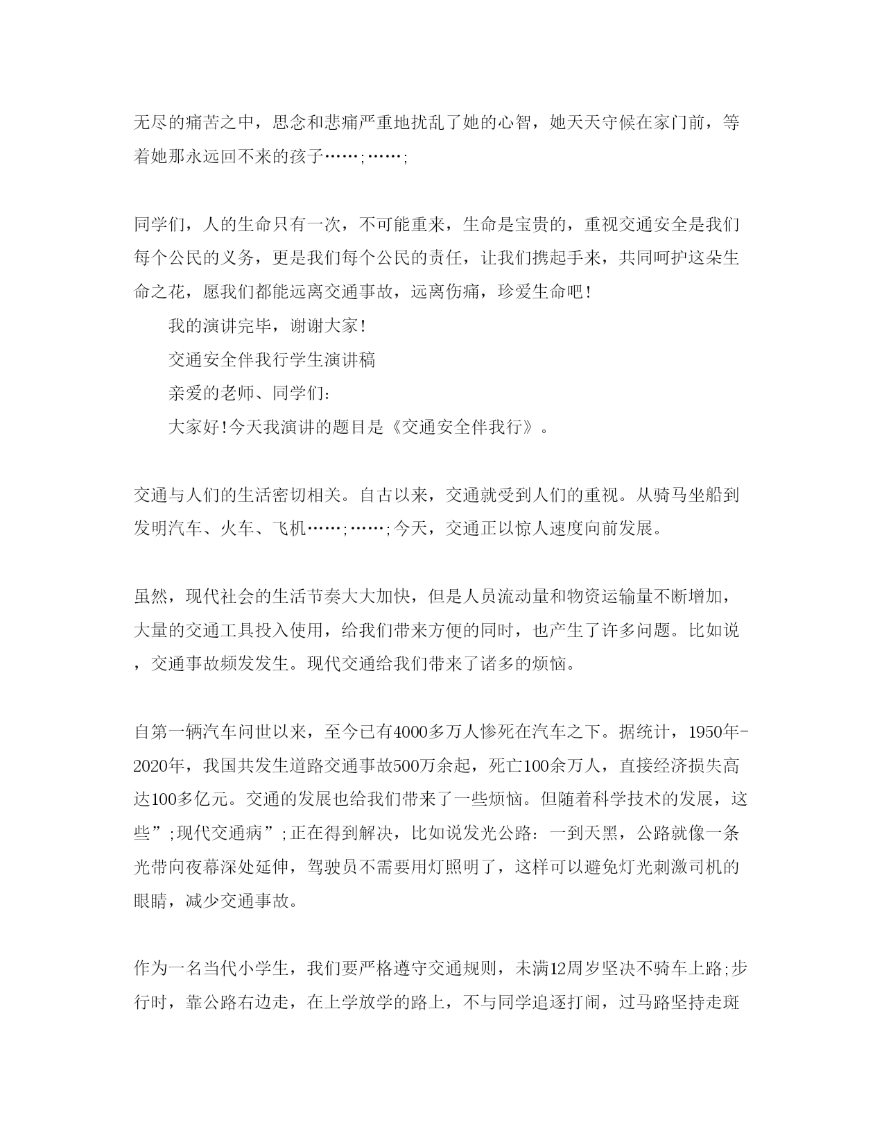 此资料由网络收集而来,如有侵权请告知上传者立即删除。资料共分享,我们负责传递知识。交通安全伴我成长演讲稿安全,牵系着每个人的生活。每当我走在公路上,看到”;车水马龙”;、”;人头攒动”;的热闹景象,看到我们的同学违反交通规则的危险行为,看到身边飞驰而过的车辆,心里就会产生恐惧感。下面是小编为大家收集关于交通安全伴我成长演讲稿,欢迎借鉴参考。交通安全伴我行尊敬的老师、亲爱的同学们:大家好!今天我演讲的题目是《交通安全伴我行》。在我们的日常生活中,交通安全总是和我们如影随形,人们都希望平安地度过每一天,然而事实却总是大相径庭。中国每天因车祸死亡的人数就有280多人,每年就有十万多人葬身车轮。血淋淋的事实摆在人们面前,人们不禁要问:”;这是为什么呢?”;我想这是因为在这些行人和洗车驾驶员的眼里,红绿灯和交通安全是可以忽略不计的。,他们或许真的有急速,但他们不知道的是,行人闯红灯,下一站可能就是医院或者是阎王殿。司机闯红灯,如果发生了事故,就可能会失去人生自由,害人害己。而这些悲剧的根源就是他们不遵守交通规则,无视交通安全,才酿成了苦果。为了避免悲剧的发生,我们应该时刻牢记交通规则,不论做什么都应该把安全放在第一位。比如,在繁忙的十字路口,四面都悬挂着红黄绿三种信号灯,这时候我们就应该做到红灯停,黄灯等,绿灯行,过马路才会安全。当我们随爸爸妈妈一起出行时,我们要提醒爸爸妈妈要做到各行其道,靠右行驶,看清警示牌,我们才能做到安全出行、平安归家。不能逞一时之快,将自己的生命当儿戏。交通安全像是警钟,悬挂在我们身后。这个警钟时时刻刻都在长鸣,好像在提醒我们要遵守交通规则,把安全放在第一位。愿我们每位同学快乐地成长,平安地生活!我的演讲到此结束,谢谢大家!交通安全伴我成长演讲稿范文尊敬的老师,亲爱的同学们:大家好!我今天演讲的题目是”;交通安全伴我行”;。有这样一则笑话,不知道大家有没有听过:一个年轻人在英国结交了一位女朋友,但是他们没有多久就分手了,原因是这位年轻人过马路时闯了红灯,英国姑娘吃惊的说:”;连红灯都敢闯,还有什么违法的事不敢做。”;这位年轻人回国后,又结交了一位中国姑娘,结果小伙子却因过马路没有闯红灯,而和中国姑娘分手。中国姑娘评价小伙子说:”;连红灯都不敢闯,还有什么出息?”;当然,这仅仅是个笑话,但它说明了一个问题:中国人在遵守交通规则方面的意识淡薄。下面我想问大家一个问题,健康的身体、聪明的大脑和汽车哪一个更贵重。我想大家一定会毫不犹豫地说,当然是健康的身体和聪明的大脑。这个小孩子都知道,但是我想问的是,为什么总有人无视交通法规的存在,依然我行我素,在马路上横冲直撞呢?试想一下,那沉重的黑橡胶车轮,在你的皮肤上碾过,在你健康的身体上碾过,再聪明的大脑有什么用呢?爸爸妈妈就曾经告诉过我这样一个真实的故事:有一位母亲,天天在晚上九点都在她家门前等候她中学晚自习归来的孩子。有一天雨夜,她看着孩子活泼俏丽的身影出现在公路边,正想高兴地去迎接,不料一辆汽车飞速地冲了过来,冲向了她的孩子,惊恐的母亲呆住了。她眼睁睁的看着她的孩子倒在血泊中……;……;一个刚到花季的生命凋零了,一位慈爱的母亲从此疯了,她陷入了深深的自责和无尽的痛苦之中,思念和悲痛严重地扰乱了她的心智,她天天守候在家门前,等着她那永远回不来的孩子……;……;同学们,人的生命只有一次,不可能重来,生命是宝贵的,重视交通安全是我们每个公民的义务,更是我们每个公民的责任,让我们携起手来,共同呵护这朵生命之花,愿我们都能远离交通事故,远离伤痛,珍爱生命吧!我的演讲完毕,谢谢大家!交通安全伴我行学生演讲稿亲爱的老师、同学们:大家好!今天我演讲的题目是《交通安全伴我行》。交通与人们的生活密切相关。自古以来,交通就受到人们的重视。从骑马坐船到发明汽车、火车、飞机……;……;今天,交通正以惊人速度向前发展。虽然,现代社会的生活节奏大大加快,但是人员流动量和物资运输量不断增加,大量的交通工具投入使用,给我们带来方便的同时,也产生了许多问题。比如说,交通事故频发发生。现代交通给我们带来了诸多的烦恼。自第一辆汽车问世以来,至今已有4000多万人惨死在汽车之下。据统计,1950年-2020年,我国共发生道路交通事故500万余起,死亡100余万人,直接经济损失高达100多亿元。交通的发展也给我们带来了一些烦恼。但随着科学技术的发展,这些”;现代交通病”;正在得到解决,比如说发光公路:一到天黑,公路就像一条光带向夜幕深处延伸,驾驶员不需要用灯照明了,这样可以避免灯光刺激司机的眼睛,减少交通事故。作为一名当代小学生,我们要严格遵守交通规则,未满12周岁坚决不骑车上路;步行时,靠公路右边走,在上学放学的路上,不与同学追逐打闹,过马路坚持走斑马线,坚决