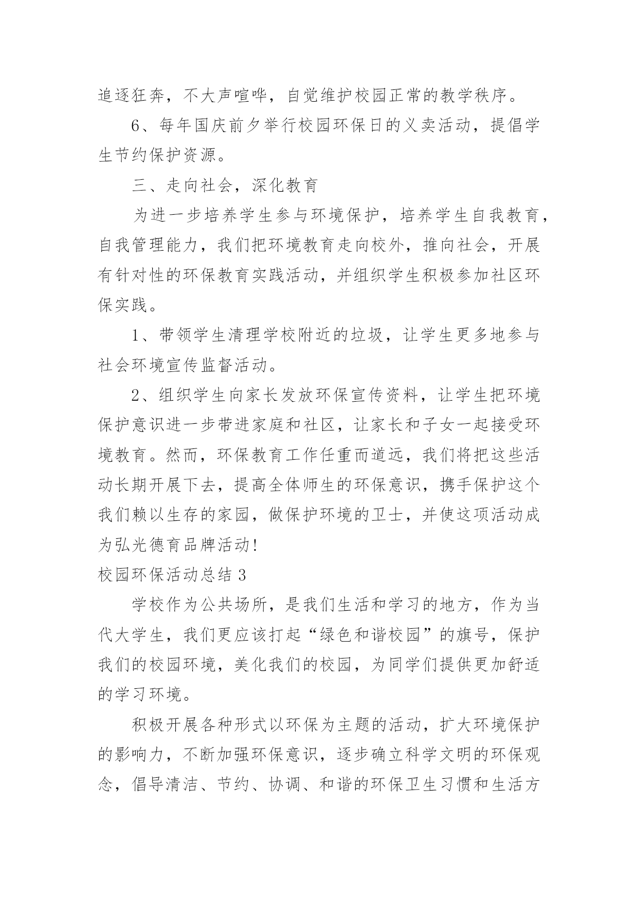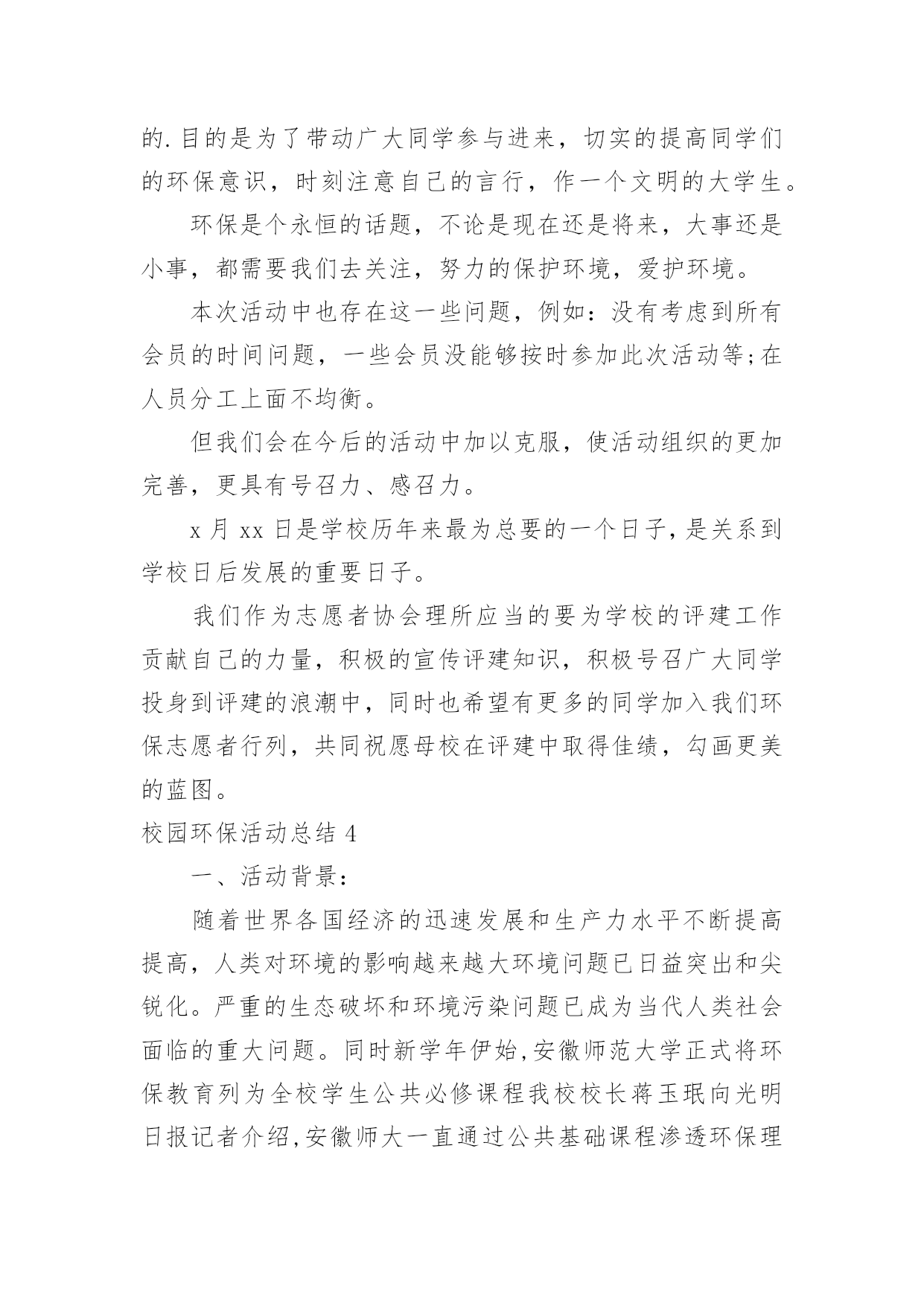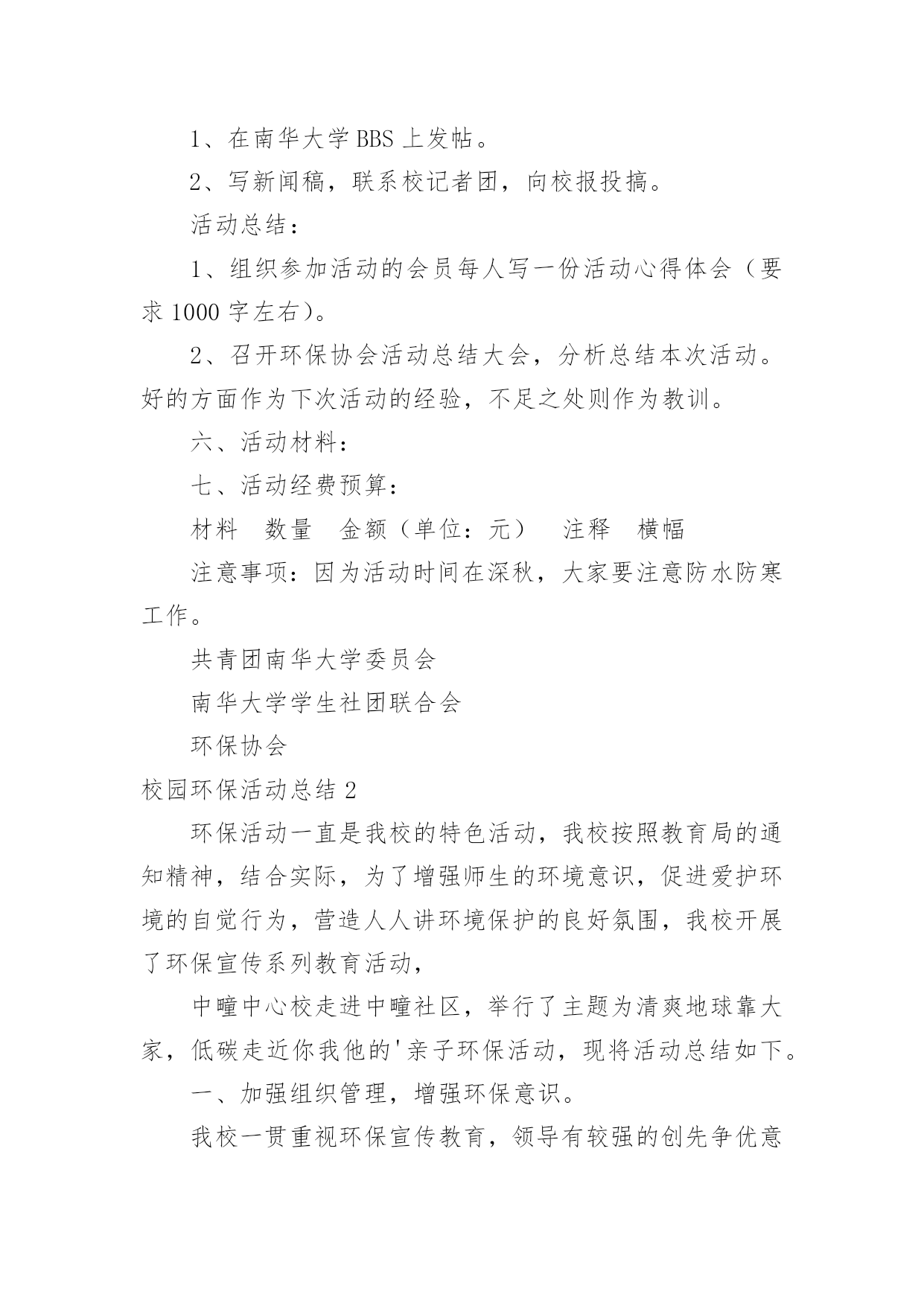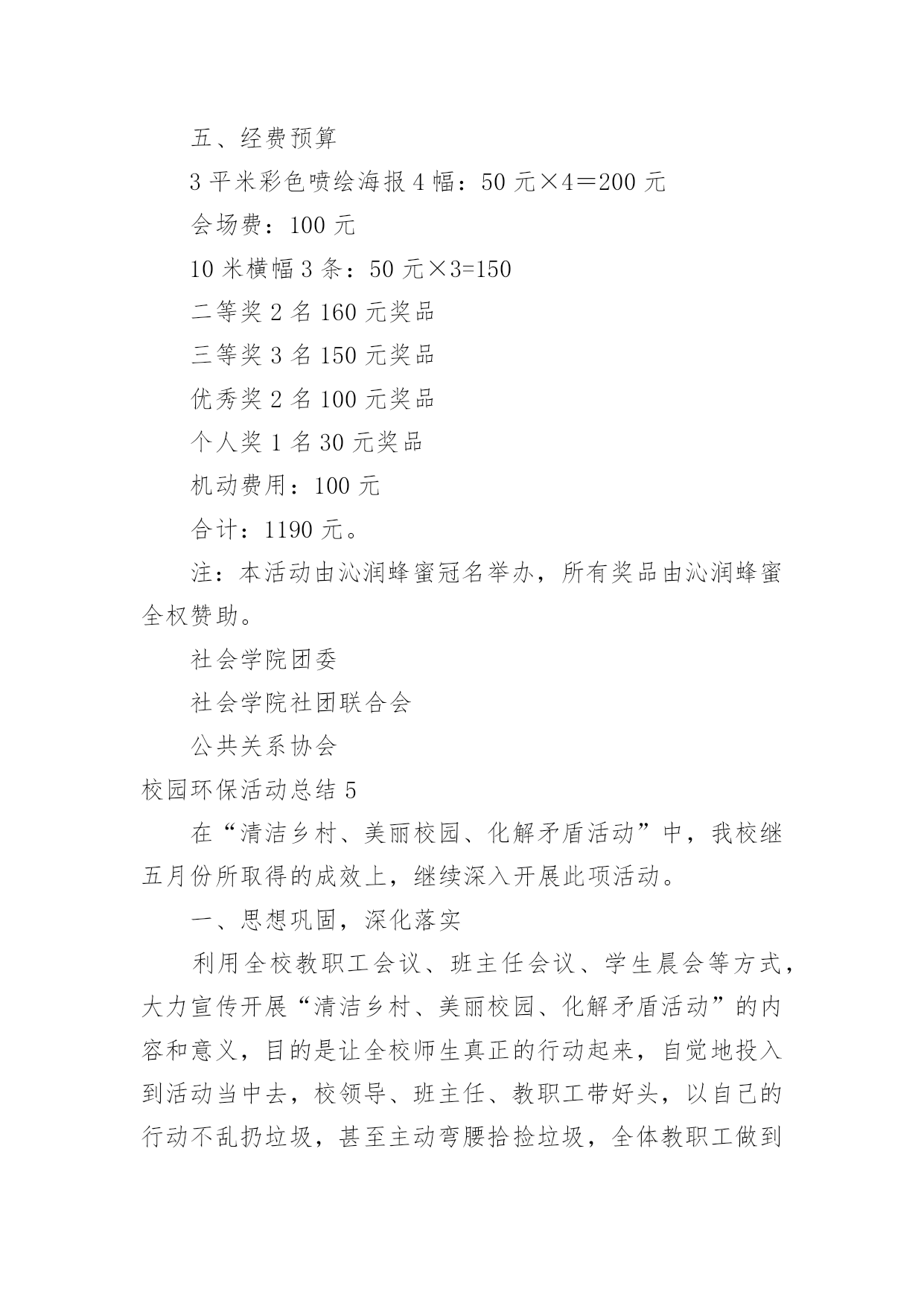 校园环保活动总结校园环保活动总结总结是对取得的成绩、存在的问题及得到的经验和教训等方面情况进行评价与描述的一种书面材料,它有助于我们寻找工作和事物发展的规律,从而掌握并运用这些规律,不如静下心来好好写写总结吧。那么总结应该包括什么内容呢?下面是小编精心整理的校园环保活动总结,欢迎大家借鉴与参考,希望对大家有所帮助。校园环保活动总结1一、活动背景环境保护,南华争先。然而南华的校园环境并不理想,学生的环保意识也不高,各种不环保现象普遍存在。为帮助南华大学建设“绿色校园”,还南华学子一舒适的学习和生活环境。我校环保协会的.校园系列环保活动在这金秋之季正式展开了。二、活动目的及意义1、美花广场,净化喷池。2、让环保协会会员体验清洁工工作的艰辛。3、宣传环保,提高南华学子的环保意识。让南华校园变得更美丽,从而使大家有一个舒适的学习和生活环境。三、活动主题净化校园环境,共建绿色校园。四、活动时间和地点活动地点:南华广场(实际时间可能会因南华物业中心绿化清洁部或天气状况有所调整)五、活动流程(一)前期准备:1、10月17日中午召开环保协会理事会会议,分配给各部门具体工作。4、制作“爱护校园环境,请勿乱丢乱扔”的横幅一条。(二)活动开展:(各小组工作同时进行)1、领导小组:协调各组工作并督促会员认真工作。2、环保宣传组:宣传环保知识,向路人发放环保宣传册;组织路人签订环保承诺书,并在活动结束后黏贴到展板上;拍摄活动现场。3、清洁喷池组:自带扫把,下池和南华物业中心绿化清洁部工作人员一起打扫喷池。要求:认真负责,不留死角。不怕苦,不怕累。4、广场打扫组:自带打扫工具,对南华广场及周边进行垃圾清理。(活动开展要求:会员要对人有礼貌,对工作要认真负责,服从安排。参加活动的会员左手需系好绿丝带。)(三)后期宣传与总结:后期宣传:借助网络和媒体宣传。(由宣传部和组策部负责)1、在南华大学BBS上发帖。2、写新闻稿,联系校记者团,向校报投搞。活动总结:1、组织参加活动的会员每人写一份活动心得体会(要求1000字左右)。2、召开环保协会活动总结大会,分析总结本次活动。好的方面作为下次活动的经验,不足之处则作为教训。六、活动材料:七、活动经费预算:材料数量金额(单位:元)注释横幅注意事项:因为活动时间在深秋,大家要注意防水防寒工作。共青团南华大学委员会南华大学学生社团联合会环保协会校园环保活动总结2环保活动一直是我校的特色活动,我校按照教育局的通知精神,结合实际,为了增强师生的环境意识,促进爱护环境的自觉行为,营造人人讲环境保护的良好氛围,我校开展了环保宣传系列教育活动,中疃中心校走进中疃社区,举行了主题为清爽地球靠大家,低碳走近你我他的'亲子环保活动,现将活动总结如下。一、加强组织管理,增强环保意识。我校一贯重视环保宣传教育,领导有较强的创先争优意识,成立了学校环境教育工作领导小组,校长作为第一责任人常抓不懈。每学期的学校计划、德育计划中都有明确创建目标,并抓好过程管理,定期研究,落实措施,平时加强检查督促,搞好评比总结。重视资料建设,对平时重大的活动都能拍照录像,积累文字资料。重视阵地建设,学校有宣传橱窗,各班有宣传板报,结合活动宣传内容,并开展手抄报和板报评比活动。二、参与各类活动,注重教育效果。1、利用班队会课开展环保教育,让学生了解我县环保成就,增强学生环境保护的信心。2、在国旗下讲话中,结合我校的特色活动环保日,进行环境保护重要性的教育,增强环境保护的意识。3、在本学期举办的以学习雷锋,争做环保小卫士、清爽地球靠大家,低碳走近你我他等为主题的活动中,同学们都能积极投入到活动中。当看到水龙头在滴水时或者没人时灯仍亮着,就顺手关掉;生活用品用完后,就分类处理而不随手扔掉;购物时,能自觉不使用超薄塑料袋,不制造白色垃圾;不用一次性筷子用实际行动美化环境,净化心灵。结合活动的开展,利用校园广播、板报等大力宣传,从而增强了全体师生的环境意识。4、学校的文明礼仪岗学生积极参与绿化、净化、美化校园的劳动,他们每天巡逻卫生清洁,为校园的绿化、美化、香化、净化尽心尽力。5、每周确定常规教育重点,教育学生不乱涂乱写,不追逐狂奔,不大声喧哗,自觉维护校园正常的教学秩序。6、每年国庆前夕举行校园环保日的义卖活动,提倡学生节约保护资源。三、走向社会,深化教育为进一步培养学生参与环境保护,培养学生自我教育,自我管理能力,我们把环境教育走向校外,推向社会,开展有针对性的环保教育实践活动,并组织学生积极参加社区环保实践。1、带领学生清理学校附近的垃圾,让学生更多地参与社会环境宣传监督活动。2、组织学生向家长发放环保宣传资料,让学生把环境保护意识进一步带进家庭和社区,让家长和子女一起接受环境教育。然而,环保教育工作任重而道远,我们将把这些活动长期开展下去,提高全体师生的环保意