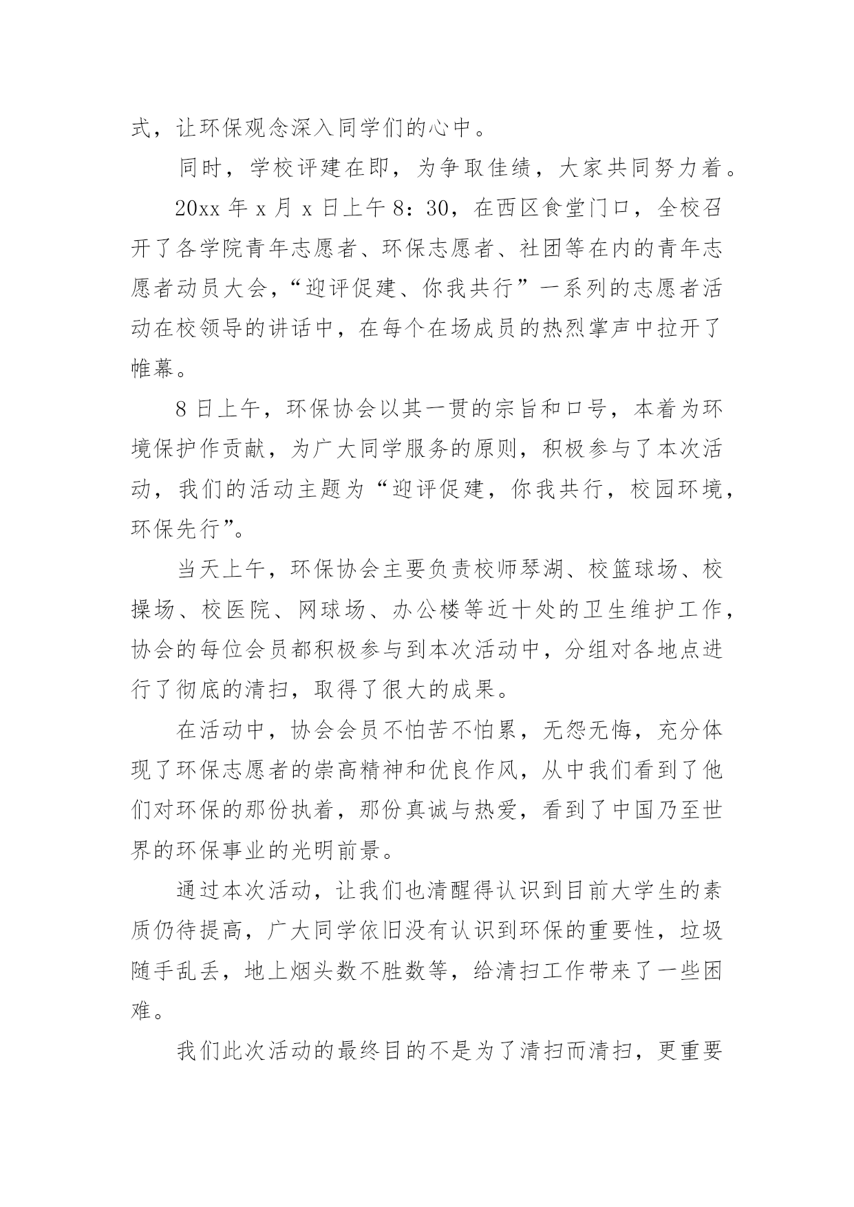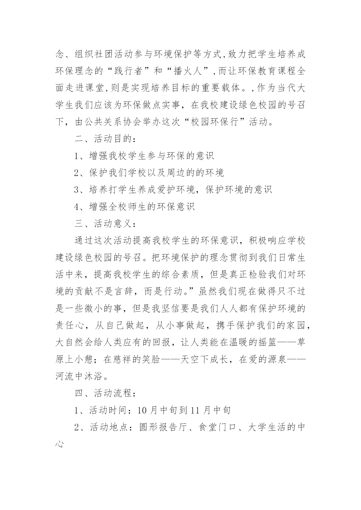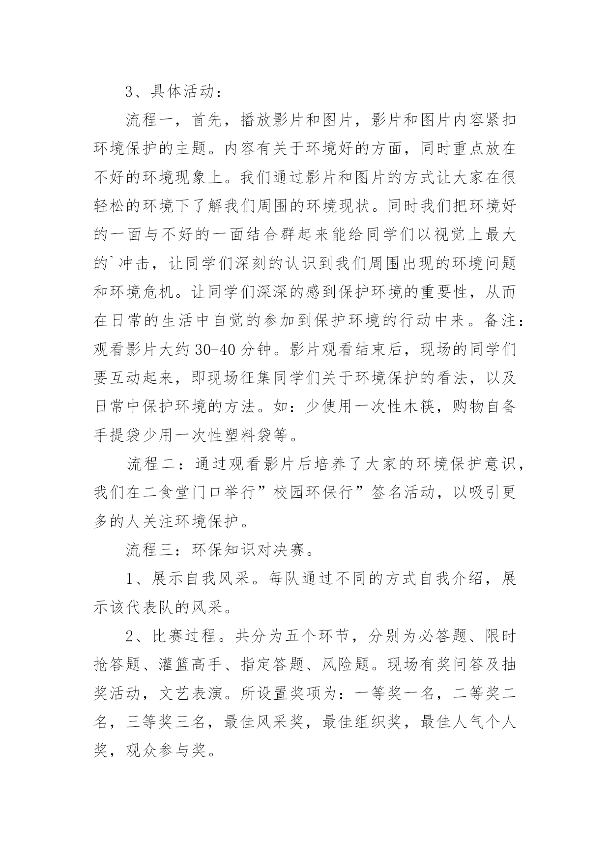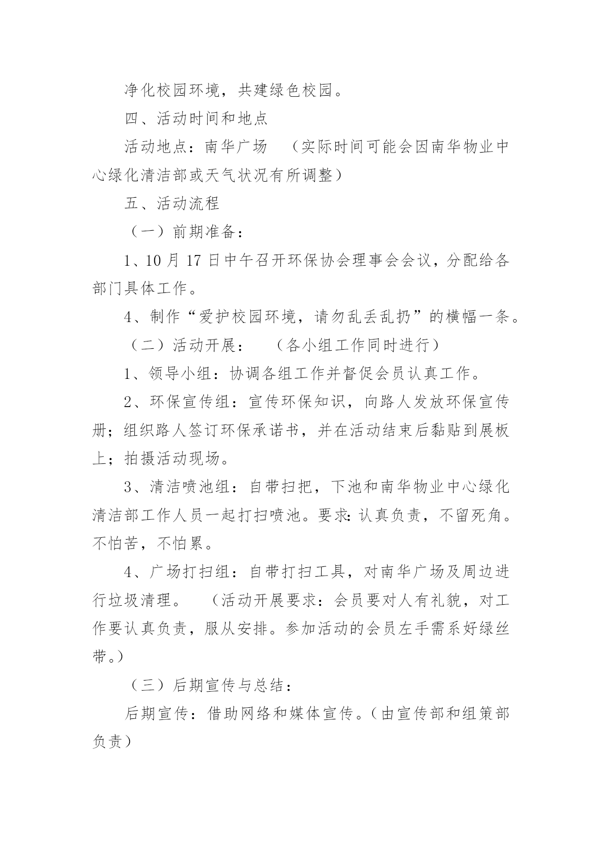 校园环保活动总结校园环保活动总结总结是对取得的成绩、存在的问题及得到的经验和教训等方面情况进行评价与描述的一种书面材料,它有助于我们寻找工作和事物发展的规律,从而掌握并运用这些规律,不如静下心来好好写写总结吧。那么总结应该包括什么内容呢?下面是小编精心整理的校园环保活动总结,欢迎大家借鉴与参考,希望对大家有所帮助。校园环保活动总结1一、活动背景环境保护,南华争先。然而南华的校园环境并不理想,学生的环保意识也不高,各种不环保现象普遍存在。为帮助南华大学建设“绿色校园”,还南华学子一舒适的学习和生活环境。我校环保协会的.校园系列环保活动在这金秋之季正式展开了。二、活动目的及意义1、美花广场,净化喷池。2、让环保协会会员体验清洁工工作的艰辛。3、宣传环保,提高南华学子的环保意识。让南华校园变得更美丽,从而使大家有一个舒适的学习和生活环境。三、活动主题净化校园环境,共建绿色校园。四、活动时间和地点活动地点:南华广场(实际时间可能会因南华物业中心绿化清洁部或天气状况有所调整)五、活动流程(一)前期准备:1、10月17日中午召开环保协会理事会会议,分配给各部门具体工作。4、制作“爱护校园环境,请勿乱丢乱扔”的横幅一条。(二)活动开展:(各小组工作同时进行)1、领导小组:协调各组工作并督促会员认真工作。2、环保宣传组:宣传环保知识,向路人发放环保宣传册;组织路人签订环保承诺书,并在活动结束后黏贴到展板上;拍摄活动现场。3、清洁喷池组:自带扫把,下池和南华物业中心绿化清洁部工作人员一起打扫喷池。要求:认真负责,不留死角。不怕苦,不怕累。4、广场打扫组:自带打扫工具,对南华广场及周边进行垃圾清理。(活动开展要求:会员要对人有礼貌,对工作要认真负责,服从安排。参加活动的会员左手需系好绿丝带。)(三)后期宣传与总结:后期宣传:借助网络和媒体宣传。(由宣传部和组策部负责)1、在南华大学BBS上发帖。2、写新闻稿,联系校记者团,向校报投搞。活动总结:1、组织参加活动的会员每人写一份活动心得体会(要求1000字左右)。2、召开环保协会活动总结大会,分析总结本次活动。好的方面作为下次活动的经验,不足之处则作为教训。六、活动材料:七、活动经费预算:材料数量金额(单位:元)注释横幅注意事项:因为活动时间在深秋,大家要注意防水防寒工作。共青团南华大学委员会南华大学学生社团联合会环保协会校园环保活动总结2环保活动一直是我校的特色活动,我校按照教育局的通知精神,结合实际,为了增强师生的环境意识,促进爱护环境的自觉行为,营造人人讲环境保护的良好氛围,我校开展了环保宣传系列教育活动,中疃中心校走进中疃社区,举行了主题为清爽地球靠大家,低碳走近你我他的'亲子环保活动,现将活动总结如下。一、加强组织管理,增强环保意识。我校一贯重视环保宣传教育,领导有较强的创先争优意识,成立了学校环境教育工作领导小组,校长作为第一责任人常抓不懈。每学期的学校计划、德育计划中都有明确创建目标,并抓好过程管理,定期研究,落实措施,平时加强检查督促,搞好评比总结。重视资料建设,对平时重大的活动都能拍照录像,积累文字资料。重视阵地建设,学校有宣传橱窗,各班有宣传板报,结合活动宣传内容,并开展手抄报和板报评比活动。二、参与各类活动,注重教育效果。1、利用班队会课开展环保教育,让学生了解我县环保成就,增强学生环境保护的信心。2、在国旗下讲话中,结合我校的特色活动环保日,进行环境保护重要性的教育,增强环境保护的意识。3、在本学期举办的以学习雷锋,争做环保小卫士、清爽地球靠大家,低碳走近你我他等为主题的活动中,同学们都能积极投入到活动中。当看到水龙头在滴水时或者没人时灯仍亮着,就顺手关掉;生活用品用完后,就分类处理而不随手扔掉;购物时,能自觉不使用超薄塑料袋,不制造白色垃圾;不用一次性筷子用实际行动美化环境,净化心灵。结合活动的开展,利用校园广播、板报等大力宣传,从而增强了全体师生的环境意识。4、学校的文明礼仪岗学生积极参与绿化、净化、美化校园的劳动,他们每天巡逻卫生清洁,为校园的绿化、美化、香化、净化尽心尽力。5、每周确定常规教育重点,教育学生不乱涂乱写,不追逐狂奔,不大声喧哗,自觉维护校园正常的教学秩序。6、每年国庆前夕举行校园环保日的义卖活动,提倡学生节约保护资源。三、走向社会,深化教育为进一步培养学生参与环境保护,培养学生自我教育,自我管理能力,我们把环境教育走向校外,推向社会,开展有针对性的环保教育实践活动,并组织学生积极参加社区环保实践。1、带领学生清理学校附近的垃圾,让学生更多地参与社会环境宣传监督活动。2、组织学生向家长发放环保宣传资料,让学生把环境保护意识进一步带进家庭和社区,让家长和子女一起接受环境教育。然而,环保教育工作任重而道远,我们将把这些活动长期开展下去,提高全体师生的环保意