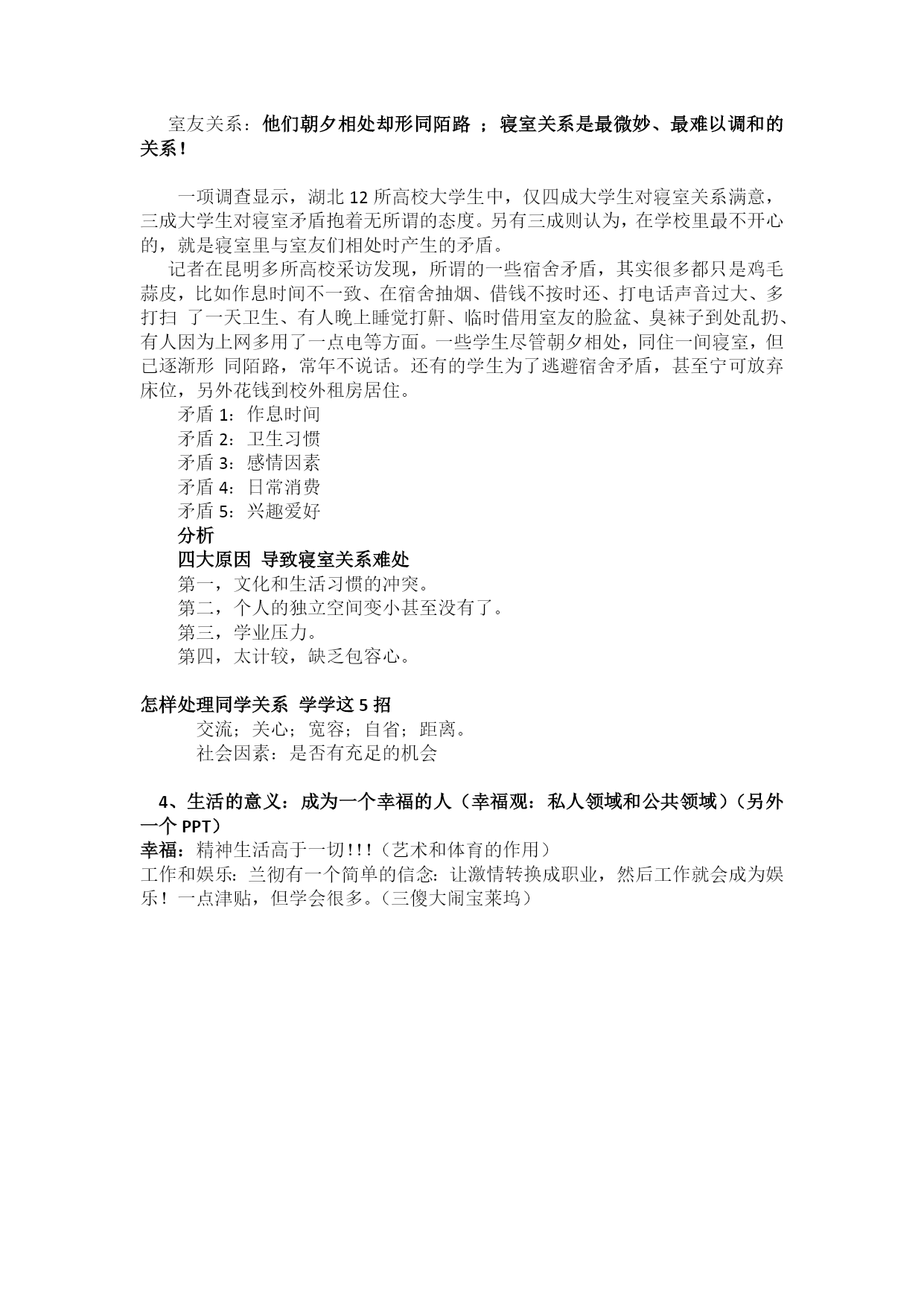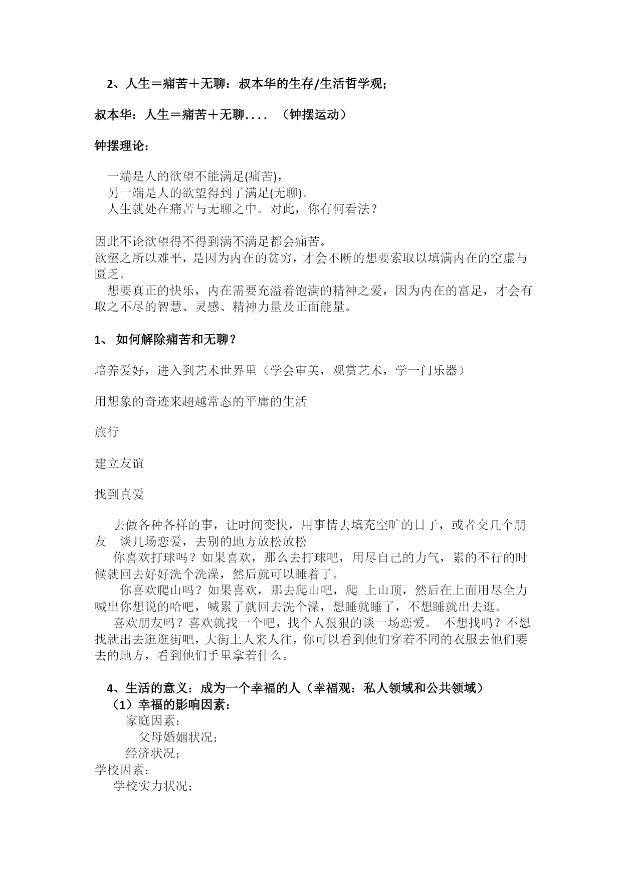 第五讲:生活(一)总目录:Life‘sjourney(图片PPT)二、生活态度:1、乐观VS悲观(optimismvs.pessimism)2、人生=痛苦+无聊:叔本华的生存/生活哲学观;3、如何解除痛苦和无聊?4、生活的意义:成为一个幸福的人(幸福观:私人领域和公共领域)一、Life‘sjourney(图片PPT)二、生活态度:1、乐观VS悲观(optimismvs.pessimism)YouAreWhatYouThinkAndifyouchangeyourmind---frompessimismtooptimism---youcanchangeyourlife1.Optimismcanhelpyoutobehappier,healthierandmoresuccessful.2.Pessimismleads,bycontrast,tohopelessness,sicknessandfailure,andislinkedtodepression,lonelinessandpainfulshyness.3.Theoptimistfeelsincontrolofhisownlife.Ifthingsaregoingbadly,heactsquickly,lookingforsolutions,forminganewplanofaction,andreachingoutforadvice.Thepessimistfeelslikefate’splayingandmovesslowly.Hedoesn’tseekadvice,sinceheassumesnothingcanbedone.4.Mostpeopleareamixofoptimismandpessimism,butareinclinedinonedirectionortheother.Pessimismisahardhabittobreak---butitcanbedone.So,ifyou’reapessimist,there’sreasonforoptimism.Youcanchange.Here’show,saysSteveHollon,apsychologistatVanderbiltUniversity:(1).Paycarefulattentiontoyourthoughtswhenbadthingshappen,Writedownthefirstthingthatcomestomind.(2).Nowtryanexperiment.Dosomethingthat’scontrarytoanynegativereactions.(3).Keeptrackofwhathappens.Wereyourfirstthoughtsrightorwrong?Positivethinkingleadstopositiveaction,andreaction.Whatyouexpectfromtheworld,theevidencesuggests,iswhatyou’relikelytoget.2、人生=痛苦+无聊:叔本华的生存/生活哲学观;叔本华:人生=痛苦+无聊....(钟摆运动)钟摆理论:一端是人的欲望不能满足(痛苦),另一端是人的欲望得到了满足(无聊)。人生就处在痛苦与无聊之中。对此,你有何看法?因此不论欲望得不得到满不满足都会痛苦。欲壑之所以难平,是因为内在的贫穷,才会不断的想要索取以填满内在的空虚与匮乏。想要真正的快乐,内在需要充溢着饱满的精神之爱,因为内在的富足,才会有取之不尽的智慧、灵感、精神力量及正面能量。如何解除痛苦和无聊?培养爱好,进入到艺术世界里(学会审美,观赏艺术,学一门乐器)用想象的奇迹来超越常态的平庸的生活旅行建立友谊找到真爱去做各种各样的事,让时间变快,用事情去填充空旷的日子,或者交几个朋友谈几场恋爱,去别的地方放松放松你喜欢打球吗?如果喜欢,那么去打球吧,用尽自己的力气,累的不行的时候就回去好好洗个洗澡,然后就可以睡着了。你喜欢爬山吗?如果喜欢,那去爬山吧,爬上山顶,然后在上面用尽全力喊出你想说的哈吧,喊累了就回去洗个澡,想睡就睡了,不想睡就出去逛。喜欢朋友吗?喜欢就找一个吧,找个人狠狠的谈一场恋爱。不想找吗?不想找就出去逛逛街吧,大街上人来人往,你可以看到他们穿着不同的衣服去他们要去的地方,看到他们手里拿着什么。4、生活的意义:成为一个幸福的人(幸福观:私人领域和公共领域)(1)幸福的影响因素:家庭因素:父母婚姻状况;经济状况;学校因素:学校实力状况;室友关系:他们朝夕相处却形同陌路;寝室关系是最微妙、最难以调和的关系!一项调查显示