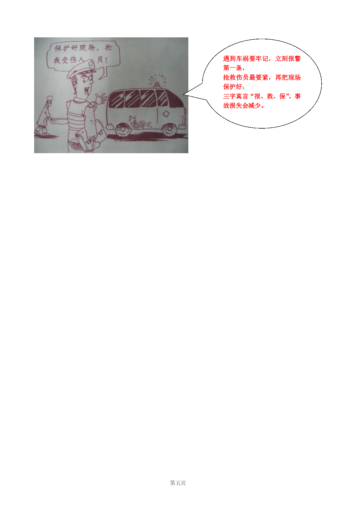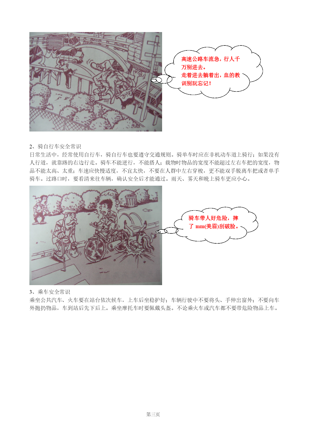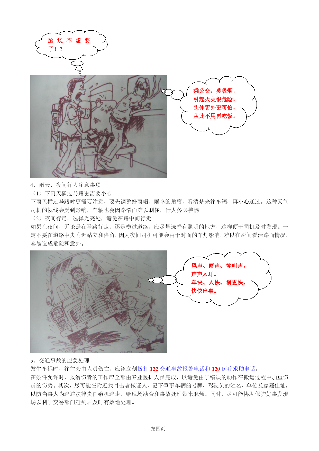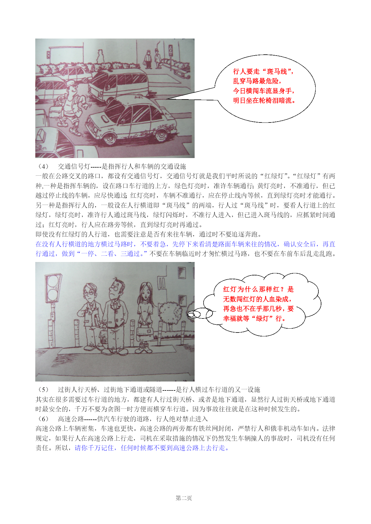 第PAGE五页道路交通安全常识在世界范围内,每年因意外事故死亡的人数中,交通事故的死亡人数一直是第一位的,交通事故已经成为和平环境中造成人员伤亡的头号杀手,在深圳,目前平均每天就有3人死于交通事故。一、交通事故是造成人员伤亡的第一杀手也许你认为,我不开车,也很少坐车,这些事故离我很远,又这种想法的人不在少数,但是,事实证明,在大量的交通事故中,车祸中的伤亡者,并非都是汽车司机和乘客,路上的行人受到伤害的也不在少数。横穿公路,翻越公路中的隔离栏、隔离墩,闯红灯,不按规定行走,进入高速公路行走等等这些违章行为,使交通事故中造成人员伤亡的最主要原因。翻,翻,翻,翻栏杆多少人翻到鬼门关!只图少走几步路,人生一步就跨完!!二、交通安全基本常识1、常见的交通设施要做到安全出行,掌握一些交通安全常识,对于我们每一个人来说,是非常重要的。车行道------汽车行走的地方城市道路中,行人和汽车各行其道,也就是说,行人行走有人行道,汽车行驶有车行道,各走各的路。公路是供机动车行走的地方,由俗称为“马路”。公路中为了隔离不同方向行驶的车辆,一般都设置了隔离栏或隔离墩。行人不准在公路上玩耍、从事体育和游艺活动,也不准在公路上散步、做买卖,更不准扒车、追车、拦车,或用物品抛击车辆,因为这些行为都会妨碍交通,容易引发意外事故。人行道-----是人行走的地方人行道在公路两边,这是专门为行人和非机动车设置的。行人和自行车在公路上行走时要走人行道。如果没有人行道,那么,请记住靠路边行走,这样才安全。人行横道------是行人横过车行道的地方在车行道上,常可以看到一条条用白色横线标记出的“走廊”,这就是人行横道,又称为“斑马线”,它是专门供行人、自行车横过车行道的地方。行人要走“斑马线”,乱穿马路最危险,今日横闯车流显身手,明日坐在轮椅泪暗流。交通信号灯-----是指挥行人和车辆的交通设施一般在公路交叉的路口,都设有交通信号灯,交通信号灯就是我们平时所说的“红绿灯”。“红绿灯”有两种,一种是指挥车辆的,设在路口车行道的上方,绿色灯亮时,准许车辆通行;黄灯亮时,不准通行,但已越过停止线的车辆,应尽快通过;红灯亮时,车辆不准通行,应在停止线内等候,直到绿灯亮时才能通行。另一种是指挥行人的,一般设在人行横道即“斑马线”的两端,行人过“斑马线”时,要看人行道上的红绿灯,绿灯亮时,准许行人通过斑马线,绿灯闪烁时,不准行人进入,但已进入斑马线的,应抓紧时间通过;红灯亮时,行人应在路旁等候,直到绿灯亮时再通过。即使没有红绿灯的人行道,也需要注意是否有来往车辆,通过时不要追逐奔跑。在没有人行横道的地方横过马路时,不要着急,先停下来看清楚路面车辆来往的情况,确认安全后,再直行通过,做到“一停、二看、三通过。”不要在车辆临近时才匆忙横过马路,也不要在车前车后乱走乱跑。红灯为什么那样红?是无数闯红灯的人血染成,再急也不在乎那几秒,要幸福就等“绿灯”行。过街人行天桥、过街地下通道或隧道------是行人横过车行道的又一设施其实在很多需要过车行道的地方,都建有人行过街天桥、或者是地下通道,显然行人过街天桥或地下通道时最安全的,千万不要为贪图一时方便而横穿车行道。因为事故往往就是在这种时候发生的。高速公路------供汽车行驶的道路,行人绝对禁止进入高速公路上车辆密集,车速也更快。高速公路的两旁都有铁丝网封闭,严禁行人和俄非机动车如内。法律规定,如果行人在高速公路上行走,司机在采取措施的情况下仍然发生车辆撞人的事故时,司机没有任何责任。所以,请你千万记住,任何时候都不要到高速公路上去行走。高速公路车流急,行人千万别进去。走着进去躺着出,血的教训别玩忘记!2、骑自行车安全常识日常生活中,经常使用自行车,骑自行车也要遵守交通规则。骑单车时应在非机动车道上骑行;如果没有人行道,就靠路的右边行走。骑车不能逆行,不能搭人;载物时物品的宽度不能超过左右车把的宽度,物品不能太高、太重;车速应快慢适度,不宜太快,不要在人群中左右穿梭,更不能双手脱离车把或者单手骑车。过路口时,要看清来往车辆,确认安全后才能通过。雨天、雾天和晚上骑车更应小心。骑车带人好危险,摔了mm(美眉)刮破脸。3、乘车安全常识乘坐公共汽车、火车要在站台依次候车,上车后坐稳护好;车辆行驶中不要将头、手伸出窗外;不要向车外抛扔物品,车到站后先下后上。乘坐摩托车时要佩戴头盔。不论乘火车或汽车都不要带危险物品上车。脑袋不想要了!?乘公交,莫吸烟,引起火灾很危险,头伸窗外更可怕,从此不用再吃饭。4、雨天、夜间行人注意事项(1)下雨天横过马路更需要小心下雨天横过马路时更需要注意,要先调整好雨帽、雨伞的角度,