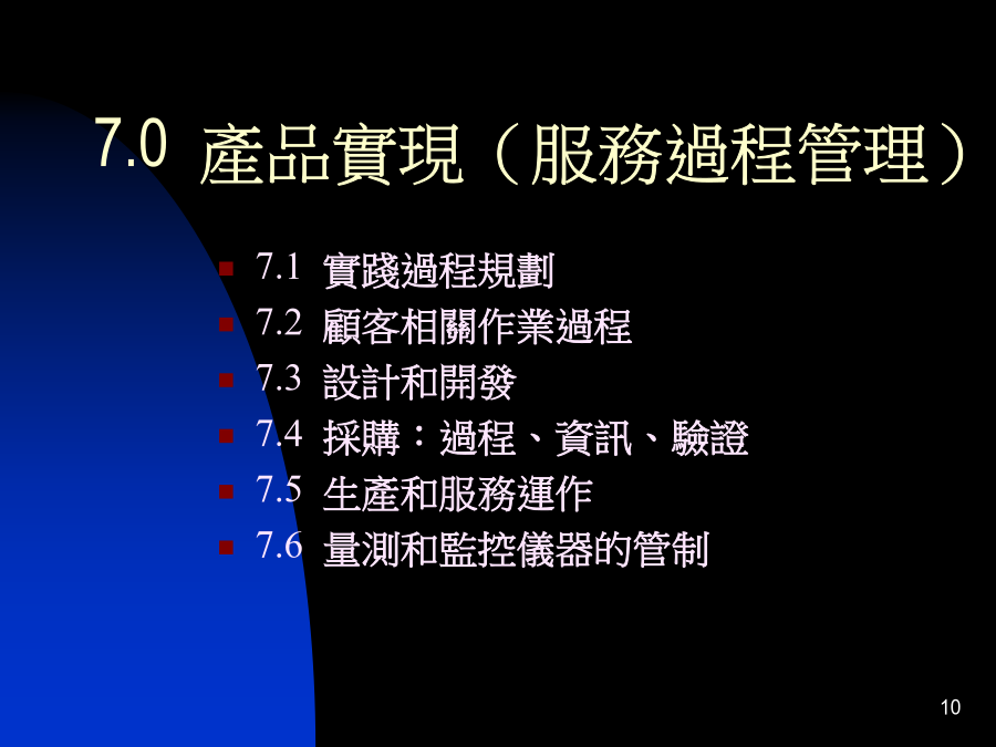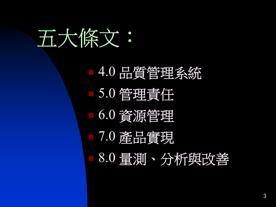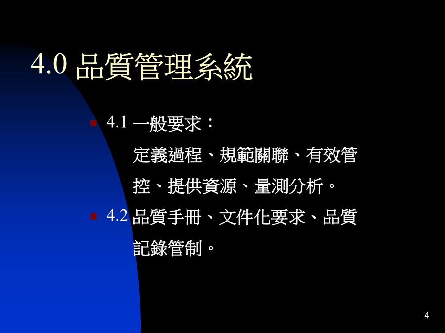 ISO9001:2000ISO9001:2000新標準新衝擊:五大條文:4.0品質管理系統5.0管理責任6.0資源管理7資源+管理=成效人員+訓練=能力人員+文件=紀錄※重要的是要有效8.0量測、分析和改善7.0產品實現(服務過程管理)品質政策經營管理八大理念*第二條:領導統御*第三條:全員參與*第四條:過程導向*第五條:系統管理*第六條:持續改善*第七條:事實決策*第八條:互利式供應商關係即席反应