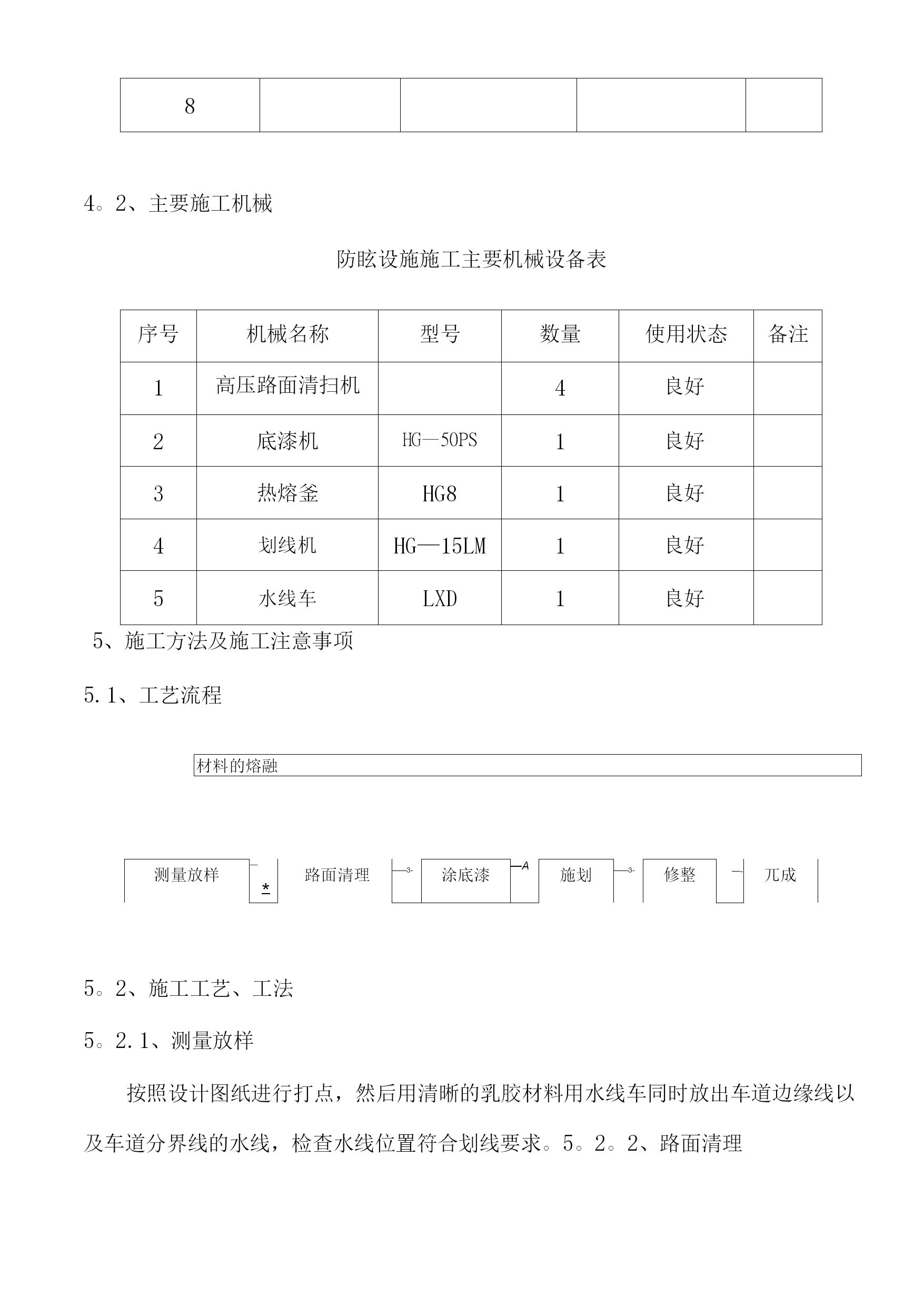 交通标线(首件)施工方案1、编制依据(1)《公路工程质量检验评定标准》JTJF80/124;(2)《新疆维吾尔自治区公路建设标准化管理手册》;(3)《公路交通安全设施施工技术规范》JTGF71-26;(4)设计图纸、施工图设计说明书。2、工程概况3、主要材料要求本项目设计选用热熔型标线材料,主线上配合路面标线设置反光平面路标,该路标与标线配合,大大提高了司机在夜间对道路标线的视认程度,彩色防滑标线采用高防滑型。4、施工准备4.1、施工人员防眩设施施工管理人员配置表序号姓名专业职务备注123456784。2、主要施工机械防眩设施施工主要机械设备表序号机械名称型号数量使用状态备注1高压路面清扫机4良好2底漆机HG—50PS1良好3热熔釜HG81良好4划线机HG—15LM1良好5水线车LXD1良好5、施工方法及施工注意事项5.1、工艺流程材料的熔融测量放样―*路面清理——3-涂底漆—A施划——3-修整—-兀成5。2、施工工艺、工法5。2.1、测量放样按照设计图纸进行打点,然后用清晰的乳胶材料用水线车同时放出车道边缘线以及车道分界线的水线,检查水线位置符合划线要求。5。2。2、路面清理人工或配合清扫机对路面清扫后,彻底清除路面标线部位表面的灰尘、泥沙、水分及其它有害物质,保持清洁和干燥。5.2.3、涂底漆用底漆机在水线需划线的一侧喷涂相对应的底漆,使标线与路面更好的粘牢(干净的新沥青路面可以不喷涂底漆油)。在车道分界线及断开处粘贴不易燃烧的胶带纸以便使其端头平直,尺寸标准。5.2.4、标线的施划把热熔材料装入热熔釜中均匀加热到180。~220。之间,使其符合厂家要求同时充分搅拌。根据涂料有关性能,严格控制温度,搅拌均匀。熔化的热熔材料(待底漆表面不粘时)放入划线车桶内,并在撒布器内加足玻璃珠.调整好施划厚度和撒布玻璃珠量(按设计要求,一般0.33kg/m2),正式施划.(4)标线的端线与边线应垂直,误差不大于土5°,其它特殊标线,其角度与设计值不能大于±3°.车行道边缘线、车行道分界线、警告线标线涂层厚度为2±0。2mm;导向箭头、人行预告标示、人行横道线、停止线、出入线涂层厚度为3mm;减速振动标线涂层厚度为5mm;表面玻璃微珠应分布均匀。5。2.5、修整在施工过程中,边施划边清理,做到无抛、洒、滴、漏,无污染物,机械设备无漏油漏水现象,同时修剔不合规格的标线。5。3、突起路标的施工(1)根据设计文件的要求确定突起路标的设置位置。(2)将路面和突起路标底部清扫干净保持干燥。(3)涂刷粘结剂.(4)突起路标就位,并在其顶部施加压力,排除空气。(5)突起路标产品要求符合交通行业标准“突起路标”(JT/T390-1999)的规定。5。4、注意事项(1)标线材料应符合《路面标线涂料》(JT/T280-24)的规定。(2)路面标线喷涂前应仔细清洁路面,路面表面干燥,无起灰现象。(3)路面标线的颜色、形状和位置应符和设计和《道路交通标志和标线》的规定。5。5、质量检验5。5.1、外观鉴定(1)标线施工污染路面应及时清洗,每处污染面积不能超过0。1m2。(2)标线线形应流畅,与道路线形丰协调,曲线圆滑,不允许出现折线。(3)反光标线玻璃珠散布应均匀,附着牢固,反光均匀.(4)标线表面不应出现网状缝纹、断裂裂缝和起泡现象.5。5。2、实测项目路面标线实测项目项次检查项目规定值或允许偏差检查方法和频率权值1标线线段长度(mm)60±50钢卷尺:抽检10%140±4030±3010〜20±202标线宽度(mm)4~450+15,0钢尺:抽检10%1150〜2+8,01+5,03标线厚度(mm)常温型(0.12〜0.2)—0。03,+0.10油膜温度计:干膜用水平尺、塞尺或用卡尺,抽检10%2加热型(0。2~0。4)—0.05,+0.15热熔型(1.0〜4。5)-0.10,+0。504标线横向偏位(mm)±30钢卷尺:抽检10%15标线纵向间距(mm)90±45钢卷尺:抽检10%160±3040±2030±156标线剥落面积检查总面积的0~3%4倍放大镜:目测17反光标线逆反射系数(cd.1x-1.m-2)白色标线》150黄色标线》1反光标线逆反射系数测量仪:抽检10%26、质量保证体系及措施6。1、质量保证措施加强对现场管理人员的技术交底,让现场技术员掌握交通标线施工的工艺流程以及质量控制要点。熟悉图纸,明确设计意图。标线材料应符合《路面标线涂料》(JT/T280-24)的规定。路面标线喷涂前应仔细清洁路面,路面表面干燥,无起灰现象.6.2、质量保证体系7、安全、环保