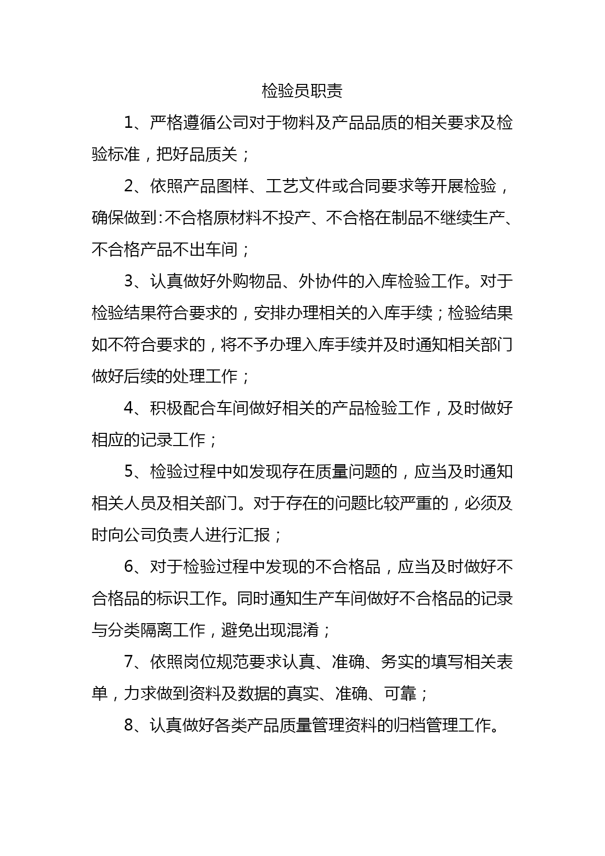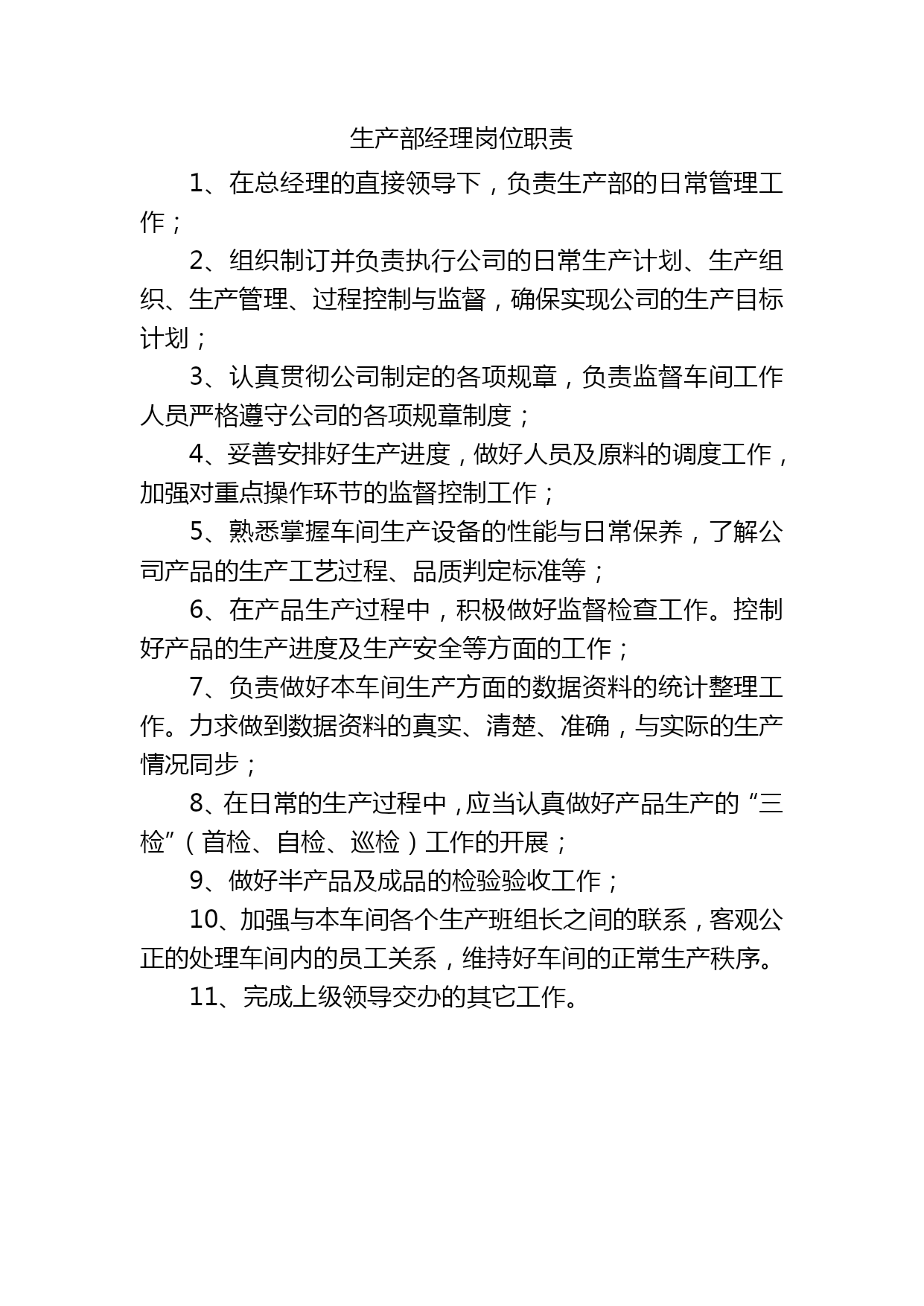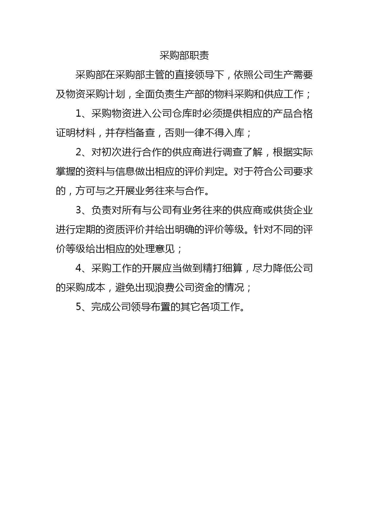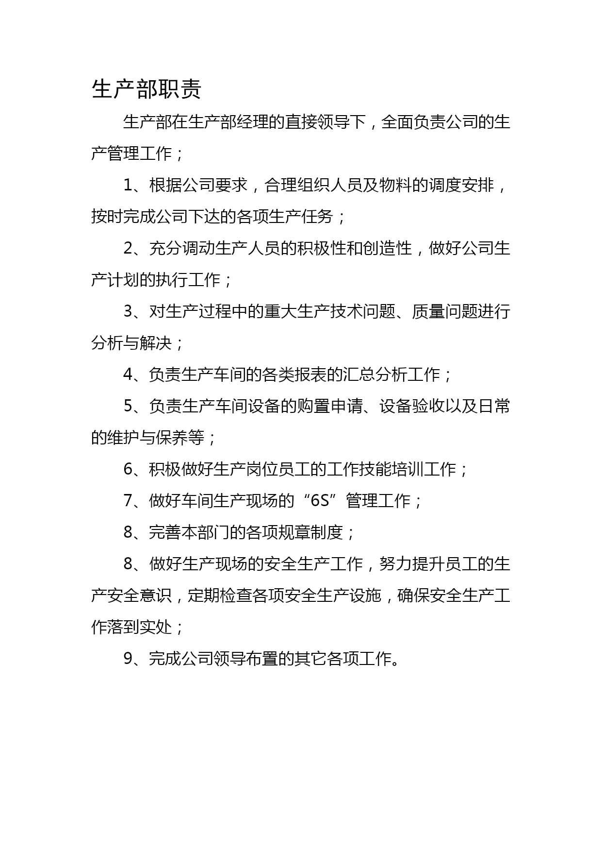 生产制造公司工厂各部门职责及岗位职责汇编(完整版)资料(可以直接使用,可编辑优秀版资料,欢迎下载)生产部职责生产部在生产部经理的直接领导下,全面负责公司的生产管理工作;1、根据公司要求,合理组织人员及物料的调度安排,按时完成公司下达的各项生产任务;2、充分调动生产人员的积极性和创造性,做好公司生产计划的执行工作;3、对生产过程中的重大生产技术问题、质量问题进行分析与解决;4、负责生产车间的各类报表的汇总分析工作;5、负责生产车间设备的购置申请、设备验收以及日常的维护与保养等;6、积极做好生产岗位员工的工作技能培训工作;7、做好车间生产现场的“6S”管理工作;8、完善本部门的各项规章制度;8、做好生产现场的安全生产工作,努力提升员工的生产安全意识,定期检查各项安全生产设施,确保安全生产工作落到实处;9、完成公司领导布置的其它各项工作。生产部经理岗位职责1、在总经理的直接领导下,负责生产部的日常管理工作;2、组织制订并负责执行公司的日常生产计划、生产组织、生产管理、过程控制与监督,确保实现公司的生产目标计划;3、认真贯彻公司制定的各项规章,负责监督车间工作人员严格遵守公司的各项规章制度;4、妥善安排好生产进度,做好人员及原料的调度工作,加强对重点操作环节的监督控制工作;5、熟悉掌握车间生产设备的性能与日常保养,了解公司产品的生产工艺过程、品质判定标准等;6、在产品生产过程中,积极做好监督检查工作。控制好产品的生产进度及生产安全等方面的工作;7、负责做好本车间生产方面的数据资料的统计整理工作。力求做到数据资料的真实、清楚、准确,与实际的生产情况同步;8、在日常的生产过程中,应当认真做好产品生产的“三检”(首检、自检、巡检)工作的开展;9、做好半产品及成品的检验验收工作;10、加强与本车间各个生产班组长之间的联系,客观公正的处理车间内的员工关系,维持好车间的正常生产秩序。11、完成上级领导交办的其它工作。生产班组长岗位职责1、在生产部经理的指挥领导下,认真做好本班组的日常管理工作;2、负责本班组的人员、物资、设备等的综合管理,确保生产计划顺利实现;3、熟悉产品的生产工艺流程和基本技术特点,具备一定的生产管理、质量管理、生产安全等方面的知识;4、依照车间下达的生产计划,合理调度安排本班组的各项生产活动;5、监督指导班组员工严格执行质量管理体系的相关规程和要求;6、发现生产过程中所存在的问题并及时实施恰当的处理措施。如果遇到自己无法妥善解决的问题时,应当及时向部门主管及时请示汇报;7、严格执行公司的生产安全管理制度,不定期的对生产现场进行安全检查,发现安全隐患应及时予以排除;8、指导本班组员工正确规范的使用生产设备,负责对相关设备进行日常的维护与保养工作;9、负责班组员工的日常考核及培训工作;10、监督指导班组员工做好日常的工作开展。检验员职责1、严格遵循公司对于物料及产品品质的相关要求及检验标准,把好品质关;2、依照产品图样、工艺文件或合同要求等开展检验,确保做到:不合格原材料不投产、不合格在制品不继续生产、不合格产品不出车间;3、认真做好外购物品、外协件的入库检验工作。对于检验结果符合要求的,安排办理相关的入库手续;检验结果如不符合要求的,将不予办理入库手续并及时通知相关部门做好后续的处理工作;4、积极配合车间做好相关的产品检验工作,及时做好相应的记录工作;5、检验过程中如发现存在质量问题的,应当及时通知相关人员及相关部门。对于存在的问题比较严重的,必须及时向公司负责人进行汇报;6、对于检验过程中发现的不合格品,应当及时做好不合格品的标识工作。同时通知生产车间做好不合格品的记录与分类隔离工作,避免出现混淆;7、依照岗位规范要求认真、准确、务实的填写相关表单,力求做到资料及数据的真实、准确、可靠;8、认真做好各类产品质量管理资料的归档管理工作。采购部职责采购部在采购部主管的直接领导下,依照公司生产需要及物资采购计划,全面负责生产部的物料采购和供应工作;1、采购物资进入公司仓库时必须提供相应的产品合格证明材料,并存档备查,否则一律不得入库;2、对初次进行合作的供应商进行调查了解,根据实际掌握的资料与信息做出相应的评价判定。对于符合公司要求的,方可与之开展业务往来与合作。3、负责对所有与公司有业务往来的供应商或供货企业进行定期的资质评价并给出明确的评价等级。针对不同的评价等级给出相应的处理意见;4、采购工作的开展应当做到精打细算,尽力降低公司的采购成本,避免出现浪费公司资金的情况;5、完成公司领导布置的其它各项工作。采购部主管岗位职责1、在总经理的直接领导下,负责采购部的日常管理工作;2、认真做好公司所需的物资材料