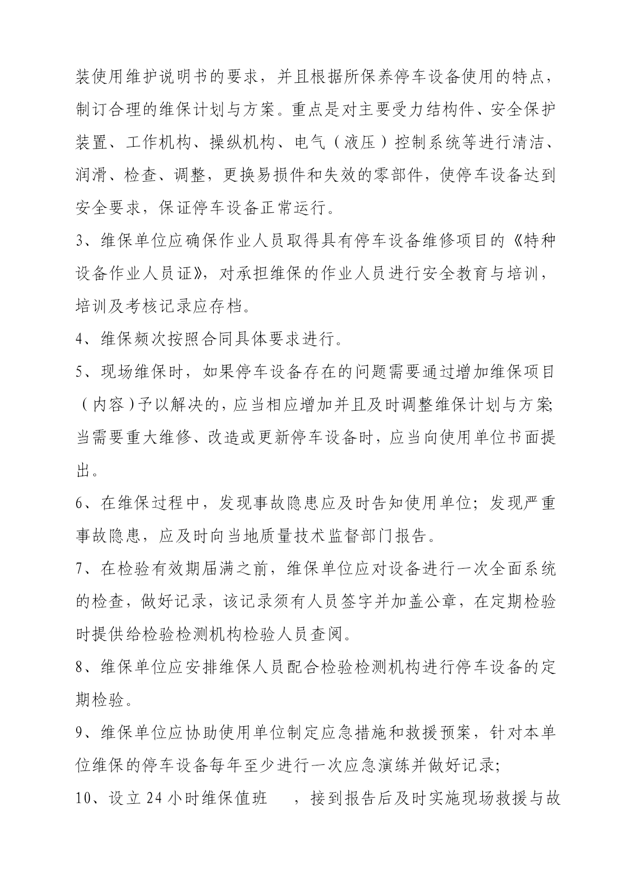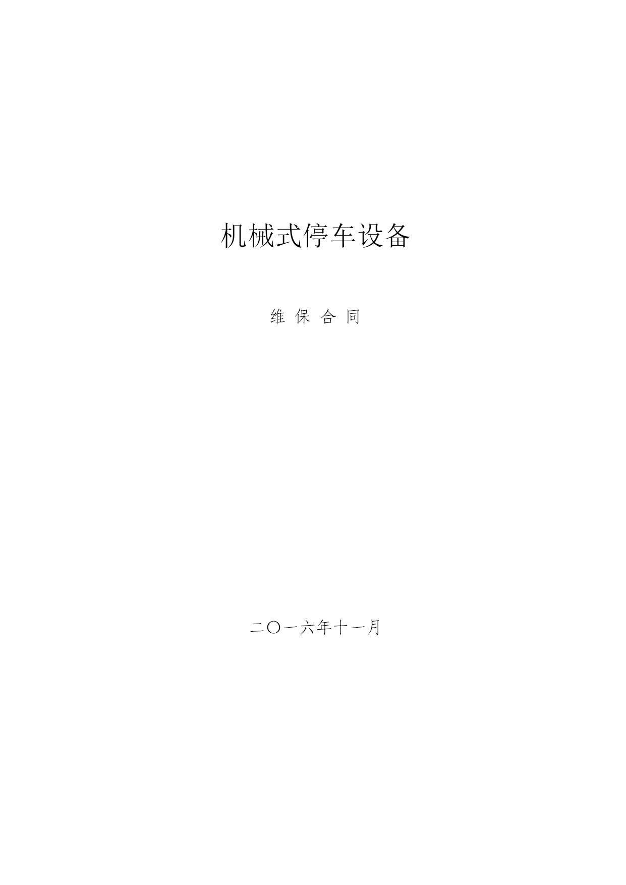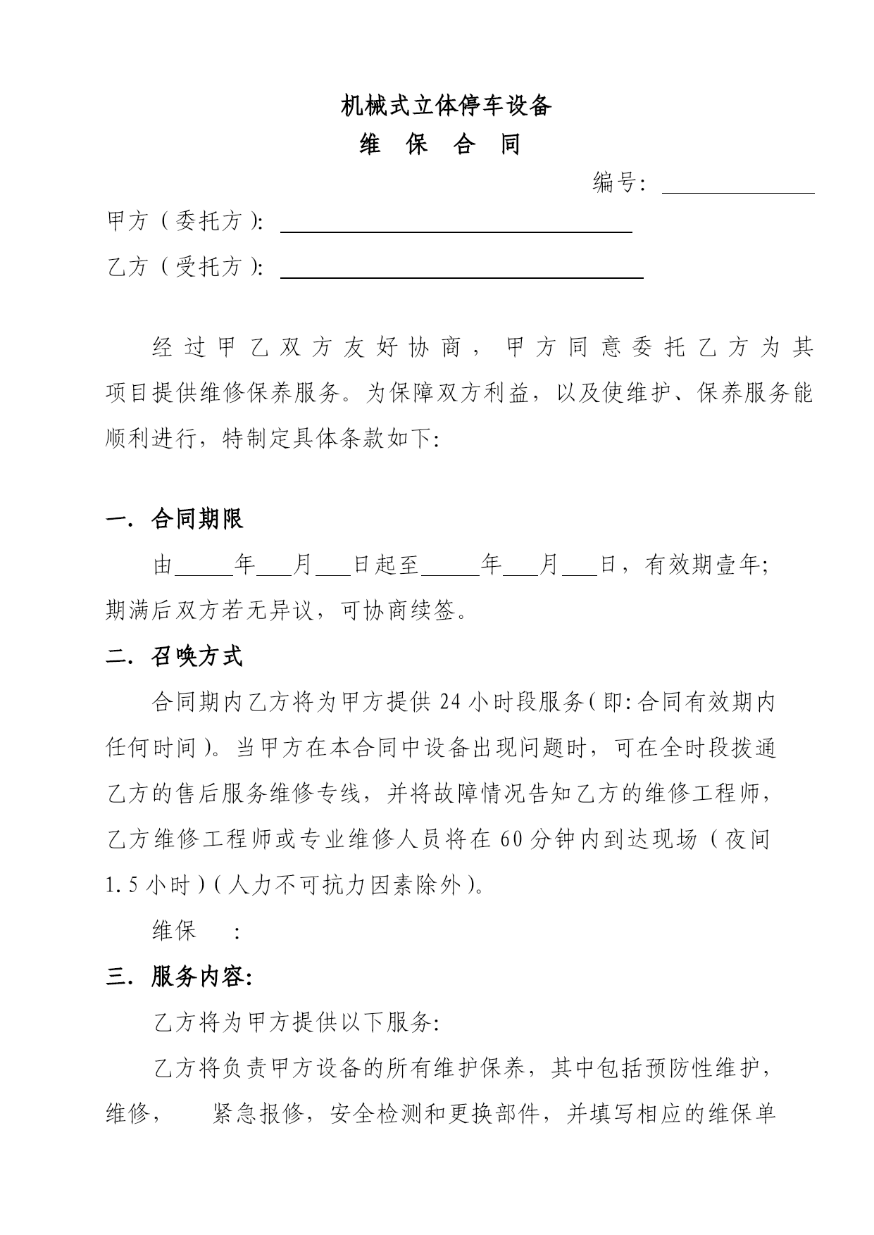 机械停车维保合同(完整版)资料(可以直接使用,可编辑优秀版资料,欢迎下载)机械式停车设备维保合同二〇一六年十一月机械式立体停车设备维保合同编号:甲方(委托方):乙方(受托方):经过甲乙双方友好协商,甲方同意委托乙方为其项目提供维修保养服务。为保障双方利益,以及使维护、保养服务能顺利进行,特制定具体条款如下:一.合同期限由年月日起至年月日,有效期壹年;期满后双方若无异议,可协商续签。二.召唤方式合同期内乙方将为甲方提供24小时段服务(即:合同有效期内任何时间)。当甲方在本合同中设备出现问题时,可在全时段拨通乙方的售后服务维修专线,并将故障情况告知乙方的维修工程师,乙方维修工程师或专业维修人员将在60分钟内到达现场(夜间1.5小时)(人力不可抗力因素除外)。维保:三.服务内容:乙方将为甲方提供以下服务:乙方将负责甲方设备的所有维护保养,其中包括预防性维护,维修,紧急报修,安全检测和更换部件,并填写相应的维保单(见附件)。具体如下:1、定期保养(每周一次):对设备使用过程中进行的常规维护工作。(1)设备内各类运行件的检查、清洁、加油。(2)检查止限开关、极限开关、各电机抱闸和导轮等重要装置的动作情况。(3)检查精密机器因污染或其它原因引起触点接触不良、腐蚀而造成损坏及旋转部位的异常磨损。(4)检查继电器等电器件及机械部分的动作情况。(5)各类辅件、易损件的检查。(6)采用各种计测仪器定期检测,并按照设计值和规定数据进行调整。2、定期检查:例行维保时,同时检测设备运行的整体性能,做好事前维保,减少事后维修。3、故障修理:对破损及性能下降零部件,乙方应及时向甲方提出修理或更换措施。并由乙方专业技术人员对零部件更换和修理。4、乙方保证提供可靠的备品备件。5、乙方在每次完成定期检查及保养、日常报修之后,应出具相应保养、报修记录,并由甲方签字认可。四.对维保单位的要求1、维保单位应依法取得制造或维修许可资质方可从事相关活动,不得无证(含超范围)进行维保,且维保不允许任何形式的分包与转包。2、维保单位应当依据本标准各附件及有关安全技术规范、产品安装使用维护说明书的要求,并且根据所保养停车设备使用的特点,制订合理的维保计划与方案。重点是对主要受力结构件、安全保护装置、工作机构、操纵机构、电气(液压)控制系统等进行清洁、润滑、检查、调整,更换易损件和失效的零部件,使停车设备达到安全要求,保证停车设备正常运行。3、维保单位应确保作业人员取得具有停车设备维修项目的《特种设备作业人员证》,对承担维保的作业人员进行安全教育与培训,培训及考核记录应存档。4、维保频次按照合同具体要求进行。5、现场维保时,如果停车设备存在的问题需要通过增加维保项目(内容)予以解决的,应当相应增加并且及时调整维保计划与方案;当需要重大维修、改造或更新停车设备时,应当向使用单位书面提出。6、在维保过程中,发现事故隐患应及时告知使用单位;发现严重事故隐患,应及时向当地质量技术监督部门报告。7、在检验有效期届满之前,维保单位应对设备进行一次全面系统的检查,做好记录,该记录须有人员签字并加盖公章,在定期检验时提供给检验检测机构检验人员查阅。8、维保单位应安排维保人员配合检验检测机构进行停车设备的定期检验。9、维保单位应协助使用单位制定应急措施和救援预案,针对本单位维保的停车设备每年至少进行一次应急演练并做好记录;10、设立24小时维保值班,接到报告后及时实施现场救援与故障排除。11、维保单位应建立停车设备维保记录,并归入技术档案。记录应至少包括以下内容:a)设备基本情况和技术参数,包括整机制造、安装、改造、重大维修单位的名称,设备品种(型式),产品编号,设备代码,型号或改造后的型号等;b)使用单位名称、自编号、使用地点;c)维保单位名称、维保日期、维保人员(签字);d)维保项目内容;e)运行故障及排除记录。12、维保记录应当经使用单位安全管理人员签字确认。13、维保单位应对停车设备的维保质量进行不定期检查并且进行记录。五.日常保养安全技术要求保养频次保养人员负责对停车设备定期进行检查、实施保养工作,可分为:周保养:每周应对停车设备使用环境、金属结构、传动装置、电气设备、安全防护装置等,进行检查、清洁、润滑、调整。尤其应对安全装置的工作状况予以检查,发现问题及时处理。月保养:每月应对停车设备各传动部件、电气控制系统和安全防护装置的工作状况进行检查、清洁、润滑和调整。季度保养:每季度应对停车设备的主要受力构件及其连接、安全防护装置、设备外观与安全标识、警示等,进行检查、保养,必要时应对电气控制系统进行功能测试。年度保养:每年应对停车设备进行一次全面、