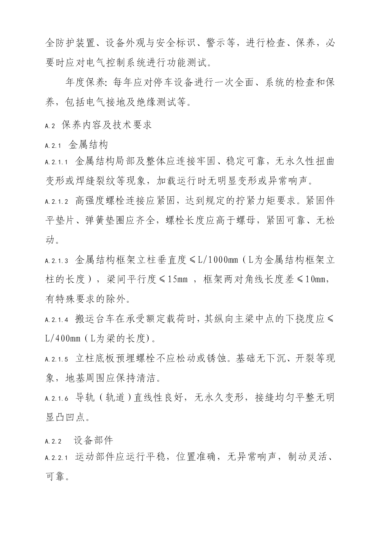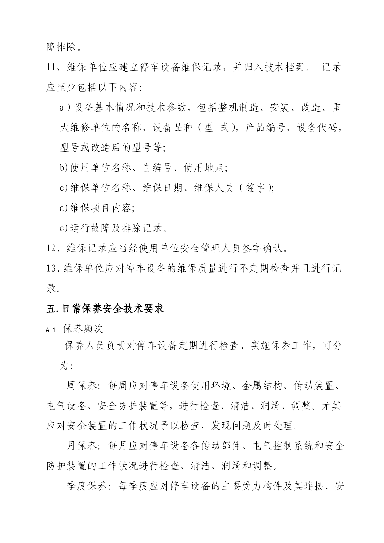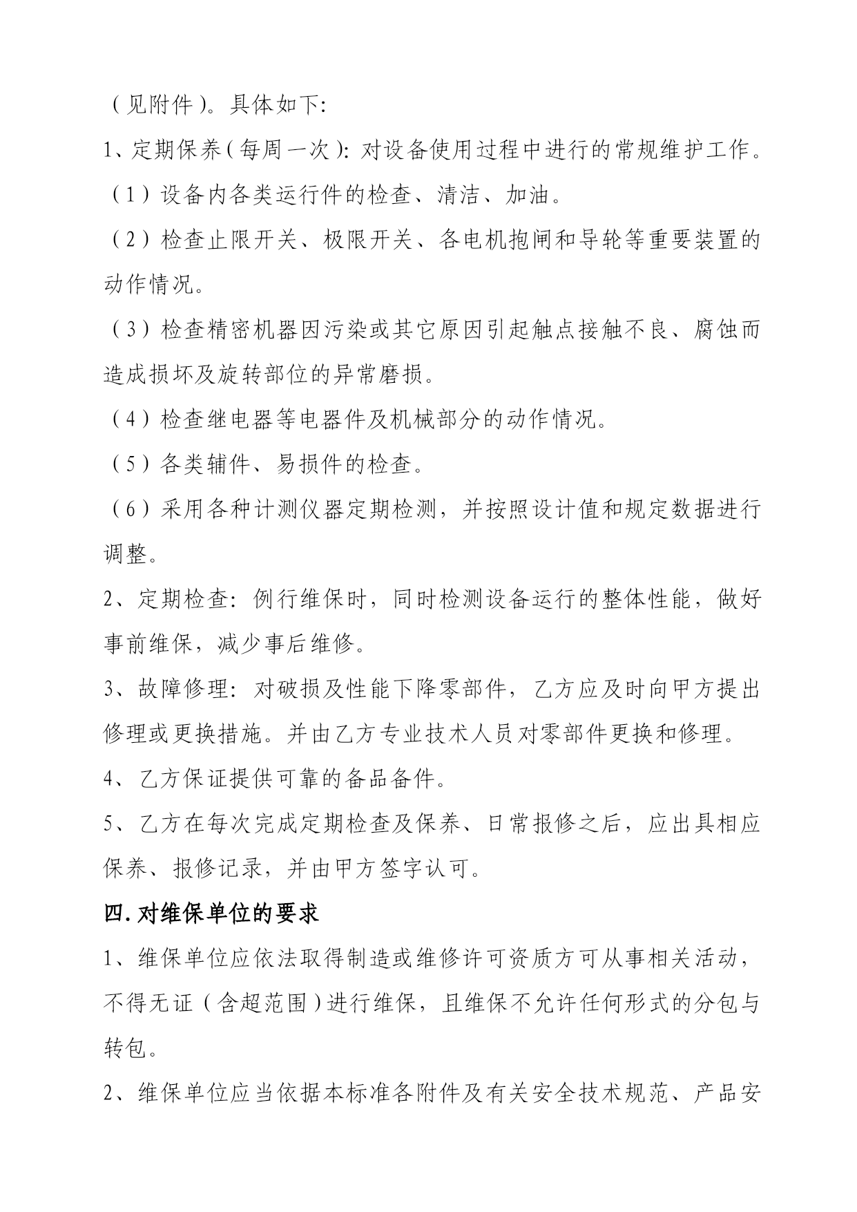 机械停车维保合同(完整版)资料(可以直接使用,可编辑优秀版资料,欢迎下载)机械式停车设备维保合同二〇一六年十一月机械式立体停车设备维保合同编号:甲方(委托方):乙方(受托方):经过甲乙双方友好协商,甲方同意委托乙方为其项目提供维修保养服务。为保障双方利益,以及使维护、保养服务能顺利进行,特制定具体条款如下:一.合同期限由年月日起至年月日,有效期壹年;期满后双方若无异议,可协商续签。二.召唤方式合同期内乙方将为甲方提供24小时段服务(即:合同有效期内任何时间)。当甲方在本合同中设备出现问题时,可在全时段拨通乙方的售后服务维修专线,并将故障情况告知乙方的维修工程师,乙方维修工程师或专业维修人员将在60分钟内到达现场(夜间1.5小时)(人力不可抗力因素除外)。维保:三.服务内容:乙方将为甲方提供以下服务:乙方将负责甲方设备的所有维护保养,其中包括预防性维护,维修,紧急报修,安全检测和更换部件,并填写相应的维保单(见附件)。具体如下:1、定期保养(每周一次):对设备使用过程中进行的常规维护工作。(1)设备内各类运行件的检查、清洁、加油。(2)检查止限开关、极限开关、各电机抱闸和导轮等重要装置的动作情况。(3)检查精密机器因污染或其它原因引起触点接触不良、腐蚀而造成损坏及旋转部位的异常磨损。(4)检查继电器等电器件及机械部分的动作情况。(5)各类辅件、易损件的检查。(6)采用各种计测仪器定期检测,并按照设计值和规定数据进行调整。2、定期检查:例行维保时,同时检测设备运行的整体性能,做好事前维保,减少事后维修。3、故障修理:对破损及性能下降零部件,乙方应及时向甲方提出修理或更换措施。并由乙方专业技术人员对零部件更换和修理。4、乙方保证提供可靠的备品备件。5、乙方在每次完成定期检查及保养、日常报修之后,应出具相应保养、报修记录,并由甲方签字认可。四.对维保单位的要求1、维保单位应依法取得制造或维修许可资质方可从事相关活动,不得无证(含超范围)进行维保,且维保不允许任何形式的分包与转包。2、维保单位应当依据本标准各附件及有关安全技术规范、产品安装使用维护说明书的要求,并且根据所保养停车设备使用的特点,制订合理的维保计划与方案。重点是对主要受力结构件、安全保护装置、工作机构、操纵机构、电气(液压)控制系统等进行清洁、润滑、检查、调整,更换易损件和失效的零部件,使停车设备达到安全要求,保证停车设备正常运行。3、维保单位应确保作业人员取得具有停车设备维修项目的《特种设备作业人员证》,对承担维保的作业人员进行安全教育与培训,培训及考核记录应存档。4、维保频次按照合同具体要求进行。5、现场维保时,如果停车设备存在的问题需要通过增加维保项目(内容)予以解决的,应当相应增加并且及时调整维保计划与方案;当需要重大维修、改造或更新停车设备时,应当向使用单位书面提出。6、在维保过程中,发现事故隐患应及时告知使用单位;发现严重事故隐患,应及时向当地质量技术监督部门报告。7、在检验有效期届满之前,维保单位应对设备进行一次全面系统的检查,做好记录,该记录须有人员签字并加盖公章,在定期检验时提供给检验检测机构检验人员查阅。8、维保单位应安排维保人员配合检验检测机构进行停车设备的定期检验。9、维保单位应协助使用单位制定应急措施和救援预案,针对本单位维保的停车设备每年至少进行一次应急演练并做好记录;10、设立24小时维保值班,接到报告后及时实施现场救援与故障排除。11、维保单位应建立停车设备维保记录,并归入技术档案。记录应至少包括以下内容:a)设备基本情况和技术参数,包括整机制造、安装、改造、重大维修单位的名称,设备品种(型式),产品编号,设备代码,型号或改造后的型号等;b)使用单位名称、自编号、使用地点;c)维保单位名称、维保日期、维保人员(签字);d)维保项目内容;e)运行故障及排除记录。12、维保记录应当经使用单位安全管理人员签字确认。13、维保单位应对停车设备的维保质量进行不定期检查并且进行记录。五.日常保养安全技术要求保养频次保养人员负责对停车设备定期进行检查、实施保养工作,可分为:周保养:每周应对停车设备使用环境、金属结构、传动装置、电气设备、安全防护装置等,进行检查、清洁、润滑、调整。尤其应对安全装置的工作状况予以检查,发现问题及时处理。月保养:每月应对停车设备各传动部件、电气控制系统和安全防护装置的工作状况进行检查、清洁、润滑和调整。季度保养:每季度应对停车设备的主要受力构件及其连接、安全防护装置、设备外观与安全标识、警示等,进行检查、保养,必要时应对电气控制系统进行功能测试。年度保养:每年应对停车设备进行一次全面、