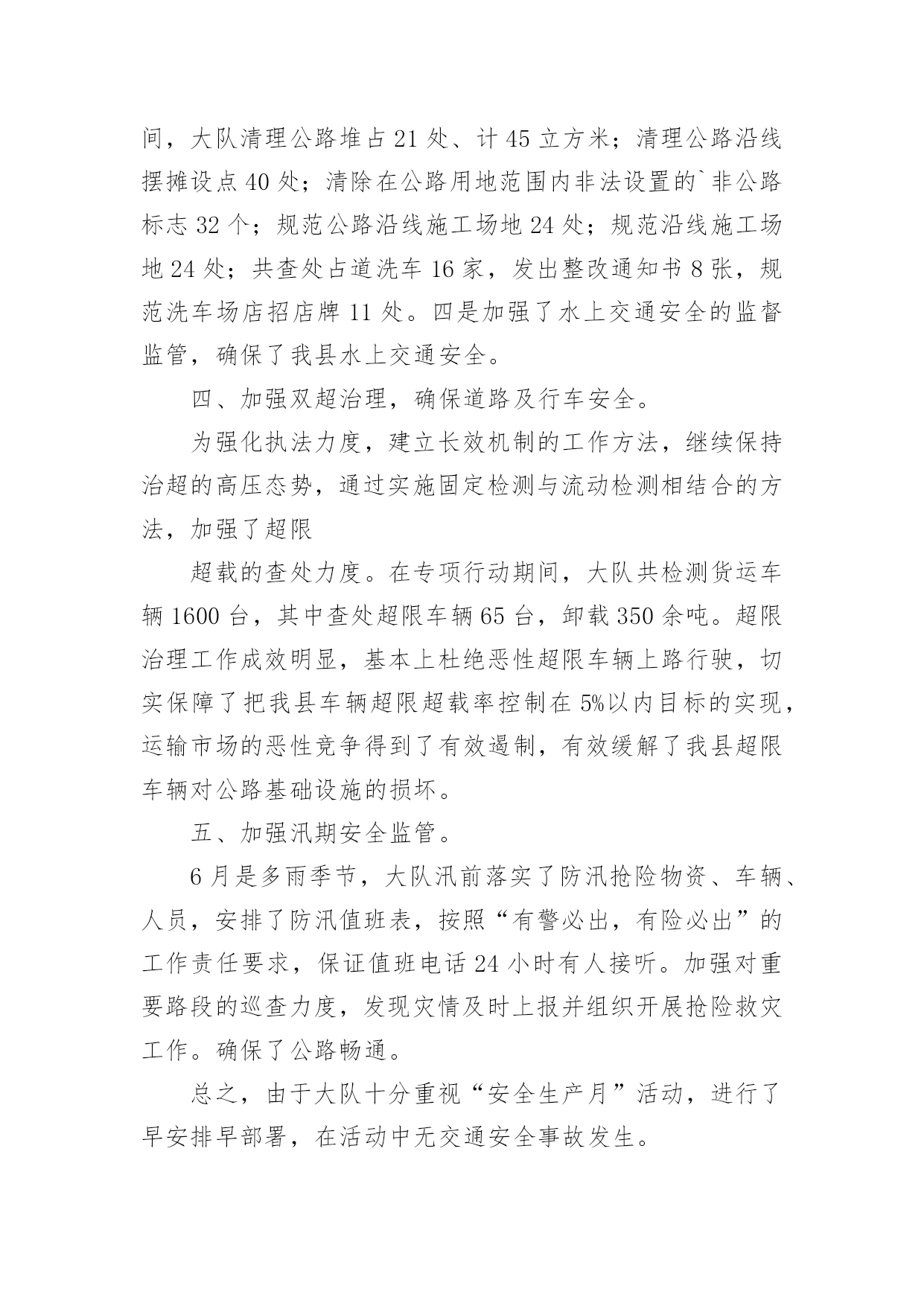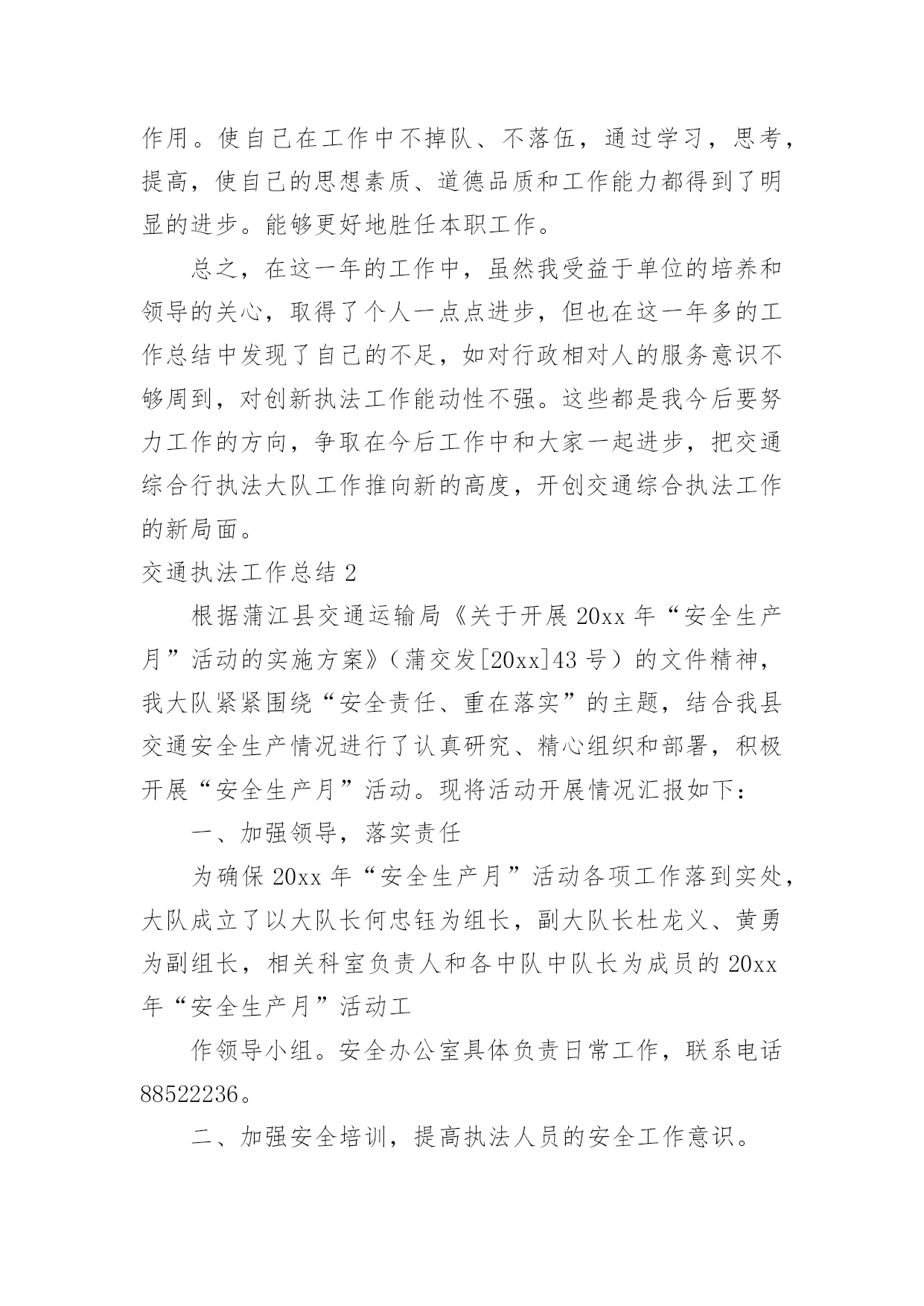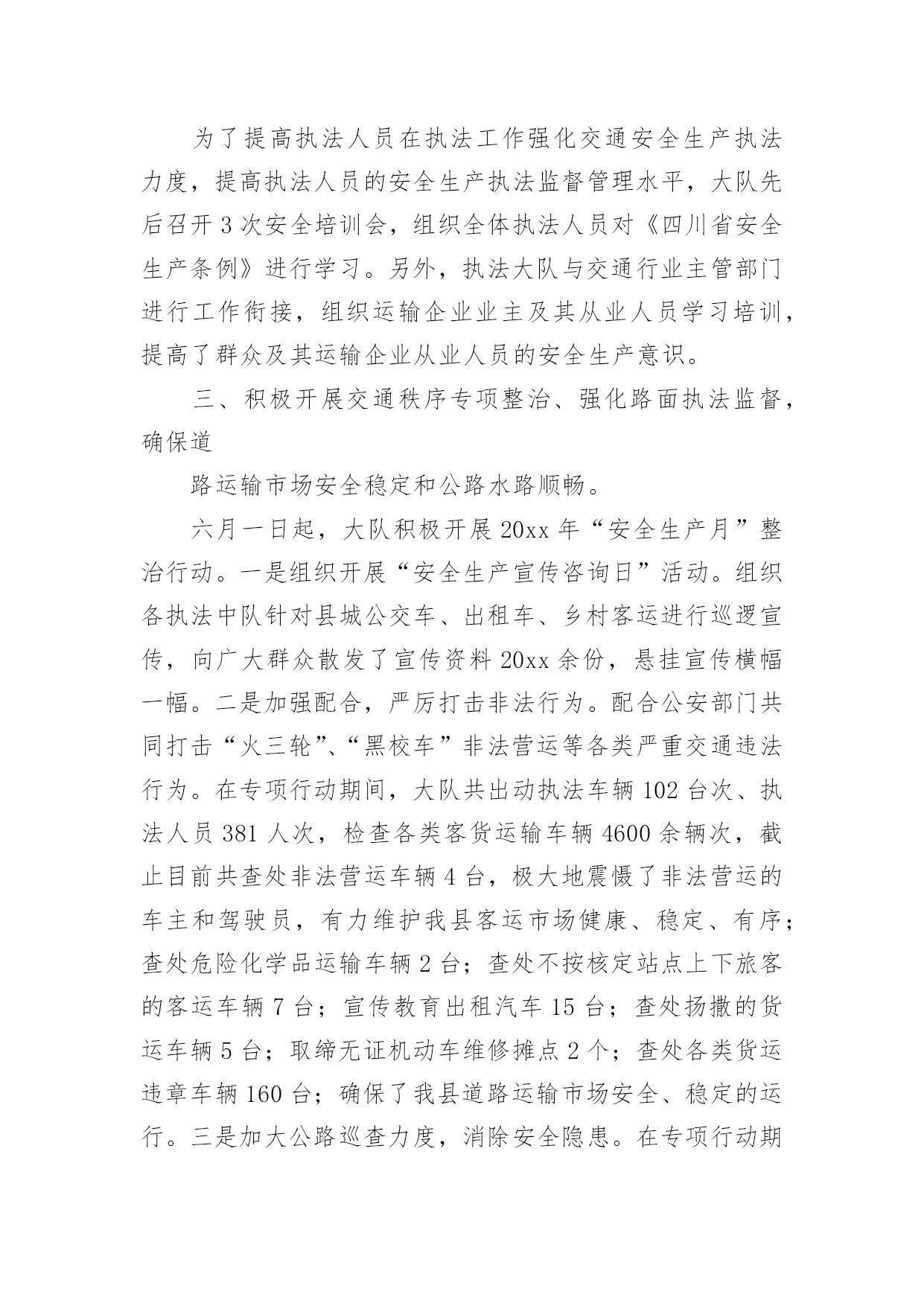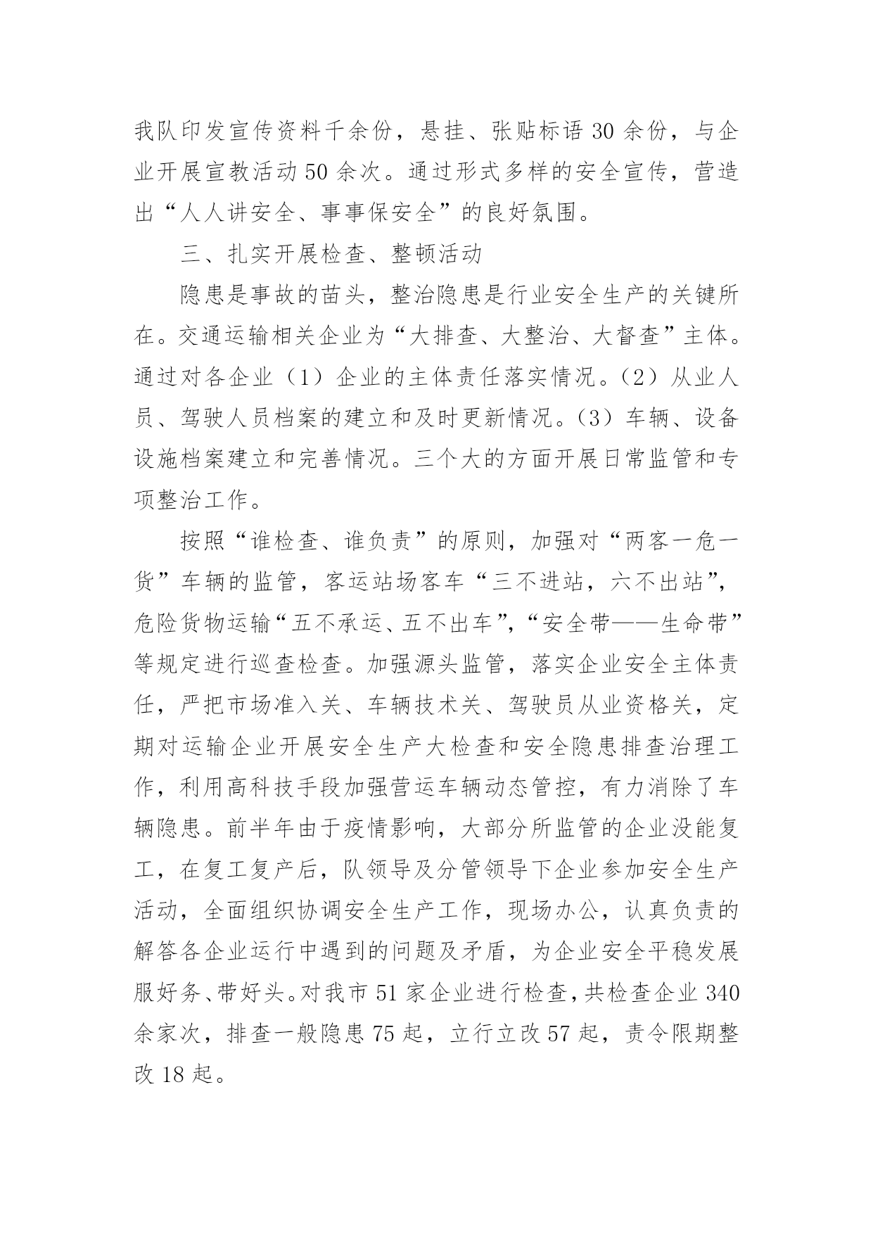 交通执法工作总结交通执法工作总结15篇总结是对某一特定时间段内的学习和工作生活等表现情况加以回顾和分析的一种书面材料,它可以帮助我们总结以往思想,发扬成绩,让我们抽出时间写写总结吧。总结怎么写才不会流于形式呢?以下是小编整理的交通执法工作总结,仅供参考,欢迎大家阅读。交通执法工作总结1我是xx,xx县交通运输局综合执法大队一名普通的执法人员,xx年对我来说是学习的一年、收获的一年。在这一年的学习、工作中,虽然有苦有累,但是感觉到收获却是颇丰,首先是在局领导及同事们的共同努力下圆满的完成了各项工作任务并且学到了很多东西。虽然没有轰轰烈烈的战果,但也算经历了一段不平凡的考验和磨砺。其次在这一年的时间里在交通运输局局领导的要求和指导下,成功地使自己完成了工作角色的转变,即由原来单一的治超站执法工作向综合多样性的交通综合行政执法工作的角色转变。在此转变过程中,始终保持着自己在思想上、工作上、学习等各方面都积极向上的精神。并取得了一定的成绩,个人综合素质也得到了一定的提高。对于每一个追求进步的人来说,对自己进行一番“盘点”与自我工作总结,也算是对自己的一种鞭策和反省。现将这一年来的思想、工作、学习情况作简要总结汇报。一、思想上严格要求自己,严格遵守工作纪律,管好自己的言行:一年来我通过努力学习来提高自己的理论水平,用正确的理论来指导自己的工作实践,指导自己树立坚定的共产主义信念。在执法工作过程中,严格遵守工作纪律,没有接受过行政相对人的请吃、玩、和礼物,在做行政相对人的解释工作中做到严格按照交通部五个规范要求,不该说的话不说,易激化矛盾的话不说,做到文明执法、礼貌待人。思想上我热爱本职工作,从调入交通运输局综合行执法大队开始就一直把执法工作当做是自己的另一个新生命开始,应该说是执法工作给予了我学习探索的动力,学习赋予了我满腔的工作热情,更加教会了我如何去思考工作中出现的问题,以及解决问题的方法。二、以踏实的工作作风,努力完成好各项交通综合执法大队工作:在工作中,我虚心向身边的同事请教,通过多看、多听、多想、多问、多做,努力使自己在尽短的时间内熟悉工作环境和内容。在此期间我具体参与的工作主要有以下几个方面。1、工作上保持同同志们的同步,协调大队领导处理好新老同志的关系,促进了大家尽快融入到工作中来。2、一年来同同志们一起工作在交通综合执法的第一线,开展进行了公路超限车辆的治理工作、大气污染防治的治理工作,并取得一定的实效。3、园满完成了“五一”长假和国庆节等各种假期的保畅通、保安全值勤工作。4、今年年本人还参加了县政府组织的环县路综合治理行动,为我县创建全国文明县城工作作出了应有的贡献。5、特别是今年在我国“新冠肺炎”疫情蔓延期间,在县、局领导的带领下和同志们一起吃苦耐劳,奋战一线,做好对进入我县的外籍车辆的防控检查和宣传工作,圆满地完成了省、市、县政府下达的各项工作任务。为全国疫情抗战的胜利流下了辛勤的.汗水。6、按照局领导的工作要求和安排,本人还多次担任带队负责人,完成了与公安交警大队联合执法治理超限运输车辆工作治理工作。积累了工作经验,锻炼了自己。通过一年来的工作磨炼,更加了解了自己工作业务,掌握了更多的交通综合执法工作的专业技能。能够独立担当一面交通综合执法大队的工作。三、自觉加强业务理论学习,提高个人素质:在这一年的时间里我能主动积极地进行专业理论知识学习,在工作中针对自己的本职工作,系统地进行各种交通法律、法规知识的学习。通过一段时间来的工作实践证明,使我深刻的认识到学习的重要性。更加严格要求自己,让自己尽早、尽快的熟悉工作情况,少走弯路。积极保持与各级领导的沟通,遇到疑难问题多请示、虚心向同事请教、学习,不懂就问。通过学习对提高自己的工作能力有了较大的促进作用。使自己在工作中不掉队、不落伍,通过学习,思考,提高,使自己的思想素质、道德品质和工作能力都得到了明显的进步。能够更好地胜任本职工作。总之,在这一年的工作中,虽然我受益于单位的培养和领导的关心,取得了个人一点点进步,但也在这一年多的工作总结中发现了自己的不足,如对行政相对人的服务意识不够周到,对创新执法工作能动性不强。这些都是我今后要努力工作的方向,争取在今后工作中和大家一起进步,把交通综合行执法大队工作推向新的高度,开创交通综合执法工作的新局面。交通执法工作总结2根据蒲江县交通运输局《关于开展20xx年“安全生产月”活动的实施方案》(蒲交发[20xx]43号)的文件精神,我大队紧紧围绕“安全责任、重在落实”的主题,结合我县交通安全生产情况进行了认真研究、精心组织和部署,积极开展“安全生产月”活动。现将活动开展情况汇报如下:一、加强领导,落实责任为确保20xx年“安全生产月”活动各项工作落到实处,大队成立了以大队长何忠钰为组长,副大队长杜龙义、黄勇为副组长,相关科室