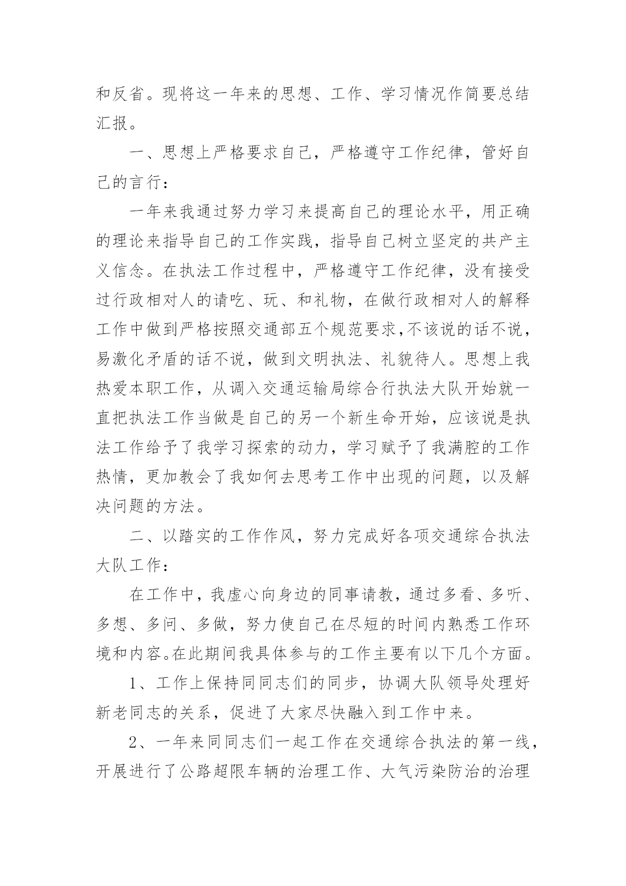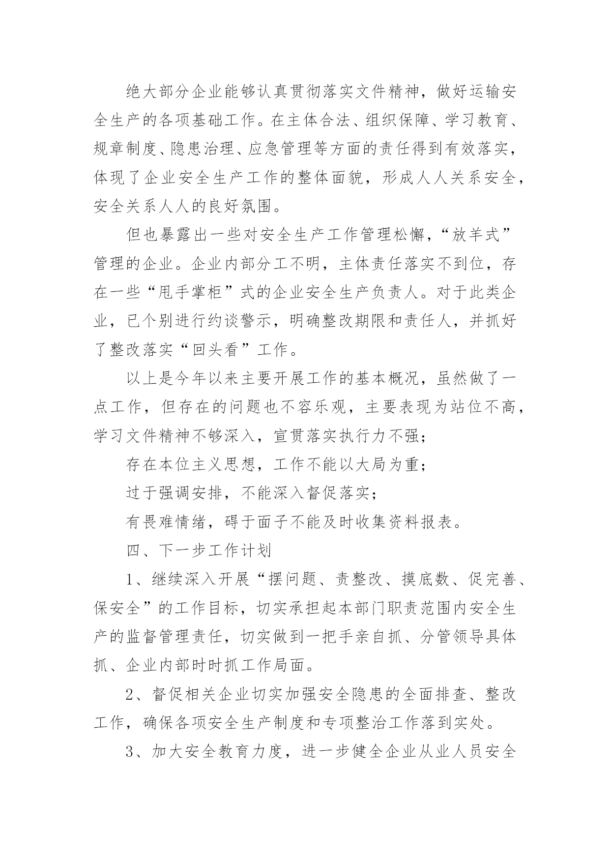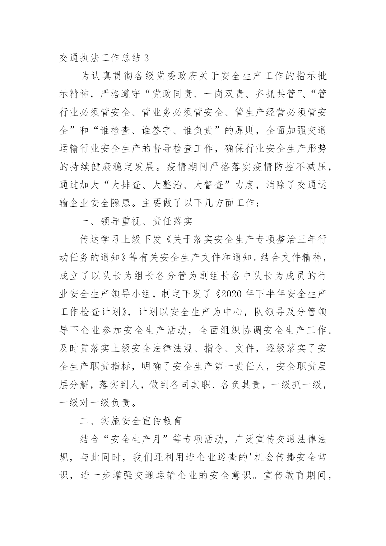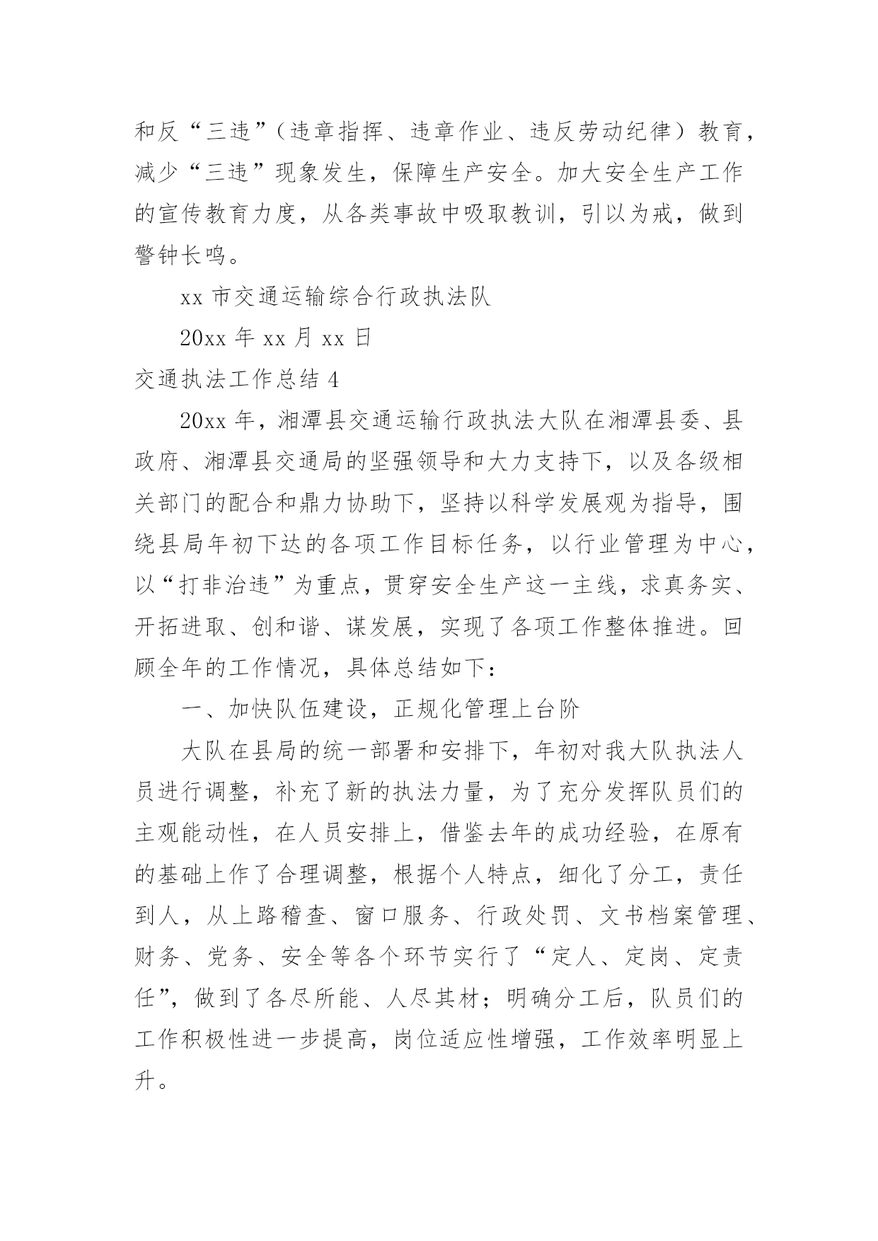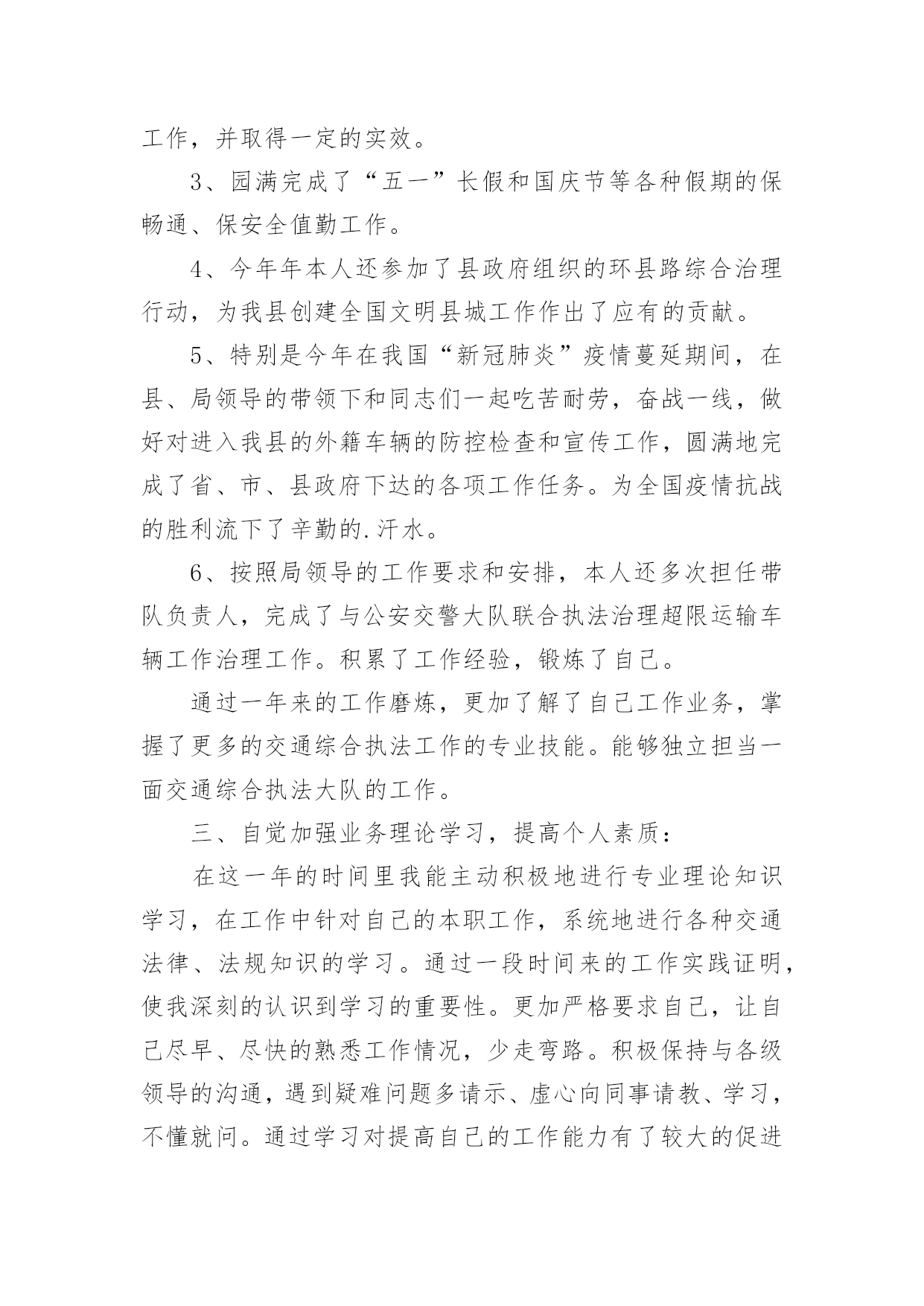 交通执法工作总结交通执法工作总结15篇总结是对某一特定时间段内的学习和工作生活等表现情况加以回顾和分析的一种书面材料,它可以帮助我们总结以往思想,发扬成绩,让我们抽出时间写写总结吧。总结怎么写才不会流于形式呢?以下是小编整理的交通执法工作总结,仅供参考,欢迎大家阅读。交通执法工作总结1我是xx,xx县交通运输局综合执法大队一名普通的执法人员,xx年对我来说是学习的一年、收获的一年。在这一年的学习、工作中,虽然有苦有累,但是感觉到收获却是颇丰,首先是在局领导及同事们的共同努力下圆满的完成了各项工作任务并且学到了很多东西。虽然没有轰轰烈烈的战果,但也算经历了一段不平凡的考验和磨砺。其次在这一年的时间里在交通运输局局领导的要求和指导下,成功地使自己完成了工作角色的转变,即由原来单一的治超站执法工作向综合多样性的交通综合行政执法工作的角色转变。在此转变过程中,始终保持着自己在思想上、工作上、学习等各方面都积极向上的精神。并取得了一定的成绩,个人综合素质也得到了一定的提高。对于每一个追求进步的人来说,对自己进行一番“盘点”与自我工作总结,也算是对自己的一种鞭策和反省。现将这一年来的思想、工作、学习情况作简要总结汇报。一、思想上严格要求自己,严格遵守工作纪律,管好自己的言行:一年来我通过努力学习来提高自己的理论水平,用正确的理论来指导自己的工作实践,指导自己树立坚定的共产主义信念。在执法工作过程中,严格遵守工作纪律,没有接受过行政相对人的请吃、玩、和礼物,在做行政相对人的解释工作中做到严格按照交通部五个规范要求,不该说的话不说,易激化矛盾的话不说,做到文明执法、礼貌待人。思想上我热爱本职工作,从调入交通运输局综合行执法大队开始就一直把执法工作当做是自己的另一个新生命开始,应该说是执法工作给予了我学习探索的动力,学习赋予了我满腔的工作热情,更加教会了我如何去思考工作中出现的问题,以及解决问题的方法。二、以踏实的工作作风,努力完成好各项交通综合执法大队工作:在工作中,我虚心向身边的同事请教,通过多看、多听、多想、多问、多做,努力使自己在尽短的时间内熟悉工作环境和内容。在此期间我具体参与的工作主要有以下几个方面。1、工作上保持同同志们的同步,协调大队领导处理好新老同志的关系,促进了大家尽快融入到工作中来。2、一年来同同志们一起工作在交通综合执法的第一线,开展进行了公路超限车辆的治理工作、大气污染防治的治理工作,并取得一定的实效。3、园满完成了“五一”长假和国庆节等各种假期的保畅通、保安全值勤工作。4、今年年本人还参加了县政府组织的环县路综合治理行动,为我县创建全国文明县城工作作出了应有的贡献。5、特别是今年在我国“新冠肺炎”疫情蔓延期间,在县、局领导的带领下和同志们一起吃苦耐劳,奋战一线,做好对进入我县的外籍车辆的防控检查和宣传工作,圆满地完成了省、市、县政府下达的各项工作任务。为全国疫情抗战的胜利流下了辛勤的.汗水。6、按照局领导的工作要求和安排,本人还多次担任带队负责人,完成了与公安交警大队联合执法治理超限运输车辆工作治理工作。积累了工作经验,锻炼了自己。通过一年来的工作磨炼,更加了解了自己工作业务,掌握了更多的交通综合执法工作的专业技能。能够独立担当一面交通综合执法大队的工作。三、自觉加强业务理论学习,提高个人素质:在这一年的时间里我能主动积极地进行专业理论知识学习,在工作中针对自己的本职工作,系统地进行各种交通法律、法规知识的学习。通过一段时间来的工作实践证明,使我深刻的认识到学习的重要性。更加严格要求自己,让自己尽早、尽快的熟悉工作情况,少走弯路。积极保持与各级领导的沟通,遇到疑难问题多请示、虚心向同事请教、学习,不懂就问。通过学习对提高自己的工作能力有了较大的促进作用。使自己在工作中不掉队、不落伍,通过学习,思考,提高,使自己的思想素质、道德品质和工作能力都得到了明显的进步。能够更好地胜任本职工作。总之,在这一年的工作中,虽然我受益于单位的培养和领导的关心,取得了个人一点点进步,但也在这一年多的工作总结中发现了自己的不足,如对行政相对人的服务意识不够周到,对创新执法工作能动性不强。这些都是我今后要努力工作的方向,争取在今后工作中和大家一起进步,把交通综合行执法大队工作推向新的高度,开创交通综合执法工作的新局面。交通执法工作总结2根据蒲江县交通运输局《关于开展20xx年“安全生产月”活动的实施方案》(蒲交发[20xx]43号)的文件精神,我大队紧紧围绕“安全责任、重在落实”的主题,结合我县交通安全生产情况进行了认真研究、精心组织和部署,积极开展“安全生产月”活动。现将活动开展情况汇报如下:一、加强领导,落实责任为确保20xx年“安全生产月”活动各项工作落到实处,大队成立了以大队长何忠钰为组长,副大队长杜龙义、黄勇为副组长,相关科室