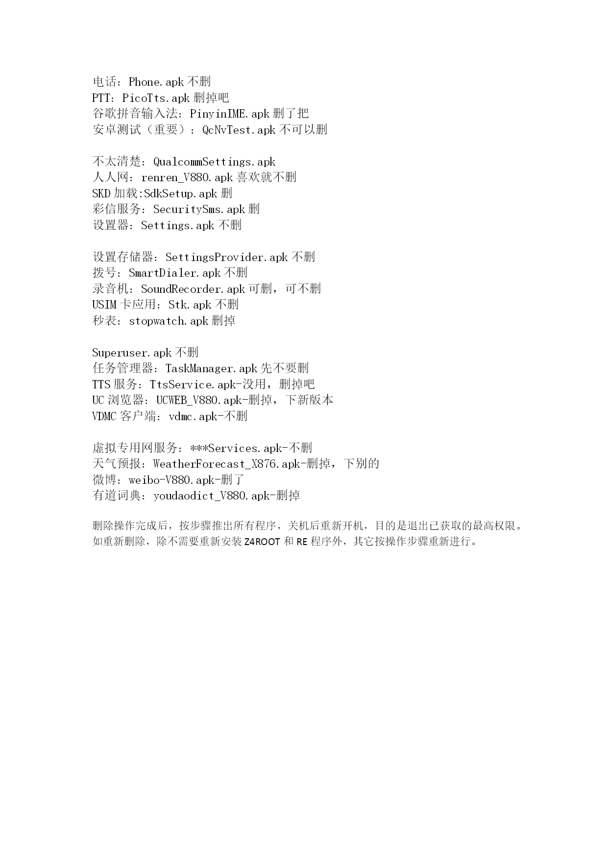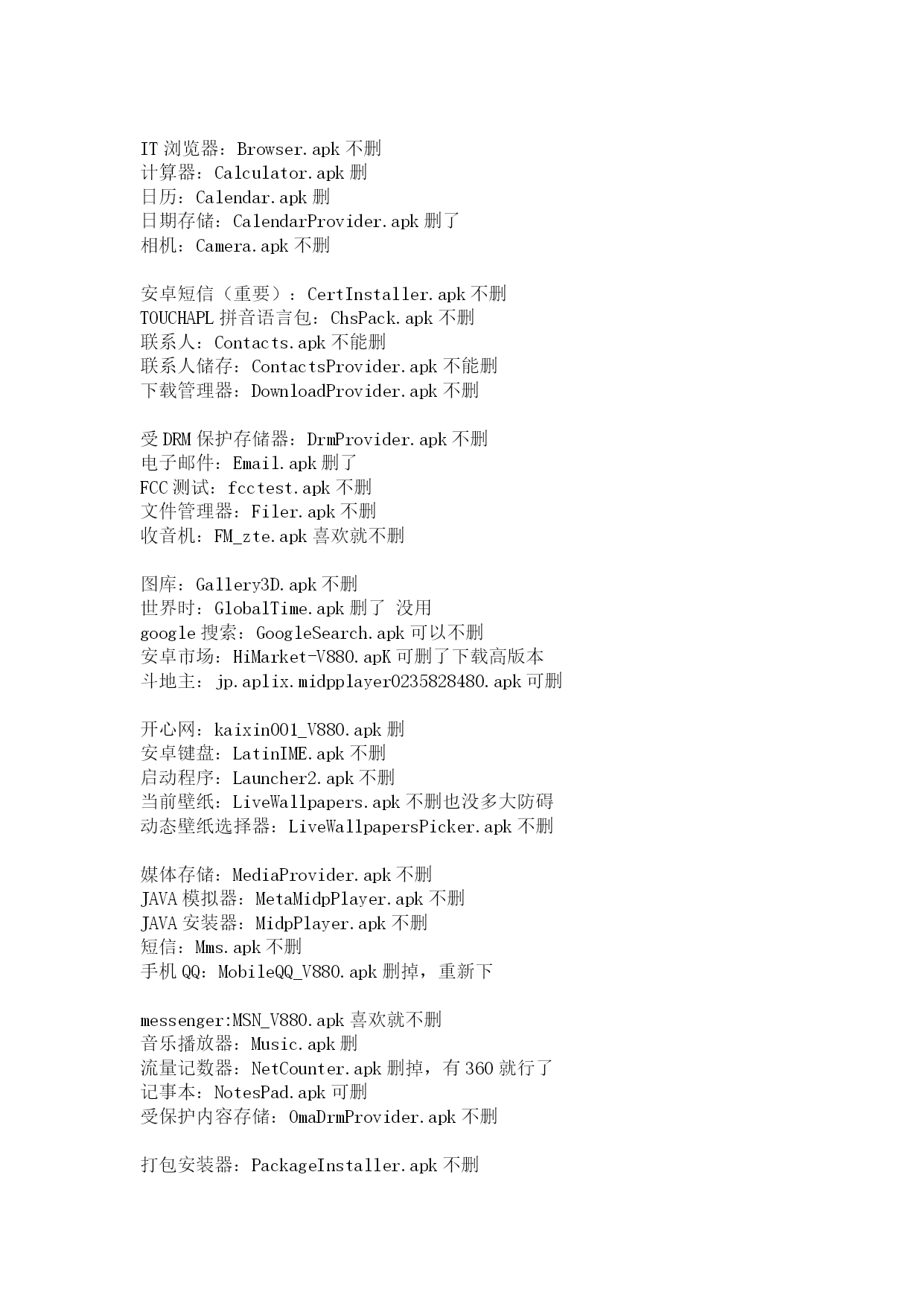 中兴V880联通定制软件删除教程日期:2011-08-24在中国创造了一个一个月累计销量达到25万台,日均销量约8000台,最高单日销量超过万台的销售奇迹的中兴V880,凭着出色的性价比赢得了广大用户的认同,但国内行货版的中兴V880虽然内置了主流的安卓2.2系统,但是由于是联通定制机,系统还多了许多用户平时很少用或者根本不用的软件,而本文就是教大家清理这些系统自带的冗杂程序,从而达到精简和优化系统的目的。首先,下载好HYPERLINK"http://android.waptw.com/pc/soft/30625.html"一键ROOT工具z4root和HYPERLINK"http://android.waptw.com/pc/soft/21404.html"RE管理器后。退出手机中运行的所有程序(可关机后重新开机就可以了)。先安装Z4ROOT,进入软件,选择“获取临时权限”。切记不要选择“获取永久权限”,部分机器不支持永久限权,若获取永久限权会使手机自动重起,自动重新启动手机,而且也没有任何效果。获取临时权限后,因为是中文的,所以会有提示"获取限权成功"。然后再安装RE管理器,进入RE管理器后,有提示“已获取最高限权”,进入“system/app"(点system,再点app),长按要删除软件,出现选项菜单,选delete,会有提示删除成功,千万不要删错了哟,否则系统会出问题的。下面就是一个系统软件能否删除的列表,供广大网友参考。账户与同步设置:AccountAndSyncSettings.apk不删闹钟时钟:alarming.apk可删APK安装器:ApkInstaller.apk不删ApplicationsProvider.apk不删蓝牙传输:Bluetooth.apk不删IT浏览器:Browser.apk不删计算器:Calculator.apk删日历:Calendar.apk删日期存储:CalendarProvider.apk删了相机:Camera.apk不删安卓短信(重要):CertInstaller.apk不删TOUCHAPL拼音语言包:ChsPack.apk不删联系人:Contacts.apk不能删联系人储存:ContactsProvider.apk不能删下载管理器:DownloadProvider.apk不删受DRM保护存储器:DrmProvider.apk不删电子邮件:Email.apk删了FCC测试:fcctest.apk不删文件管理器:Filer.apk不删收音机:FM_zte.apk喜欢就不删图库:Gallery3D.apk不删世界时:GlobalTime.apk删了没用google搜索:GoogleSearch.apk可以不删安卓市场:HiMarket-V880.apK可删了下载高版本斗地主:jp.aplix.midpplayer0235828480.apk可删开心网:kaixin001_V880.apk删安卓键盘:LatinIME.apk不删启动程序:Launcher2.apk不删当前壁纸:LiveWallpapers.apk不删也没多大防碍动态壁纸选择器:LiveWallpapersPicker.apk不删媒体存储:MediaProvider.apk不删JAVA模拟器:MetaMidpPlayer.apk不删JAVA安装器:MidpPlayer.apk不删短信:Mms.apk不删手机QQ:MobileQQ_V880.apk删掉,重新下messenger:MSN_V880.apk喜欢就不删音乐播放器:Music.apk删流量记数器:NetCounter.apk删掉,有360就行了记事本:NotesPad.apk可删受保护内容存储:OmaDrmProvider.apk不删打包安装器:PackageInstaller.apk不删电话:Phone.apk不删PTT:PicoTts.apk删掉吧谷歌拼音输入法:PinyinIME.apk删了把安卓测试(重要):QcNvTest.apk不可以删不太清楚:QualcommSettings.apk人人网:renren_V880.apk喜欢就不删SKD加载:SdkSetup.apk删彩信服务:SecuritySms.apk删设置器:Settings.apk不删设置存储器:SettingsProvider.apk不删拨号:SmartDialer.apk不删录音机:SoundRecorder.apk可删,可不删USIM卡应用:Stk.apk不删秒表:stopwatch.apk删掉Superuser.apk不删任务管理器:TaskManager.apk先不要删TTS服务:TtsService.apk-没用,删掉吧UC浏览器:UCWEB_V880.ap