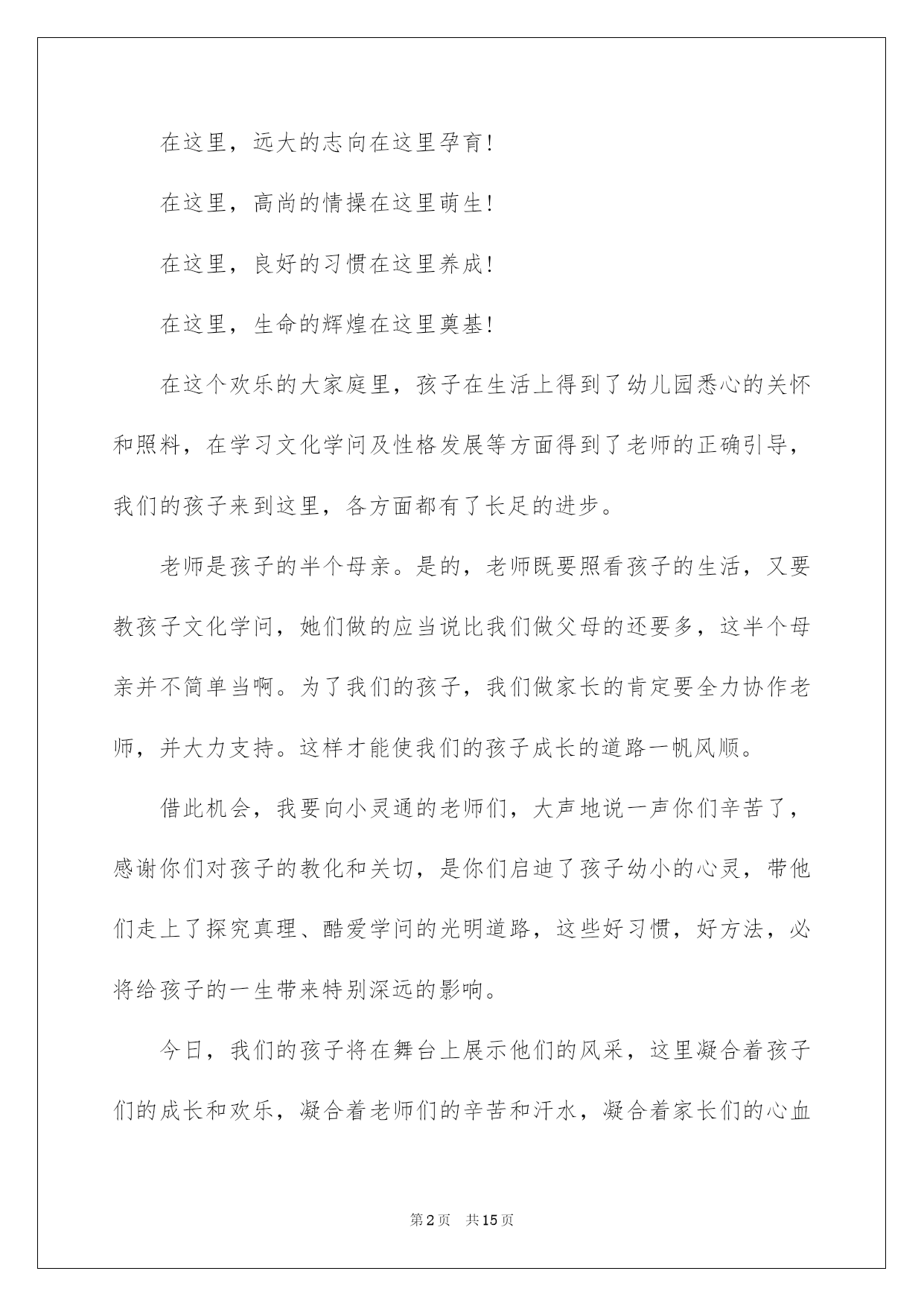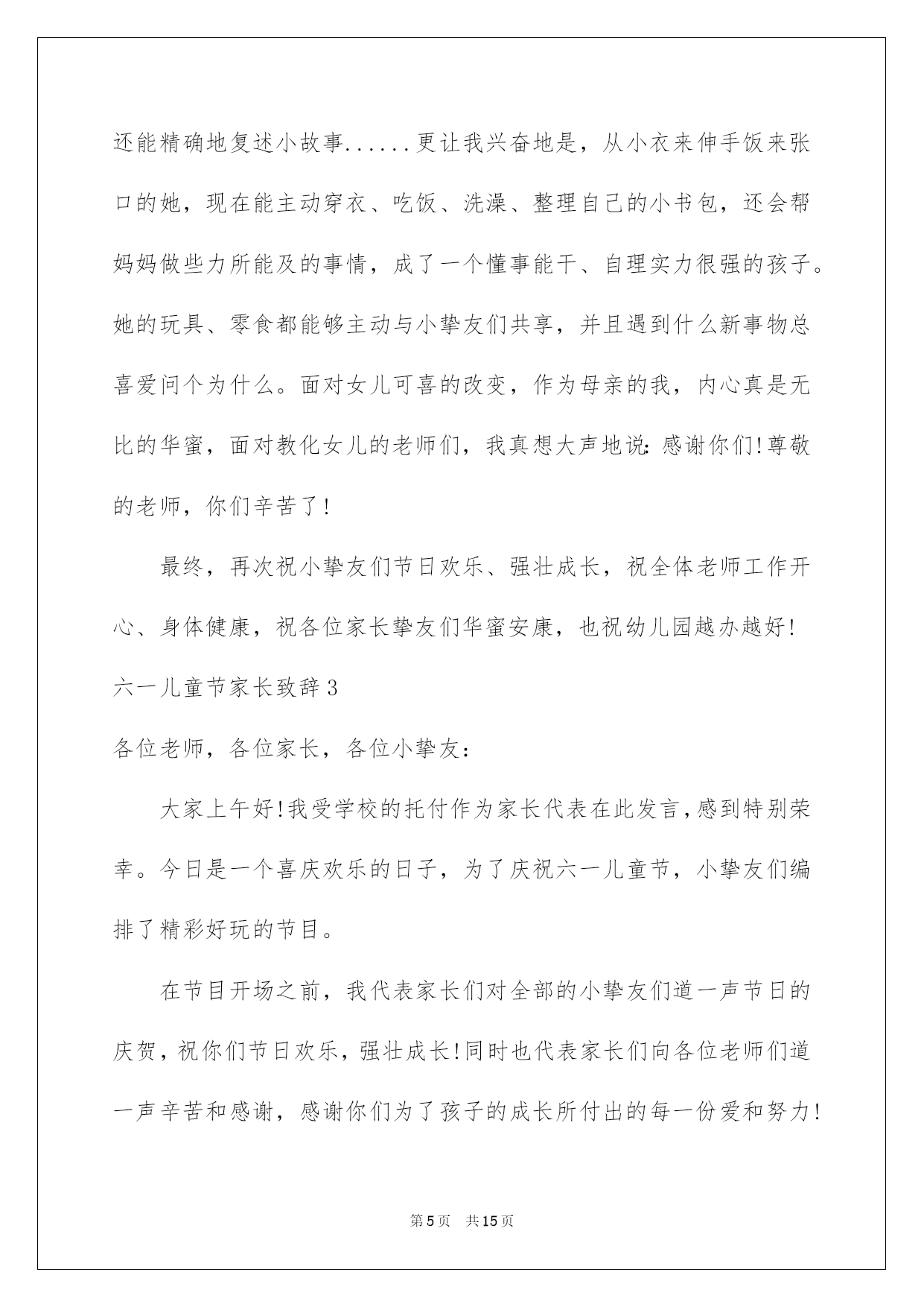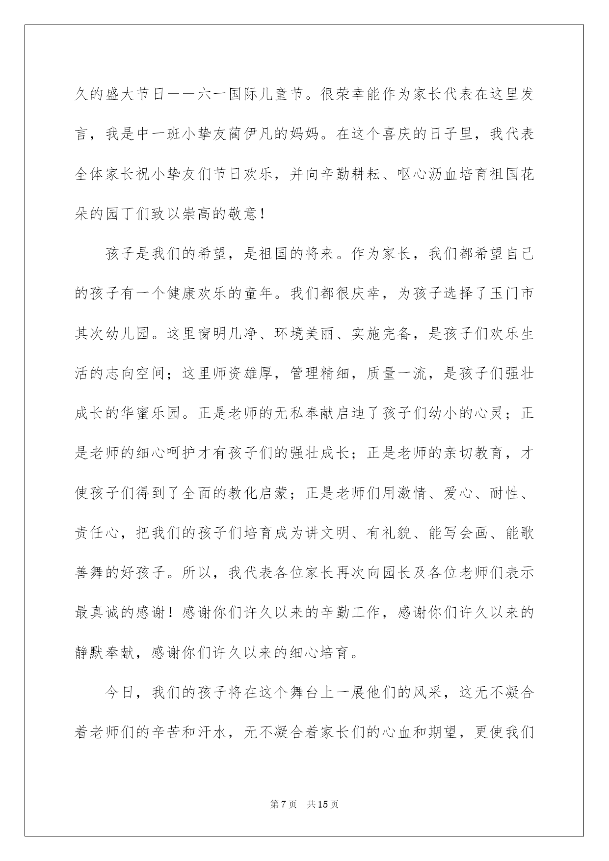 第PAGE\*Arabic\*MERGEFORMAT15页共NUMPAGES\*Arabic\*MERGEFORMAT15页第PAGE\*MERGEFORMAT15页共NUMPAGES\*MERGEFORMAT15页第PAGE\*MERGEFORMAT15页共NUMPAGES\*MERGEFORMAT15页第PAGE\*MERGEFORMAT15页共NUMPAGES\*MERGEFORMAT15页第PAGE\*MERGEFORMAT15页共NUMPAGES\*MERGEFORMAT15页第PAGE\*MERGEFORMAT15页共NUMPAGES\*MERGEFORMAT15页第PAGE\*MERGEFORMAT15页共NUMPAGES\*MERGEFORMAT15页第PAGE\*MERGEFORMAT15页共NUMPAGES\*MERGEFORMAT15页第PAGE\*MERGEFORMAT15页共NUMPAGES\*MERGEFORMAT15页第PAGE\*MERGEFORMAT15页共NUMPAGES\*MERGEFORMAT15页第PAGE\*MERGEFORMAT15页共NUMPAGES\*MERGEFORMAT15页2022六一儿童节家长致辞六一儿童节家长致辞无论是身处学校还是步入社会,大家都不行避开地会接触到致辞吧,致辞具有很强的好用性和针对性。那什么样的致辞才是优秀的呢?以下是我为大家整理的六一儿童节家长致辞,欢迎阅读与保藏。六一儿童节家长致辞1各位老师,各位家长,敬爱的小挚友们:大家好!我很荣幸作为家长代表在这里发言。在这个喜庆快乐的日子里,我代表全体家长,祝小挚友们节日欢乐!向为了孩子的健康成长付出辛勤劳动的老师们致以最真诚的感谢!孩子是我们的希望,是祖国的将来,作为爸爸妈妈、婆婆爷爷,我们希望自己的孩子有一个健康欢乐的童年。我很庆幸,为孩子选择了一个好的幼儿园,好的班级。小灵通幼儿园,正如它的名字一样,它给孩子的心灵注入了欢乐的源泉,学问的源泉,通往他们将来世界的源泉。在这里,孩子得到了全面的启蒙教化及德智体的全面发展:在这里,远大的志向在这里孕育!在这里,高尚的情操在这里萌生!在这里,良好的习惯在这里养成!在这里,生命的辉煌在这里奠基!在这个欢乐的大家庭里,孩子在生活上得到了幼儿园悉心的关怀和照料,在学习文化学问及性格发展等方面得到了老师的正确引导,我们的孩子来到这里,各方面都有了长足的进步。老师是孩子的半个母亲。是的,老师既要照看孩子的生活,又要教孩子文化学问,她们做的应当说比我们做父母的还要多,这半个母亲并不简单当啊。为了我们的孩子,我们做家长的肯定要全力协作老师,并大力支持。这样才能使我们的孩子成长的道路一帆风顺。借此机会,我要向小灵通的老师们,大声地说一声你们辛苦了,感谢你们对孩子的教化和关切,是你们启迪了孩子幼小的心灵,带他们走上了探究真理、酷爱学问的光明道路,这些好习惯,好方法,必将给孩子的一生带来特别深远的影响。今日,我们的孩子将在舞台上展示他们的风采,这里凝合着孩子们的成长和欢乐,凝合着老师们的辛苦和汗水,凝合着家长们的心血和期望。让我们一起为我们的孩子鼓掌,为我们的孩子加油。最终,再次祝小挚友们节日欢乐,强壮成长,祝老师们工作开心,身体健康,祝全体家长们华蜜安康,家庭和谐!六一儿童节家长致辞2敬重的各位领导、老师,各位家长,敬爱的小挚友们:大家上午好!我是大一班xx小挚友的妈妈,很荣幸能代表幼儿园的全体家长们在此发言,首先让我们提前祝小挚友们六一儿童节欢乐!同时向为孩子的健康成长付出辛勤劳动的幼儿园全体老师们,致以最真诚的感谢!让我们把最热情的掌声送给她们吧!孩子是我们的希望,也是祖国的将来。作为家长,我们都希望自己的孩子拥有一个健康欢乐的童年。也希望他们的人生有一个好的起点。我们很庆幸我们的孩子来到了这里,接受了良好的教化。下面就请大家和我一起共享一下我女儿入园前后的一些改变吧!入园前,我的女儿性格内向、很胆小、也爱哭、不愿和人沟通,不擅长表达自己的想法,......作为家长,我很担忧,很焦急,除了平常多和她沟通,多带她到人集中的地方玩,也希望入园后一切会发生变更。对于我的担忧老师们总是劝慰我说,没关系,这些我们会留意的,渐渐来都会好的。听了这些话,我多么期盼女儿会像老师们说的那样好啊!事实证明,老师们是负责任的,我女儿的变更就是最好的证明。在不到两年的时间里,老师们实行生动活泼、通俗易懂、趣味性的教学方法,对她不断地激励、启发和引导。让她主动参加,健康成长。现在,女儿在性格、语言、行为习惯、学问积累等方面都有很大的变更和收获,