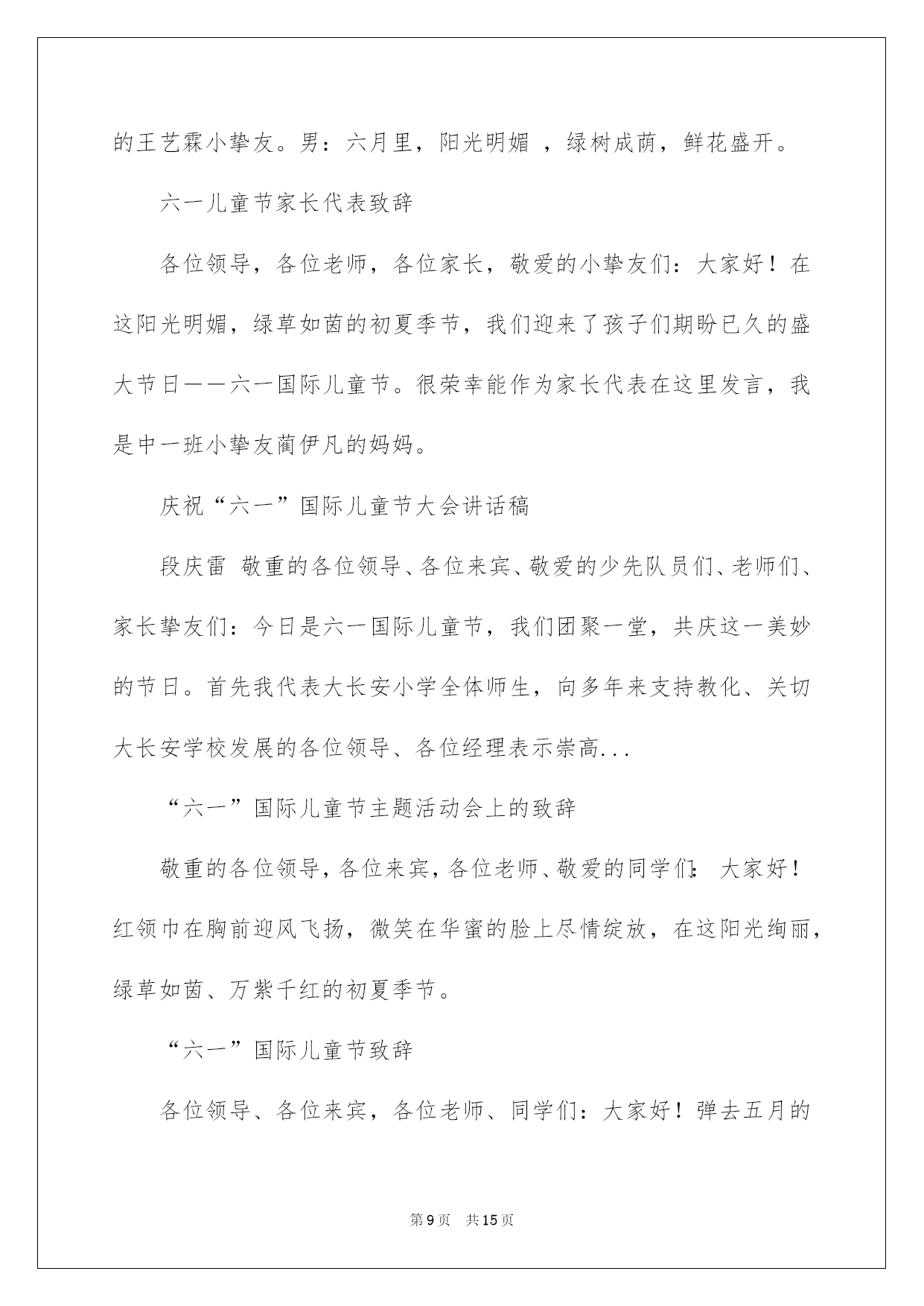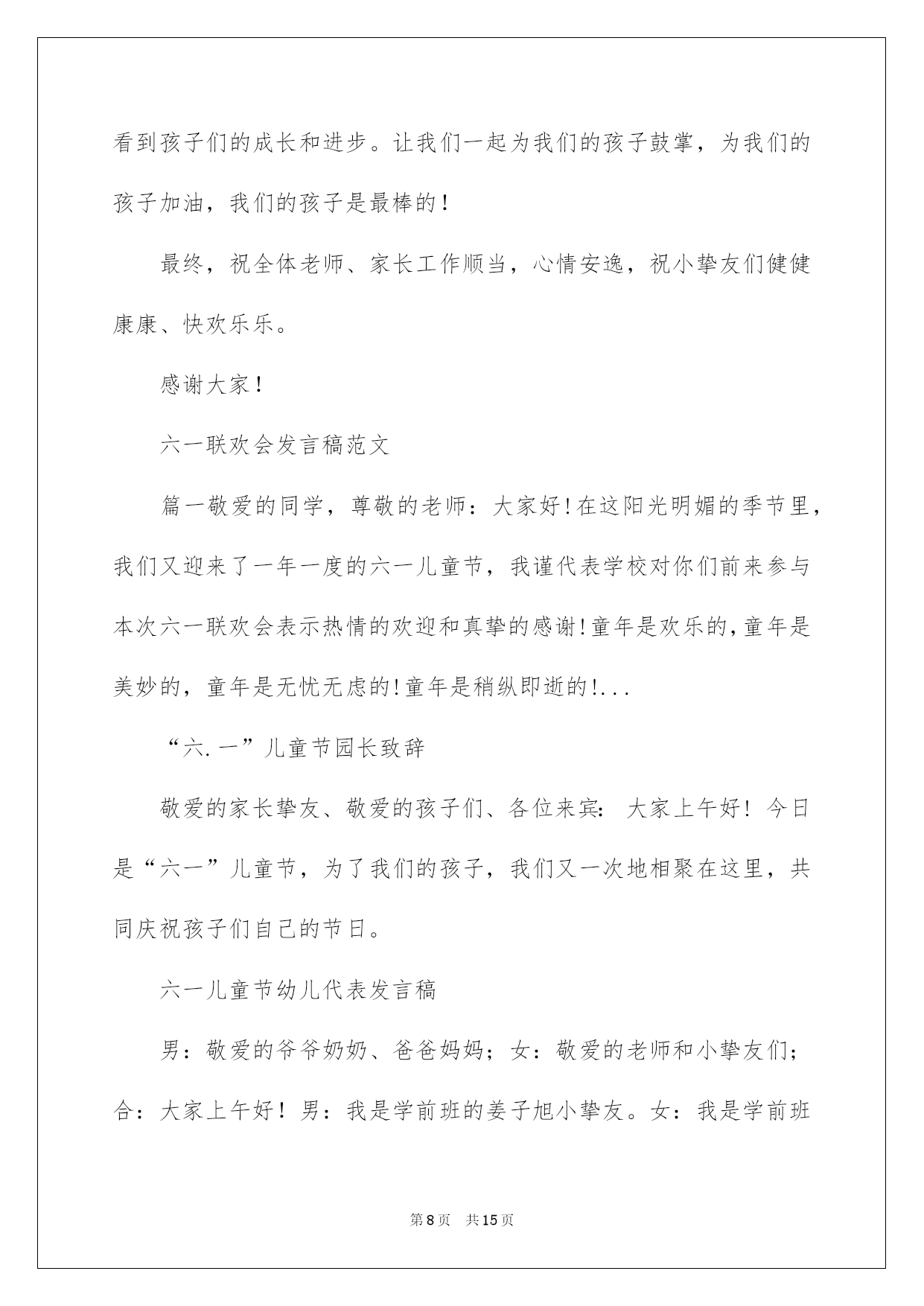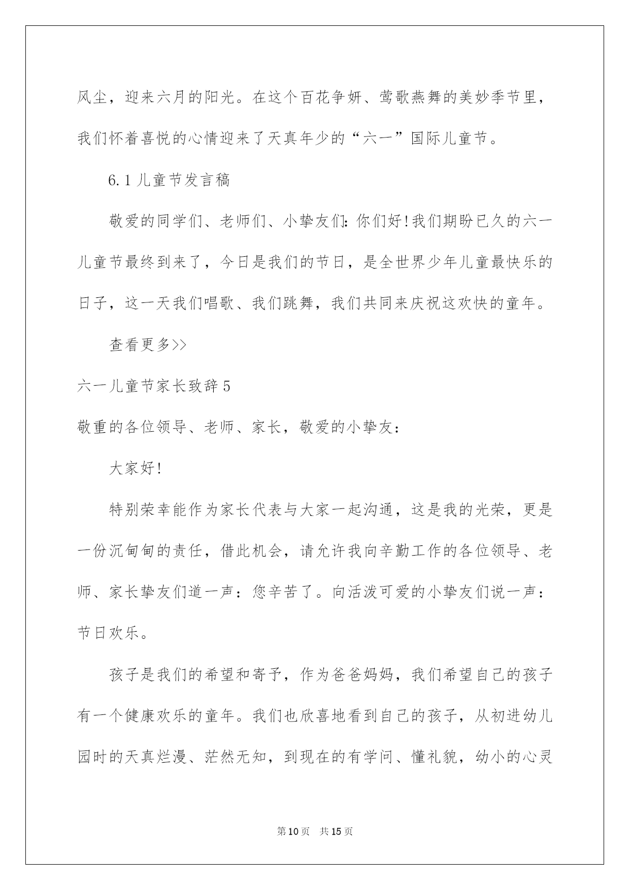 第PAGE\*Arabic\*MERGEFORMAT15页共NUMPAGES\*Arabic\*MERGEFORMAT15页第PAGE\*MERGEFORMAT15页共NUMPAGES\*MERGEFORMAT15页第PAGE\*MERGEFORMAT15页共NUMPAGES\*MERGEFORMAT15页第PAGE\*MERGEFORMAT15页共NUMPAGES\*MERGEFORMAT15页第PAGE\*MERGEFORMAT15页共NUMPAGES\*MERGEFORMAT15页第PAGE\*MERGEFORMAT15页共NUMPAGES\*MERGEFORMAT15页第PAGE\*MERGEFORMAT15页共NUMPAGES\*MERGEFORMAT15页第PAGE\*MERGEFORMAT15页共NUMPAGES\*MERGEFORMAT15页第PAGE\*MERGEFORMAT15页共NUMPAGES\*MERGEFORMAT15页第PAGE\*MERGEFORMAT15页共NUMPAGES\*MERGEFORMAT15页第PAGE\*MERGEFORMAT15页共NUMPAGES\*MERGEFORMAT15页2022六一儿童节家长致辞六一儿童节家长致辞无论是身处学校还是步入社会,大家都不行避开地会接触到致辞吧,致辞具有很强的好用性和针对性。那什么样的致辞才是优秀的呢?以下是我为大家整理的六一儿童节家长致辞,欢迎阅读与保藏。六一儿童节家长致辞1各位老师,各位家长,敬爱的小挚友们:大家好!我很荣幸作为家长代表在这里发言。在这个喜庆快乐的日子里,我代表全体家长,祝小挚友们节日欢乐!向为了孩子的健康成长付出辛勤劳动的老师们致以最真诚的感谢!孩子是我们的希望,是祖国的将来,作为爸爸妈妈、婆婆爷爷,我们希望自己的孩子有一个健康欢乐的童年。我很庆幸,为孩子选择了一个好的幼儿园,好的班级。小灵通幼儿园,正如它的名字一样,它给孩子的心灵注入了欢乐的源泉,学问的源泉,通往他们将来世界的源泉。在这里,孩子得到了全面的启蒙教化及德智体的全面发展:在这里,远大的志向在这里孕育!在这里,高尚的情操在这里萌生!在这里,良好的习惯在这里养成!在这里,生命的辉煌在这里奠基!在这个欢乐的大家庭里,孩子在生活上得到了幼儿园悉心的关怀和照料,在学习文化学问及性格发展等方面得到了老师的正确引导,我们的孩子来到这里,各方面都有了长足的进步。老师是孩子的半个母亲。是的,老师既要照看孩子的生活,又要教孩子文化学问,她们做的应当说比我们做父母的还要多,这半个母亲并不简单当啊。为了我们的孩子,我们做家长的肯定要全力协作老师,并大力支持。这样才能使我们的孩子成长的道路一帆风顺。借此机会,我要向小灵通的老师们,大声地说一声你们辛苦了,感谢你们对孩子的教化和关切,是你们启迪了孩子幼小的心灵,带他们走上了探究真理、酷爱学问的光明道路,这些好习惯,好方法,必将给孩子的一生带来特别深远的影响。今日,我们的孩子将在舞台上展示他们的风采,这里凝合着孩子们的成长和欢乐,凝合着老师们的辛苦和汗水,凝合着家长们的心血和期望。让我们一起为我们的孩子鼓掌,为我们的孩子加油。最终,再次祝小挚友们节日欢乐,强壮成长,祝老师们工作开心,身体健康,祝全体家长们华蜜安康,家庭和谐!六一儿童节家长致辞2敬重的各位领导、老师,各位家长,敬爱的小挚友们:大家上午好!我是大一班xx小挚友的妈妈,很荣幸能代表幼儿园的全体家长们在此发言,首先让我们提前祝小挚友们六一儿童节欢乐!同时向为孩子的健康成长付出辛勤劳动的幼儿园全体老师们,致以最真诚的感谢!让我们把最热情的掌声送给她们吧!孩子是我们的希望,也是祖国的将来。作为家长,我们都希望自己的孩子拥有一个健康欢乐的童年。也希望他们的人生有一个好的起点。我们很庆幸我们的孩子来到了这里,接受了良好的教化。下面就请大家和我一起共享一下我女儿入园前后的一些改变吧!入园前,我的女儿性格内向、很胆小、也爱哭、不愿和人沟通,不擅长表达自己的想法,......作为家长,我很担忧,很焦急,除了平常多和她沟通,多带她到人集中的地方玩,也希望入园后一切会发生变更。对于我的担忧老师们总是劝慰我说,没关系,这些我们会留意的,渐渐来都会好的。听了这些话,我多么期盼女儿会像老师们说的那样好啊!事实证明,老师们是负责任的,我女儿的变更就是最好的证明。在不到两年的时间里,老师们实行生动活泼、通俗易懂、趣味性的教学方法,对她不断地激励、启发和引导。让她主动参加,健康成长。现在,女儿在性格、语言、行为习惯、学问积累等方面都有很大的变更和收获,