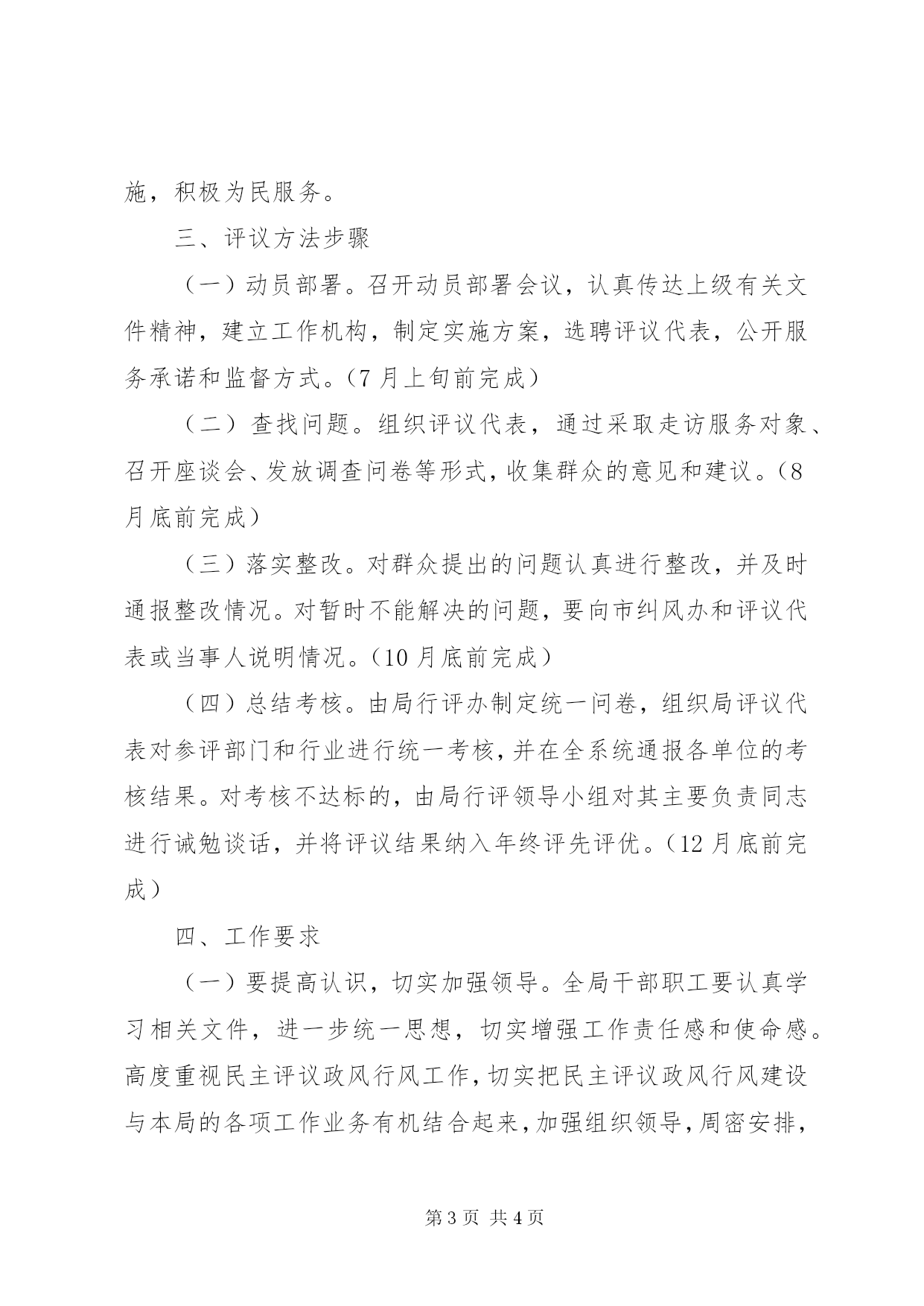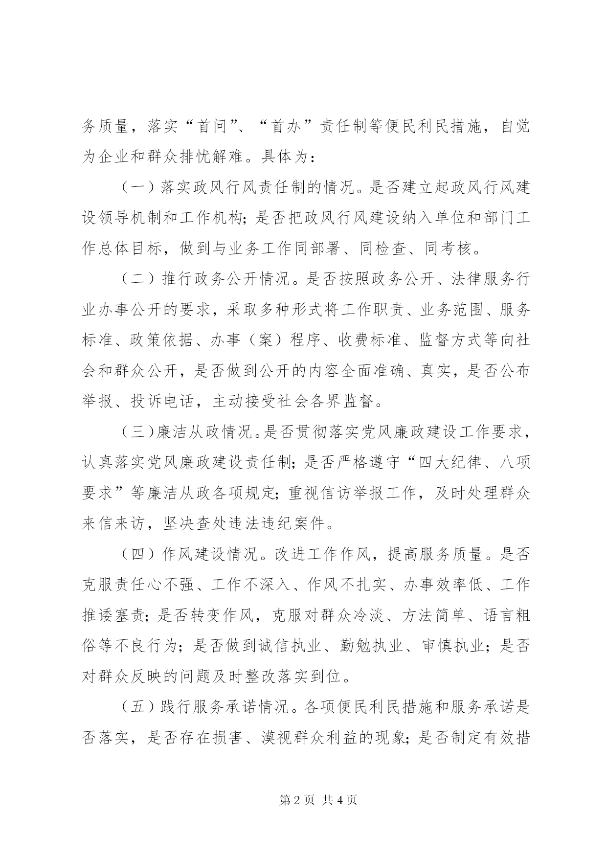 第PAGE\*Arabic\*MERGEFORMAT4页共NUMPAGES\*MERGEFORMAT4页市司法系统政风行风评议实行方案各司法所、律师所、公证处,局机关各股(室):为深入推进本系统政风行风建设,提高服务水平和质量,优化经济发展服务环境,提高行政效能,提升司法行政系统的形象,根据《年市司法行政系统民主评议政风行风工作实施方案》(南司纪[年]8号)文件精神,结合我局实际,制定如下实施方案:一、指导思想坚持以邓小平理论和“三个代表“重要思想为指导,深入贯彻落实科学发展观,紧紧围绕市委、市政府的中心工作,以社会各界的广泛参与为基础,以加强政风行风建设为核心,以群众满意为标准,以解决损害群众利益的热点难点问题为目的,扎实开展民主评议政风行风工作,进一步提高工作效率和服务质量,推动我市司法行政工作又好又快发展。二、评议对象和内容评议对象。局机关各股室、公证处、律师所、“148”法律服务所、各乡镇(街道)司法所和法律服务所。评议内容:局机关和各乡镇(街道)司法所的评议重点要放在严格依法行政、规范执法行为、正确履行职责上,切实解决行政不作为、乱作为、有法不依、执法不公等严重损害企业和群众合法权益的问题;市法律援助中心、市公证处、律师事务所和法律服务所的重点为:改进服务作风,提高职业道德水准,提升服务质量,落实“首问”、“首办”责任制等便民利民措施,自觉为企业和群众排忧解难。具体为:(一)落实政风行风责任制的情况。是否建立起政风行风建设领导机制和工作机构;是否把政风行风建设纳入单位和部门工作总体目标,做到与业务工作同部署、同检查、同考核。(二)推行政务公开情况。是否按照政务公开、法律服务行业办事公开的要求,采取多种形式将工作职责、业务范围、服务标准、政策依据、办事(案)程序、收费标准、监督方式等向社会和群众公开,是否做到公开的内容全面准确、真实,是否公布举报、投诉电话,主动接受社会各界监督。(三)廉洁从政情况。是否贯彻落实党风廉政建设工作要求,认真落实党风廉政建设责任制;是否严格遵守“四大纪律、八项要求”等廉洁从政各项规定;重视信访举报工作,及时处理群众来信来访,坚决查处违法违纪案件。(四)作风建设情况。改进工作作风,提高服务质量。是否克服责任心不强、工作不深入、作风不扎实、办事效率低、工作推诿塞责;是否转变作风,克服对群众冷淡、方法简单、语言粗俗等不良行为;是否做到诚信执业、勤勉执业、审慎执业;是否对群众反映的问题及时整改落实到位。(五)践行服务承诺情况。各项便民利民措施和服务承诺是否落实,是否存在损害、漠视群众利益的现象;是否制定有效措施,积极为民服务。三、评议方法步骤(一)动员部署。召开动员部署会议,认真传达上级有关文件精神,建立工作机构,制定实施方案,选聘评议代表,公开服务承诺和监督方式。(7月上旬前完成)(二)查找问题。组织评议代表,通过采取走访服务对象、召开座谈会、发放调查问卷等形式,收集群众的意见和建议。(8月底前完成)(三)落实整改。对群众提出的问题认真进行整改,并及时通报整改情况。对暂时不能解决的问题,要向市纠风办和评议代表或当事人说明情况。(10月底前完成)(四)总结考核。由局行评办制定统一问卷,组织局评议代表对参评部门和行业进行统一考核,并在全系统通报各单位的考核结果。对考核不达标的,由局行评领导小组对其主要负责同志进行诫勉谈话,并将评议结果纳入年终评先评优。(12月底前完成)四、工作要求(一)要提高认识,切实加强领导。全局干部职工要认真学习相关文件,进一步统一思想,切实增强工作责任感和使命感。高度重视民主评议政风行风工作,切实把民主评议政风行风建设与本局的各项工作业务有机结合起来,加强组织领导,周密安排,明确任务,细化责任,确保民主评议政风行风工作取得实效。(二)注重实效,切实解决群众反映的突出问题。政风行风评议工作要坚持“纠、评、建”相统一,与各项纠风专项治理工作和本单位的业务工作紧密结合起来,把解决群众反映的突出问题和加强政风行风建设作为一条主线,贯穿于政风行风评议的全过程,边评边改,以评促纠,寓改于建。(三)严明纪律,杜绝违纪违规行为的发生。在评议政风行风工作中,要严格遵守纪律,严禁编造、隐匿或销毁评议资料;对违反规定的,要追究相关责任人的责任,并建议有关组织给予纪律处分。