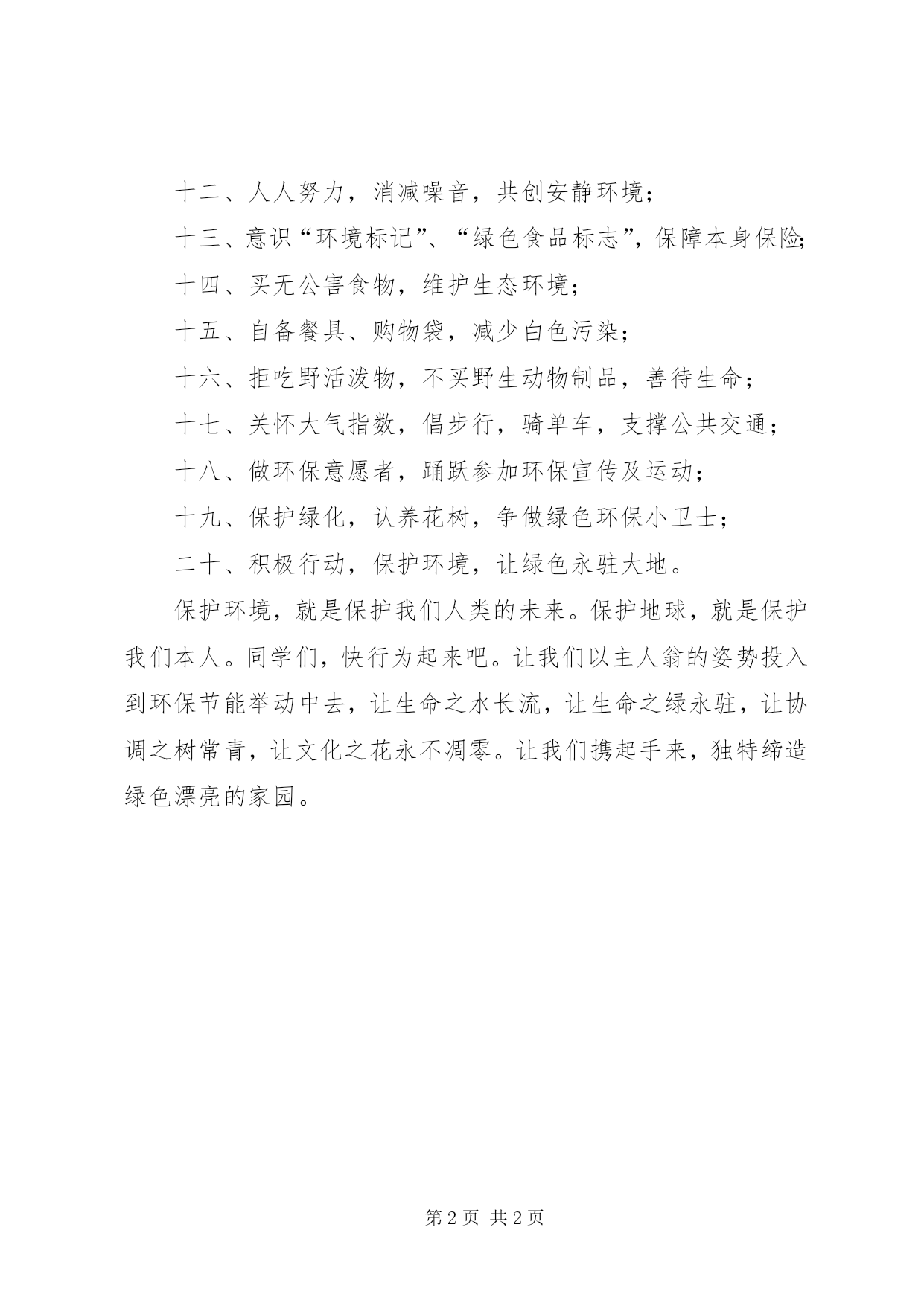 第PAGE\*Arabic\*MERGEFORMAT2页共NUMPAGES\*MERGEFORMAT2页全国科普日环保倡导书敬爱的同窗们:地球,是性命出生的摇篮,是人类赖以生存的处所,是咱们共有的惟一家园。然而,因为人类肆意损坏、传染、挥霍,地球正在变得千疮百孔、皮开肉绽。北极融化、酸雨频仍、海啸绵延、山洪肆虐、沙尘暴逞威,相继而来的灾害一次次向我们敲响警钟:维护生态环境已经迫不及待。青少年是祖国的将来和盼望,是来日世界的建设者跟保卫者,要从小建立环保意识,争做环保节能的小榜样。为此,在“全国科普宣扬日”到来之际,我们向全县中小学生发出以下倡导:一、加强环保意识,自发、当真学习课内外环保常识;二、贡献环保爱心,参加环保行列,掩护生态环境;三、爱护环境卫生,不乱丢乱吐,不乱涂乱画;四、保护水源,节俭用水、一水多用,别让生命之水空流;五、节约用纸,双面使用,珍爱森林资源;六、勤俭用电,不外早开灯,人走灯熄;七、爱护资源,物尽其用,一物多用;八、推进垃圾分类回收,让垃圾变成资源;九、应用环保产品,减少环境污染;十、旧物巧应用,让有限的资源延长命命;十一、爱惜绿化,不残害花草树木;十二、人人努力,消减噪音,共创安静环境;十三、意识“环境标记”、“绿色食品标志”,保障本身保险;十四、买无公害食物,维护生态环境;十五、自备餐具、购物袋,减少白色污染;十六、拒吃野活泼物,不买野生动物制品,善待生命;十七、关怀大气指数,倡步行,骑单车,支撑公共交通;十八、做环保意愿者,踊跃参加环保宣传及运动;十九、保护绿化,认养花树,争做绿色环保小卫士;二十、积极行动,保护环境,让绿色永驻大地。保护环境,就是保护我们人类的未来。保护地球,就是保护我们本人。同学们,快行为起来吧。让我们以主人翁的姿势投入到环保节能举动中去,让生命之水长流,让生命之绿永驻,让协调之树常青,让文化之花永不凋零。让我们携起手来,独特缔造绿色漂亮的家园。