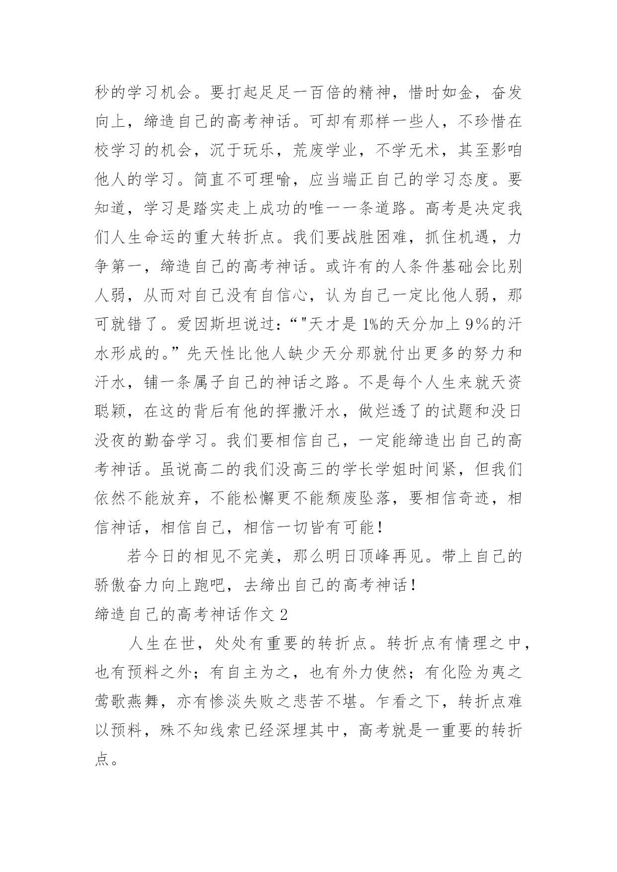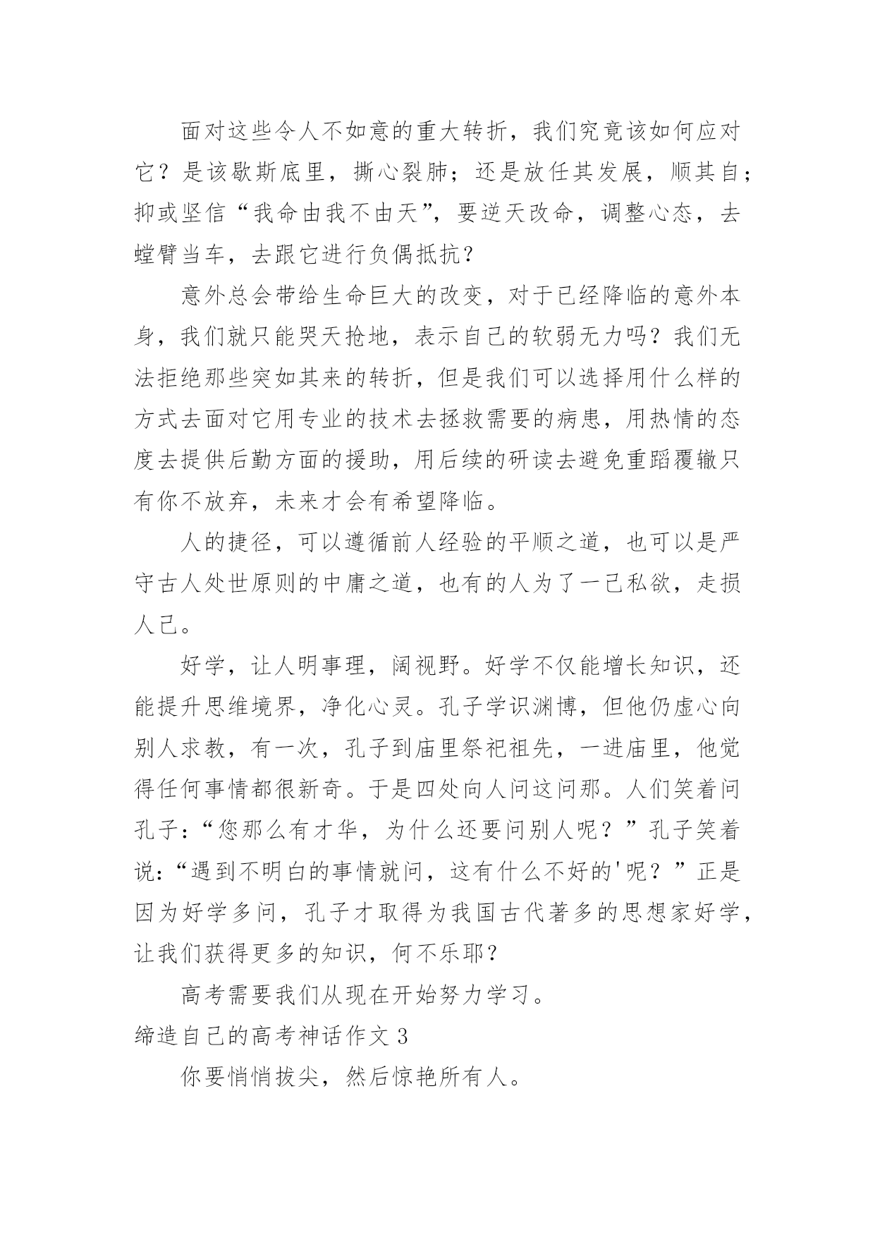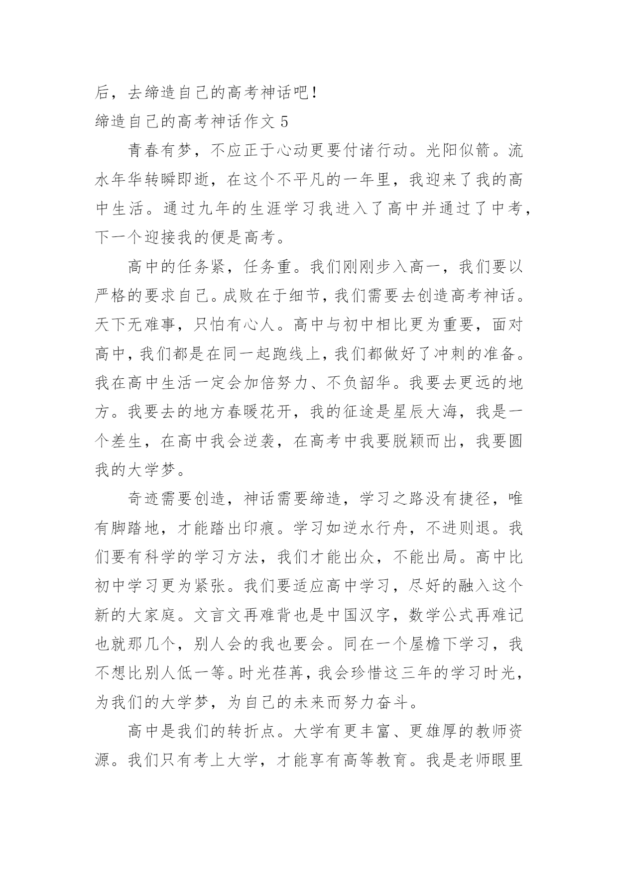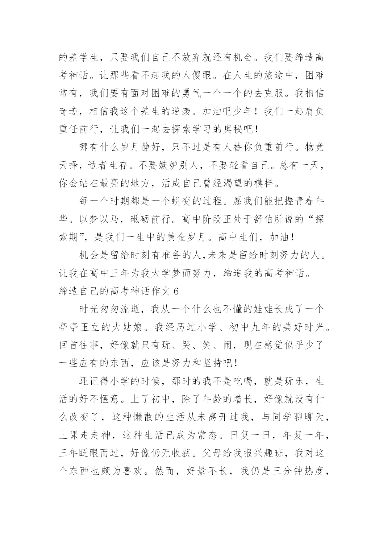 缔造自己的高考神话作文缔造自己的高考神话作文6篇在日常生活或是工作学习中,大家都接触过作文吧,借助作文人们可以实现文化交流的目的。一篇什么样的作文才能称之为优秀作文呢?以下是小编帮大家整理的缔造自己的高考神话作文,欢迎大家分享。缔造自己的高考神话作文1“宝剑锋从磨砺出,梅花香自苦寒来。”我们就像宝剑一般抱书学习十二年,只为以后考上好大学,走向好的人生道路,宝剑越磨越锋利,我们越读越上进,坚持过这艰难的日子,苦尽甘来,最终得以如愿以偿。有人说奇迹难发生,有人说神话难缔造,又有人说一切皆是白忙活。那么我可以很确定地告诉你,一切皆有可能。不管是神话还是奇迹,一切都有可能发生。学习上也是这样。学习没有巧捷径,只有脚踏实地一步一步走下去,踏出自己的脚印,神话奇迹就不再遥不可及。作为高中生的我们,距高考很近又仿佛很远。不管是近还是远,我们都不能松解一分一秒。俗话说的好"考场如战争。”是否能取胜关键在于开战前的维备是否做足,做好了就能轻松战胜,临阵脱逃,松懈怠慢就是会失败而且是大挫败。那么,我们该如向缔造自己的高考神话呢?高中时代时间如流水般,流逝飞快,所以我们就不能在学校浪费一分一秒的学习机会。要打起足足一百倍的精神,惜时如金,奋发向上,缔造自己的高考神话。可却有那样一些人,不珍惜在校学习的机会,沉于玩乐,荒废学业,不学无术,其至影咱他人的学习。简直不可理喻,应当端正自己的学习态度。要知道,学习是踏实走上成功的唯一一条道路。高考是决定我们人生命运的重大转折点。我们要战胜困难,抓住机遇,力争第一,缔造自己的高考神话。或许有的人条件基础会比别人弱,从而对自己没有自信心,认为自己一定比他人弱,那可就错了。爱因斯坦说过:“"天才是1%的天分加上9%的汗水形成的。”先天性比他人缺少天分那就付出更多的努力和汗水,铺一条属子自己的神话之路。不是每个人生来就天资聪颖,在这的背后有他的挥撒汗水,做烂透了的试题和没日没夜的勤奋学习。我们要相信自己,一定能缔造出自己的高考神话。虽说高二的我们没高三的学长学姐时间紧,但我们依然不能放弃,不能松懈更不能颓废坠落,要相信奇迹,相信神话,相信自己,相信一切皆有可能!若今日的相见不完美,那么明日顶峰再见。带上自己的骄傲奋力向上跑吧,去缔出自己的高考神话!缔造自己的高考神话作文2人生在世,处处有重要的转折点。转折点有情理之中,也有预料之外;有自主为之,也有外力使然;有化险为夷之莺歌燕舞,亦有惨淡失败之悲苦不堪。乍看之下,转折点难以预料,殊不知线索已经深埋其中,高考就是一重要的转折点。面对这些令人不如意的重大转折,我们究竟该如何应对它?是该歇斯底里,撕心裂肺;还是放任其发展,顺其自;抑或坚信“我命由我不由天”,要逆天改命,调整心态,去螳臂当车,去跟它进行负偶抵抗?意外总会带给生命巨大的改变,对于已经降临的意外本身,我们就只能哭天抢地,表示自己的软弱无力吗?我们无法拒绝那些突如其来的转折,但是我们可以选择用什么样的方式去面对它用专业的技术去拯救需要的病患,用热情的态度去提供后勤方面的援助,用后续的研读去避免重蹈覆辙只有你不放弃,未来才会有希望降临。人的捷径,可以遵循前人经验的平顺之道,也可以是严守古人处世原则的中庸之道,也有的人为了一己私欲,走损人己。好学,让人明事理,阔视野。好学不仅能增长知识,还能提升思维境界,净化心灵。孔子学识渊博,但他仍虚心向别人求教,有一次,孔子到庙里祭祀祖先,一进庙里,他觉得任何事情都很新奇。于是四处向人问这问那。人们笑着问孔子:“您那么有才华,为什么还要问别人呢?”孔子笑着说:“遇到不明白的事情就问,这有什么不好的'呢?”正是因为好学多问,孔子才取得为我国古代著多的思想家好学,让我们获得更多的知识,何不乐耶?高考需要我们从现在开始努力学习。缔造自己的高考神话作文3你要悄悄拔尖,然后惊艳所有人。——题记当泪的潮涌渐行渐远,理想的岛屿就会浮现。转眸十二载,如今的我们也在为了高考拼搏奋斗。有人说,高考是一首歌,唱出了无数悲欢离合;有人说,高考是一幅画,布满了青春的蓬勃生机;也有人说,青春是一道桥,挤走了万千风华少年。或许,高考真的是一首歌。在这首歌中有叶辛的妙笔细说着他们的差距,有高晓声的小说演绎着他们的人生。于你于我,高考这首歌唱了数十载,自己一个个写下音符,一步步填满曲调,从作词到成曲,无人知道其中的艰难。但当旋律从你口中涌出,当旁人对你投来欣赏的目光,这首歌将成为你的成名作。在这如歌的岁月里,留下自己最美的奋斗风景。自1977年恢复高考开始,梦想也就开始启航了。我们要珍惜这易逝的年华,把握当下,创造出一首属于自己的高考之曲。或许,高考真的是一幅画。那是一幅泪水和汗水作溶剂画出来的一幅画。它包含着许多学长学姐的心血,同时,它也包含着我们所有老师的心血。从底色到构建轮廓,中间不知道撕了几张纸,也不