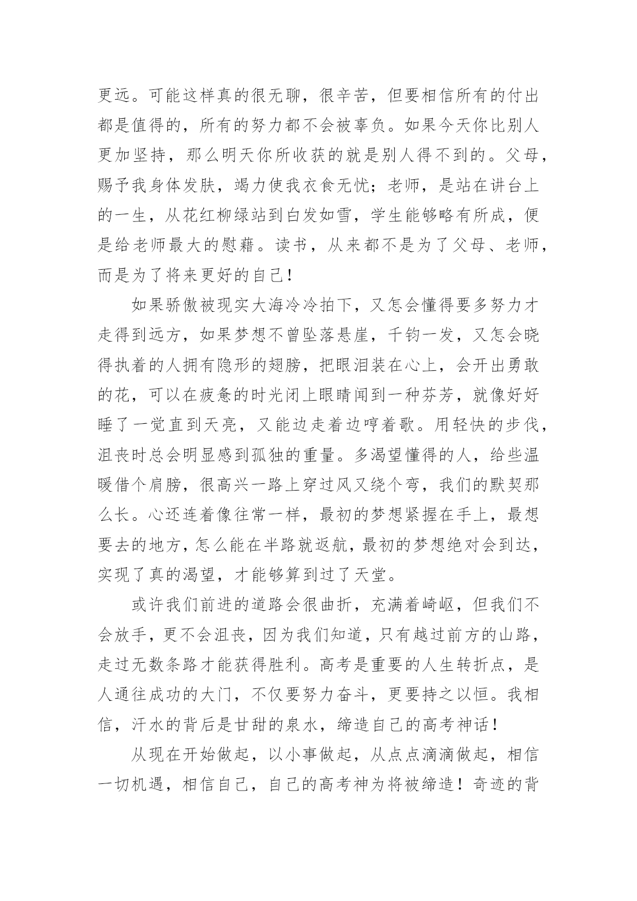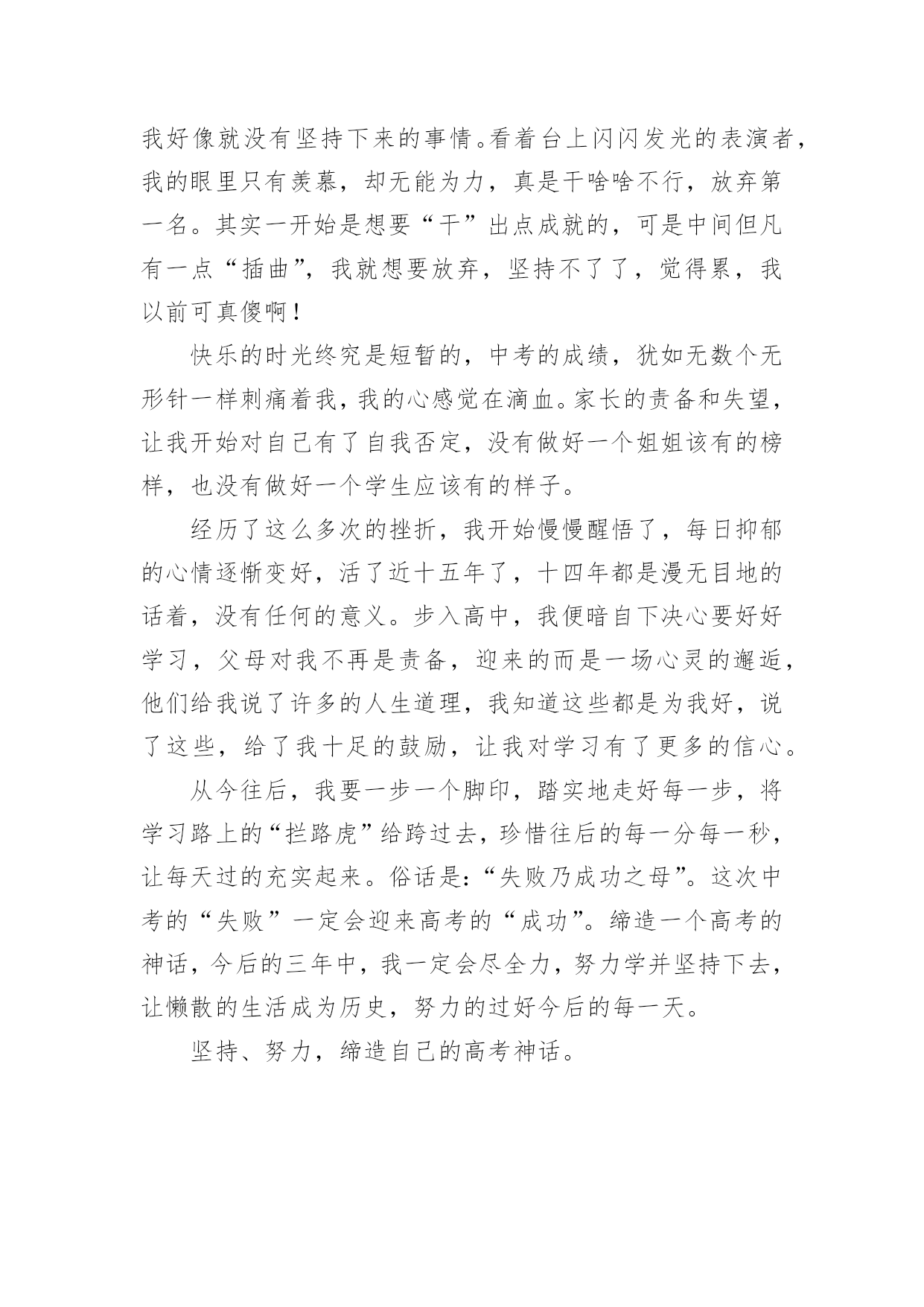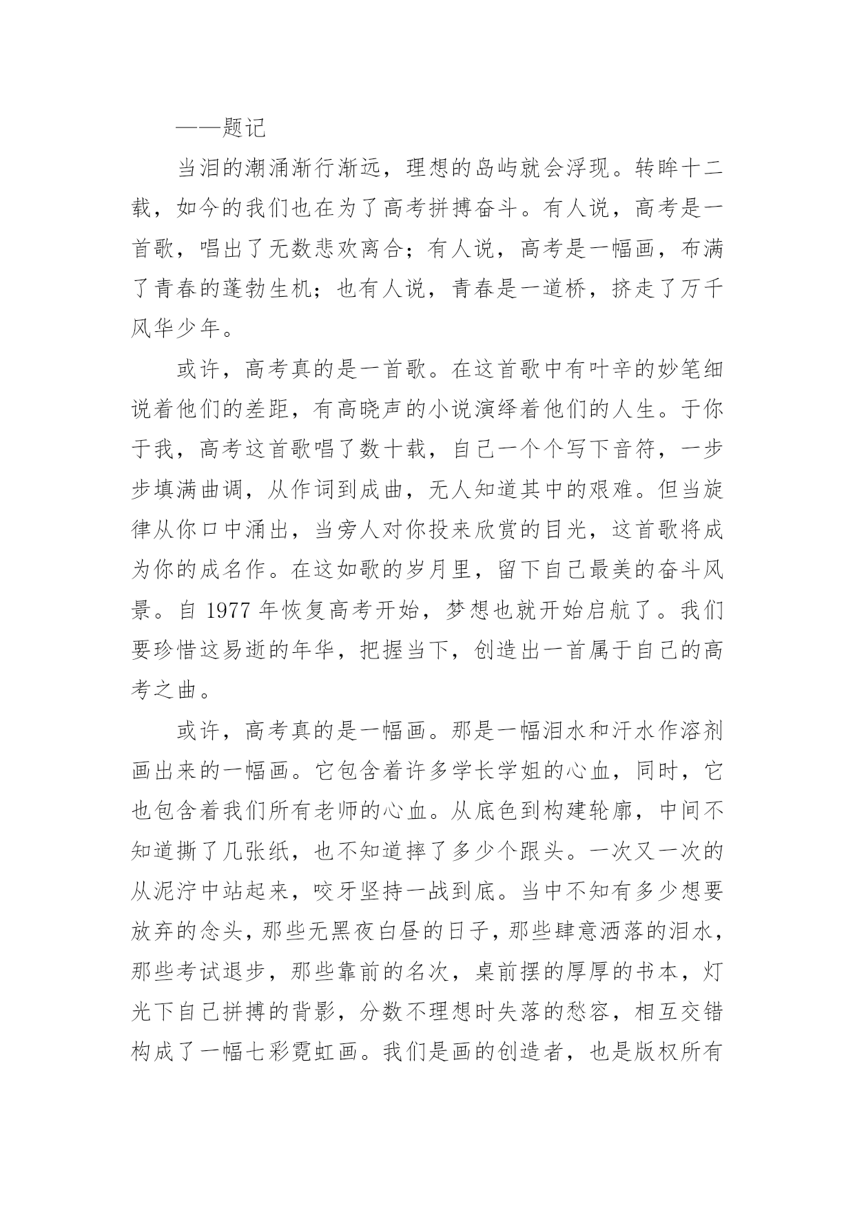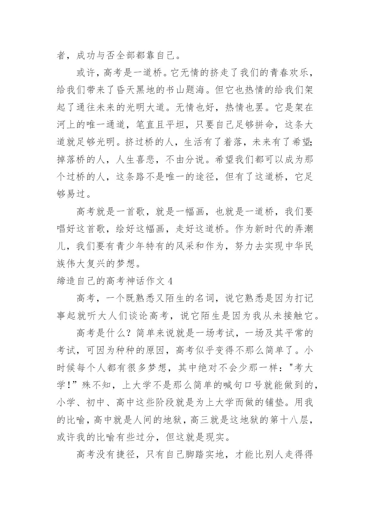 缔造自己的高考神话作文缔造自己的高考神话作文6篇在日常生活或是工作学习中,大家都接触过作文吧,借助作文人们可以实现文化交流的目的。一篇什么样的作文才能称之为优秀作文呢?以下是小编帮大家整理的缔造自己的高考神话作文,欢迎大家分享。缔造自己的高考神话作文1“宝剑锋从磨砺出,梅花香自苦寒来。”我们就像宝剑一般抱书学习十二年,只为以后考上好大学,走向好的人生道路,宝剑越磨越锋利,我们越读越上进,坚持过这艰难的日子,苦尽甘来,最终得以如愿以偿。有人说奇迹难发生,有人说神话难缔造,又有人说一切皆是白忙活。那么我可以很确定地告诉你,一切皆有可能。不管是神话还是奇迹,一切都有可能发生。学习上也是这样。学习没有巧捷径,只有脚踏实地一步一步走下去,踏出自己的脚印,神话奇迹就不再遥不可及。作为高中生的我们,距高考很近又仿佛很远。不管是近还是远,我们都不能松解一分一秒。俗话说的好"考场如战争。”是否能取胜关键在于开战前的维备是否做足,做好了就能轻松战胜,临阵脱逃,松懈怠慢就是会失败而且是大挫败。那么,我们该如向缔造自己的高考神话呢?高中时代时间如流水般,流逝飞快,所以我们就不能在学校浪费一分一秒的学习机会。要打起足足一百倍的精神,惜时如金,奋发向上,缔造自己的高考神话。可却有那样一些人,不珍惜在校学习的机会,沉于玩乐,荒废学业,不学无术,其至影咱他人的学习。简直不可理喻,应当端正自己的学习态度。要知道,学习是踏实走上成功的唯一一条道路。高考是决定我们人生命运的重大转折点。我们要战胜困难,抓住机遇,力争第一,缔造自己的高考神话。或许有的人条件基础会比别人弱,从而对自己没有自信心,认为自己一定比他人弱,那可就错了。爱因斯坦说过:“"天才是1%的天分加上9%的汗水形成的。”先天性比他人缺少天分那就付出更多的努力和汗水,铺一条属子自己的神话之路。不是每个人生来就天资聪颖,在这的背后有他的挥撒汗水,做烂透了的试题和没日没夜的勤奋学习。我们要相信自己,一定能缔造出自己的高考神话。虽说高二的我们没高三的学长学姐时间紧,但我们依然不能放弃,不能松懈更不能颓废坠落,要相信奇迹,相信神话,相信自己,相信一切皆有可能!若今日的相见不完美,那么明日顶峰再见。带上自己的骄傲奋力向上跑吧,去缔出自己的高考神话!缔造自己的高考神话作文2人生在世,处处有重要的转折点。转折点有情理之中,也有预料之外;有自主为之,也有外力使然;有化险为夷之莺歌燕舞,亦有惨淡失败之悲苦不堪。乍看之下,转折点难以预料,殊不知线索已经深埋其中,高考就是一重要的转折点。面对这些令人不如意的重大转折,我们究竟该如何应对它?是该歇斯底里,撕心裂肺;还是放任其发展,顺其自;抑或坚信“我命由我不由天”,要逆天改命,调整心态,去螳臂当车,去跟它进行负偶抵抗?意外总会带给生命巨大的改变,对于已经降临的意外本身,我们就只能哭天抢地,表示自己的软弱无力吗?我们无法拒绝那些突如其来的转折,但是我们可以选择用什么样的方式去面对它用专业的技术去拯救需要的病患,用热情的态度去提供后勤方面的援助,用后续的研读去避免重蹈覆辙只有你不放弃,未来才会有希望降临。人的捷径,可以遵循前人经验的平顺之道,也可以是严守古人处世原则的中庸之道,也有的人为了一己私欲,走损人己。好学,让人明事理,阔视野。好学不仅能增长知识,还能提升思维境界,净化心灵。孔子学识渊博,但他仍虚心向别人求教,有一次,孔子到庙里祭祀祖先,一进庙里,他觉得任何事情都很新奇。于是四处向人问这问那。人们笑着问孔子:“您那么有才华,为什么还要问别人呢?”孔子笑着说:“遇到不明白的事情就问,这有什么不好的'呢?”正是因为好学多问,孔子才取得为我国古代著多的思想家好学,让我们获得更多的知识,何不乐耶?高考需要我们从现在开始努力学习。缔造自己的高考神话作文3你要悄悄拔尖,然后惊艳所有人。——题记当泪的潮涌渐行渐远,理想的岛屿就会浮现。转眸十二载,如今的我们也在为了高考拼搏奋斗。有人说,高考是一首歌,唱出了无数悲欢离合;有人说,高考是一幅画,布满了青春的蓬勃生机;也有人说,青春是一道桥,挤走了万千风华少年。或许,高考真的是一首歌。在这首歌中有叶辛的妙笔细说着他们的差距,有高晓声的小说演绎着他们的人生。于你于我,高考这首歌唱了数十载,自己一个个写下音符,一步步填满曲调,从作词到成曲,无人知道其中的艰难。但当旋律从你口中涌出,当旁人对你投来欣赏的目光,这首歌将成为你的成名作。在这如歌的岁月里,留下自己最美的奋斗风景。自1977年恢复高考开始,梦想也就开始启航了。我们要珍惜这易逝的年华,把握当下,创造出一首属于自己的高考之曲。或许,高考真的是一幅画。那是一幅泪水和汗水作溶剂画出来的一幅画。它包含着许多学长学姐的心血,同时,它也包含着我们所有老师的心血。从底色到构建轮廓,中间不知道撕了几张纸,也不