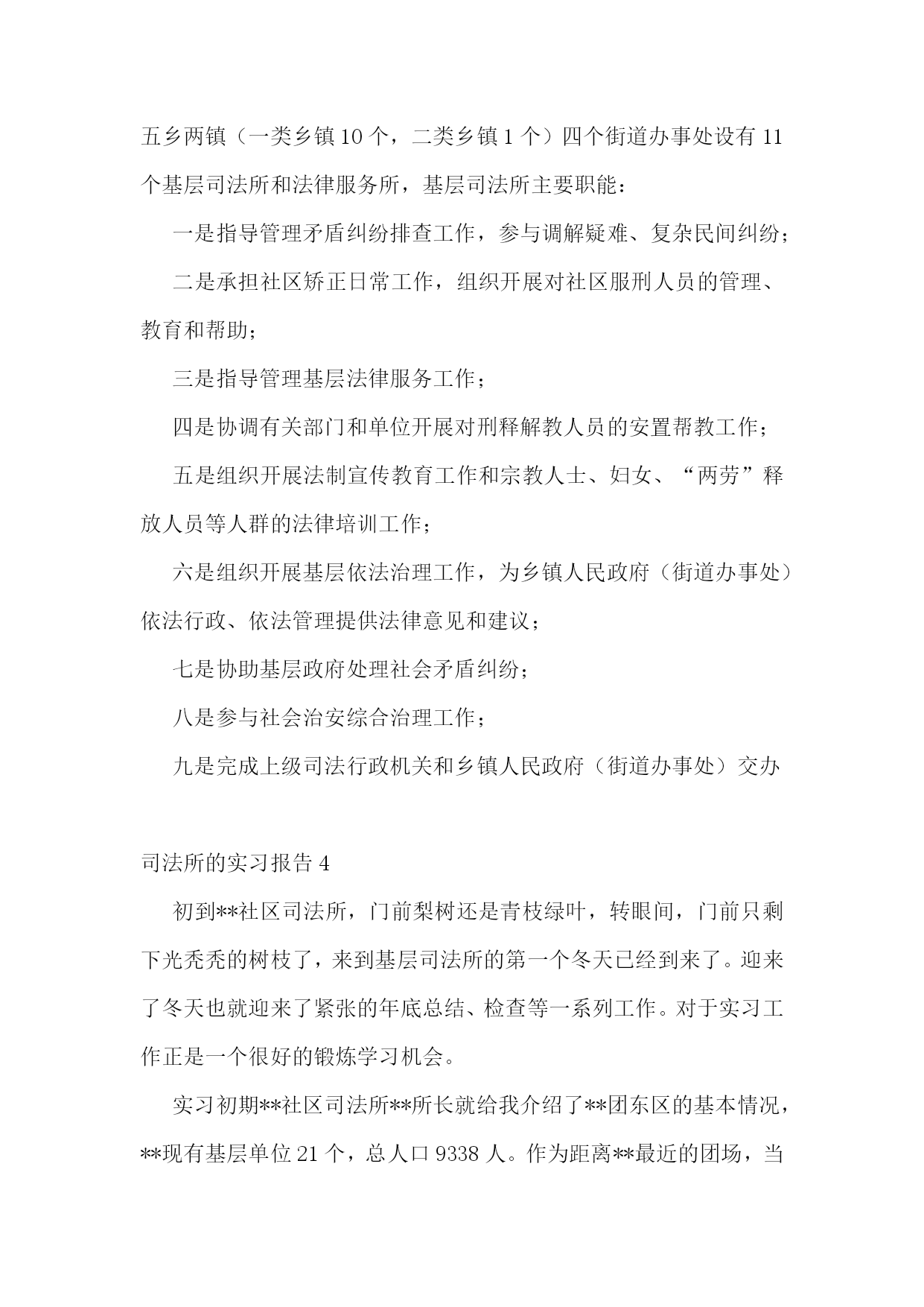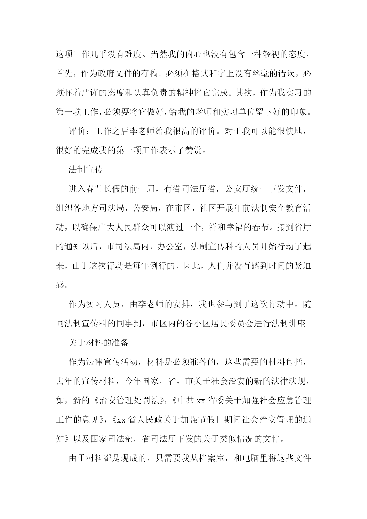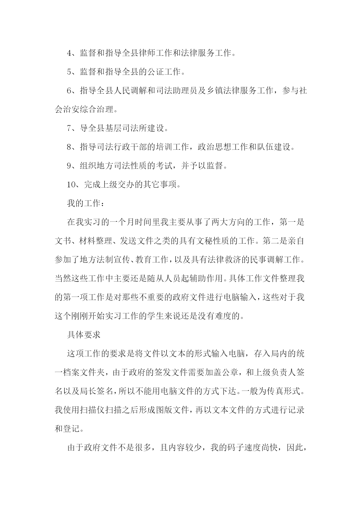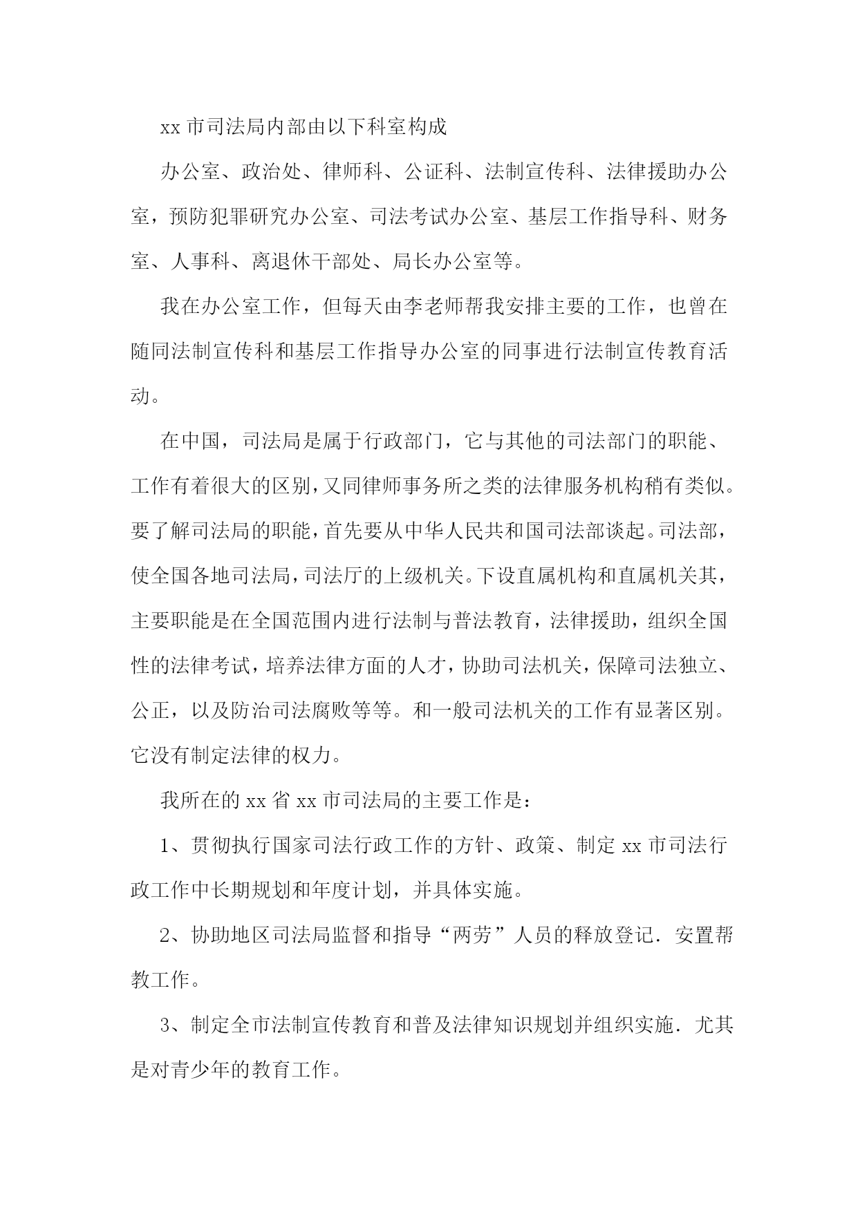 司法所的实习报告合集15篇司法所的实习报告2实习人员:实习地点:实习时间:学校院系:从20xx年2月6日开始,我在xx省xx市司法局进行了一个月的实习,整个实习进行了32天,在这三十多天的时间里,在我的指导老师李主任,学校指导教师孙老师以及我所实习的办公室同事的帮助下,在经历了几多尴尬和困难下,顺利地完成了实习任务,并获得了我转业领域的工作经验,巩固并检验了自己几年来本科学习的知识,提高了自己的专业素养和能力。实习期间我经历了由熟悉司法局构成,打印文件,整理文件,整理案卷,整理宣传材料,送达文件和上级指示内容,参加社区法制建设和宣传,亲自宣讲教育的过程。这些工作是由简单到复杂,不仅是我学习和工作过程,也是实习单位和老师以及单位同志对我前期简单工作的认可,以及能力的肯定。实习单位简介概括:xx省xx市司法局隶属中华人民共和国司法部,xx省司法厅。属于行政机关。省司法厅为其直接上级部门,同时接受xx省xx市政府领导。建制:xx市司法局内部由以下科室构成办公室、政治处、律师科、公证科、法制宣传科、法律援助办公室,预防犯罪研究办公室、司法考试办公室、基层工作指导科、财务室、人事科、离退休干部处、局长办公室等。我在办公室工作,但每天由李老师帮我安排主要的工作,也曾在随同法制宣传科和基层工作指导办公室的同事进行法制宣传教育活动。在中国,司法局是属于行政部门,它与其他的司法部门的职能、工作有着很大的区别,又同律师事务所之类的法律服务机构稍有类似。要了解司法局的职能,首先要从中华人民共和国司法部谈起。司法部,使全国各地司法局,司法厅的上级机关。下设直属机构和直属机关其,主要职能是在全国范围内进行法制与普法教育,法律援助,组织全国性的法律考试,培养法律方面的人才,协助司法机关,保障司法独立、公正,以及防治司法腐败等等。和一般司法机关的工作有显著区别。它没有制定法律的权力。我所在的xx省xx市司法局的主要工作是:1、贯彻执行国家司法行政工作的方针、政策、制定xx市司法行政工作中长期规划和年度计划,并具体实施。2、协助地区司法局监督和指导“两劳”人员的释放登记.安置帮教工作。3、制定全市法制宣传教育和普及法律知识规划并组织实施.尤其是对青少年的教育工作。4、监督和指导全县律师工作和法律服务工作。5、监督和指导全县的公证工作。6、指导全县人民调解和司法助理员及乡镇法律服务工作,参与社会治安综合治理。7、导全县基层司法所建设。8、指导司法行政干部的培训工作,政治思想工作和队伍建设。9、组织地方司法性质的考试,并予以监督。10、完成上级交办的其它事项。我的工作:在我实习的一个月时间里我主要从事了两大方向的工作,第一是文书、材料整理、发送文件之类的具有文秘性质的工作。第二是亲自参加了地方法制宣传、教育工作,以及具有法律救济的民事调解工作。当然这些工作中主要还是随从人员起辅助作用。具体工作文件整理我的第一项工作是对那些不重要的政府文件进行电脑输入,这些对于我这个刚刚开始实习工作的学生来说还是没有难度的。具体要求这项工作的要求是将文件以文本的形式输入电脑,存入局内的统一档案文件夹,由于政府的签发文件需要加盖公章,和上级负责人签名以及局长签名,所以不能用电脑文件的方式下达。一般为传真形式。我使用扫描仪扫描之后形成图版文件,再以文本文件的方式进行记录和登记。由于政府文件不是很多,且内容较少,我的码子速度尚快,因此,这项工作几乎没有难度。当然我的内心也没有包含一种轻视的态度。首先,作为政府文件的存稿。必须在格式和字上没有丝毫的错误,必须怀着严谨的态度和认真负责的精神将它完成。其次,作为我实习的第一项工作,必须要将它做好,给我的老师和实习单位留下好的印象。评价:工作之后李老师给我很高的评价。对于我可以能很快地,很好的完成我的第一项工作表示了赞赏。法制宣传进入春节长假的前一周,有省司法厅省,公安厅统一下发文件,组织各地方司法局,公安局,在市区,社区开展年前法制安全教育活动,以确保广大人民群众可以渡过一个,祥和幸福的春节。接到省厅的通知以后,市司法局内,办公室,法制宣传科的人员开始行动了起来,由于这次行动是每年例行的,因此,人们并没有感到时间的紧迫感。作为实习人员,由李老师的安排,我也参与到了这次行动中。随同法制宣传科的同事到,市区内的各小区居民委员会进行法制讲座。关于材料的准备作为法律宣传活动,材料是必须准备的,这些需要的材料包括,去年的宣传材料,今年国家,省,市关于社会治安的新的法律法规。如,新的《治安管理处罚法》,《中共xx省委关于加强社会应急管理工作的意见》,《xx省人民政关于加强节假日期间社会治安管理的通知》以及国家司法部,省司法厅下发的关于类似情况的文件。由于材料都是现成的,只需要我从档