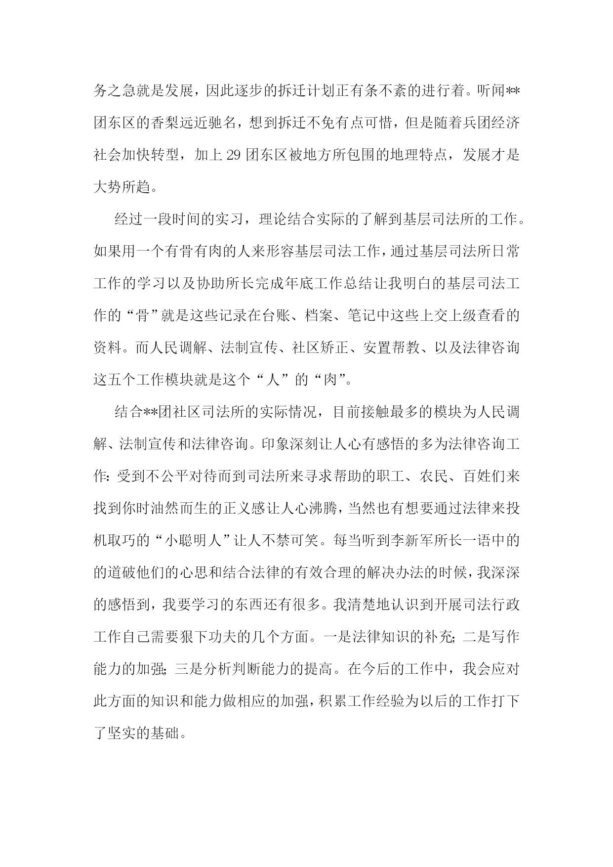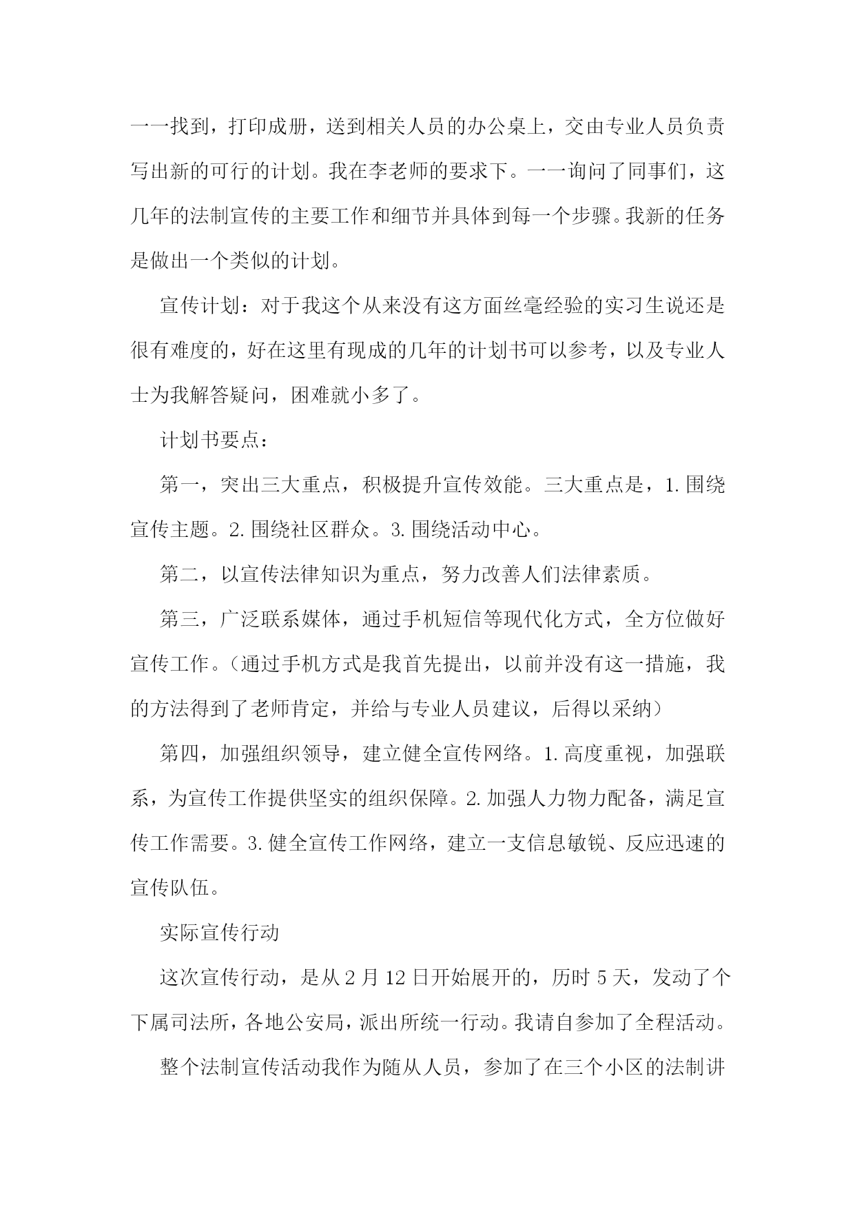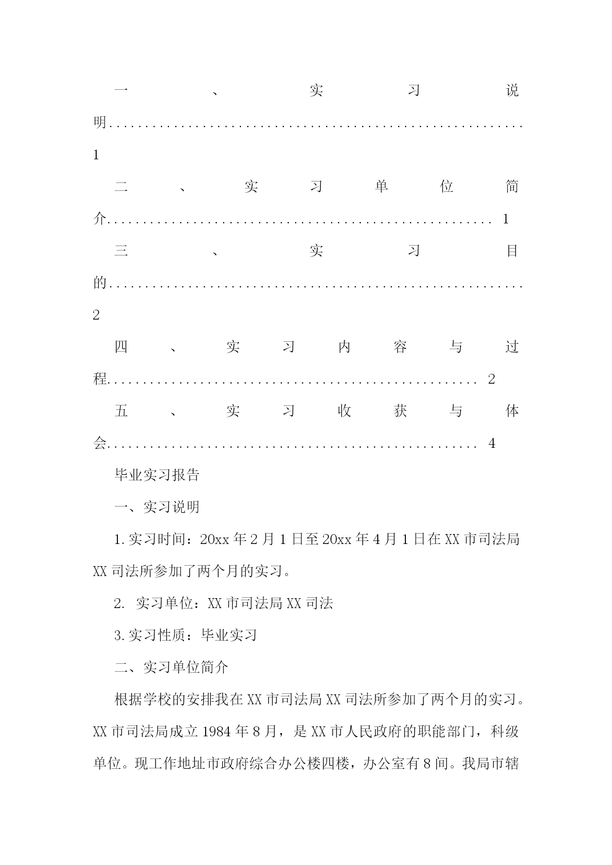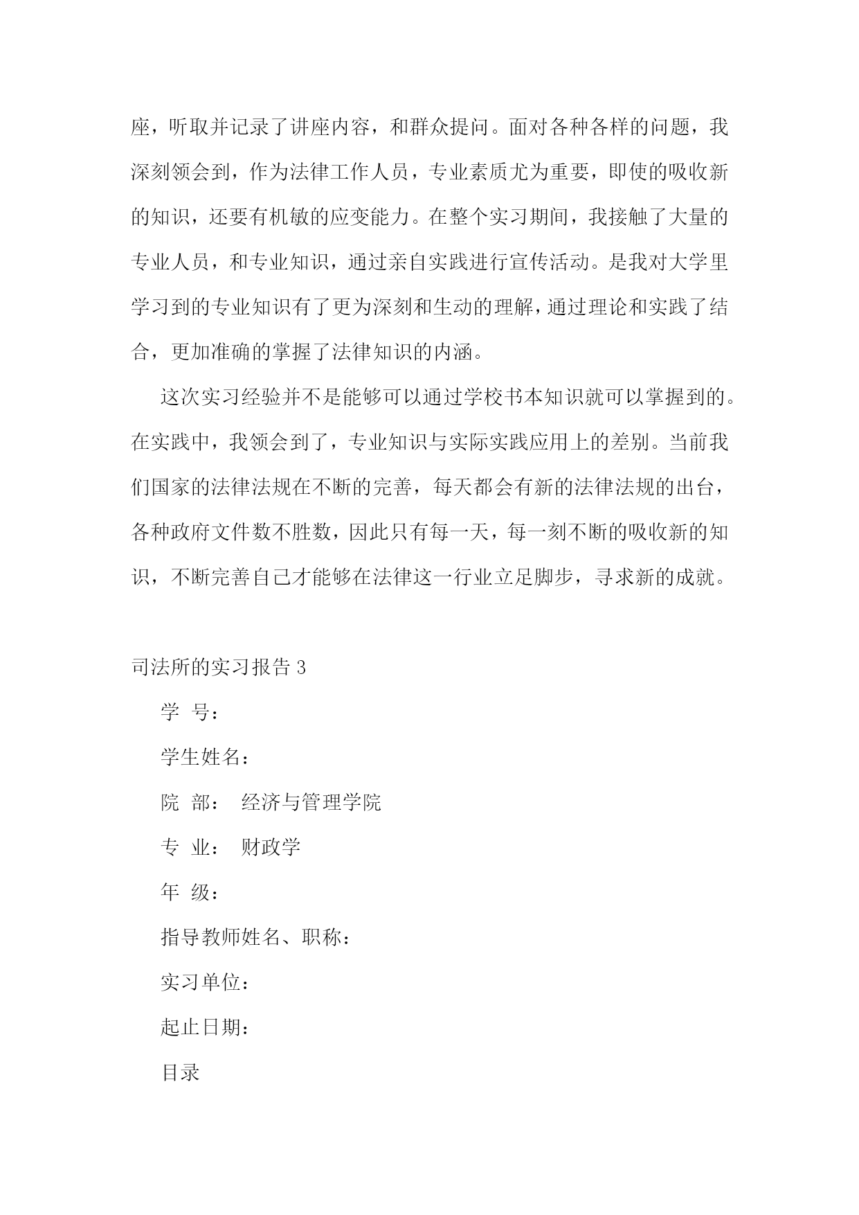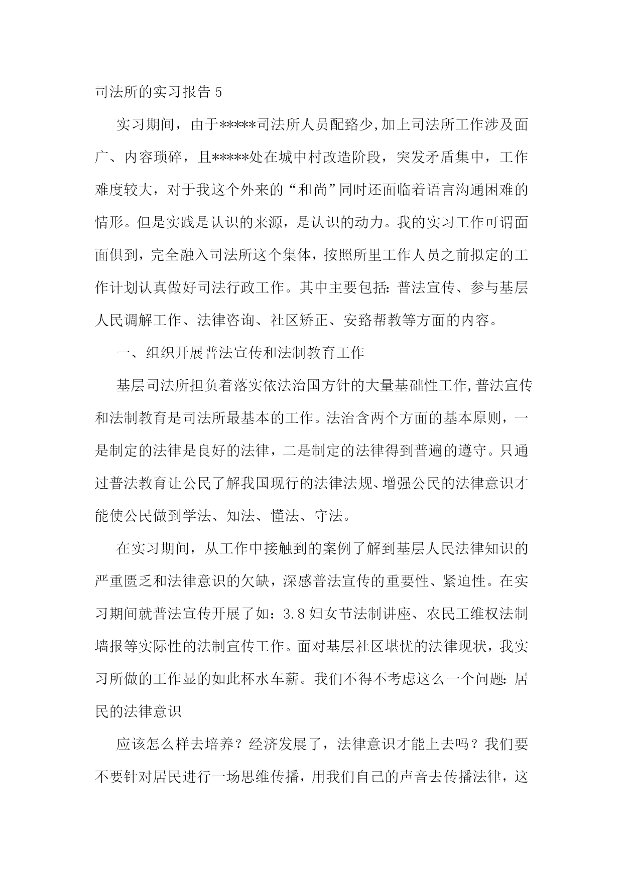 司法所的实习报告合集15篇司法所的实习报告2实习人员:实习地点:实习时间:学校院系:从20xx年2月6日开始,我在xx省xx市司法局进行了一个月的实习,整个实习进行了32天,在这三十多天的时间里,在我的指导老师李主任,学校指导教师孙老师以及我所实习的办公室同事的帮助下,在经历了几多尴尬和困难下,顺利地完成了实习任务,并获得了我转业领域的工作经验,巩固并检验了自己几年来本科学习的知识,提高了自己的专业素养和能力。实习期间我经历了由熟悉司法局构成,打印文件,整理文件,整理案卷,整理宣传材料,送达文件和上级指示内容,参加社区法制建设和宣传,亲自宣讲教育的过程。这些工作是由简单到复杂,不仅是我学习和工作过程,也是实习单位和老师以及单位同志对我前期简单工作的认可,以及能力的肯定。实习单位简介概括:xx省xx市司法局隶属中华人民共和国司法部,xx省司法厅。属于行政机关。省司法厅为其直接上级部门,同时接受xx省xx市政府领导。建制:xx市司法局内部由以下科室构成办公室、政治处、律师科、公证科、法制宣传科、法律援助办公室,预防犯罪研究办公室、司法考试办公室、基层工作指导科、财务室、人事科、离退休干部处、局长办公室等。我在办公室工作,但每天由李老师帮我安排主要的工作,也曾在随同法制宣传科和基层工作指导办公室的同事进行法制宣传教育活动。在中国,司法局是属于行政部门,它与其他的司法部门的职能、工作有着很大的区别,又同律师事务所之类的法律服务机构稍有类似。要了解司法局的职能,首先要从中华人民共和国司法部谈起。司法部,使全国各地司法局,司法厅的上级机关。下设直属机构和直属机关其,主要职能是在全国范围内进行法制与普法教育,法律援助,组织全国性的法律考试,培养法律方面的人才,协助司法机关,保障司法独立、公正,以及防治司法腐败等等。和一般司法机关的工作有显著区别。它没有制定法律的权力。我所在的xx省xx市司法局的主要工作是:1、贯彻执行国家司法行政工作的方针、政策、制定xx市司法行政工作中长期规划和年度计划,并具体实施。2、协助地区司法局监督和指导“两劳”人员的释放登记.安置帮教工作。3、制定全市法制宣传教育和普及法律知识规划并组织实施.尤其是对青少年的教育工作。4、监督和指导全县律师工作和法律服务工作。5、监督和指导全县的公证工作。6、指导全县人民调解和司法助理员及乡镇法律服务工作,参与社会治安综合治理。7、导全县基层司法所建设。8、指导司法行政干部的培训工作,政治思想工作和队伍建设。9、组织地方司法性质的考试,并予以监督。10、完成上级交办的其它事项。我的工作:在我实习的一个月时间里我主要从事了两大方向的工作,第一是文书、材料整理、发送文件之类的具有文秘性质的工作。第二是亲自参加了地方法制宣传、教育工作,以及具有法律救济的民事调解工作。当然这些工作中主要还是随从人员起辅助作用。具体工作文件整理我的第一项工作是对那些不重要的政府文件进行电脑输入,这些对于我这个刚刚开始实习工作的学生来说还是没有难度的。具体要求这项工作的要求是将文件以文本的形式输入电脑,存入局内的统一档案文件夹,由于政府的签发文件需要加盖公章,和上级负责人签名以及局长签名,所以不能用电脑文件的方式下达。一般为传真形式。我使用扫描仪扫描之后形成图版文件,再以文本文件的方式进行记录和登记。由于政府文件不是很多,且内容较少,我的码子速度尚快,因此,这项工作几乎没有难度。当然我的内心也没有包含一种轻视的态度。首先,作为政府文件的存稿。必须在格式和字上没有丝毫的错误,必须怀着严谨的态度和认真负责的精神将它完成。其次,作为我实习的第一项工作,必须要将它做好,给我的老师和实习单位留下好的印象。评价:工作之后李老师给我很高的评价。对于我可以能很快地,很好的完成我的第一项工作表示了赞赏。法制宣传进入春节长假的前一周,有省司法厅省,公安厅统一下发文件,组织各地方司法局,公安局,在市区,社区开展年前法制安全教育活动,以确保广大人民群众可以渡过一个,祥和幸福的春节。接到省厅的通知以后,市司法局内,办公室,法制宣传科的人员开始行动了起来,由于这次行动是每年例行的,因此,人们并没有感到时间的紧迫感。作为实习人员,由李老师的安排,我也参与到了这次行动中。随同法制宣传科的同事到,市区内的各小区居民委员会进行法制讲座。关于材料的准备作为法律宣传活动,材料是必须准备的,这些需要的材料包括,去年的宣传材料,今年国家,省,市关于社会治安的新的法律法规。如,新的《治安管理处罚法》,《中共xx省委关于加强社会应急管理工作的意见》,《xx省人民政关于加强节假日期间社会治安管理的通知》以及国家司法部,省司法厅下发的关于类似情况的文件。由于材料都是现成的,只需要我从档