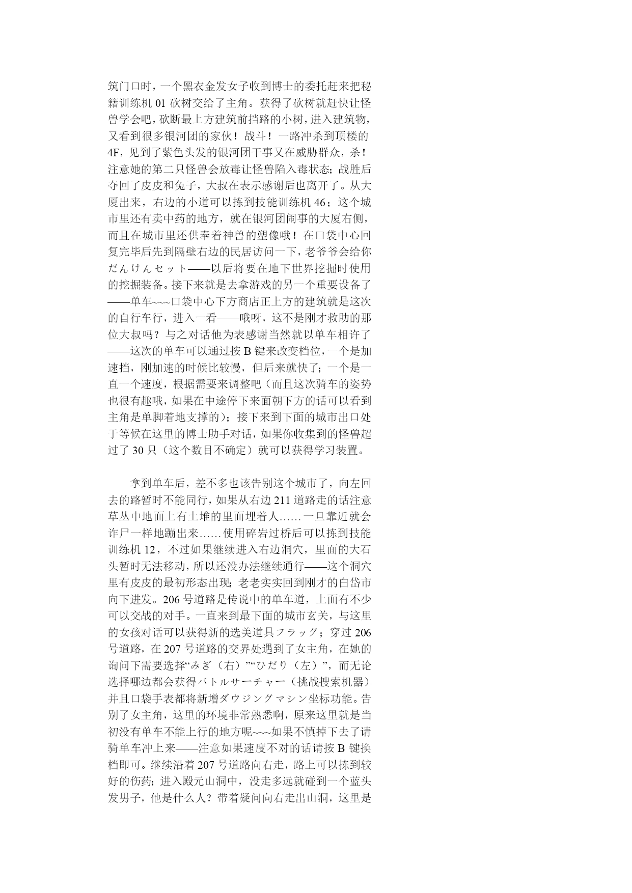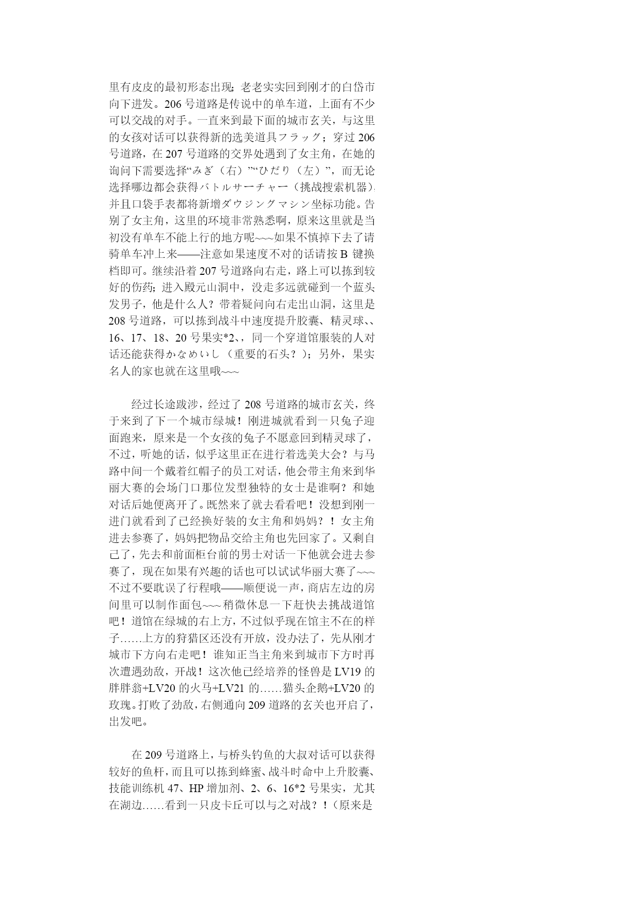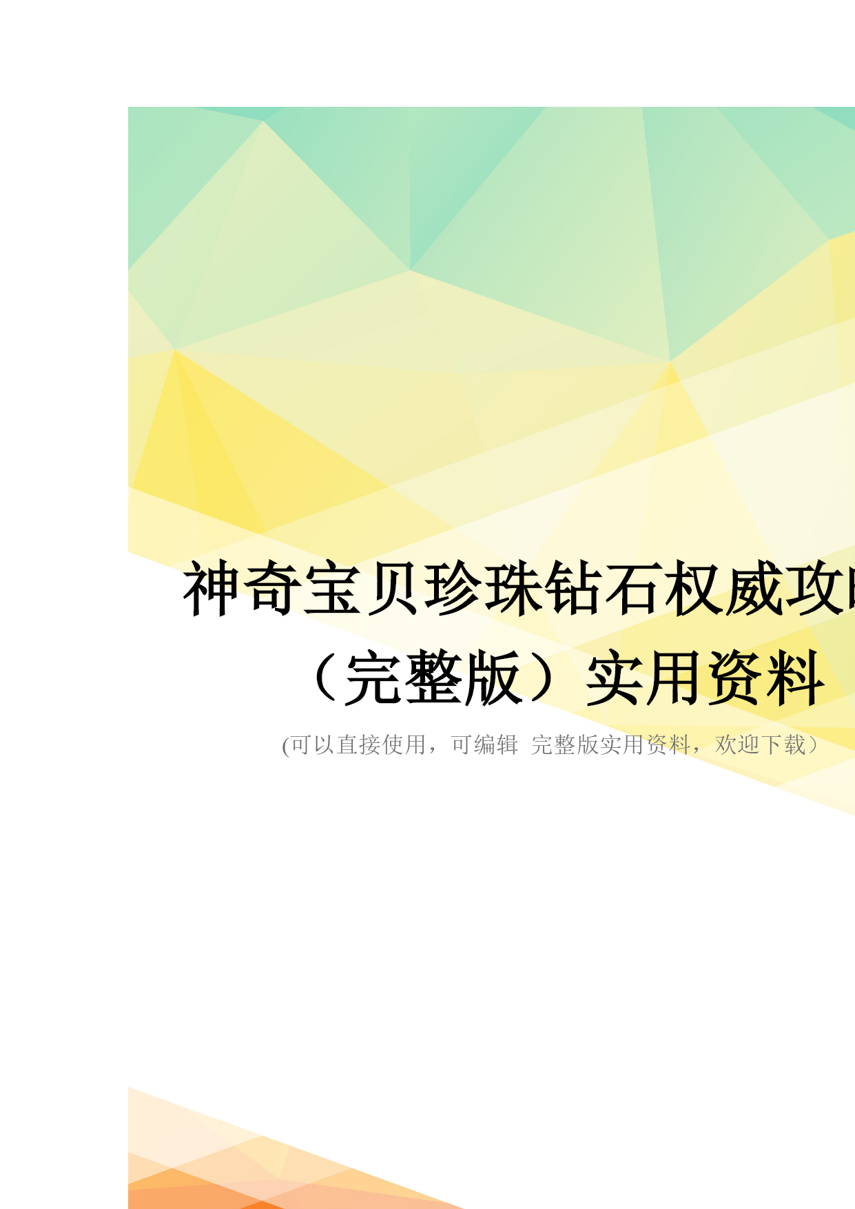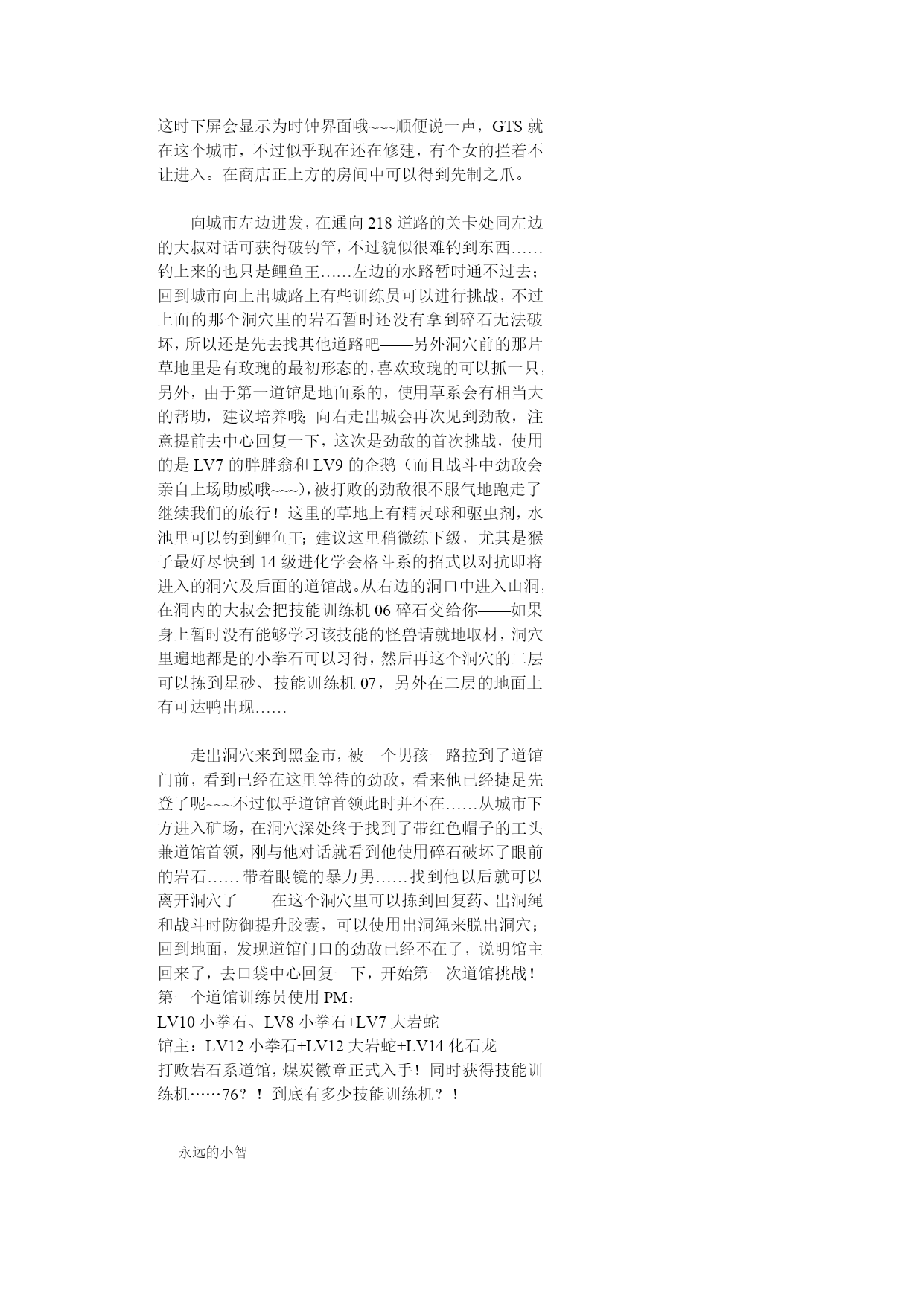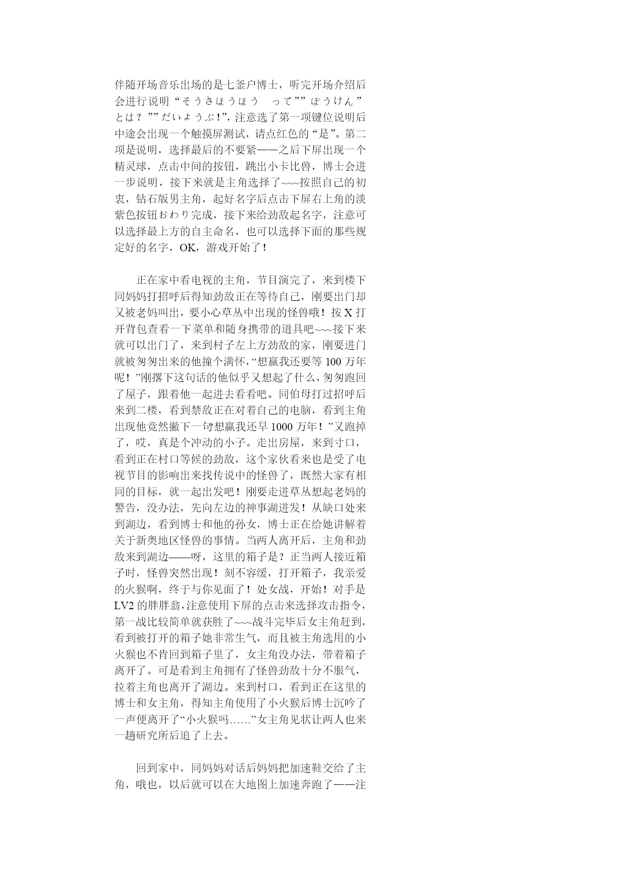 神奇宝贝珍珠钻石权威攻略!(完整版)实用资料(可以直接使用,可编辑完整版实用资料,欢迎下载)神奇宝贝珍珠钻石权威攻略!伴随开场音乐出场的是七釜户博士,听完开场介绍后会进行说明“そうさほうほうって””ぼうけん”とは?””だいようぶ!”,注意选了第一项键位说明后中途会出现一个触摸屏测试,请点红色的“是”。第二项是说明,选择最后的不要紧——之后下屏出现一个精灵球,点击中间的按钮,跳出小卡比兽,博士会进一步说明,接下来就是主角选择了~~~按照自己的初衷,钻石版男主角,起好名字后点击下屏右上角的淡紫色按钮おわり完成,接下来给劲敌起名字,注意可以选择最上方的自主命名,也可以选择下面的那些规定好的名字,OK,游戏开始了!正在家中看电视的主角,节目演完了,来到楼下同妈妈打招呼后得知劲敌正在等待自己,刚要出门却又被老妈叫出,要小心草丛中出现的怪兽哦!按X打开背包查看一下菜单和随身携带的道具吧~~~接下来就可以出门了,来到村子左上方劲敌的家,刚要进门就被匆匆出来的他撞个满怀,“想嬴我还要等100万年呢!”刚撂下这句话的他似乎又想起了什么,匆匆跑回了屋子,跟着他一起进去看看吧。同伯母打过招呼后来到二楼,看到禁敌正在对着自己的电脑,看到主角出现他竟然撇下一句“想赢我还早1000万年!”又跑掉了,哎,真是个冲动的小子。走出房屋,来到寸口,看到正在村口等候的劲敌,这个家伙看来也是受了电视节目的影响出来找传说中的怪兽了,既然大家有相同的目标,就一起出发吧!刚要走进草丛想起老妈的警告,没办法,先向左边的神事湖进发!从缺口处来到湖边,看到博士和他的孙女,博士正在给她讲解着关于新奥地区怪兽的事情。当两人离开后,主角和劲敌来到湖边——呀,这里的箱子是?正当两人接近箱子时,怪兽突然出现!刻不容缓,打开箱子,我亲爱的火猴啊,终于与你见面了!处女战,开始!对手是LV2的胖胖翁,注意使用下屏的点击来选择攻击指令,第一战比较简单就获胜了~~~战斗完毕后女主角赶到,看到被打开的箱子她非常生气,而且被主角选用的小火猴也不肯回到箱子里了,女主角没办法,带着箱子离开了。可是看到主角拥有了怪兽劲敌十分不服气,拉着主角也离开了湖边。来到村口,看到正在这里的博士和女主角,得知主角使用了小火猴后博士沉吟了一声便离开了“小火猴吗……”女主角见状让两人也来一趟研究所后追了上去。回到家中,同妈妈对话后妈妈把加速鞋交给了主角,哦也,以后就可以在大地图上加速奔跑了——注意这次在屋里也可以跑动哦!按住B键就OK了~~~这时就可以开始自由移动了!还是先去找博士吧,走出村庄,这次有了自己的怪兽就可以进入右边的草丛了,这里会出现胖胖翁和丸鼠,可以稍微练练级,注意HP。一路向右来到新的城市,看到女主角正在研究所门口等着。两人对话后刚要进入研究所,又被匆匆闯出的劲敌撞个满怀,他到底在急什么……进入研究所与博士对话后正式获得小火猴!之后博士把怪兽图鉴交给了主角,接下来就由作为导游小姐的女主角来向主角介绍口袋世界的各个建筑设施的用途了:恢复怪兽体力的口袋中心,贩卖各种道具的商店,这时女主角突然想起来让主角赶快去博士的研究所,似乎有急事,——此时继续向上走会被拦路的女主角挡住,说让主角回趟家,好吧,回家和老妈对话获得ぼうけんノート,这时劲敌的母亲也赶了过来,得知两人要出发旅行时把おとどけもの交给了主角,让他转交给劲敌。OK,家里的事情也交代完毕,可以安心去冒险了!再次来到女主角拦路的草坪,女主角会向主角演示如何捕获怪兽——顺便注意下道具的使用方法哦~~~之后会收到女主角的5个精灵球作为礼物。之后的道路就需要自己走了——注意,从此后会在道路上出现挑战的训练师,所以稍微练练级吧~~~永远的小智2006-10-412:03HYPERLINK"://tieba.baidu/"\l"sub"回复此发言2回复:神奇宝贝珍珠钻石权威攻略!沿202号道路前进,打败了几位路上的精灵训练员后来到长寿市,刚进入城市就迎来了女主角,似乎劲敌也在这个城市中。果然,在精灵中心左边的学校里找到了正在黑板前听课的劲敌,跟他对话把他家的钥匙交还给他,作为感谢,主角也从劲敌处获得了地图,在学校右边的训练场上可以与训练师对战,对手使用怪兽是LV6的凯西和。走出学校,从市中心的人的嘴里得知城市里有三个人会给你对奖券——在商店门口有一个小丑,跟他对话选择是将可以获得口袋手表的对奖券1;水池上方大厦门口处的小丑,也选是,获得对奖券3,最后一张在城市左侧飘红旗的大楼门口的小丑手里,同样也是选是就可以获得了。三张奖券入手,回到商店左边的那个人处,跟他对话就可以获得新的冒险工具口袋手表了!这时下屏会显示为时钟界面哦~~~顺便说一声,GTS就在这个城市,不过似乎现在还在修建,有个女的拦着不让进入。在商店正上方的房间中可以得到先制之爪。向城市左边进发,