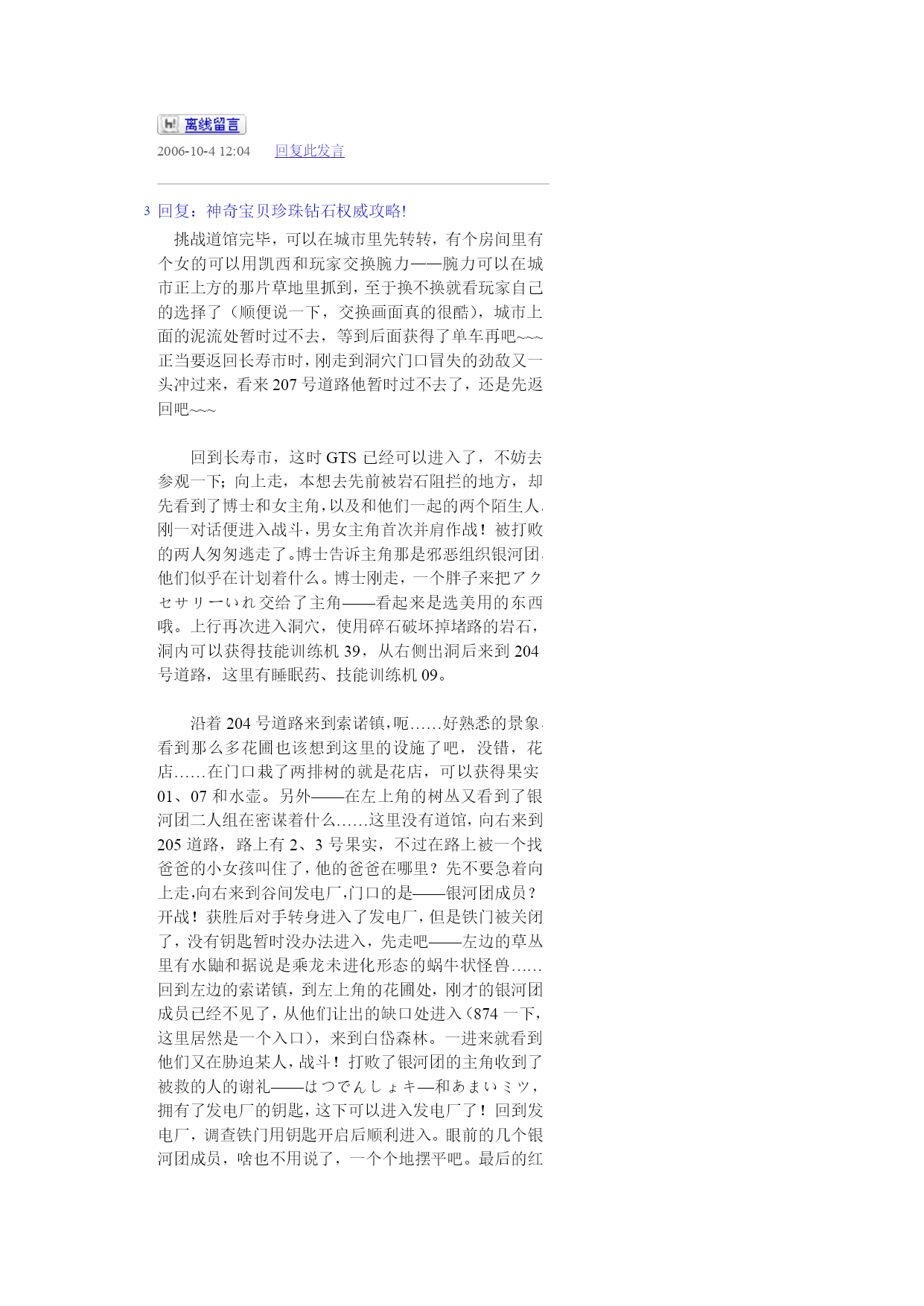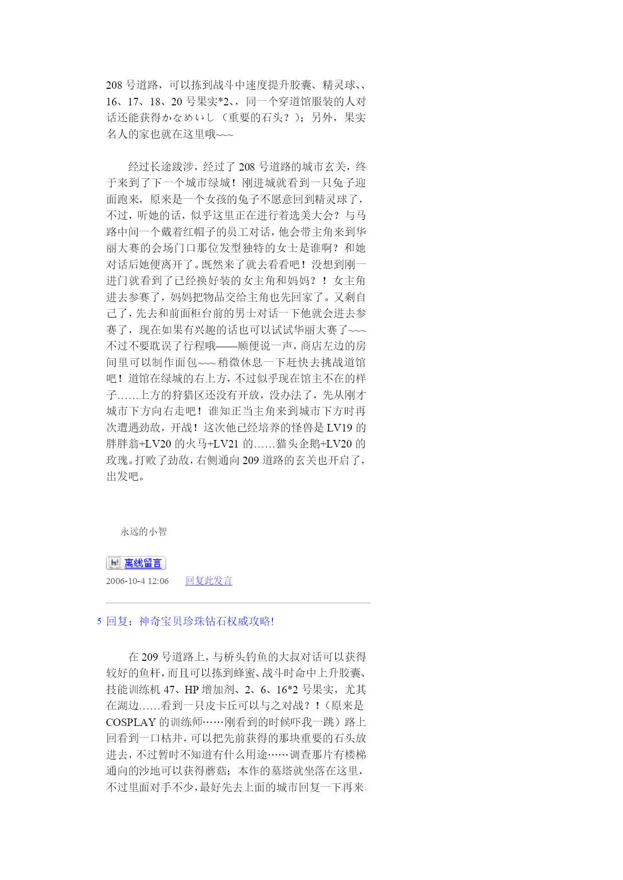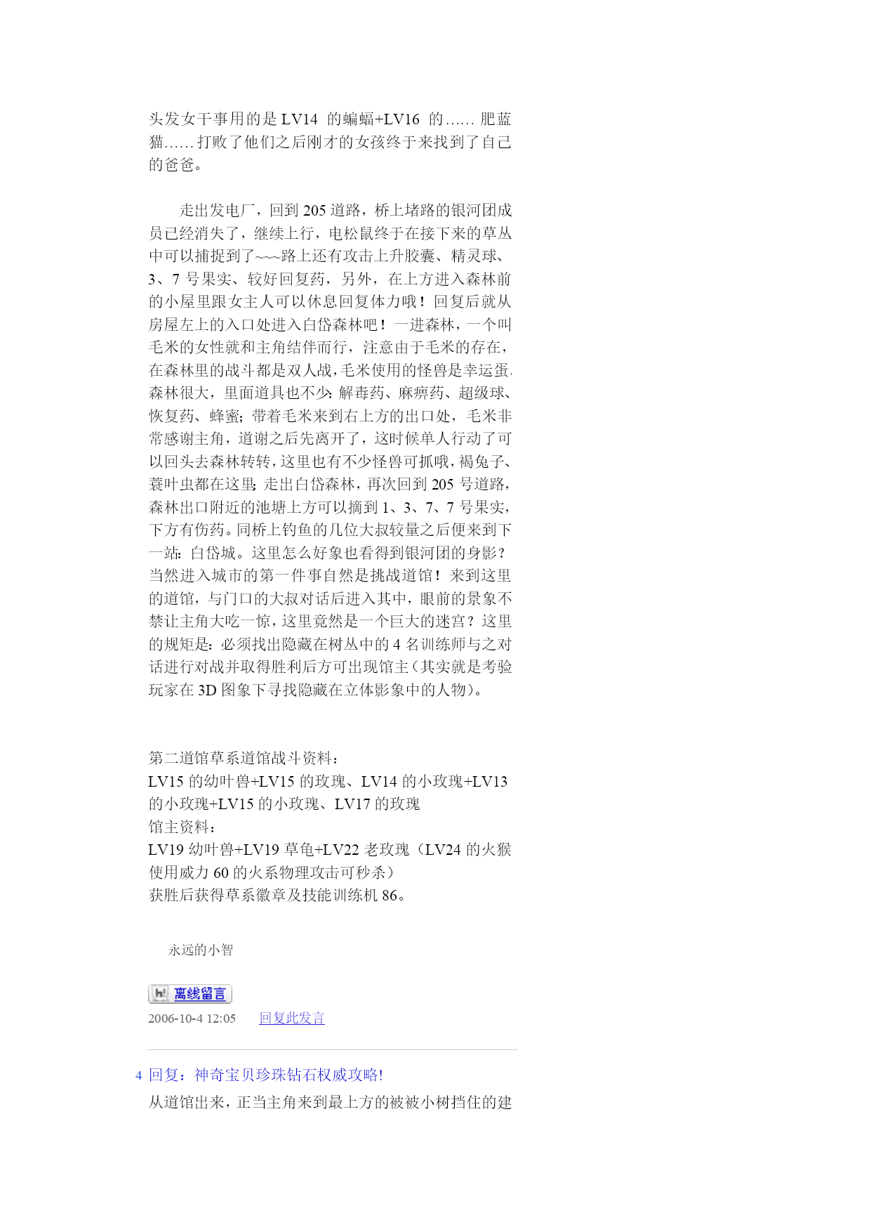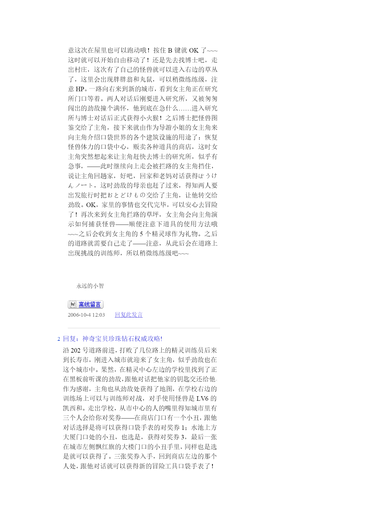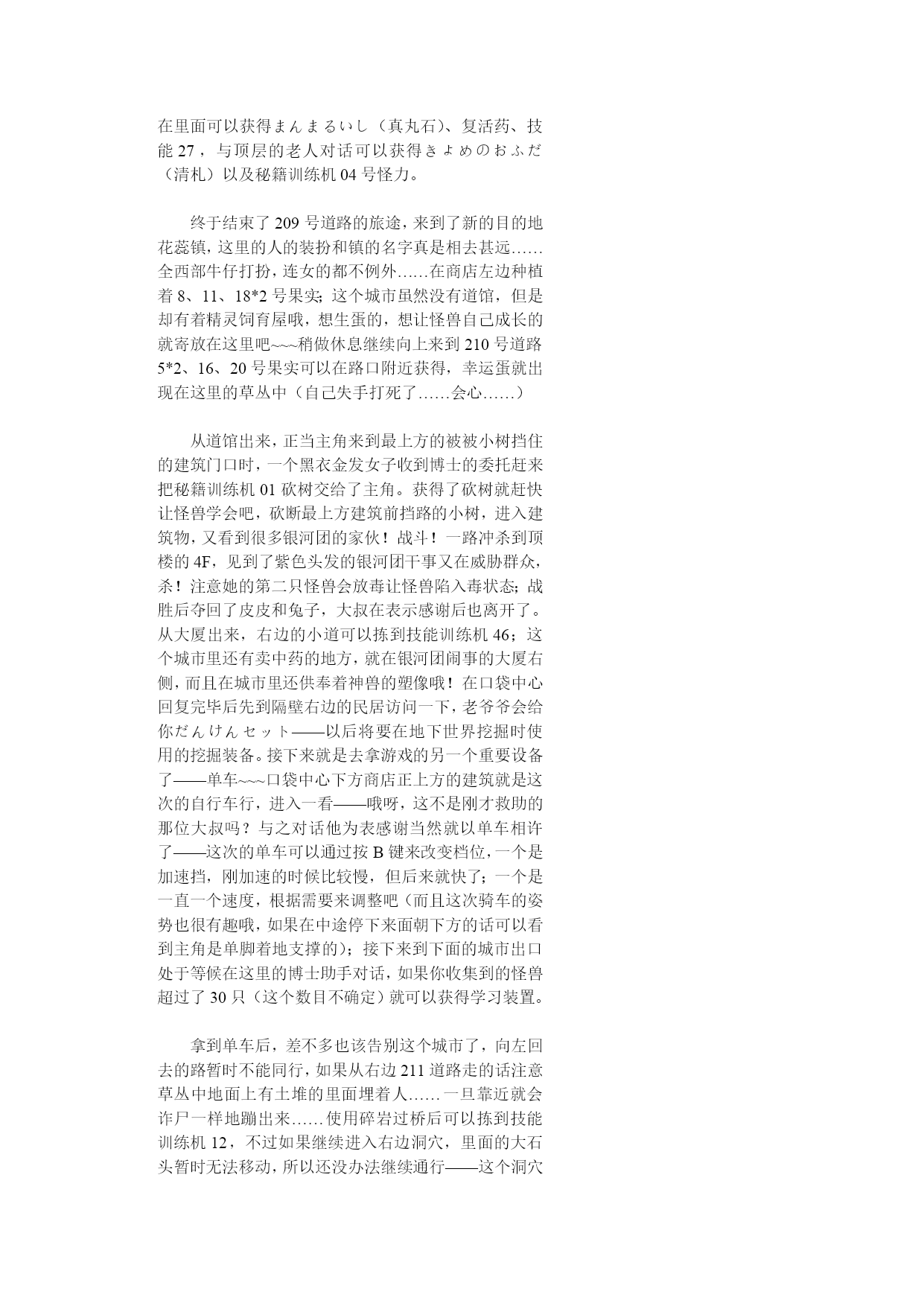 神奇宝贝珍珠钻石权威攻略!(完整版)实用资料(可以直接使用,可编辑完整版实用资料,欢迎下载)神奇宝贝珍珠钻石权威攻略!伴随开场音乐出场的是七釜户博士,听完开场介绍后会进行说明“そうさほうほうって””ぼうけん”とは?””だいようぶ!”,注意选了第一项键位说明后中途会出现一个触摸屏测试,请点红色的“是”。第二项是说明,选择最后的不要紧——之后下屏出现一个精灵球,点击中间的按钮,跳出小卡比兽,博士会进一步说明,接下来就是主角选择了~~~按照自己的初衷,钻石版男主角,起好名字后点击下屏右上角的淡紫色按钮おわり完成,接下来给劲敌起名字,注意可以选择最上方的自主命名,也可以选择下面的那些规定好的名字,OK,游戏开始了!正在家中看电视的主角,节目演完了,来到楼下同妈妈打招呼后得知劲敌正在等待自己,刚要出门却又被老妈叫出,要小心草丛中出现的怪兽哦!按X打开背包查看一下菜单和随身携带的道具吧~~~接下来就可以出门了,来到村子左上方劲敌的家,刚要进门就被匆匆出来的他撞个满怀,“想嬴我还要等100万年呢!”刚撂下这句话的他似乎又想起了什么,匆匆跑回了屋子,跟着他一起进去看看吧。同伯母打过招呼后来到二楼,看到禁敌正在对着自己的电脑,看到主角出现他竟然撇下一句“想赢我还早1000万年!”又跑掉了,哎,真是个冲动的小子。走出房屋,来到寸口,看到正在村口等候的劲敌,这个家伙看来也是受了电视节目的影响出来找传说中的怪兽了,既然大家有相同的目标,就一起出发吧!刚要走进草丛想起老妈的警告,没办法,先向左边的神事湖进发!从缺口处来到湖边,看到博士和他的孙女,博士正在给她讲解着关于新奥地区怪兽的事情。当两人离开后,主角和劲敌来到湖边——呀,这里的箱子是?正当两人接近箱子时,怪兽突然出现!刻不容缓,打开箱子,我亲爱的火猴啊,终于与你见面了!处女战,开始!对手是LV2的胖胖翁,注意使用下屏的点击来选择攻击指令,第一战比较简单就获胜了~~~战斗完毕后女主角赶到,看到被打开的箱子她非常生气,而且被主角选用的小火猴也不肯回到箱子里了,女主角没办法,带着箱子离开了。可是看到主角拥有了怪兽劲敌十分不服气,拉着主角也离开了湖边。来到村口,看到正在这里的博士和女主角,得知主角使用了小火猴后博士沉吟了一声便离开了“小火猴吗……”女主角见状让两人也来一趟研究所后追了上去。回到家中,同妈妈对话后妈妈把加速鞋交给了主角,哦也,以后就可以在大地图上加速奔跑了——注意这次在屋里也可以跑动哦!按住B键就OK了~~~这时就可以开始自由移动了!还是先去找博士吧,走出村庄,这次有了自己的怪兽就可以进入右边的草丛了,这里会出现胖胖翁和丸鼠,可以稍微练练级,注意HP。一路向右来到新的城市,看到女主角正在研究所门口等着。两人对话后刚要进入研究所,又被匆匆闯出的劲敌撞个满怀,他到底在急什么……进入研究所与博士对话后正式获得小火猴!之后博士把怪兽图鉴交给了主角,接下来就由作为导游小姐的女主角来向主角介绍口袋世界的各个建筑设施的用途了:恢复怪兽体力的口袋中心,贩卖各种道具的商店,这时女主角突然想起来让主角赶快去博士的研究所,似乎有急事,——此时继续向上走会被拦路的女主角挡住,说让主角回趟家,好吧,回家和老妈对话获得ぼうけんノート,这时劲敌的母亲也赶了过来,得知两人要出发旅行时把おとどけもの交给了主角,让他转交给劲敌。OK,家里的事情也交代完毕,可以安心去冒险了!再次来到女主角拦路的草坪,女主角会向主角演示如何捕获怪兽——顺便注意下道具的使用方法哦~~~之后会收到女主角的5个精灵球作为礼物。之后的道路就需要自己走了——注意,从此后会在道路上出现挑战的训练师,所以稍微练练级吧~~~永远的小智2006-10-412:03HYPERLINK"://tieba.baidu/"\l"sub"回复此发言2回复:神奇宝贝珍珠钻石权威攻略!沿202号道路前进,打败了几位路上的精灵训练员后来到长寿市,刚进入城市就迎来了女主角,似乎劲敌也在这个城市中。果然,在精灵中心左边的学校里找到了正在黑板前听课的劲敌,跟他对话把他家的钥匙交还给他,作为感谢,主角也从劲敌处获得了地图,在学校右边的训练场上可以与训练师对战,对手使用怪兽是LV6的凯西和。走出学校,从市中心的人的嘴里得知城市里有三个人会给你对奖券——在商店门口有一个小丑,跟他对话选择是将可以获得口袋手表的对奖券1;水池上方大厦门口处的小丑,也选是,获得对奖券3,最后一张在城市左侧飘红旗的大楼门口的小丑手里,同样也是选是就可以获得了。三张奖券入手,回到商店左边的那个人处,跟他对话就可以获得新的冒险工具口袋手表了!这时下屏会显示为时钟界面哦~~~顺便说一声,GTS就在这个城市,不过似乎现在还在修建,有个女的拦着不让进入。在商店正上方的房间中可以得到先制之爪。向城市左边进发,
