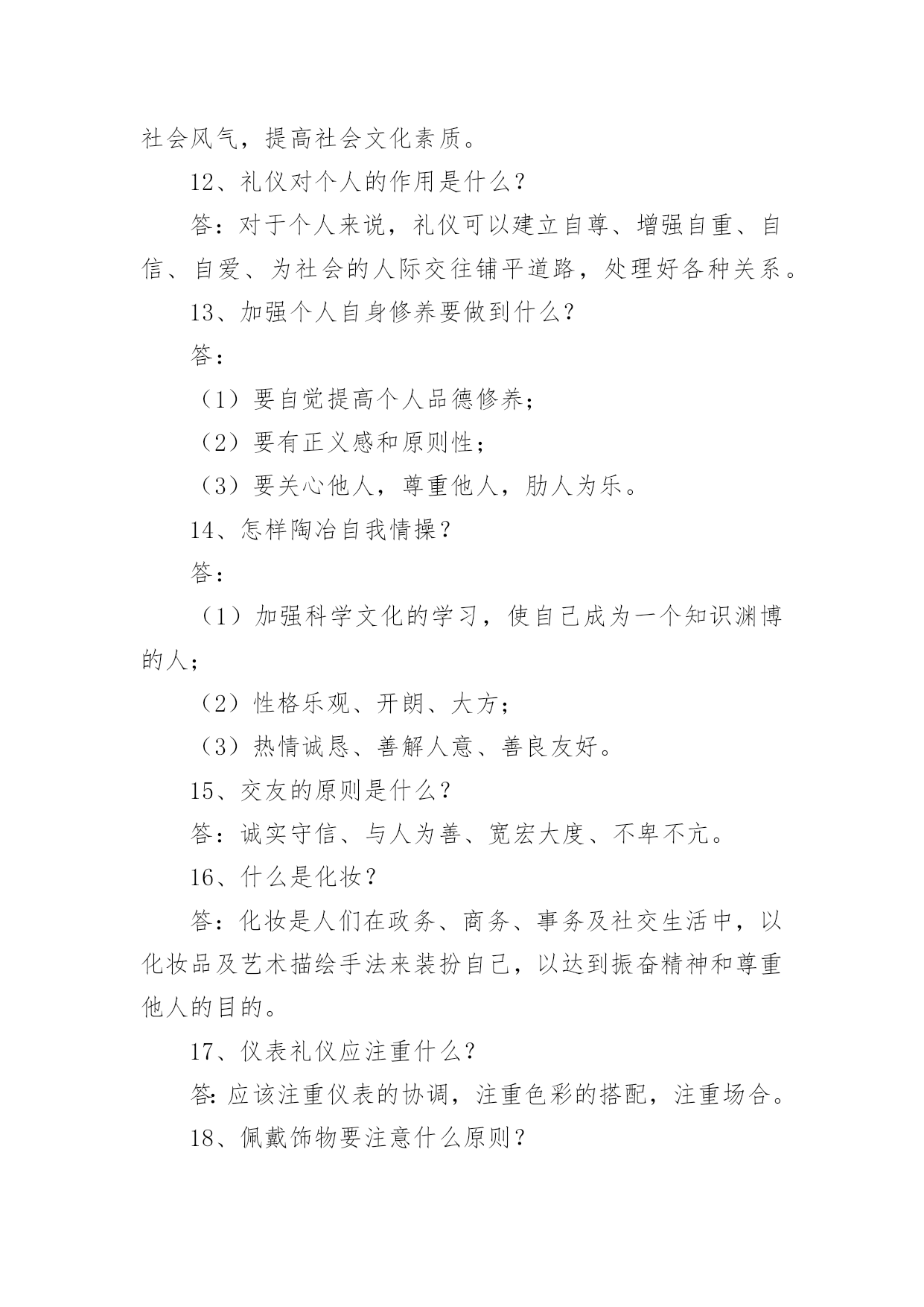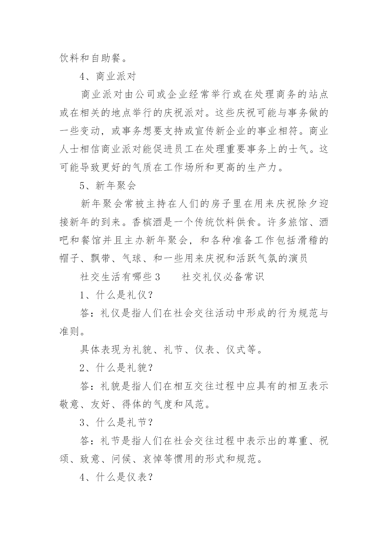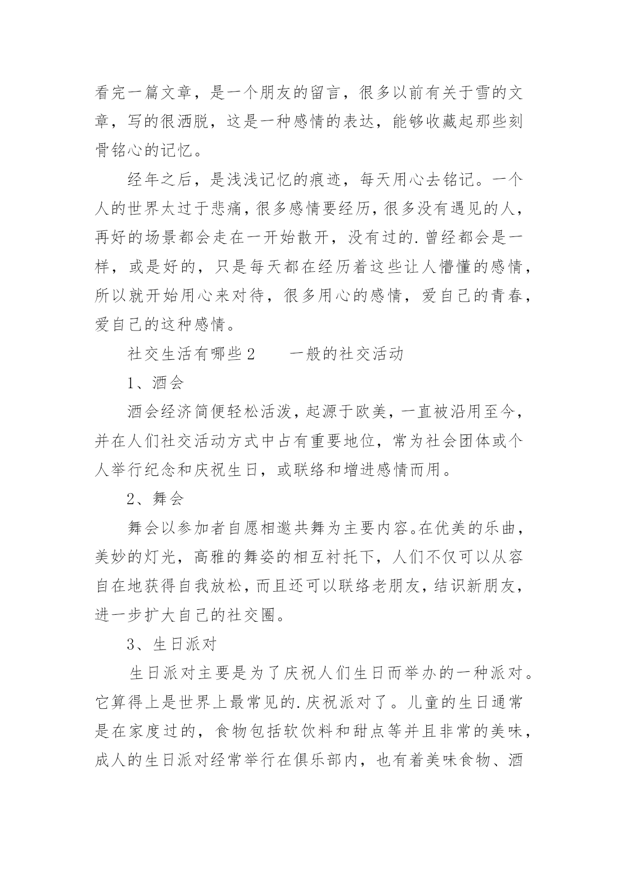 社交生活有哪些社交生活有哪些,在我们生活中,人与人之间的交往是必须要进行社交的,社交的好处可以让我们变得外向阳光,还能获得很多知识,下面跟随我具体了解社交生活有哪些。社交生活有哪些1社交活动有义工活动、跳舞交际、英语角活动、健身团课、同城活动等;1、义工活动:每个城市都有各种各样的义工活动,义工活动可以传递爱心,传播文明,有助于建立和谐社会,义工活动帮助志愿者融入社会,增强归属感,通过义工活动,能有效地帮助服务对象扩大社交圈子,增强对人、对社会的信心;2、跳舞课程:就算不会跳舞也没有关系,大多数的舞蹈课程老师还会要求你们进行身体接触,因为可以经常交换舞伴,可以认识更多的人;3、英语角:基本每个城市都会有英语角的活动,可以遇到一些在外企工作或者刚来这个城市的朋友;4、健身团课:参加健身团课是增加社交面的良好方式,参加健身团课的学员,大多是成功人士;5、同城活动:参加同一座城有共同爱好者组成的团体,会交往到更多的朋友。个人的社交活动交友,亲友聚交谈心拉家常,工作交流,谈恋爱等,特别是还记得有一年的初冬很冷,那一天在宿舍里坐在电脑前看完一篇文章,是一个朋友的留言,很多以前有关于雪的文章,写的很洒脱,这是一种感情的表达,能够收藏起那些刻骨铭心的记忆。经年之后,是浅浅记忆的痕迹,每天用心去铭记。一个人的世界太过于悲痛,很多感情要经历,很多没有遇见的人,再好的场景都会走在一开始散开,没有过的.曾经都会是一样,或是好的,只是每天都在经历着这些让人懵懂的感情,所以就开始用心来对待,很多用心的感情,爱自己的青春,爱自己的这种感情。社交生活有哪些2一般的社交活动1、酒会酒会经济简便轻松活泼,起源于欧美,一直被沿用至今,并在人们社交活动方式中占有重要地位,常为社会团体或个人举行纪念和庆祝生日,或联络和增进感情而用。2、舞会舞会以参加者自愿相邀共舞为主要内容。在优美的乐曲,美妙的灯光,高雅的舞姿的相互衬托下,人们不仅可以从容自在地获得自我放松,而且还可以联络老朋友,结识新朋友,进一步扩大自己的社交圈。3、生日派对生日派对主要是为了庆祝人们生日而举办的一种派对。它算得上是世界上最常见的.庆祝派对了。儿童的生日通常是在家度过的,食物包括软饮料和甜点等并且非常的美味,成人的生日派对经常举行在俱乐部内,也有着美味食物、酒饮料和自助餐。4、商业派对商业派对由公司或企业经常举行或在处理商务的站点或在相关的地点举行的庆祝派对。这些庆祝可能与事务做的一些变动,或事务想要支持或宣传新企业的事业相符。商业人士相信商业派对能促进员工在处理重要事务上的士气。这可能导致更好的气质在工作场所和更高的生产力。5、新年聚会新年聚会常被主持在人们的房子里在用来庆祝除夕迎接新年的到来。香槟酒是一个传统饮料供食。许多旅馆、酒吧和餐馆并且主办新年聚会,和各种准备工作包括滑稽的帽子、飘带、气球、和一些用来庆祝和活跃气氛的演员社交生活有哪些3社交礼仪必备常识1、什么是礼仪?答:礼仪是指人们在社会交往活动中形成的行为规范与准则。具体表现为礼貌、礼节、仪表、仪式等。2、什么是礼貌?答:礼貌是指人们在相互交往过程中应具有的相互表示敬意、友好、得体的气度和风范。3、什么是礼节?答:礼节是指人们在社会交往过程中表示出的尊重、祝颂、致意、问候、哀悼等惯用的形式和规范。4、什么是仪表?答:仪表是指人的外表。如容貌、服饰、姿态等。5、什么是仪式?答:仪式是指在定场合举行的、具有专门程序、规范化的活动。如发奖仪式、签字仪式、开幕式等。6、礼仪的六个基本特征是什么?答:共同性、继承性、统一性、差异性、阶级影响性、时代发展性。7、礼仪的四个原则是什么?答:尊重的原则、遵守的原则、适度的原则、自律的原则。8、礼仪的四个功能是什么?答:沟通功能、协调功能、维护功能、教育功能。9、为什么说我国是“文明古国,礼仪之邦”?答:我国是历史悠久的文明古国,几千年来创造了灿烂的文化,形成了高尚的道德准则、完整的礼仪规范,被世人称为“文明古国,礼仪之邦”。10、为什么要讲究礼仪?答:讲究礼仪并非是个人生活小节或小事,而是一个国家社会风气的现实反映,是一个民族精神文明和进步的.重要标志。11、礼仪对社会的作用是什么?答:对社会来说,礼仪能够改善人们的道德观念,净化社会风气,提高社会文化素质。12、礼仪对个人的作用是什么?答:对于个人来说,礼仪可以建立自尊、增强自重、自信、自爱、为社会的人际交往铺平道路,处理好各种关系。13、加强个人自身修养要做到什么?答:(1)要自觉提高个人品德修养;(2)要有正义感和原则性;(3)要关心他人,尊重他人,肋人为乐。14、怎样陶冶自我情操?答:(1)加强科学文化的学习,使自己成为一个知识渊博的人;(2)性格乐观、开朗、大方;(3)热情诚恳、善解人意、善良友好。15、交友的原则是什么?答:诚实守信、与