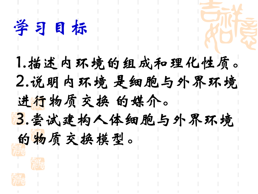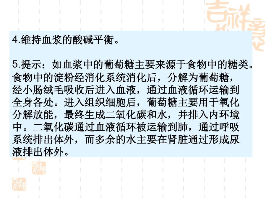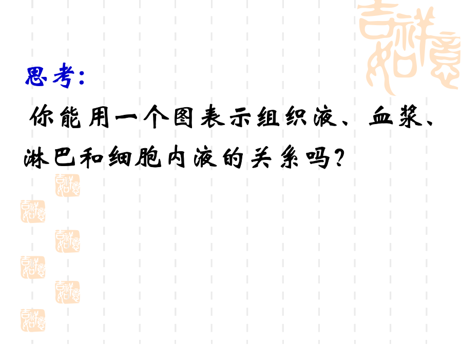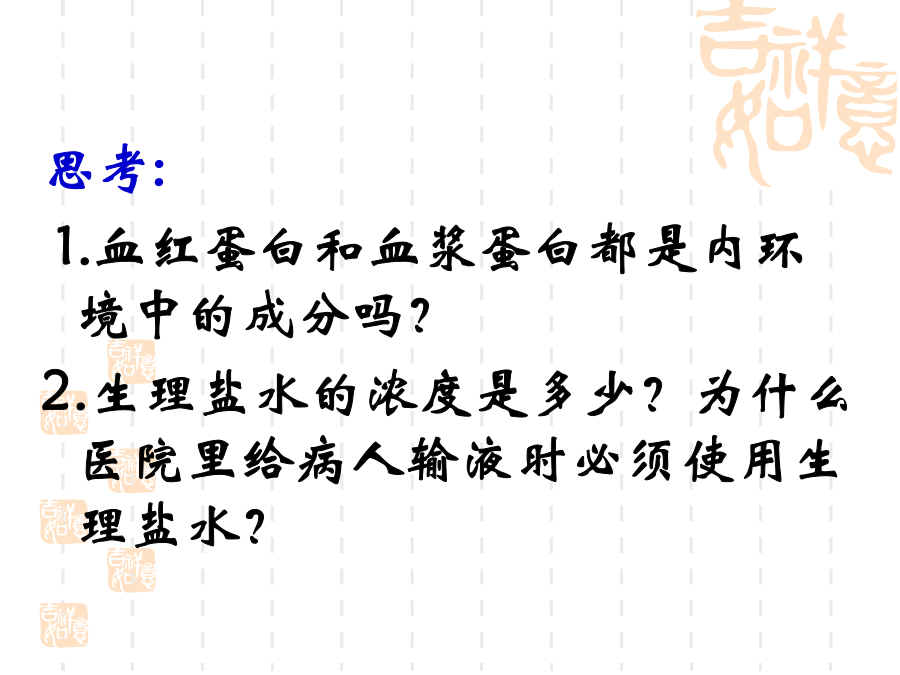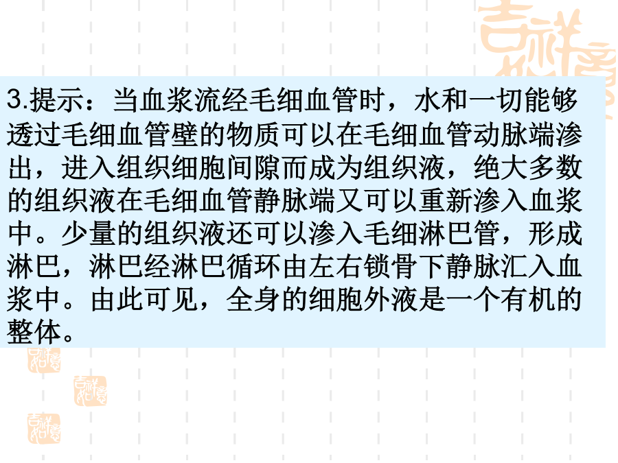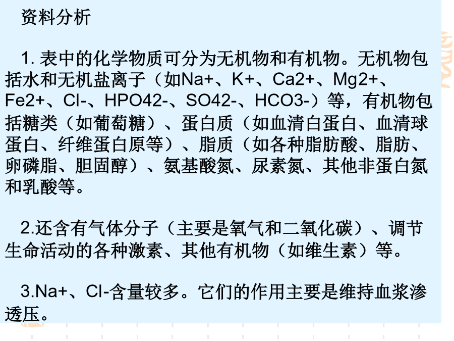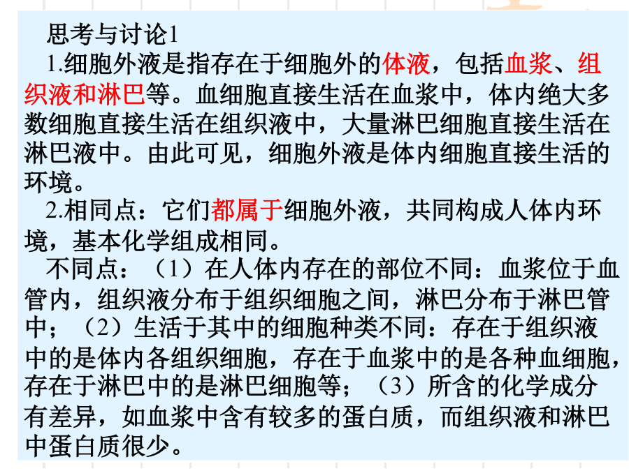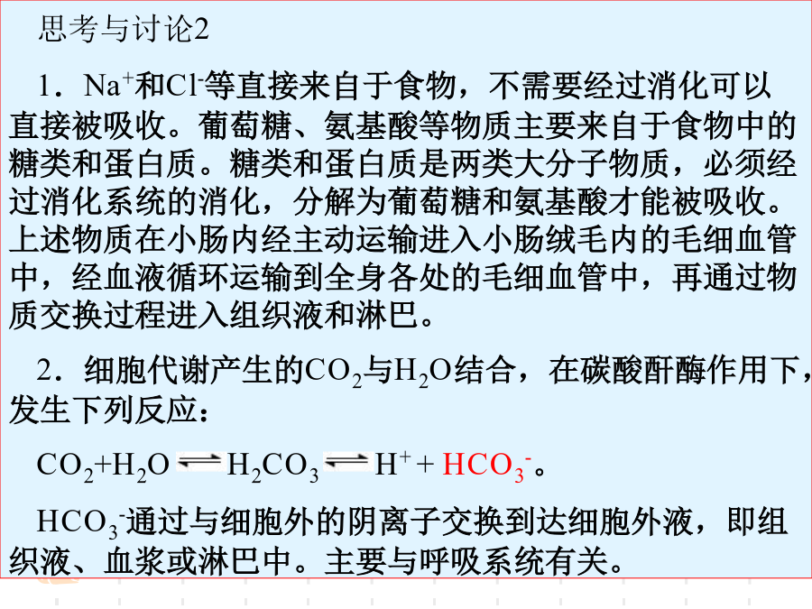 第一章人体的内环境与稳态1.图1中是人体血液中的血细胞,包括红细胞、白细胞等;图2中是单细胞动物草履虫。学习目标思考与讨论11.细胞外液是指存在于细胞外的体液,包括血浆、组织液和淋巴等。血细胞直接生活在血浆中,体内绝大多数细胞直接生活在组织液中,大量淋巴细胞直接生活在淋巴液中。由此可见,细胞外液是体内细胞直接生活的环境。2.相同点:它们都属于细胞外液,共同构成人体内环境,基本化学组成相同。不同点:(1)在人体内存在的部位不同:血浆位于血管内,组织液分布于组织细胞之间,淋巴分布于淋巴管中;(2)生活于其中的细胞种类不同:存在于组织液中的是体内各组织细胞,存在于血浆中的是各种血细胞,存在于淋巴中的是淋巴细胞等;(3)所含的化学成分有差异,如血浆中含有较多的蛋白质,而组织液和淋巴中蛋白质很少。3.提示:当血浆流经毛细血管时,水和一切能够透过毛细血管壁的物质可以在毛细血管动脉端渗出,进入组织细胞间隙而成为组织液,绝大多数的组织液在毛细血管静脉端又可以重新渗入血浆中。少量的组织液还可以渗入毛细淋巴管,形成淋巴,淋巴经淋巴循环由左右锁骨下静脉汇入血浆中。由此可见,全身的细胞外液是一个有机的整体。思考:你能用一个图表示组织液、血浆、淋巴和细胞内液的关系吗?资料分析1.表中的化学物质可分为无机物和有机物。无机物包括水和无机盐离子(如Na+、K+、Ca2+、Mg2+、Fe2+、Cl-、HPO42-、SO42-、HCO3-)等,有机物包括糖类(如葡萄糖)、蛋白质(如血清白蛋白、血清球蛋白、纤维蛋白原等)、脂质(如各种脂肪酸、脂肪、卵磷脂、胆固醇)、氨基酸氮、尿素氮、其他非蛋白氮和乳酸等。2.还含有气体分子(主要是氧气和二氧化碳)、调节生命活动的各种激素、其他有机物(如维生素)等。3.Na+、Cl-含量较多。它们的作用主要是维持血浆渗透压。4.维持血浆的酸碱平衡。5.提示:如血浆中的葡萄糖主要来源于食物中的糖类。食物中的淀粉经消化系统消化后,分解为葡萄糖,经小肠绒毛吸收后进入血液,通过血液循环运输到全身各处。进入组织细胞后,葡萄糖主要用于氧化分解放能,最终生成二氧化碳和水,并排入内环境中。二氧化碳通过血液循环被运输到肺,通过呼吸系统排出体外,而多余的水主要在肾脏通过形成尿液排出体外。思考:1.血红蛋白和血浆蛋白都是内环境中的成分吗?2.生理盐水的浓度是多少?为什么医院里给病人输液时必须使用生理盐水?思考与讨论21.Na+和Cl-等直接来自于食物,不需要经过消化可以直接被吸收。葡萄糖、氨基酸等物质主要来自于食物中的糖类和蛋白质。糖类和蛋白质是两类大分子物质,必须经过消化系统的消化,分解为葡萄糖和氨基酸才能被吸收。上述物质在小肠内经主动运输进入小肠绒毛内的毛细血管中,经血液循环运输到全身各处的毛细血管中,再通过物质交换过程进入组织液和淋巴。2.细胞代谢产生的CO2与H2O结合,在碳酸酐酶作用下,发生下列反应:CO2+H2OH2CO3H++HCO3-。HCO3-通过与细胞外的阴离子交换到达细胞外液,即组织液、血浆或淋巴中。主要与呼吸系统有关。3.提示:人体具有体温调节机制以保持细胞外液温度的恒定。详细内容可参考教材第2章关于人体体温调节的内容。参与体温调节的器官和系统有皮肤、肝脏、骨骼肌、神经系统、内分泌系统、呼吸系统等。4.提示:体内细胞产生的代谢废物主要通过皮肤分泌汗液,泌尿系统形成、排出尿液和呼吸系统的呼气这三条途径来排出,其中以泌尿系统和呼吸系统的排泄途径为主。例如,血浆中的尿素主要通过肾脏形成的尿液排出体外。血浆中的CO2通过肺动脉进入肺泡周围的毛细血管,由于血液中的CO2分压大于肺泡中CO2的分压,CO2就从血液中向肺泡扩散,再通过呼气运动将其排出体外。思考:不同条件下,组织液浓度升高或血浆、细胞内液浓度下降,引起水分移动,使血浆、细胞内液中的水渗透到组织液引起水肿现象。你能分析一下哪些原因会引起水肿吗?一、体内细胞生活在细胞外液中淋巴毛细淋巴管中的淋巴汇集到淋巴管中,经过淋巴循环由左右锁骨下静脉汇入血浆中,进入心脏,参与全身的血液循环。根据以上介绍,请用箭头连线的方式,将组织细胞和内环境中组织液、血浆和淋巴的关系表示出来CO2和代谢废物血浆、组织液和淋巴通过动态的有机联系,共同构成机体内细胞生活的直接环境。为了区别于个体生活的外界环境,人们把这个由细胞外液构成的液体环境叫做内环境。思考:1、毛细血管和毛细淋巴管管壁细胞的直接(具体)生活环境分别是什么?研究表明,血浆中约有90﹪为水;其余10﹪分别是:无机盐(约1%),蛋白质(约7%-9%),以及血液运送的物质,包括各种营养物质(如葡萄糖)、各种代谢废物、气体、激素等。三、细胞外液的渗透压和酸碱度(2)酸碱度渗透压、酸碱度和温度是细胞外液理化性质的