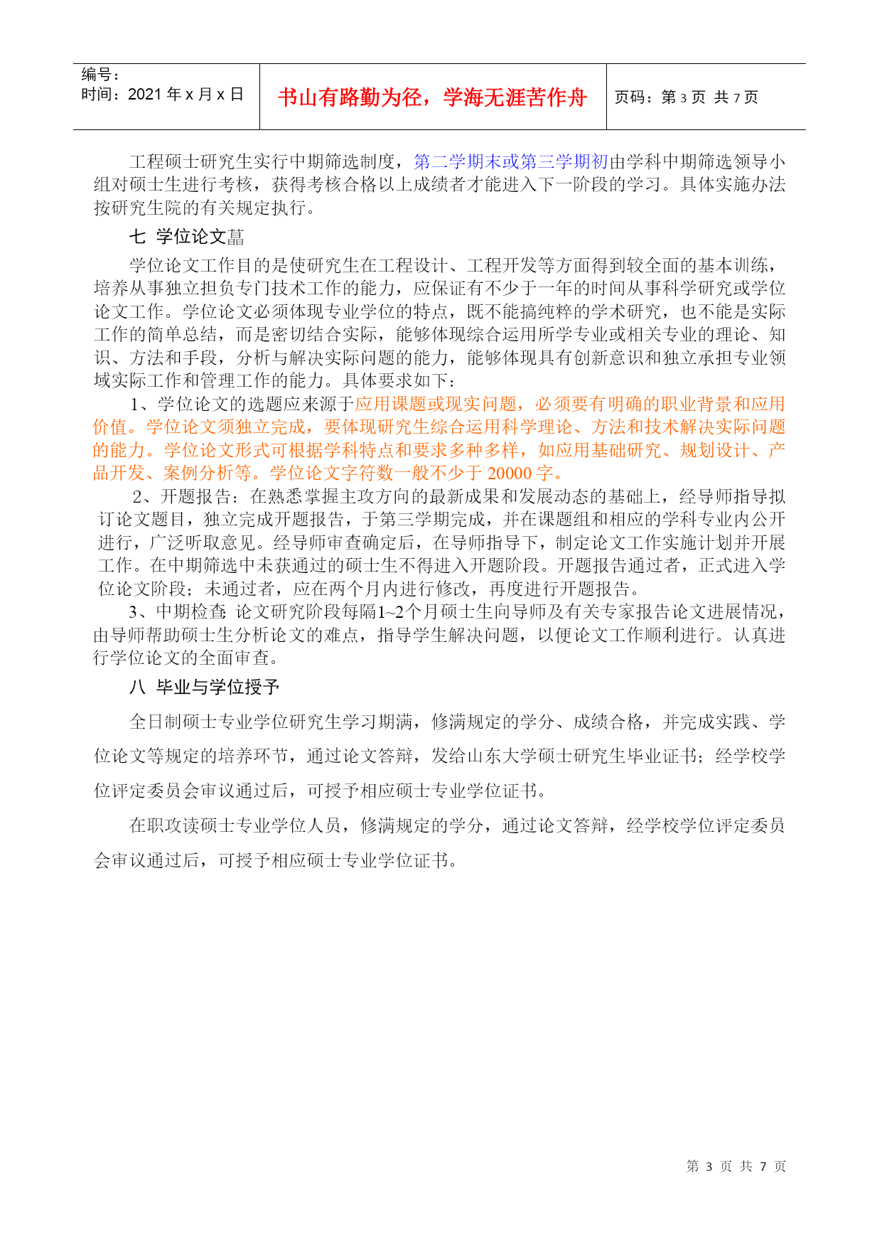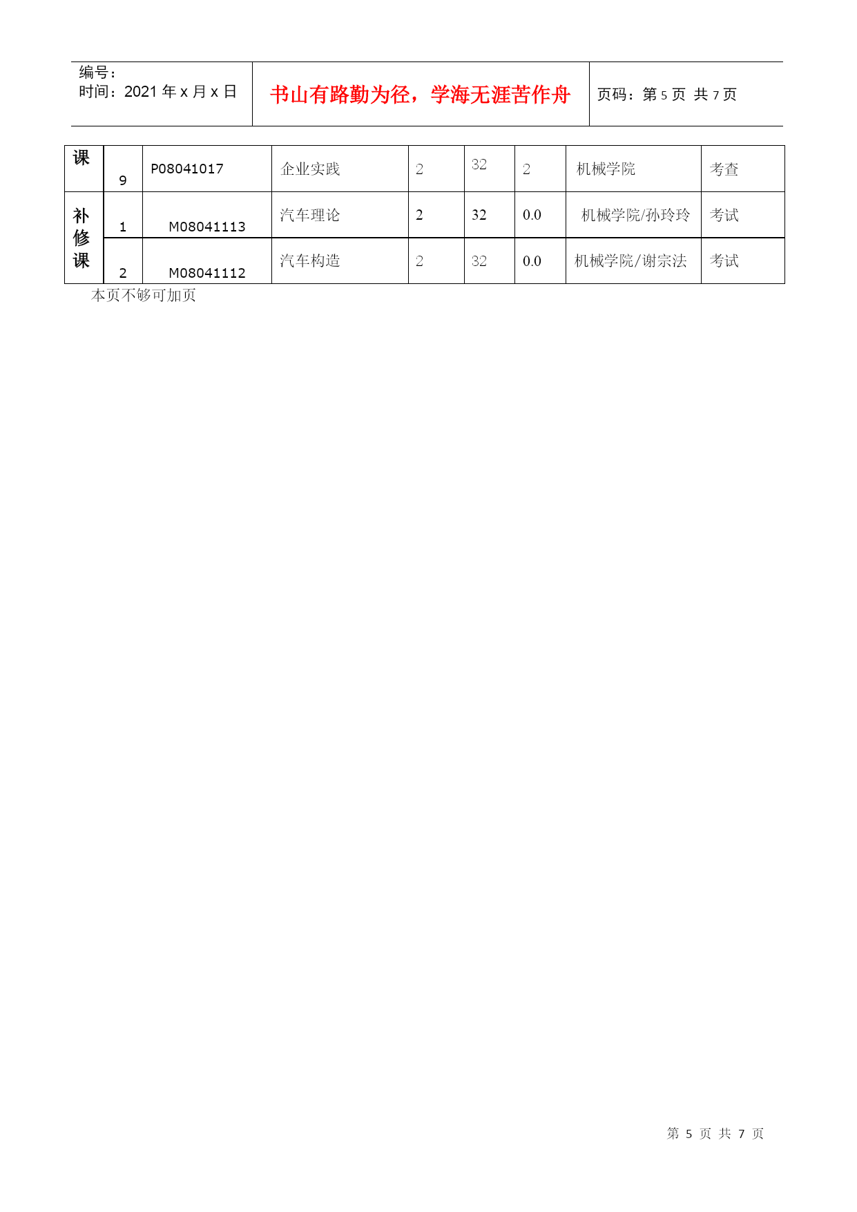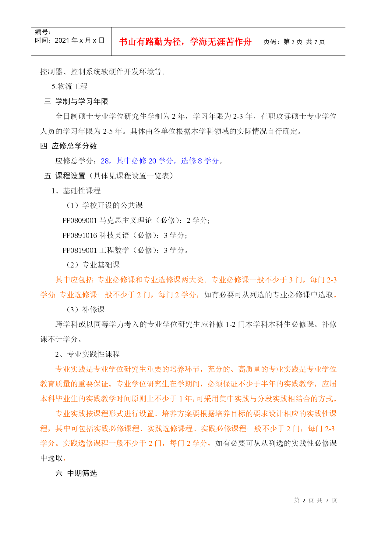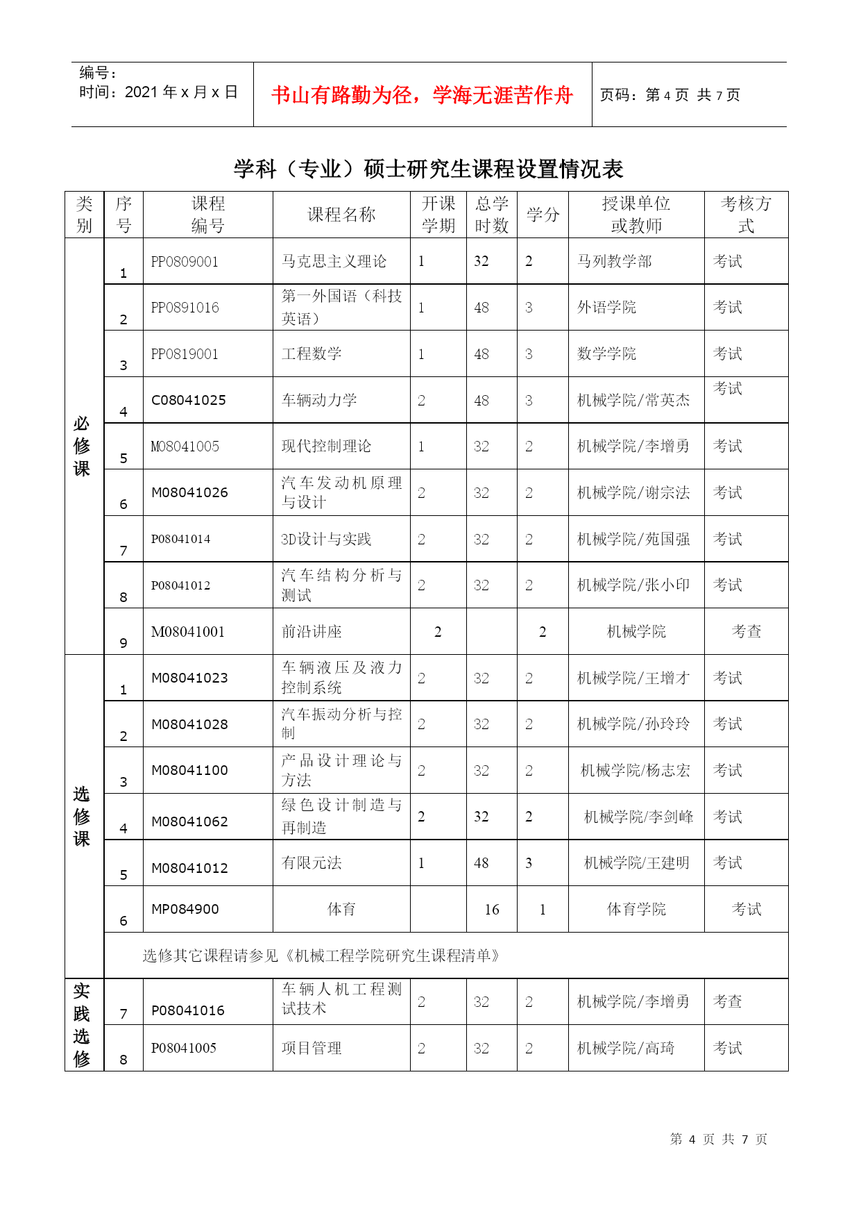 编号:时间:2021年x月x日书山有路勤为径,学海无涯苦作舟页码:第PAGE7页共NUMPAGES7页第PAGE\*MERGEFORMAT7页共NUMPAGES\*MERGEFORMAT7页附件2车辆工程学科或专业攻读硕士专业学位研究生培养方案(专业代码:430135)一培养目标培养掌握车辆工程领域坚实的基础理论和宽广的专业知识、具有较强的解决实际问题的能力,能够承担专业技术或管理工作、具有良好的职业素养的高层次应用型专门人才。具体要求为:1.掌握马克思主义、毛泽东思想和邓小平基本理论,坚持四项基本原则,能正确理解与执行党和国家的基本路线、方针、政策,遵纪守法,具有良好的职业道德和创新精神,积极为我国经济建设和社会发展服务。2.掌握较坚实的理论基础和较宽广的专业知识,具备职业要求的知识结构、思维特征和应用能力。3.能综合运用专业知识,分析问题、解决问题,具有创新意识和独立承担专业领域实际工作和管理工作的能力。4.比较熟练地掌握一门外语,能较顺利地阅读本专业外文资料。5.具有健康的体魄和心理素质。二研究方向1.发动机工作过程与排放主要以提高和改善车用发动机动力性、经济性、可靠性及排放指标为目标,从发动机工作原理和结构方面进行研究,以适应各种车辆对发动机的要求。2.汽车安全与人机工程该研究方向基于人机工程学的理论和方法,应用多传感器信息融合技术,监测汽车驾驶行为;以及应用数字化设计技术,进行车辆人机界面优化设计,提高汽车驾乘安全性、舒适性。3.车辆系统动力学与控制主要研究汽车振动与噪声控制、汽车横向稳定系统,主动转向系统等。4.汽车电子控制主要研究内容包括现代汽车动力及底盘控制系统、汽车电子网络与控制、嵌入式车载控制器、控制系统软硬件开发环境等。5.物流工程三学制与学习年限全日制硕士专业学位研究生学制为2年,学习年限为2-3年。在职攻读硕士专业学位人员的学习年限为2-5年。具体由各单位根据本学科领域的实际情况自行确定。四应修总学分数应修总学分:28,其中必修20学分,选修8学分。五课程设置(具体见课程设置一览表)1、基础性课程(1)学校开设的公共课PP0809001马克思主义理论(必修):2学分;PP0891016科技英语(必修):3学分;PP0819001工程数学(必修):3学分。(2)专业基础课其中应包括:专业必修课和专业选修课两大类。专业必修课一般不少于3门,每门2-3学分;专业选修课一般不少于2门,每门2学分,如有必要可从列选的专业必修课中选取。(3)补修课跨学科或以同等学力考入的专业学位研究生应补修1-2门本学科本科生必修课。补修课不计学分。2、专业实践性课程专业实践是专业学位研究生重要的培养环节,充分的、高质量的专业实践是专业学位教育质量的重要保证。专业学位研究生在学期间,必须保证不少于半年的实践教学,应届本科毕业生的实践教学时间原则上不少于1年,可采用集中实践与分段实践相结合的方式。专业实践按课程形式进行设置。培养方案要根据培养目标的要求设计相应的实践性课程,其中可包括实践必修课程、实践选修课程。实践必修课程一般不少于2门,每门2-3学分。实践选修课程一般不少于2门,每门2学分,如有必要可从从列选的实践性必修课中选取。六中期筛选工程硕士研究生实行中期筛选制度,第二学期末或第三学期初由学科中期筛选领导小组对硕士生进行考核,获得考核合格以上成绩者才能进入下一阶段的学习。具体实施办法按研究生院的有关规定执行。七学位论文学位论文工作目的是使研究生在工程设计、工程开发等方面得到较全面的基本训练,培养从事独立担负专门技术工作的能力,应保证有不少于一年的时间从事科学研究或学位论文工作。学位论文必须体现专业学位的特点,既不能搞纯粹的学术研究,也不能是实际工作的简单总结,而是密切结合实际,能够体现综合运用所学专业或相关专业的理论、知识、方法和手段,分析与解决实际问题的能力,能够体现具有创新意识和独立承担专业领域实际工作和管理工作的能力。具体要求如下:1、学位论文的选题应来源于应用课题或现实问题,必须要有明确的职业背景和应用价值。学位论文须独立完成,要体现研究生综合运用科学理论、方法和技术解决实际问题的能力。学位论文形式可根据学科特点和要求多种多样,如应用基础研究、规划设计、产品开发、案例分析等。学位论文字符数一般不少于20000字。2、开题报告:在熟悉掌握主攻方向的最新成果和发展动态的基础上,经导师指导拟订论文题目,独立完成开题报告,于第三学期完成,并在课题组和相应的学科专业内公开进行,广泛听取意见。经导师审查确定后,在导师指导下,制定论文工作实施计划并开展工作。在中期筛选中未获通过的硕士生不得进入开题阶段。开题