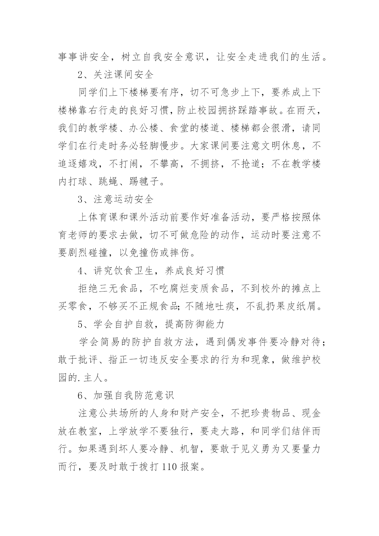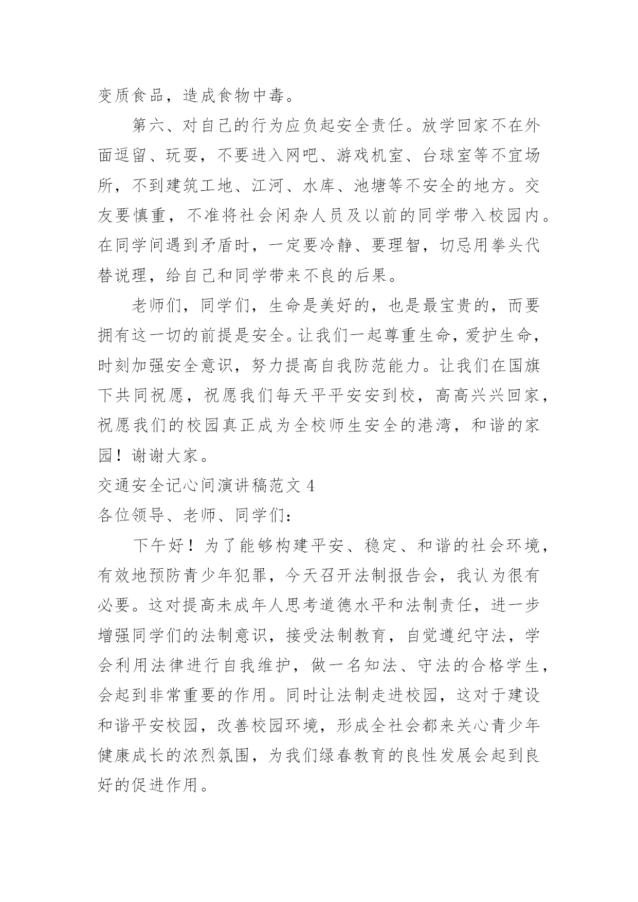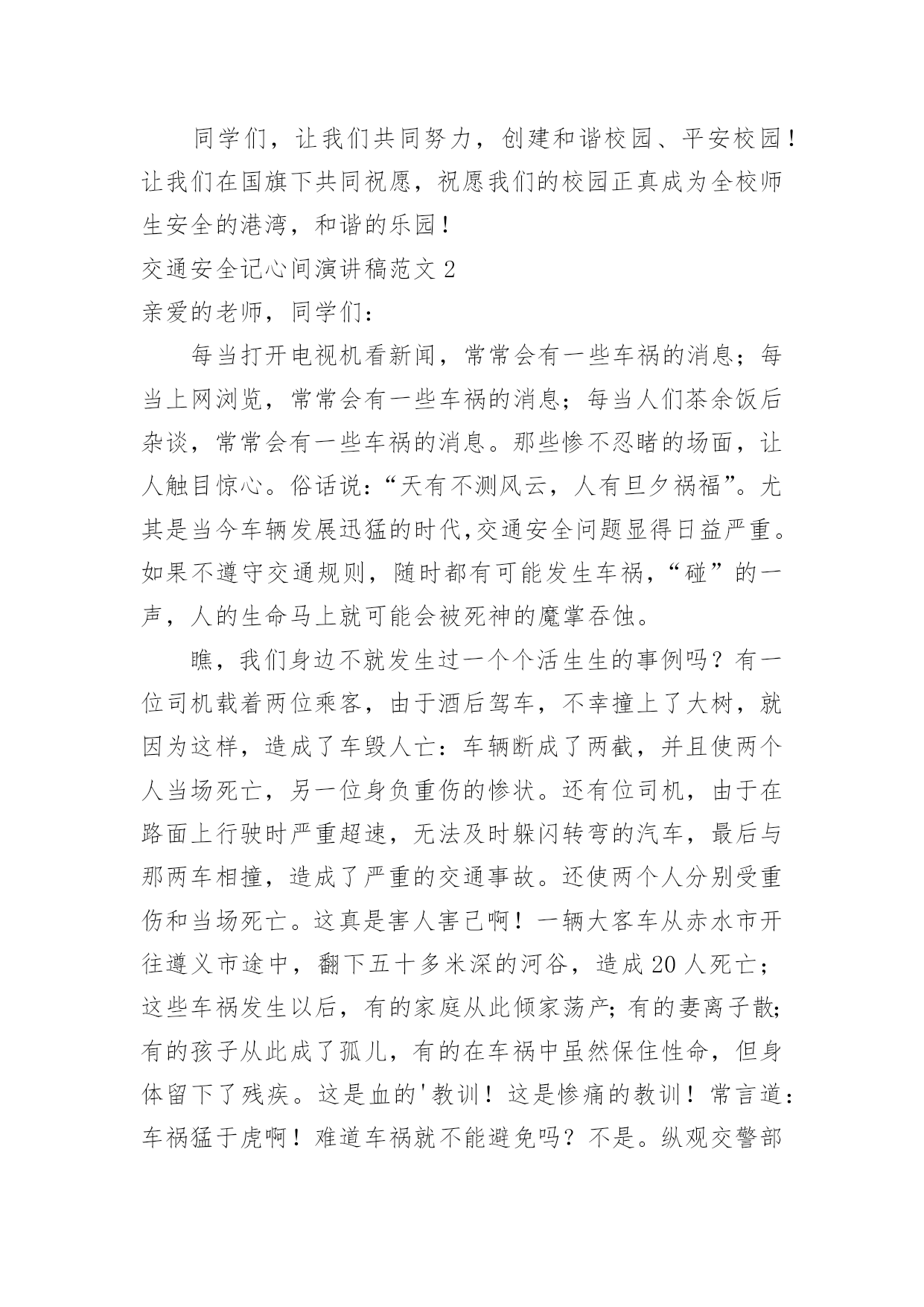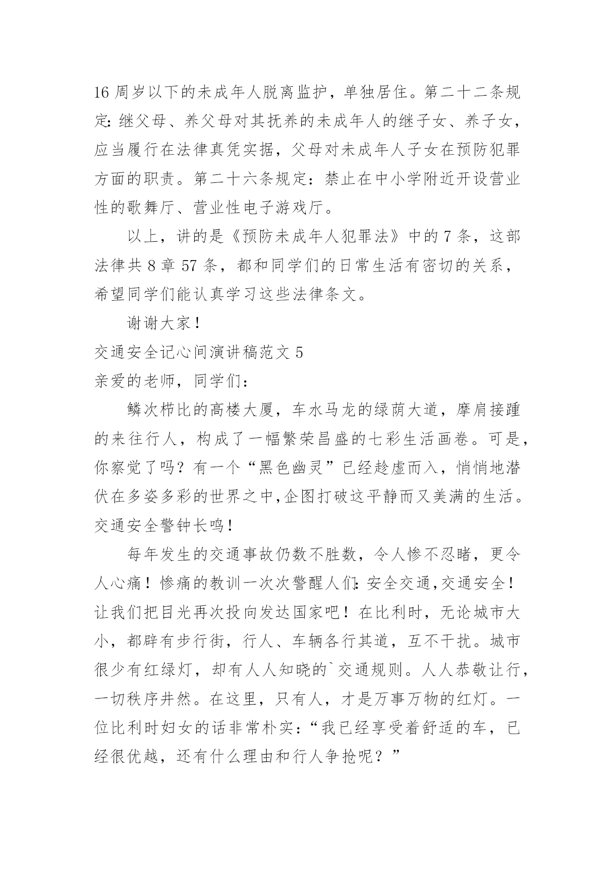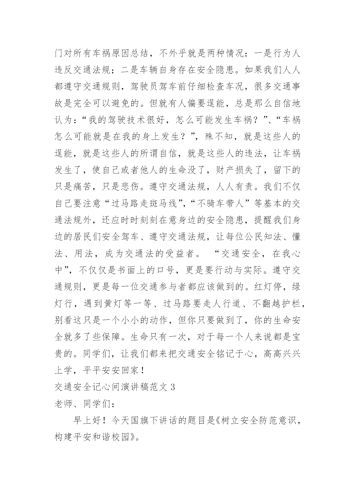 交通安全记心间演讲稿交通安全记心间演讲稿范文通过对演讲稿语言的推究可以提高语言的表现力,增强语言的感染力。在现实社会中,演讲稿在我们的视野里出现的频率越来越高,如何写一份恰当的演讲稿呢?下面是小编收集整理的交通安全记心间演讲稿范文,仅供参考,希望能够帮助到大家。交通安全记心间演讲稿范文1亲爱的老师,同学们:大家好!学校是我们学习生活的家园,校园的安全它关系到我们能否安全健康的成长,关系到千千万万个家庭的幸福安宁,甚至是整个社会的和谐稳定。所以,校园的美丽和安全应该由我们共同来维护创造。但是,我们学校里同学多、地方小,漫步校园,我们经常会看见许多不安全的因素。比如说:课余时间在走廊或教室里追逐打闹,下楼梯时几步并作一步飞身而下,攀爬后山和篮球架,体育课上不听从老师的安排指令等等。在这里向全校同学提出如下要求:1、树立自我安全意识我们要有高度的安全意识、文明意识,要时时想安全,事事讲安全,树立自我安全意识,让安全走进我们的生活。2、关注课间安全同学们上下楼梯要有序,切不可急步上下,要养成上下楼梯靠右行走的良好习惯,防止校园拥挤踩踏事故。在雨天,我们的教学楼、办公楼、食堂的楼道、楼梯都会很滑,请同学们在行走时务必轻脚慢步。大家课间要注意文明休息,不追逐嬉戏,不打闹,不攀高,不拥挤,不抢道;不在教学楼内打球、跳蝇、踢毽子。3、注意运动安全上体育课和课外活动前要作好准备活动,要严格按照体育老师的要求去做,切不可做危险的动作,运动时要注意不要剧烈碰撞,以免撞伤或摔伤。4、讲究饮食卫生,养成良好习惯拒绝三无食品,不吃腐烂变质食品,不到校外的摊点上买零食,不够买不正规食品;不随地吐痰,不乱扔果皮纸屑。5、学会自护自救,提高防御能力学会简易的防护自救方法,遇到偶发事件要冷静对待;敢于批评、指正一切违反安全要求的行为和现象,做维护校园的.主人。6、加强自我防范意识注意公共场所的人身和财产安全,不把珍贵物品、现金放在教室,上学放学不要独行,要走大路,和同学们结伴而行。如果遇到坏人要冷静、机智,要敢于见义勇为又要量力而行,要及时敢于拨打110报案。同学们,让我们共同努力,创建和谐校园、平安校园!让我们在国旗下共同祝愿,祝愿我们的校园正真成为全校师生安全的港湾,和谐的乐园!交通安全记心间演讲稿范文2亲爱的老师,同学们:每当打开电视机看新闻,常常会有一些车祸的消息;每当上网浏览,常常会有一些车祸的消息;每当人们茶余饭后杂谈,常常会有一些车祸的消息。那些惨不忍睹的场面,让人触目惊心。俗话说:“天有不测风云,人有旦夕祸福”。尤其是当今车辆发展迅猛的时代,交通安全问题显得日益严重。如果不遵守交通规则,随时都有可能发生车祸,“碰”的一声,人的生命马上就可能会被死神的魔掌吞蚀。瞧,我们身边不就发生过一个个活生生的事例吗?有一位司机载着两位乘客,由于酒后驾车,不幸撞上了大树,就因为这样,造成了车毁人亡:车辆断成了两截,并且使两个人当场死亡,另一位身负重伤的惨状。还有位司机,由于在路面上行驶时严重超速,无法及时躲闪转弯的汽车,最后与那两车相撞,造成了严重的交通事故。还使两个人分别受重伤和当场死亡。这真是害人害己啊!一辆大客车从赤水市开往遵义市途中,翻下五十多米深的河谷,造成20人死亡;这些车祸发生以后,有的家庭从此倾家荡产;有的妻离子散;有的孩子从此成了孤儿,有的在车祸中虽然保住性命,但身体留下了残疾。这是血的'教训!这是惨痛的教训!常言道:车祸猛于虎啊!难道车祸就不能避免吗?不是。纵观交警部门对所有车祸原因总结,不外乎就是两种情况:一是行为人违反交通法规;二是车辆自身存在安全隐患。如果我们人人都遵守交通规则,驾驶员驾车前仔细检查车况,很多交通事故是完全可以避免的。但就有人偏要逞能,总是那么自信地认为:“我的驾驶技术很好,怎么可能发生车祸?”、“车祸怎么可能就是在我的身上发生?”,殊不知,就是这些人的逞能,就是这些人的所谓自信,就是这些人的违法,让车祸发生了,使自己或者他人的生命没了,财产损失了,留下的只是痛苦,只是悲伤。遵守交通法规,人人有责。我们不仅自己要注意“过马路走斑马线”,“不骑车带人”等基本的交通法规外,还应时时刻刻在意身边的安全隐患,提醒我们身边的居民们安全驾车、遵守交通法规,让每位公民知法、懂法、用法,成为交通法的受益者。“交通安全,在我心中”,不仅仅是书面上的口号,更是要行动与实际。遵守交通规则,更是每一位交通参与者都应该做到的。红灯停,绿灯行,遇到黄灯等一等、过马路要走人行道、不翻越护栏,别看这只是一个小小的动作,但你只要做到了,你的生命安全就多了些保障。生命只有一次,对于每一个人来说都是宝贵的。同学们,让我们都来把交通安全铭记于心,高高兴兴上学,平平安安回家!交通安全记心间演讲稿范文3老师、同学们:早上好!今天国旗下讲话的题目是《树立安全防范