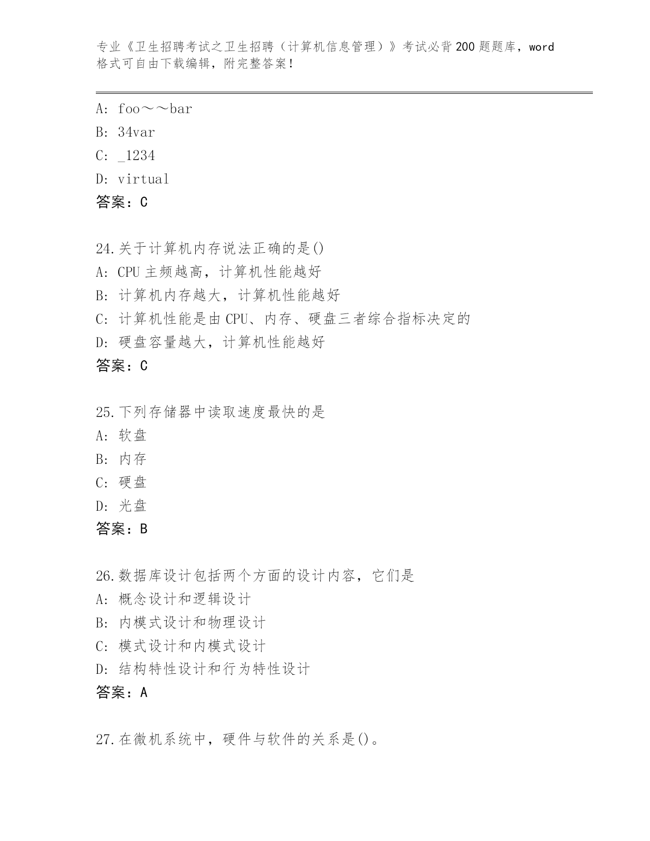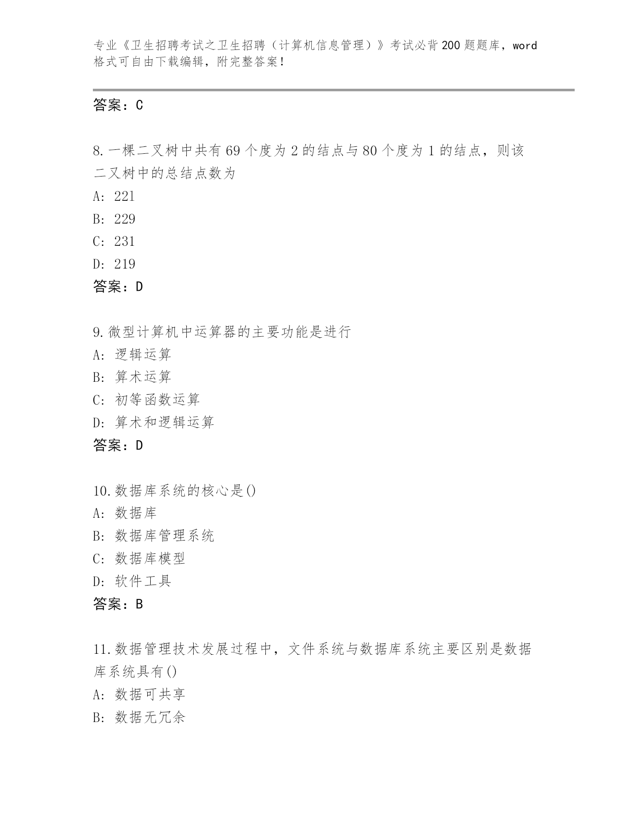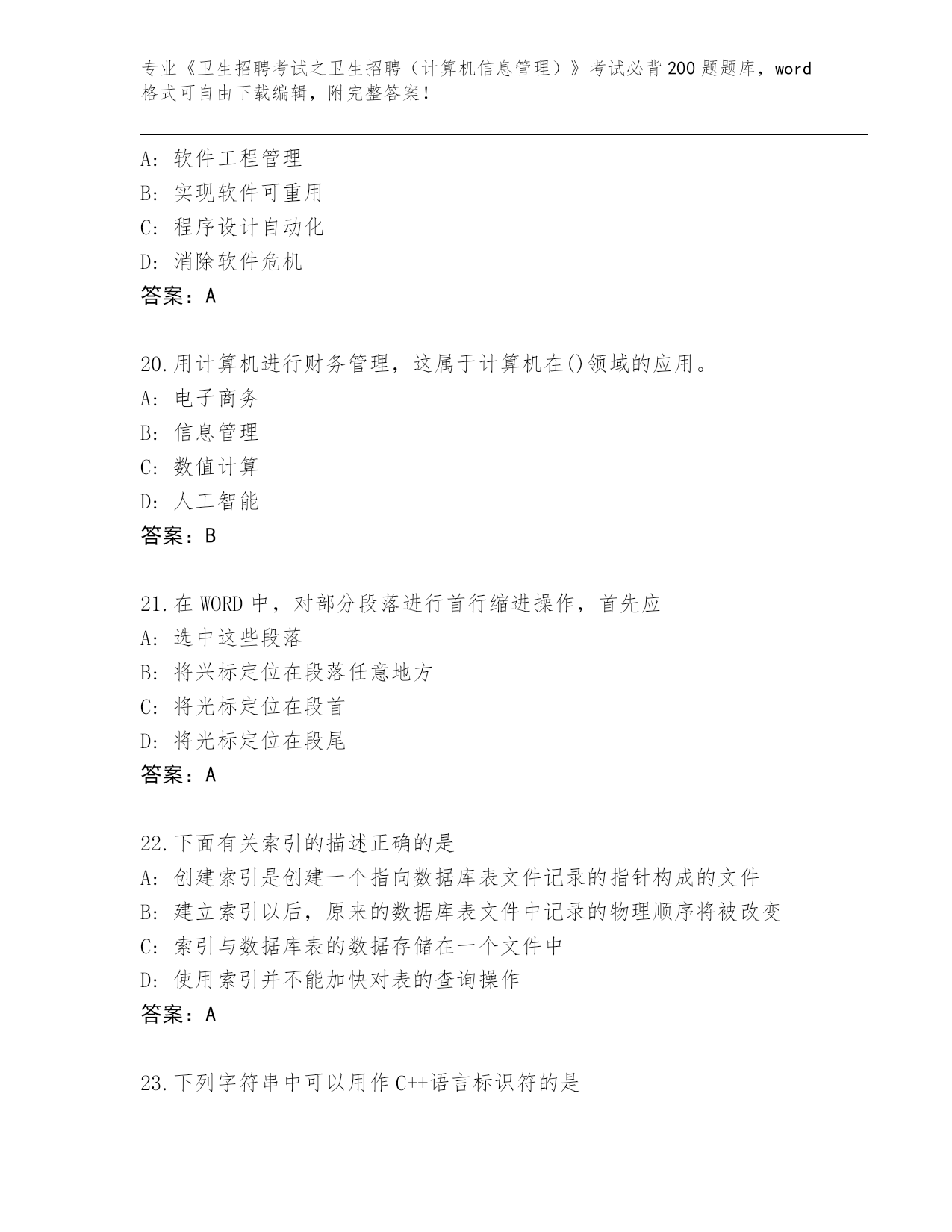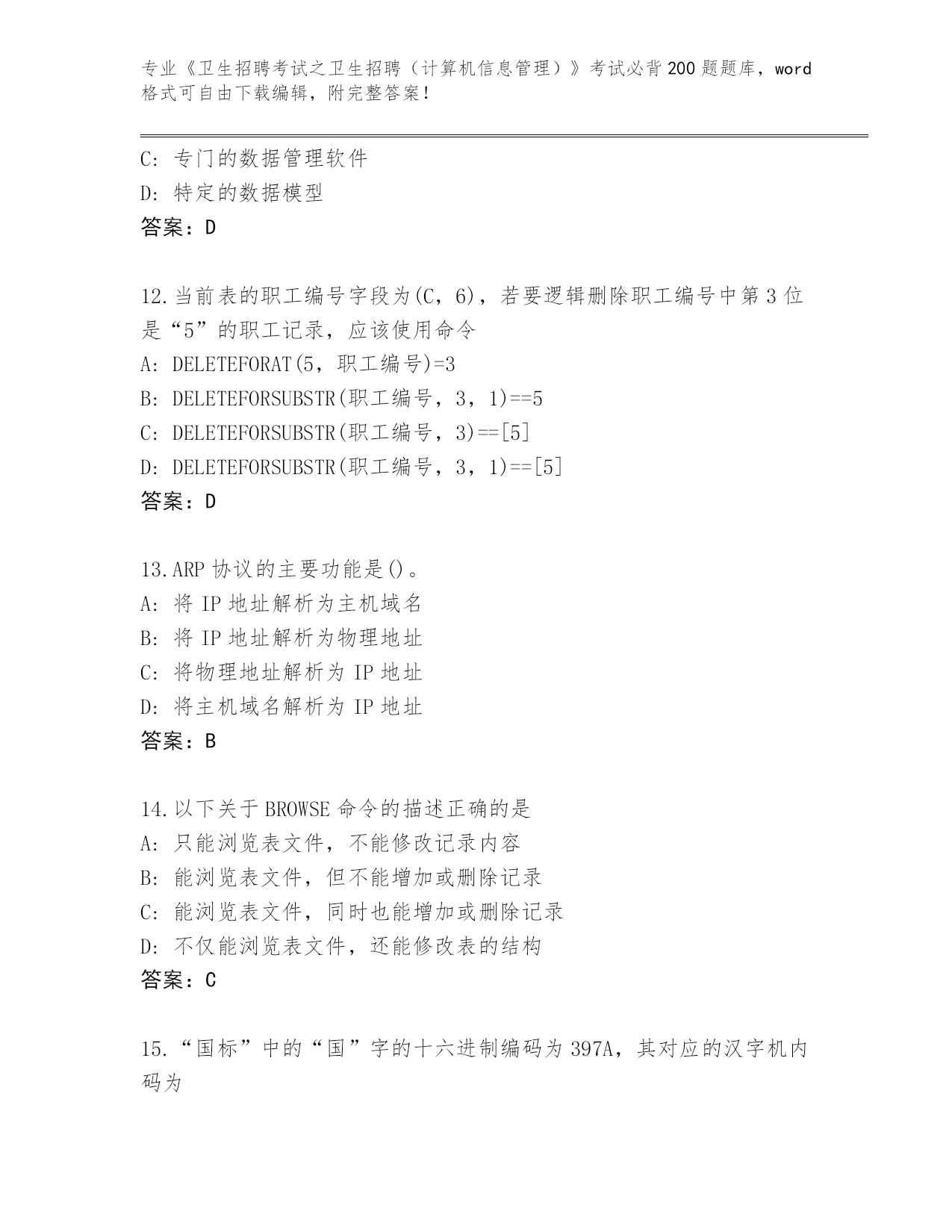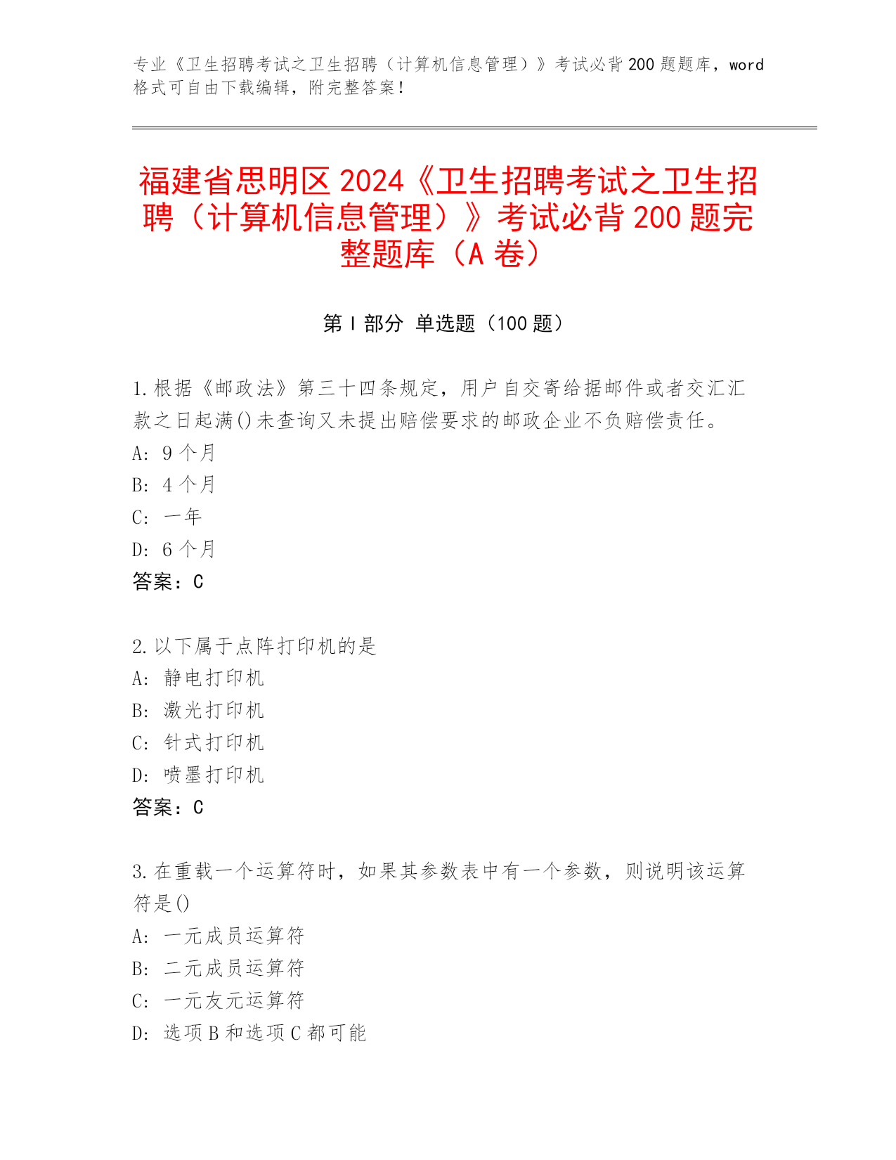福建省思明区2024《卫生招聘考试之卫生招聘(计算机信息管理)》考试必背200题完整题库(A卷)