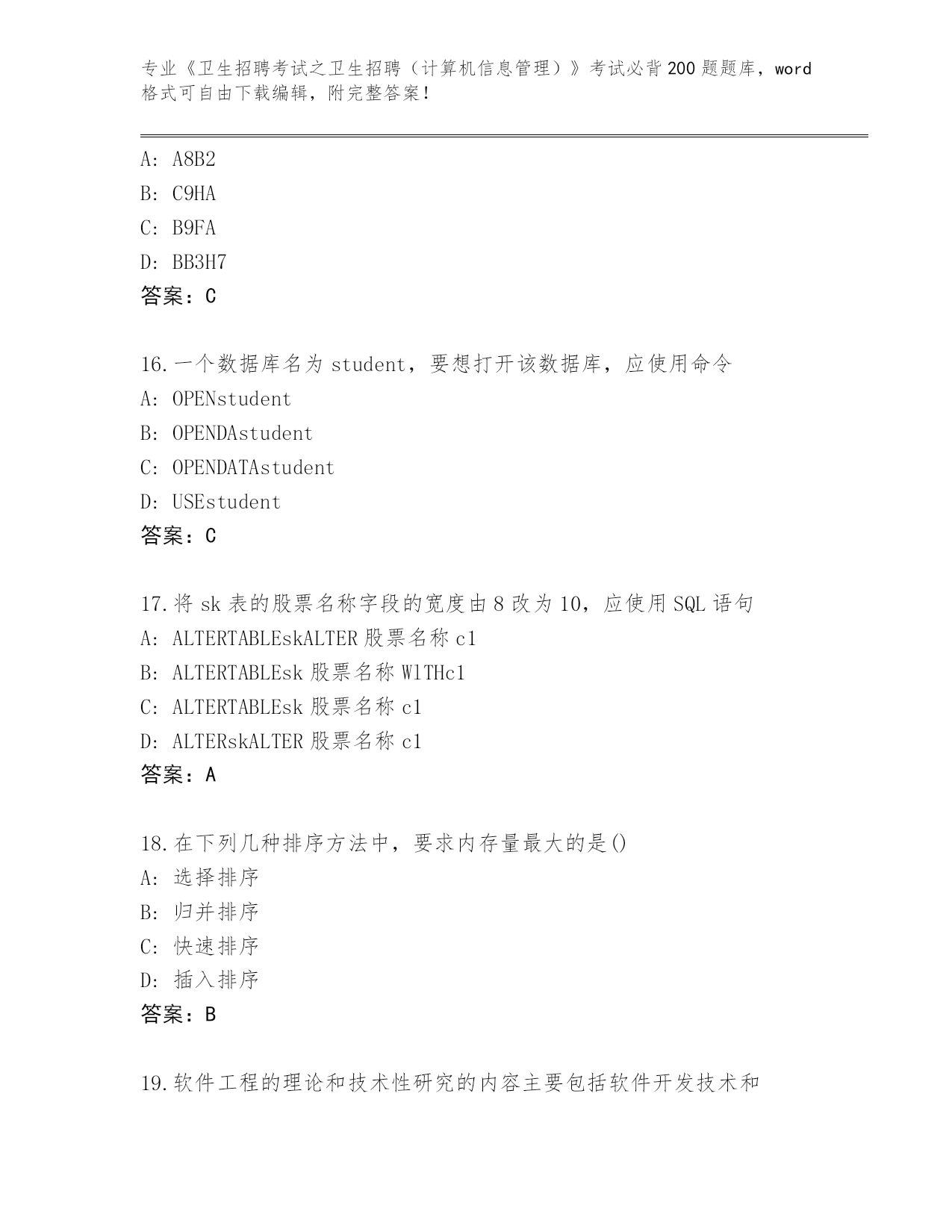 福建省思明区2024年《卫生招聘考试之卫生招聘(计算机信息管理)》资格考试必背200题题库(原创题)