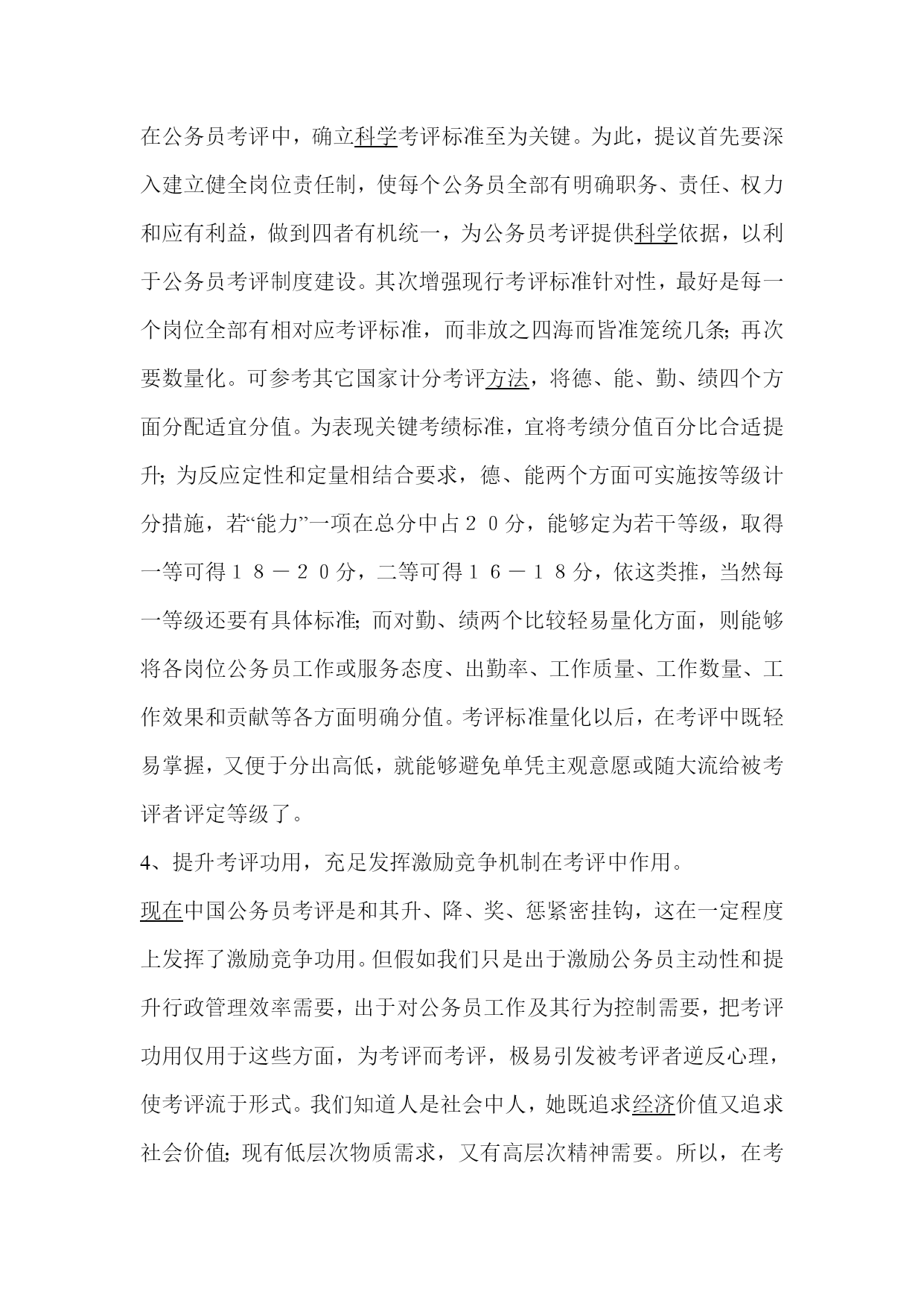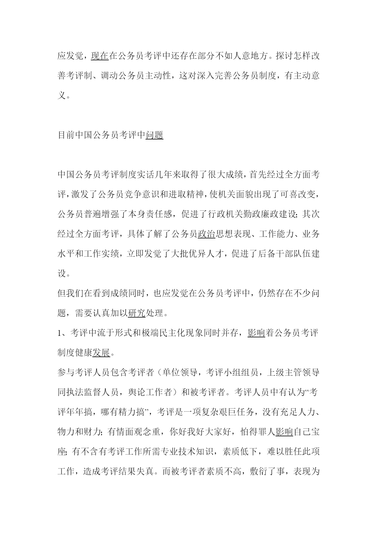 中国公务员考评制度HYPERLINK""内容摘要:本文就中国现阶段公务员考评制度中存在HYPERLINK""问题加以HYPERLINK""分析、从中得出考评中出现不公平现象形成原因,和杜绝公务员考评制度中不公平现象发生,应采取对策和方法。经过全文三大方面叙述,作者提出了自己观念,那就是——努力使公务员考评制度化是顺应HYPERLINK""历史HYPERLINK""发展趋势必需举措。关键词:国家公务员考评管理制度制度化国家公务员是指国家公务人员,是代表国家从事社会公共事务管理,行使行政职权,推行国家公务人员[1]。自1987年10月党十三大汇报明确宣告在中国建立和推行公务员制度至今已经历了十多个年头。在这十几年过程中,中国公务员制度不停得到完善,在这里我想就中国公务员考评制度谈一点自己见解。公务员考评是公务员制度“中枢”。它是公务员录用、晋升、工资福利、奖惩等基础和依据,同时又可为人事决议HYPERLINK""科学化和改善人事制度提供指导。客观公正考评有利于促进公平,提升效率,确保廉洁。考评制是公务员制度关键组成部分,是人事行政关键一环,是发觉、选拔优异行政管理人才关键路径。中国自1994年3月8日,颁布了《国家公务员考评暂行要求》,为公务员考评提供了关键法规依据,把公务员考评工作逐步纳入规范化、HYPERLINK""科学化、法制化轨道。但同时我们也应发觉,HYPERLINK""现在在公务员考评中还存在部分不如人意地方。探讨怎样改善考评制、调动公务员主动性,这对深入完善公务员制度,有主动意义。目前中国公务员考评中HYPERLINK""问题中国公务员考评制度实话几年来取得了很大成绩,首先经过全方面考评,激发了公务员竞争意识和进取精神,使机关面貌出现了可喜改变,公务员普遍增强了本身责任感,促进了行政机关勤政廉政建设;其次经过全方面考评,具体了解了公务员HYPERLINK""政治思想表现、工作能力、业务水平和工作实绩,立即发觉了大批优异人才,促进了后备干部队伍建设。但我们在看到成绩同时,也应发觉在公务员考评中,仍然存在不少问题,需要认真加以HYPERLINK""研究处理。1、考评中流于形式和极端民主化现象同时并存,HYPERLINK""影响着公务员考评制度健康HYPERLINK""发展。参与考评人员包含考评者(单位领导,考评小组组员,上级主管领导同执法监督人员,舆论工作者)和被考评者。考评人员中有认为“考评年年搞,哪有精力搞”,考评是一项复杂艰巨任务,没有充足人力、物力和财力;有情面观念重,你好我好大家好,怕得罪人HYPERLINK""影响自己宝座;有不含有考评工作所需专业技术知识,素质低下,难以胜任此项工作,造成考评结果失真。而被考评者素质不高,敷衍了事,表现为写个人HYPERLINK""总结和述职汇报时三言两语。部分单位和部门对考评工作认识不深,宣传不力,很多人缺乏参与意识,把公务员考评等同于过去年底评优异,优异等次实施轮番坐庄,搞平衡,搞照料或搞论资排辈。出现两种极端现象:一是部分单位领导即使表面上推行了考评要求程序,但考评中并不认真听取群众意见,而是个人说了算,凭个人好恶搞内定,结果使考评工作流于形式、走过场;二是部分单位领导碍于情面,怕得罪人,将优异等次确实定交由群众无记名投票表决,结果使部分政绩突出而平时不太注意人际关系人榜上无名,相反,部分政绩平平但“人缘好”人却评为优异。没有真正坚持领导和群众相结合。2、考评结果等次偏少,而且不重视考评信息反馈,致使公务员考评激励作用得不到应有发挥。《国家公务员暂行条例》和《国家公务员考评暂行要求》全部要求:公务员年度考评结果分为优异、称职、不称职三个等次。根据公务员考评实施暂行措施,被确定为优异等次人数通常掌握在本单位、本部门参与考评人数10%左右,最多不能超出15%。为了照料到大小不一样部门,通常单位作法是,根据各部门实际人数乘以15%百分比和四舍五入HYPERLINK""方法,将名额分配下去,结果产生了两个问题,一是不管部门工作优劣,一律按人数分配指标,有指标就可评优,挫伤了公务员主动性;二是四舍五入措施使人数少部门取得评优机会,反而比人数多部门多。称职等级较轻易确定,这其中既包含相当一部分德才表现和工作实绩全部比很好公务员,也包含一部分德才表现和工作实绩比较差公务员。然而,她们全部享受一样待遇,没有任何差异,难以起到奖优罚劣激励作用[2]。3、考评结果使用不妥,对优异公务员奖励太轻,而对不称职公务员处理似乎又太重,HYPERLINK""影响考评公正性和合理性。年度考评中被确定为优异公务员和被确定为称职公务员,在职务晋升、晋级增资和奖金发放等方面实际上没有多少区分,如依