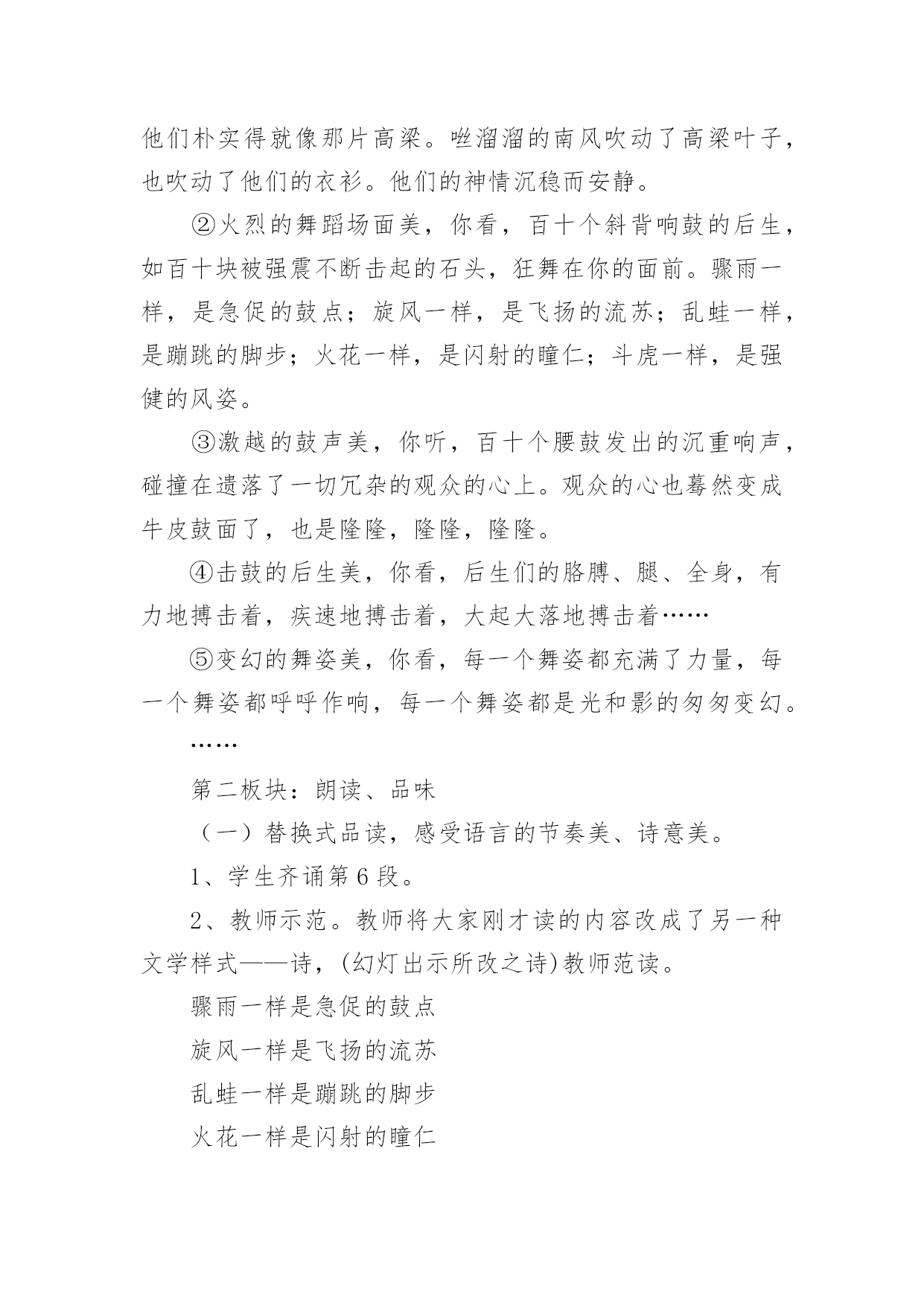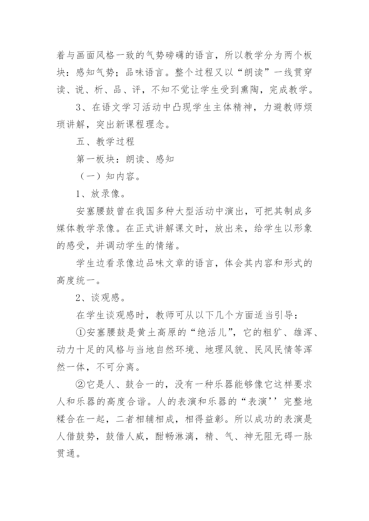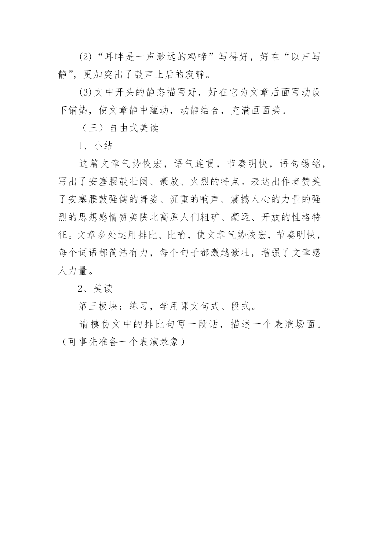 《安塞腰鼓》的教学设计作为一名优秀的教育工作者,可能需要进行教学设计编写工作,教学设计是把教学原理转化为教学材料和教学活动的计划。怎样写教学设计才更能起到其作用呢?以下是小编帮大家整理的《安塞腰鼓》的教学设计,希望对大家有所帮助。一、教学目的1、学习朗读课文,感受安塞腰鼓的磅礴气势。2、理解排比的修辞手法及其在本文中的作用。二、课型设计:品读课三、预习要求1、落实字词,会读会写。2、上网了解作者和安塞腰鼓的情况。四、教学设想1、安塞腰鼓是产生于北方黄土高原上的—种民间艺术,充满原始的意味和浓郁的乡土气息,对于生活在成都的现代青少年,大都对其缺乏形象的直接的感受。因此,采用多媒体教学,效果会好些。教这样的文章,尤其要注意调动学生的情绪,调动学生的想象力,一旦学生进入角色,教起来就轻松多了。2、这是一篇诗化的散文,有着雄浑伟奇的画面,更有着与画面风格一致的气势磅礴的语言,所以教学分为两个板块:感知气势;品味语言。整个过程又以“朗读”一线贯穿读、说、析、品、评,不知不觉让学生受到熏陶,完成教学。3、在语文学习活动中凸现学生主体精神,力避教师烦琐讲解,突出新课程理念。五、教学过程第一板块:朗读、感知(一)知内容。1、放录像。安塞腰鼓曾在我国多种大型活动中演出,可把其制成多媒体教学录像。在正式讲解课文时,放出来,给学生以形象的感受,并调动学生的情绪。学生边看录像边品味文章的语言,体会其内容和形式的高度统一。2、谈观感。在学生谈观感时,教师可从以下几个方面适当引导:①安塞腰鼓是黄土高原的“绝活儿”,它的粗犷、雄浑、动力十足的风格与当地自然环境、地理风貌、民风民情等浑然一体,不可分离。②它是人、鼓合一的,没有一种乐器能够像它这样要求人和乐器的高度合谐。人的表演和乐器的“表演’’完整地糅合在一起,二者相辅相成,相得益彰。所以成功的表演是人借鼓势,鼓借人威,酣畅淋漓,精、气、神无阻无碍一脉贯通。③安塞腰鼓的内涵是生命的激昂和渲泻;是羁绊不住的力量;是原始力量的勃发、喷涌。3、读课文,作评价。学生自由朗读课文,试用“的安塞腰鼓”对安塞腰鼓进行评价。可填词、短语、句子,最好是文中的内容。学生各抒己见,可能有如下一些答案:“壮阔”“豪放”“火烈”“有力”“元气淋漓”“惊心动魄”“奇伟磅礴”“一捶起来就发狠了,忘情了,没命了”“容不得束缚,容不得羁绊,容不得闭塞”“每一个舞姿都使人颤栗在浓烈的艺术享受中,使人叹为观止”“好一个痛快了山河、蓬勃了想象力”等等。(二)明结构。师生联读课文。说明:文章按“鼓响前——腰鼓表演——鼓声止”可分成3大部分。第二部分为文章的主体部分,分别从4个角度来展示腰鼓舞的艺术魅力,且这4个角度的分水岭都是一句话。学生会很快找出:好一个安塞腰鼓!明确:这是文章内容与结构上的核心句。(三)寻美点。分组朗读,进行分组寻找美点比赛。用“美,你看(听)”的句式叙述出来。学生可能有如下答案:①蓄而待发的后生美,你看,他们的身后是一片高梁地。他们朴实得就像那片高梁。咝溜溜的南风吹动了高梁叶子,也吹动了他们的衣衫。他们的神情沉稳而安静。②火烈的舞蹈场面美,你看,百十个斜背响鼓的后生,如百十块被强震不断击起的石头,狂舞在你的面前。骤雨一样,是急促的鼓点;旋风一样,是飞扬的流苏;乱蛙一样,是蹦跳的脚步;火花一样,是闪射的瞳仁;斗虎一样,是强健的风姿。③激越的鼓声美,你听,百十个腰鼓发出的沉重响声,碰撞在遗落了一切冗杂的观众的心上。观众的心也蓦然变成牛皮鼓面了,也是隆隆,隆隆,隆隆。④击鼓的后生美,你看,后生们的胳膊、腿、全身,有力地搏击着,疾速地搏击着,大起大落地搏击着……⑤变幻的舞姿美,你看,每一个舞姿都充满了力量,每一个舞姿都呼呼作响,每一个舞姿都是光和影的匆匆变幻。……第二板块:朗读、品味(一)替换式品读,感受语言的节奏美、诗意美。1、学生齐诵第6段。2、教师示范。教师将大家刚才读的内容改成了另一种文学样式——诗,(幻灯出示所改之诗)教师范读。骤雨一样是急促的鼓点旋风一样是飞扬的流苏乱蛙一样是蹦跳的脚步火花一样是闪射的瞳仁斗虎一样是强健的风姿学生反复朗读。3、学生仿照以上形式,加工另外的文章内容。如:愈捶愈烈形体成了沉重而又纷飞的思绪愈捶愈烈思绪中不存任何隐秘愈捶愈烈痛苦和欢乐生活和梦幻摆脱和追求都在这舞姿和鼓点中交织!旋转!凝聚!奔突!辐射!翻飞!升华!4、分小组反复替换朗读其他段。(二)评点式品读,理解文章语言的意蕴美、情味美。1、学生任意寻找自己觉得写得精彩的地方朗读3遍,要求用“好,好在”这一句式进行评点。可以从词、句式、修辞、写法、结构等各方面进行评点,说得越多越好。2、分学习小组交流。3、学习小组汇报员向全班汇报。4、教师整理学生评点。从用词方面说:(1)“紧贴在他们身体一侧的腰鼓,呆呆地,似乎从来不曾响过”一句中“呆呆地”